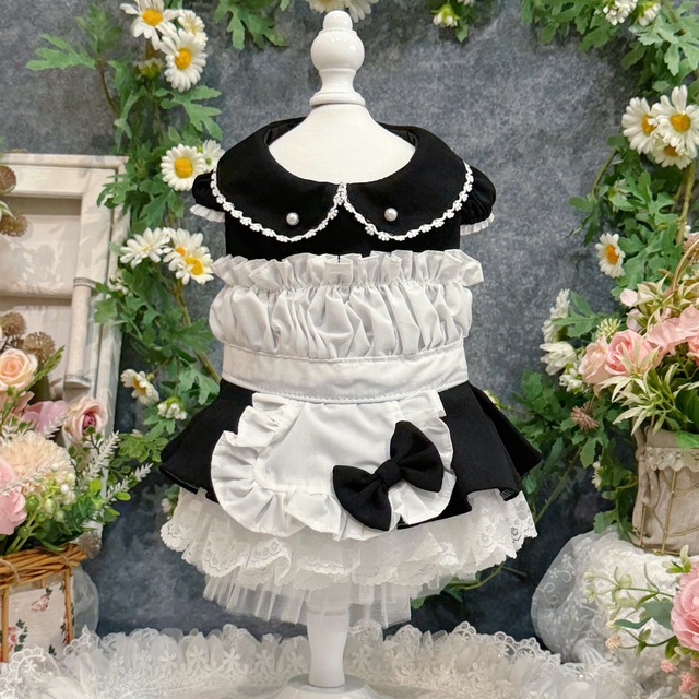 ♡コスプレシリーズです♡ 可愛すぎるヴィクトリア風メイドちゃんドレス❤︎ 19世紀イギリスの正統派メイド服を愛でつつ、アレンジしたこのドレス、まさにヴィクトリア朝時代のロマンティックな世界観を最大限に引き出しています✨ 配色は白と黒の王道コンビ!どんな犬ちゃんに着せても絶対に映える仕上がりです♡ 素材は人間の薄めスーツにも使われるしっかりとしたものを採用しているので、形が崩れにくく、高級感もぐっとアップ!裏生地は100%コットンで、肌触りも安心感満点です。 袖はふんわりとしたパフ袖が可愛さのポイント✨ スカートはレースを重ねてボリューム感をしっかり出し、動くたびにキラキラとした表情を見せてくれます。襟には小さなパールがついて、上品さを一層高めています。 白いエプロンには厚めの黒いサテンリボンがちょうどよくアクセントになっていて、キュートさと上品さがバランスよく共存しています。さらに背中のパフデザインが、思わず「かわいい!」と叫びたくなるほど、可愛さを増幅させてくれる仕上がりです♡ ■生地仕様 ❤︎素材:コットン・サテン・ポリエステル ❤︎伸縮性:なし ❤︎生地の厚さ:普通 ❤︎ボタン式 ★ご注文前に必ず本店のホームページにある「♡注文の仕方♡」ご一読ください★
