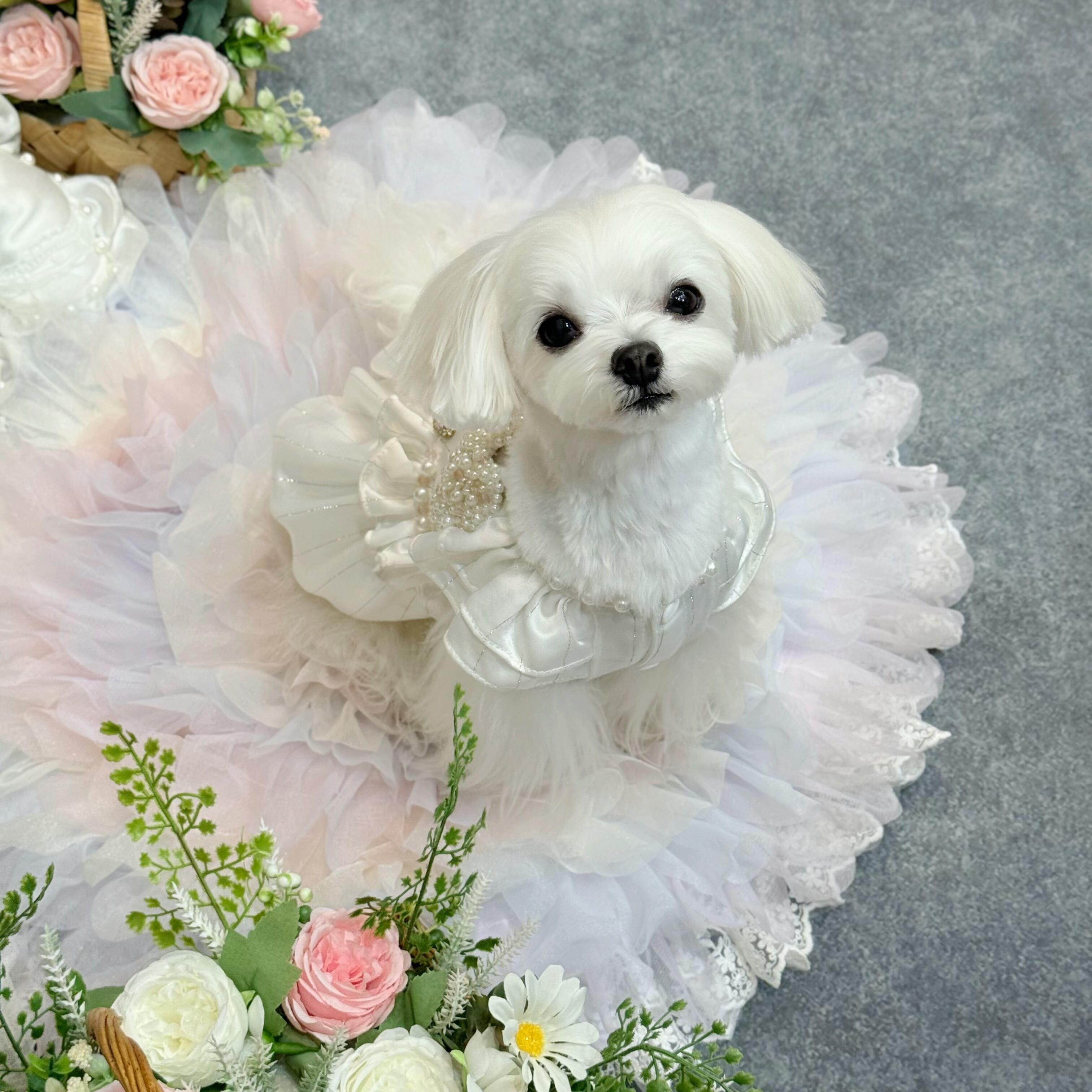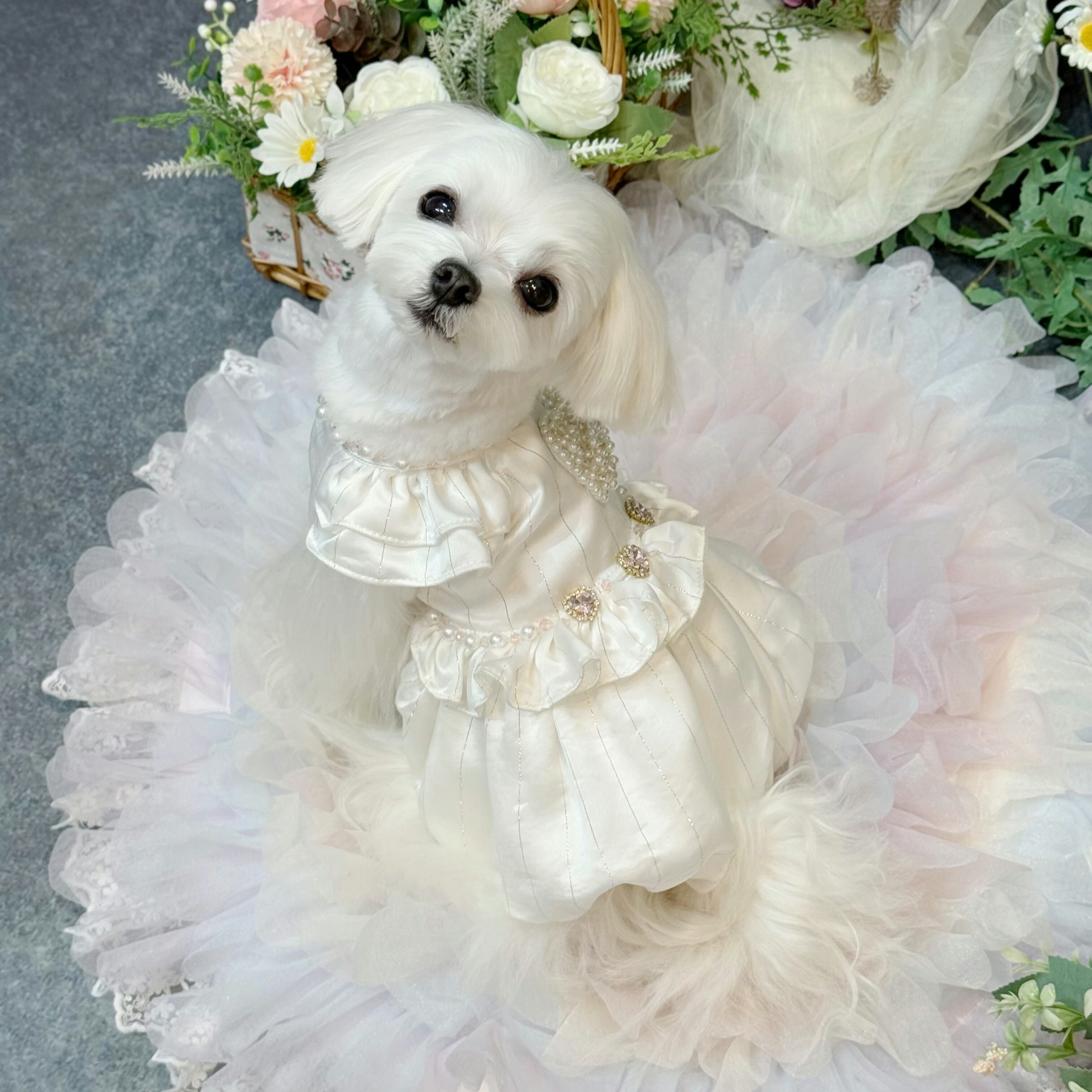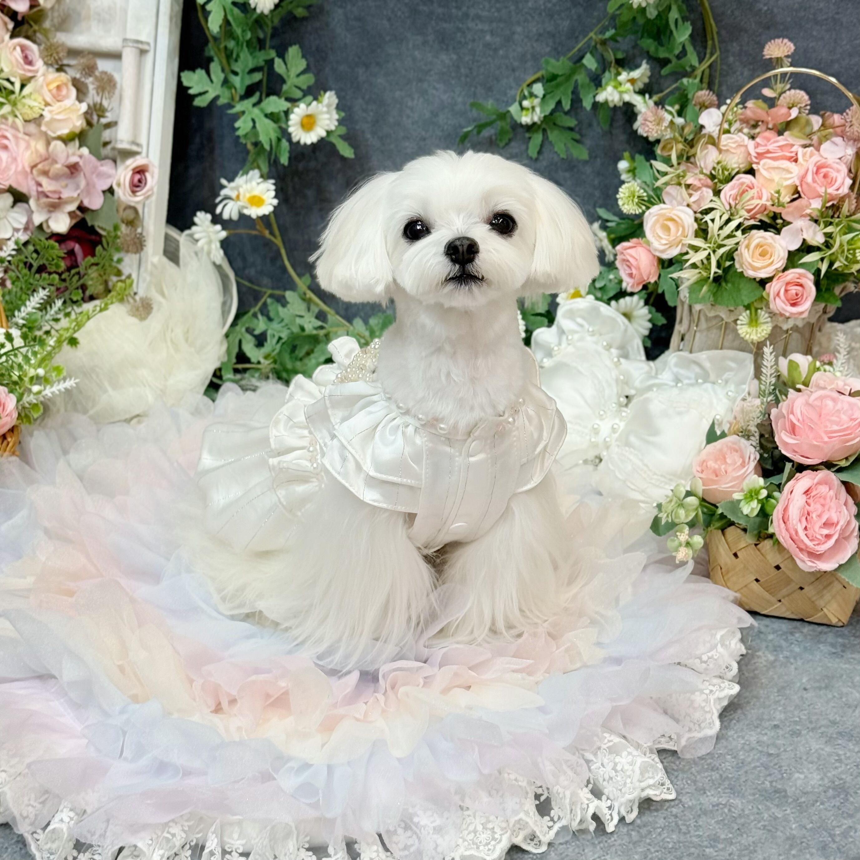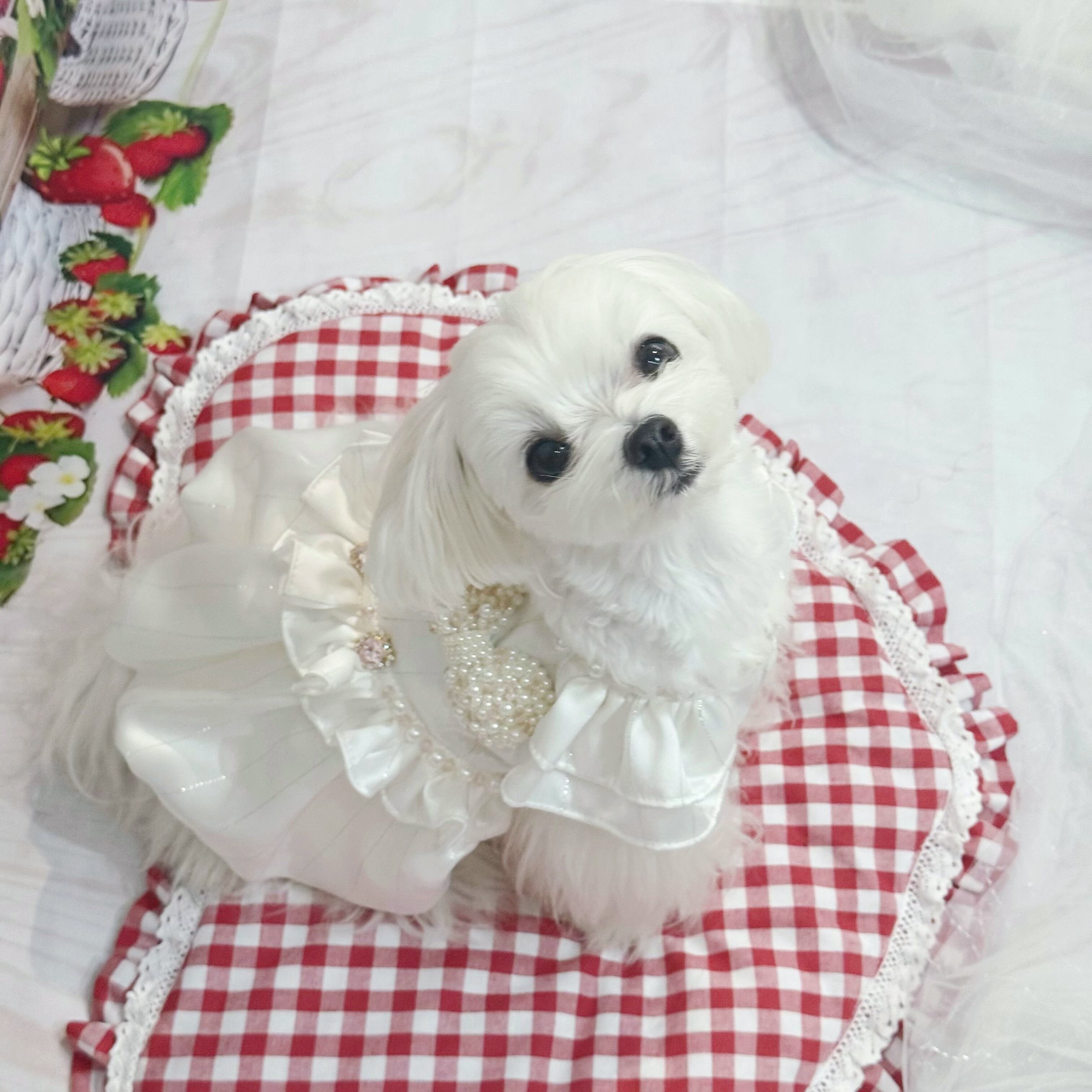 光に当てると高級感溢れる柔らかい光沢が広がり、ガラスのような艶感がとても魅力的〜色合いは上品さを極めた柔らかいホワイトで、愛犬を明るく引き立ててくれる♡