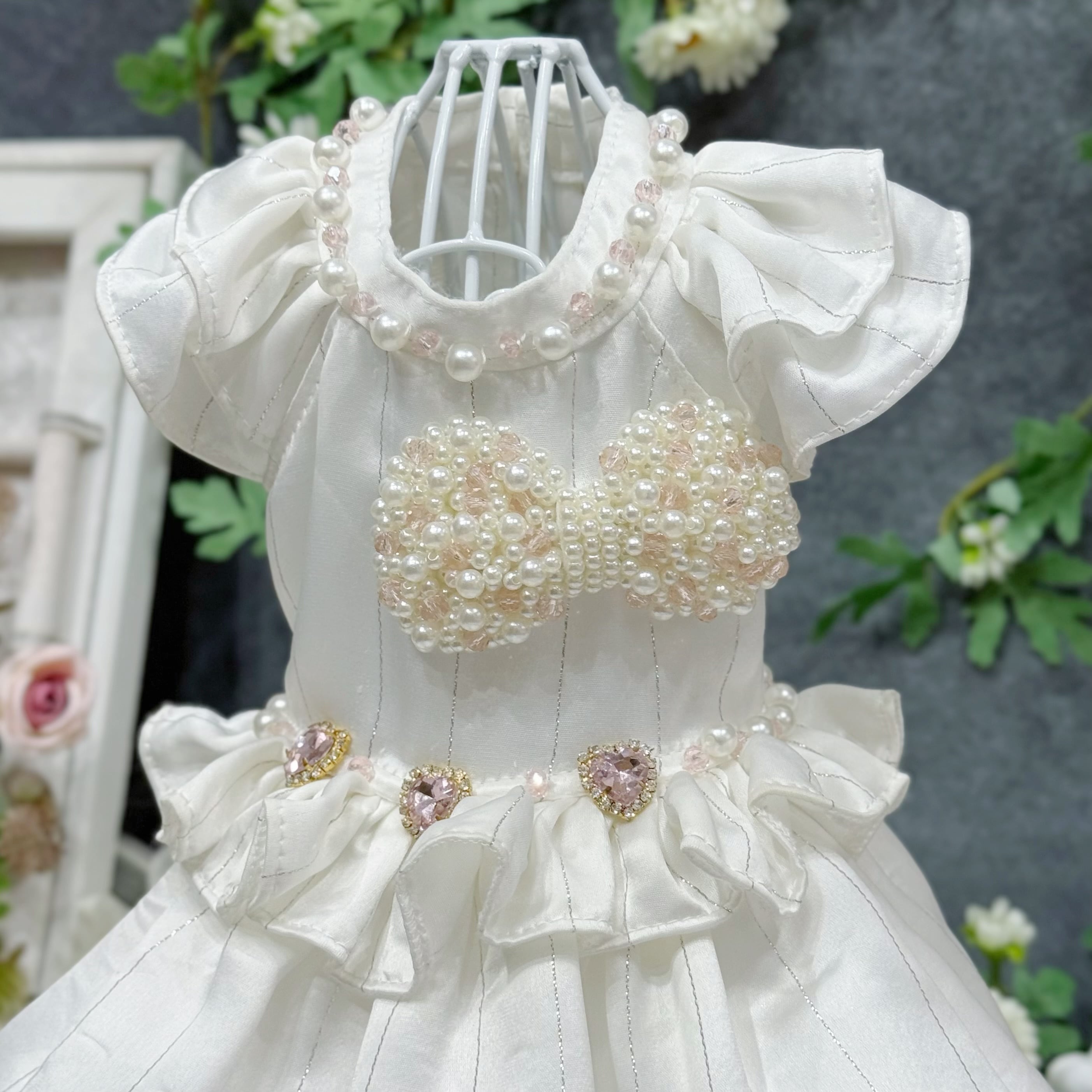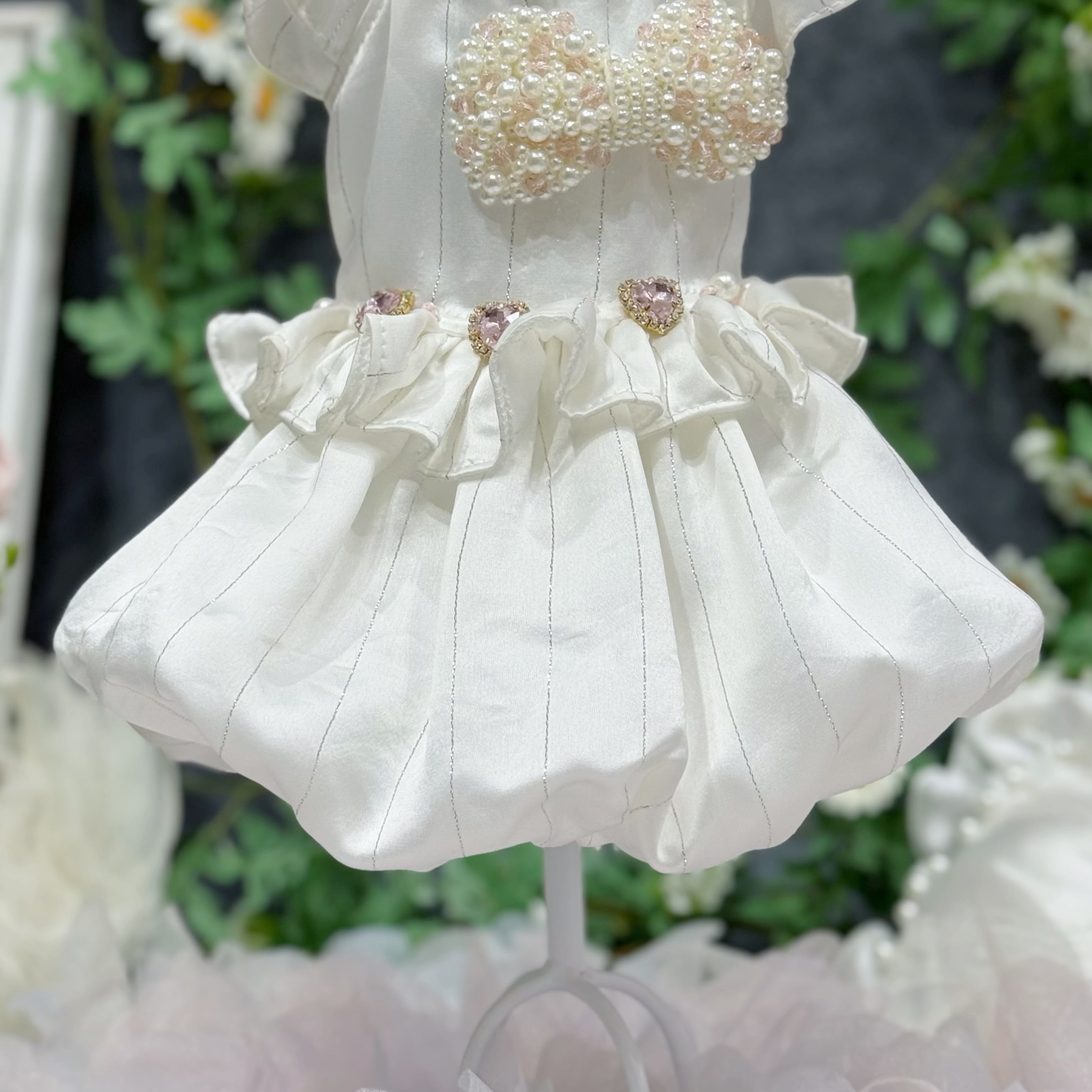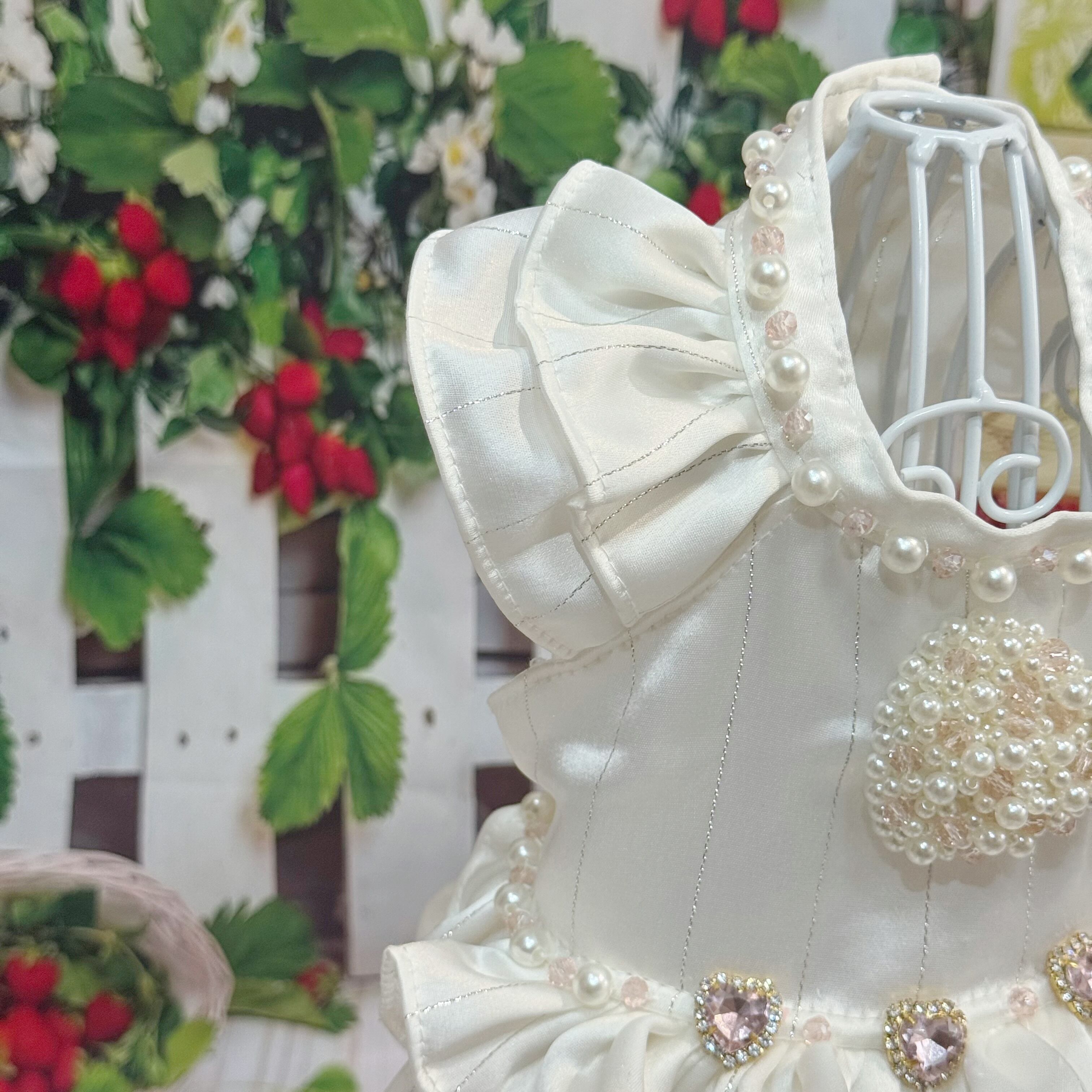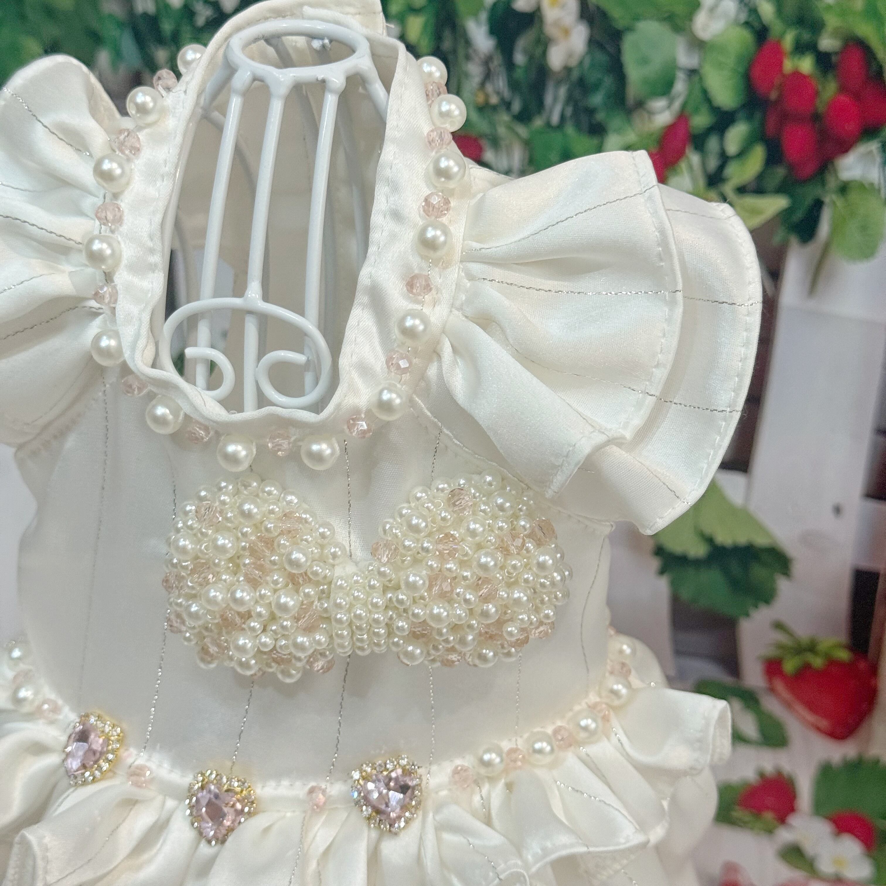 首元とウエストにはピンクのストーンとパールがちりばめられていて、少しの艶で可愛さを引き立てています。そして背中には、さらに多くのピンクストーンとパールで作られたリボンがあって、ドキッとする可愛さです✨