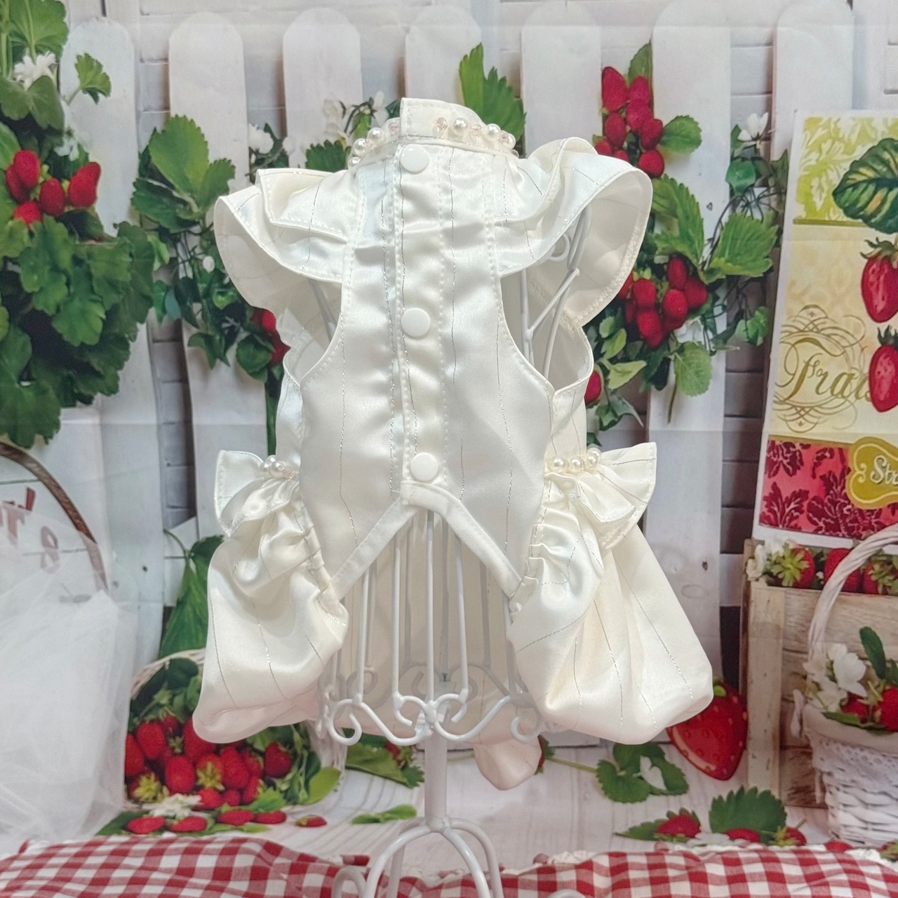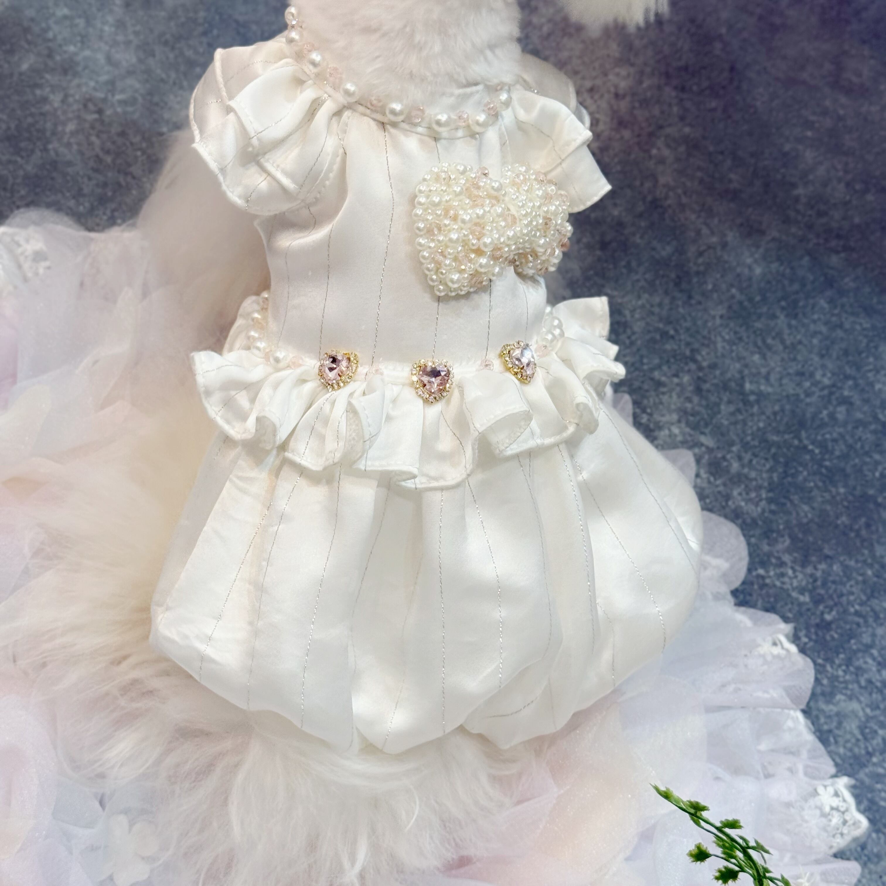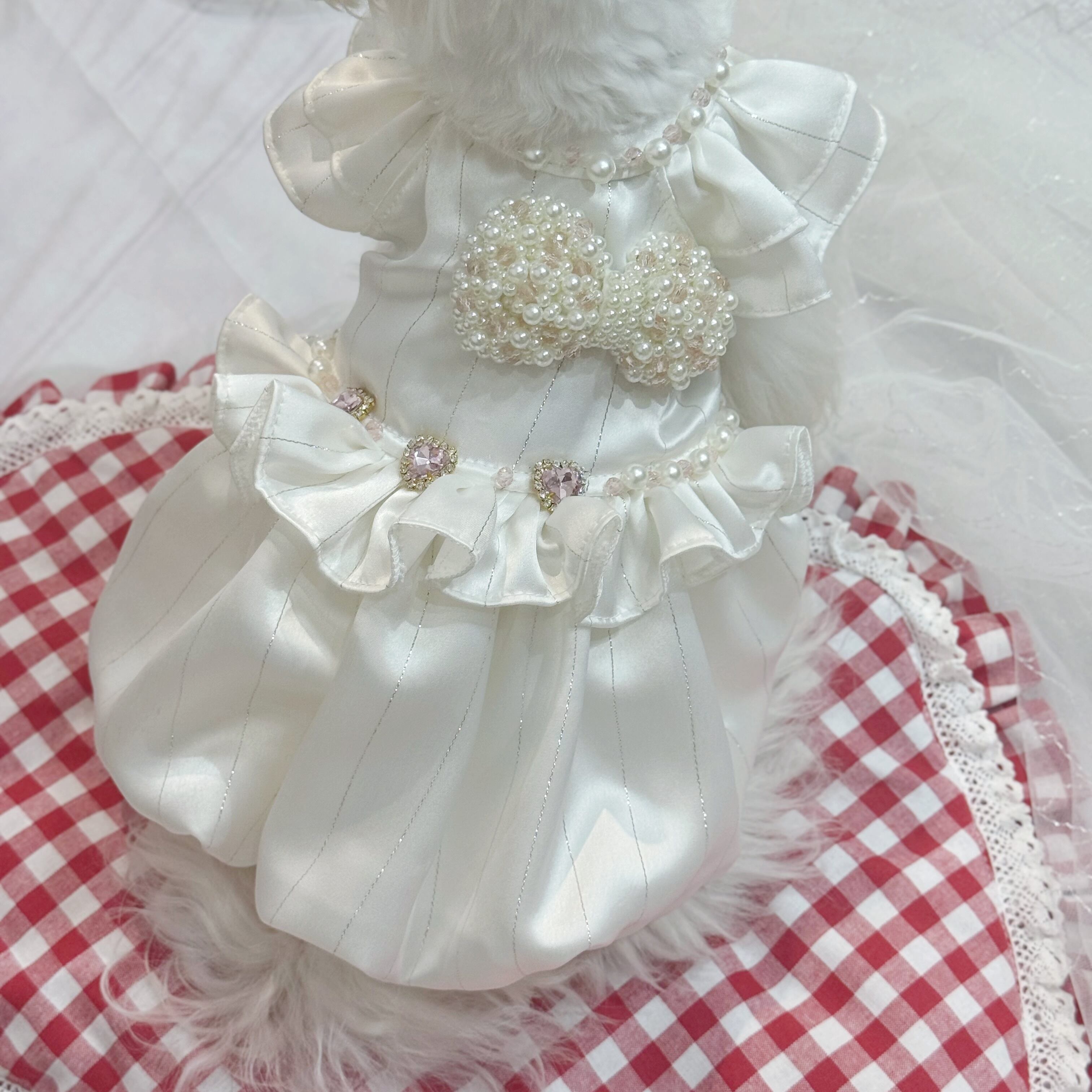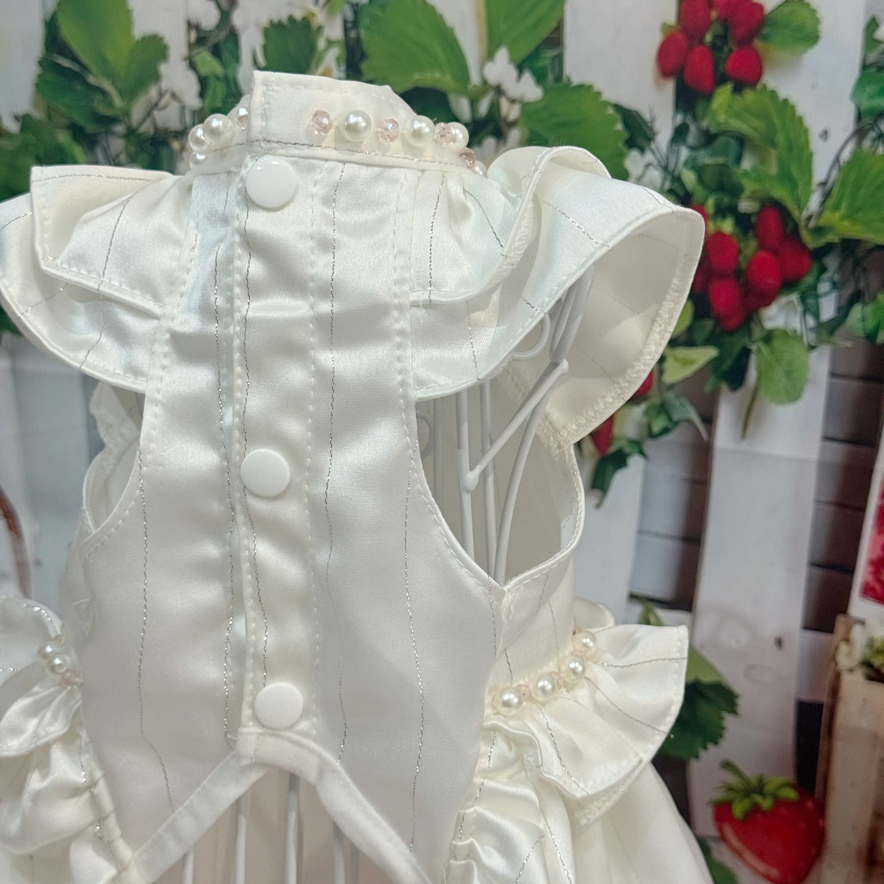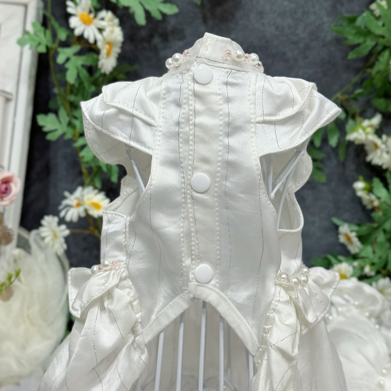 首元とウエストにはピンクのストーンとパールがちりばめられていて、少しの艶で可愛さを引き立てています。そして背中には、さらに多くのピンクストーンとパールで作られたリボンがあって、ドキッとする可愛さです✨