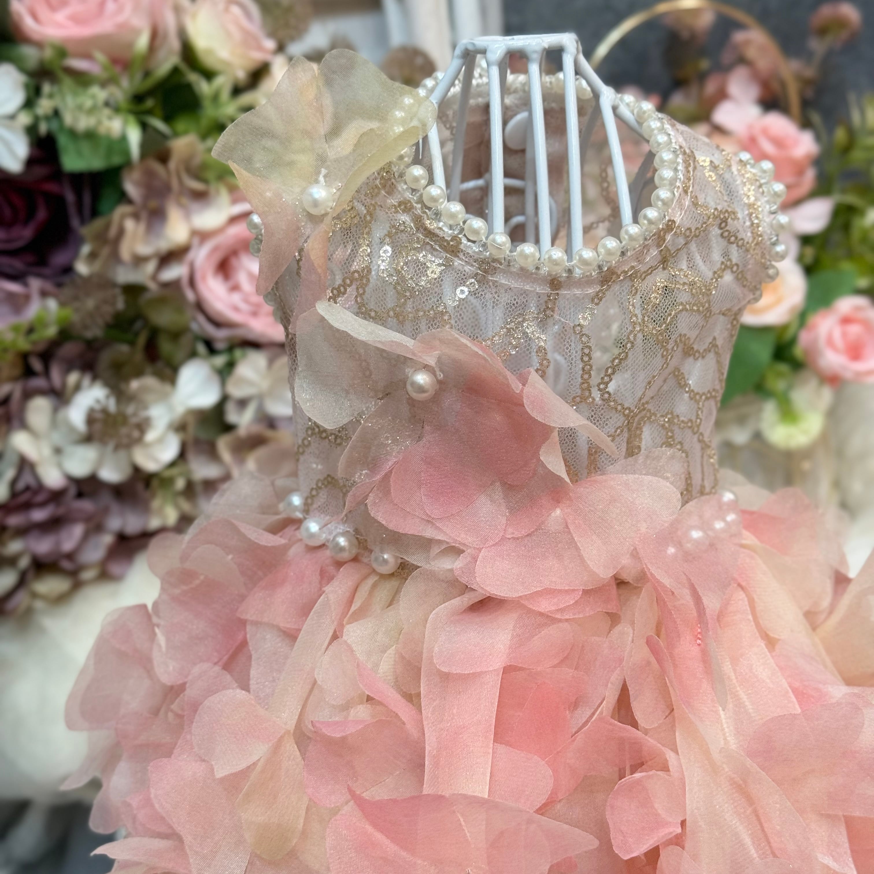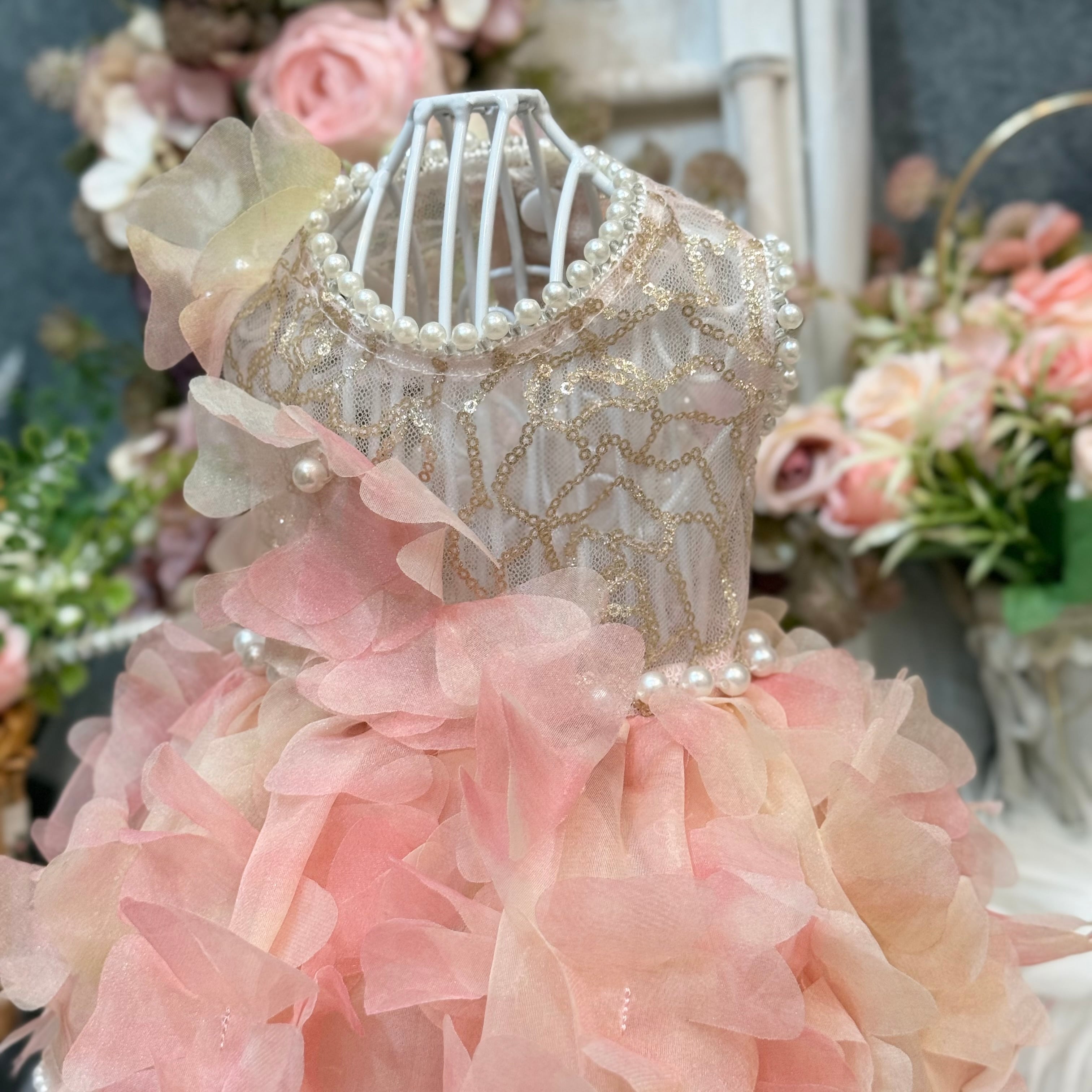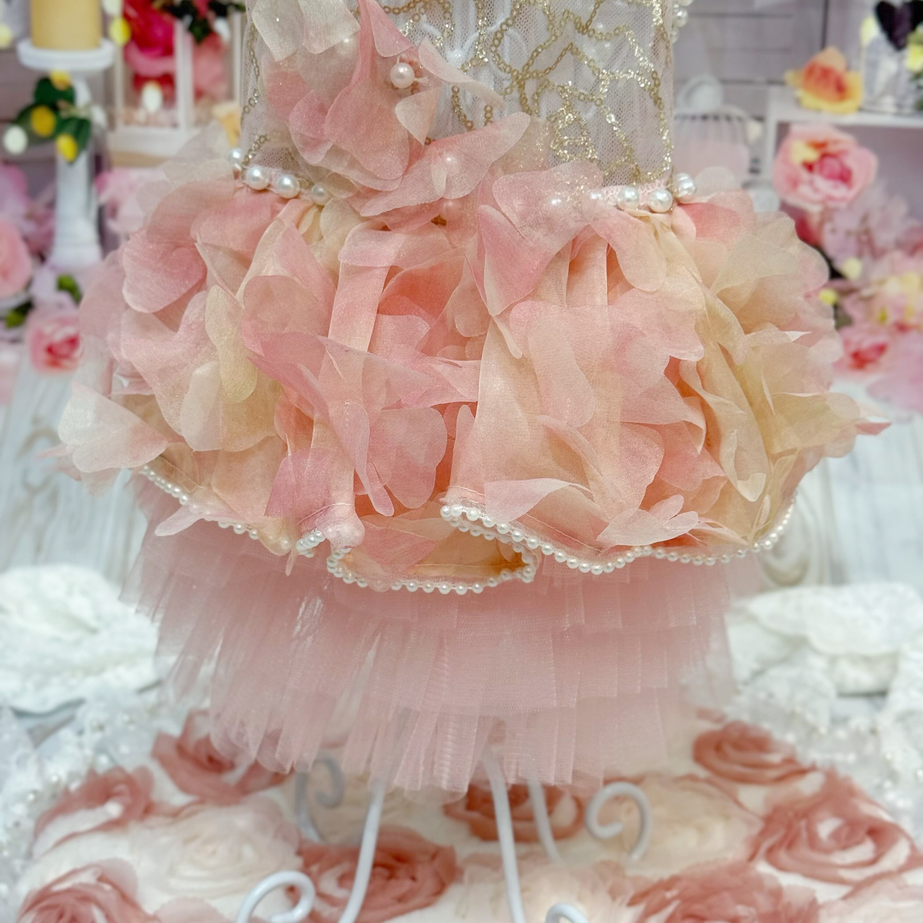 スカート部分には華やかな花びらの生地が贅沢に使用されていて、歩くたびにゆっくりと揺れる様子が、まるで風に舞うバラの花びらたちのようで幻想的です♡
