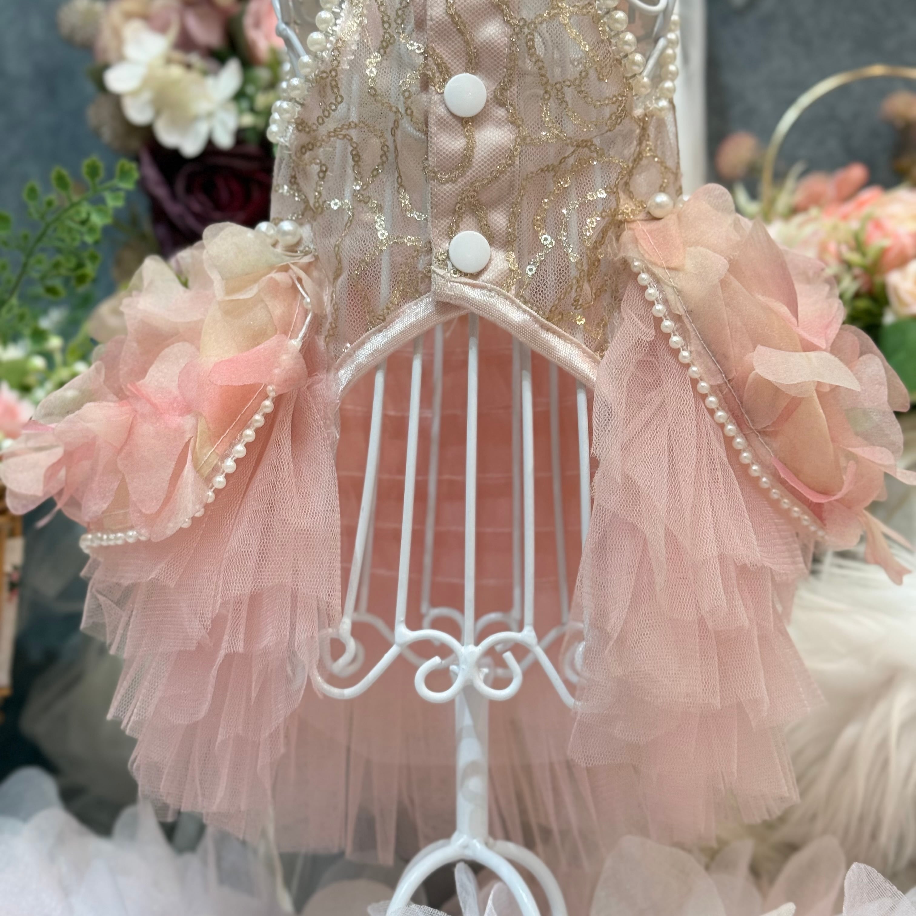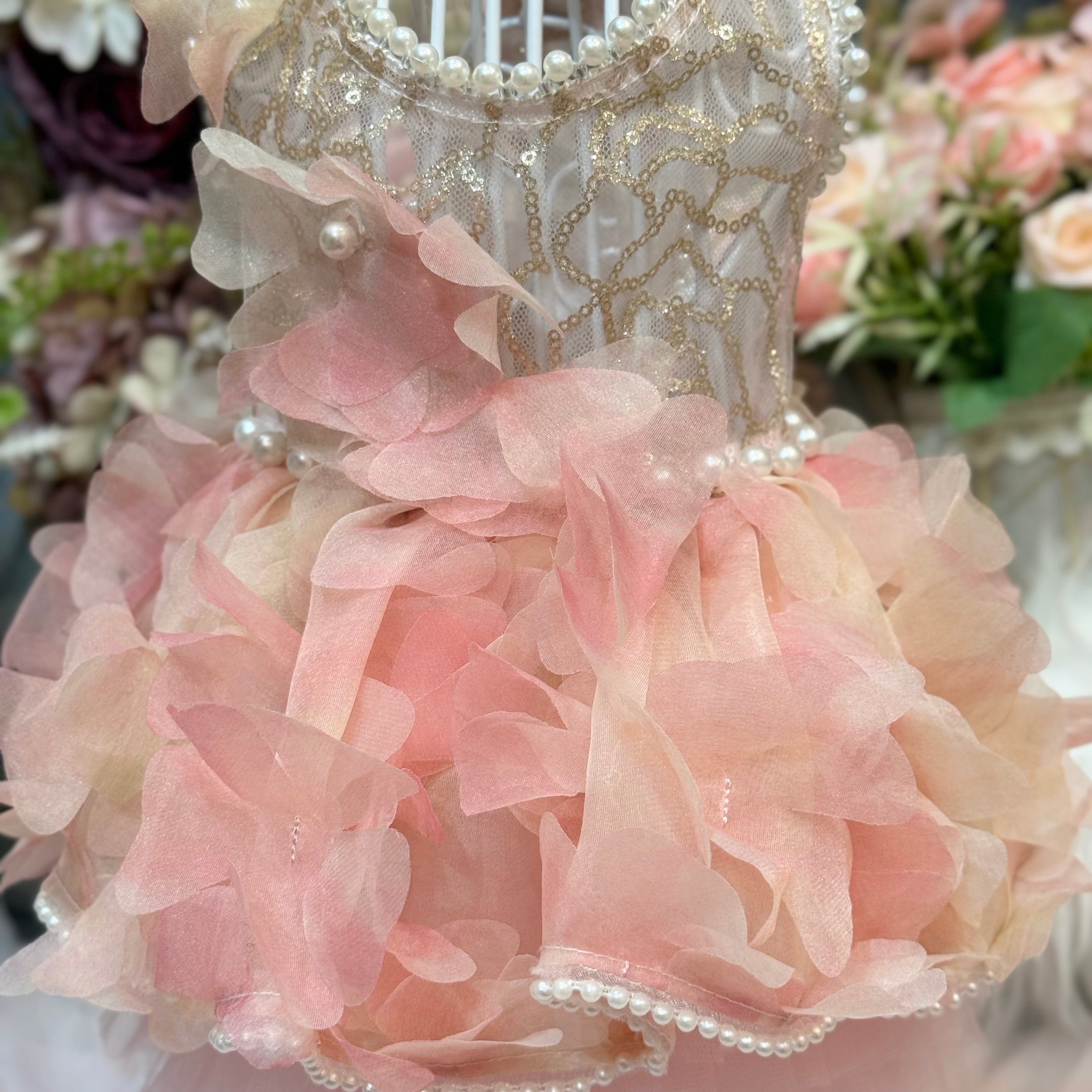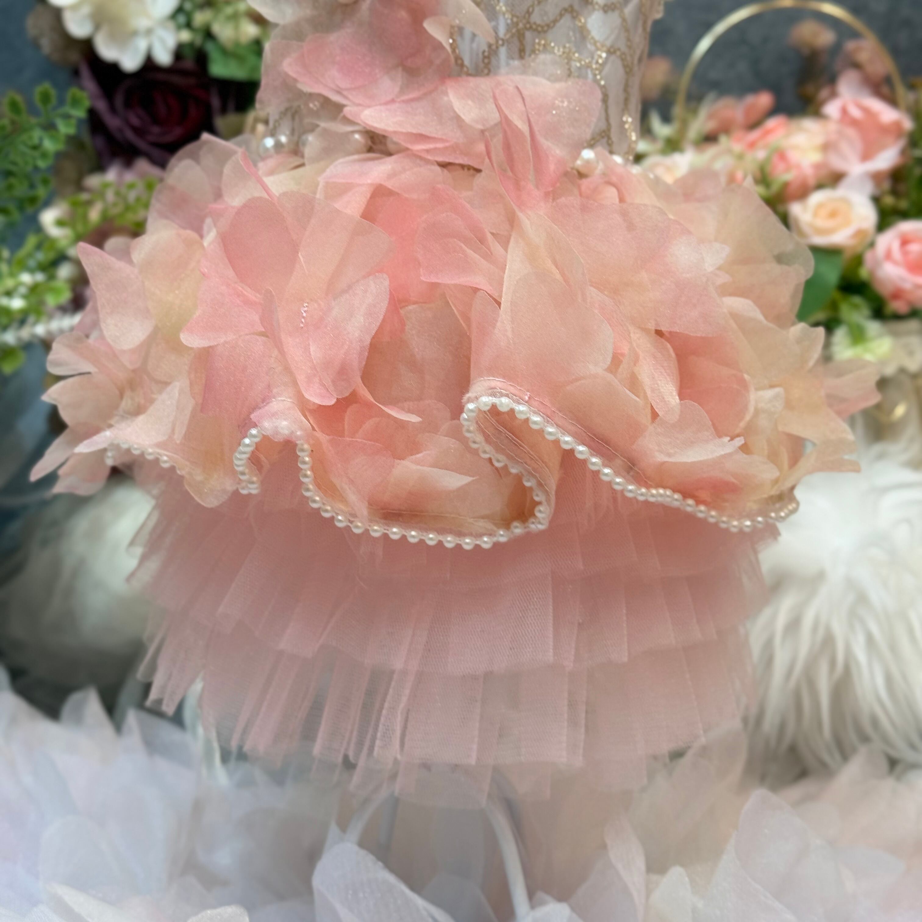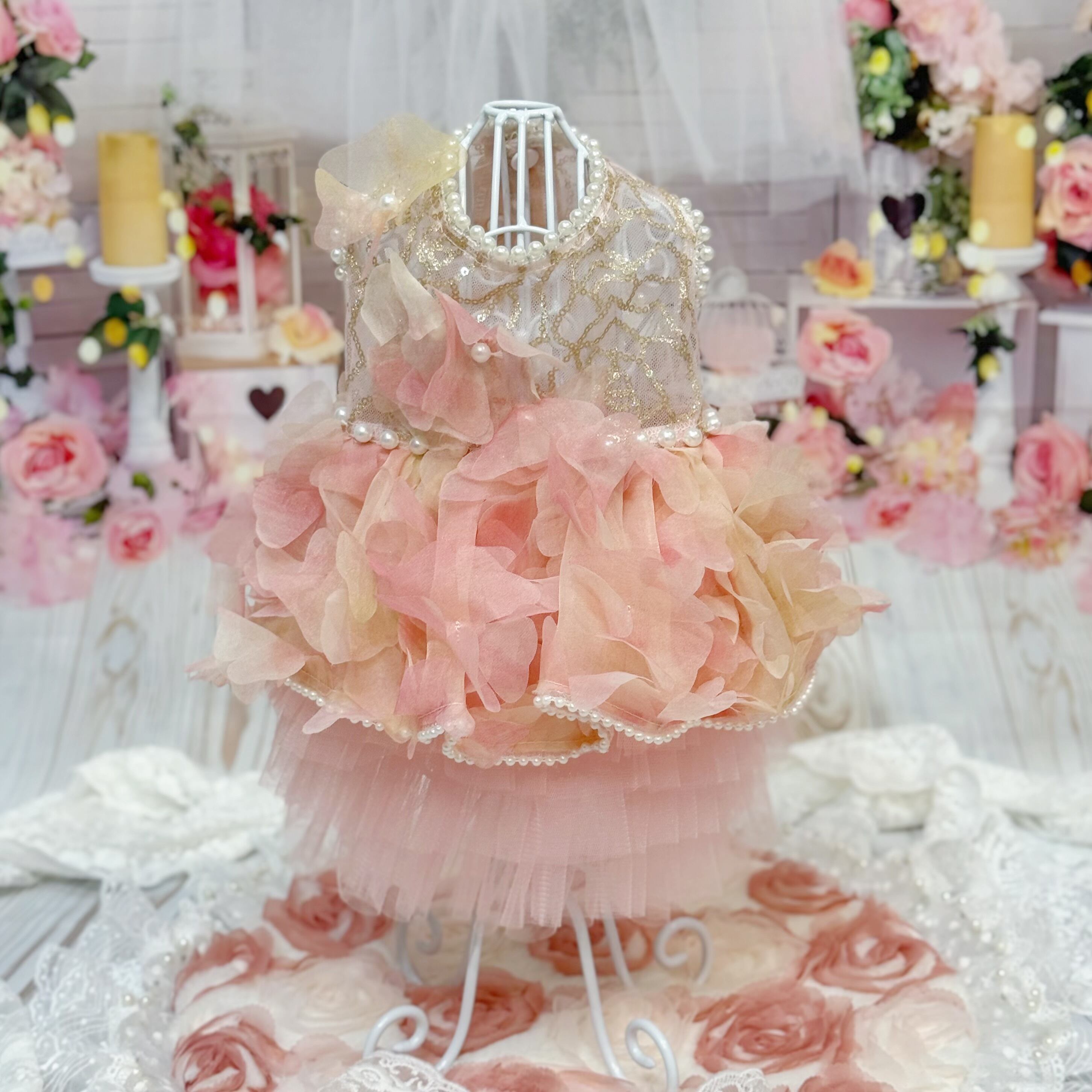 スカート部分には華やかな花びらの生地が贅沢に使用されていて、歩くたびにゆっくりと揺れる様子が、まるで風に舞うバラの花びらたちのようで幻想的です♡