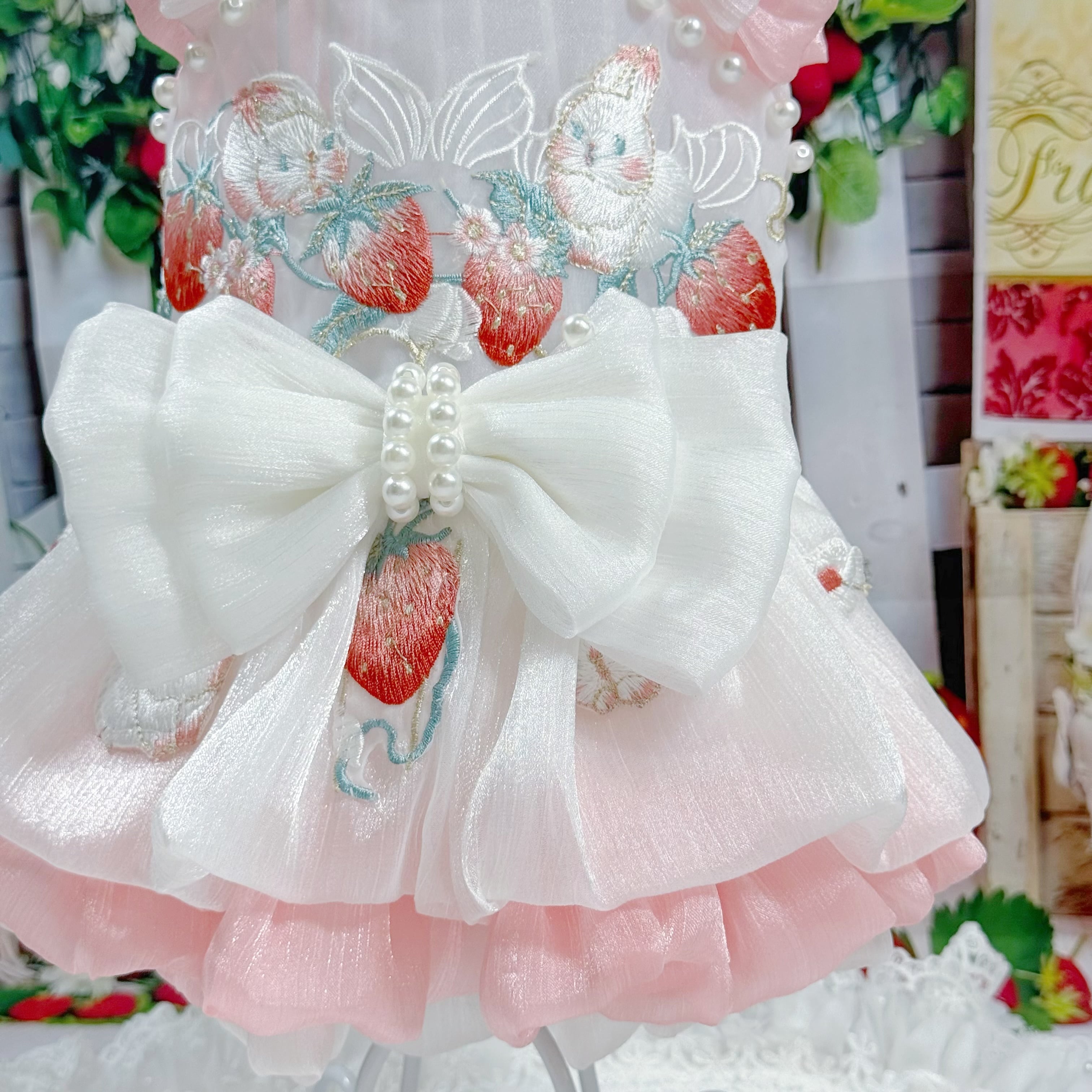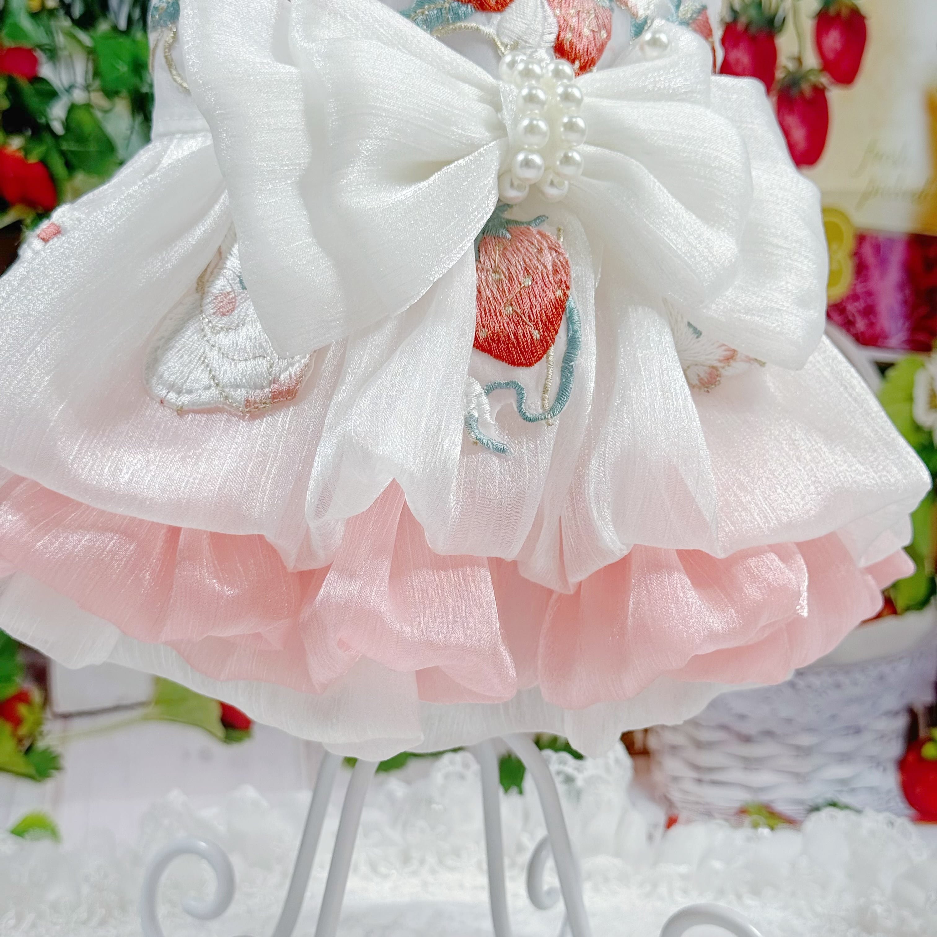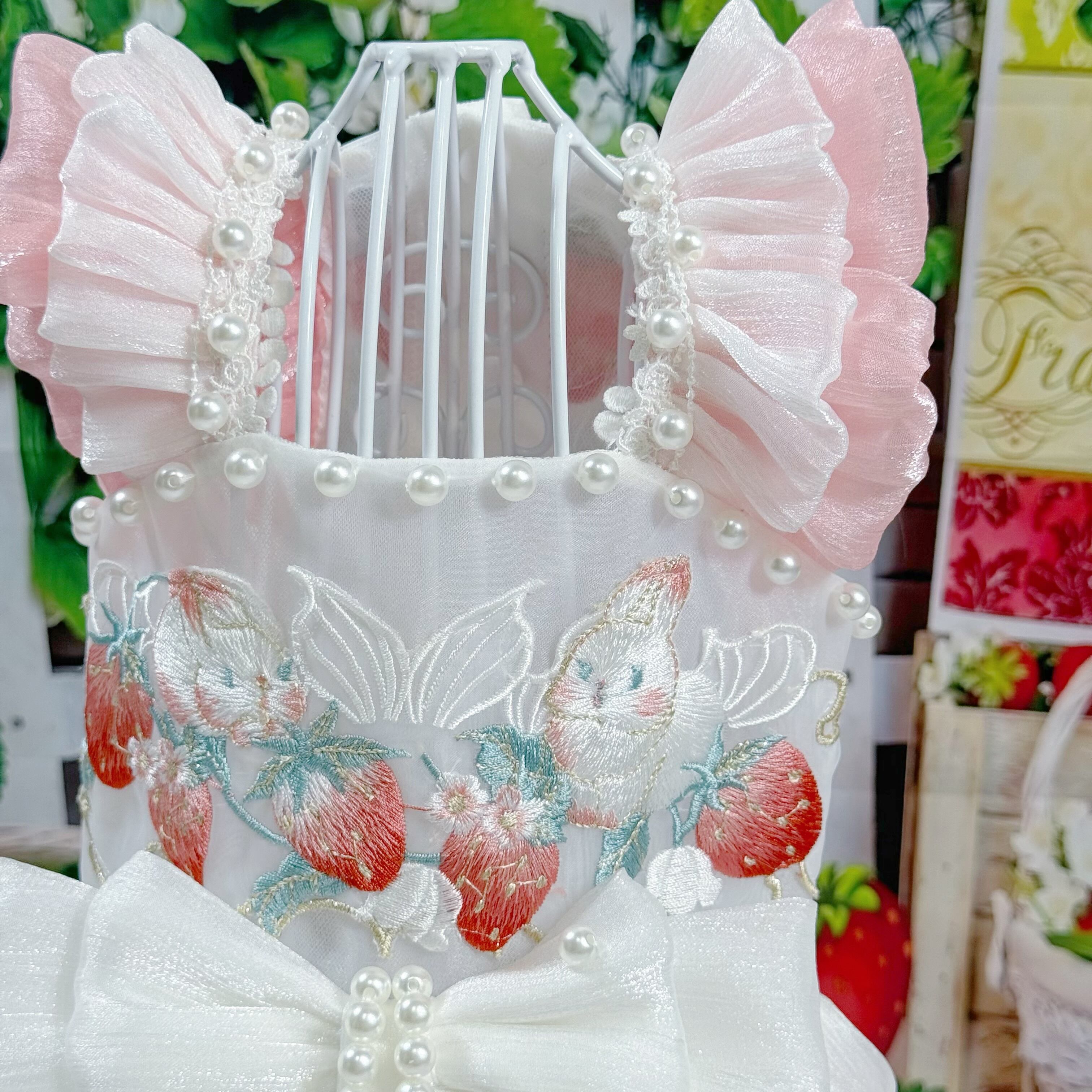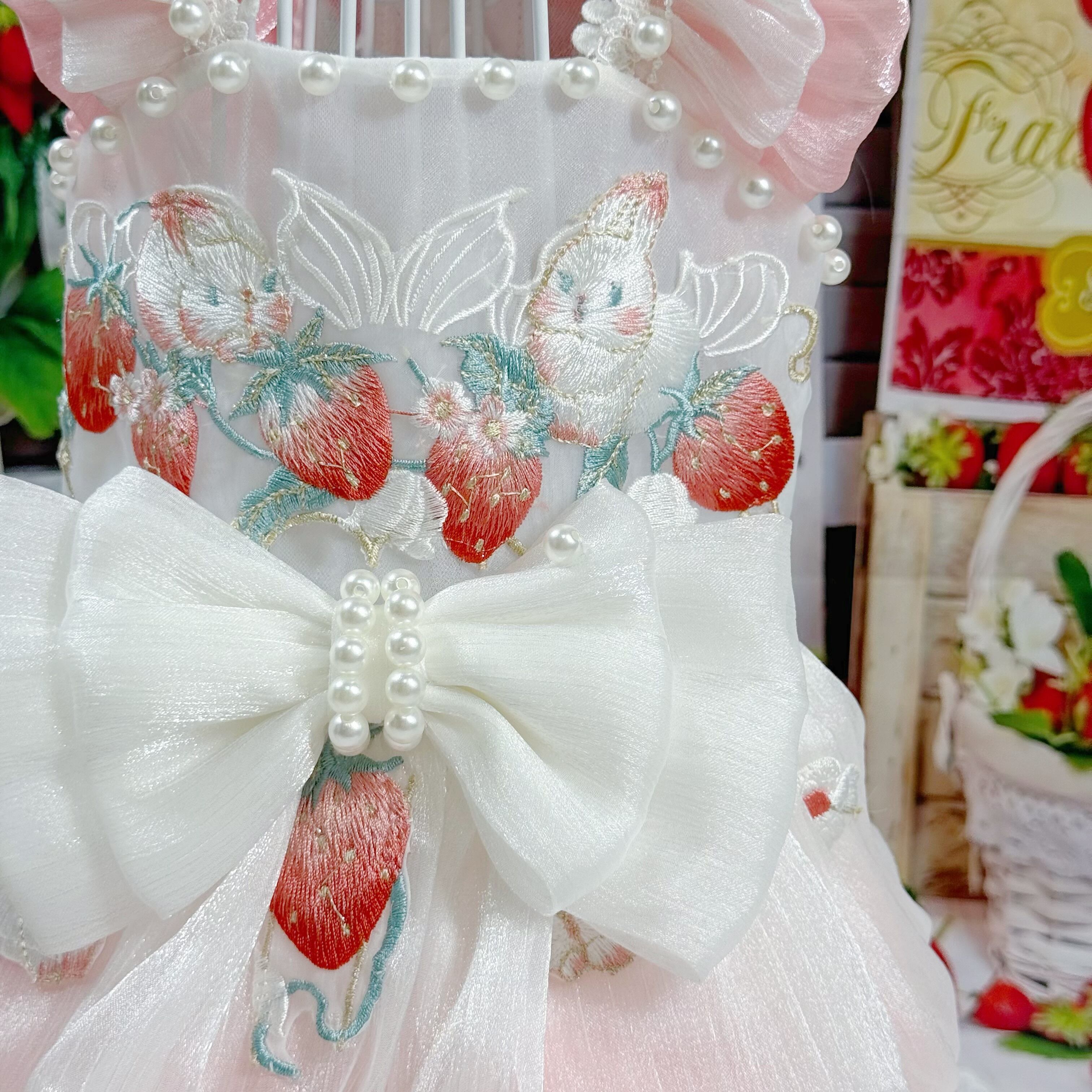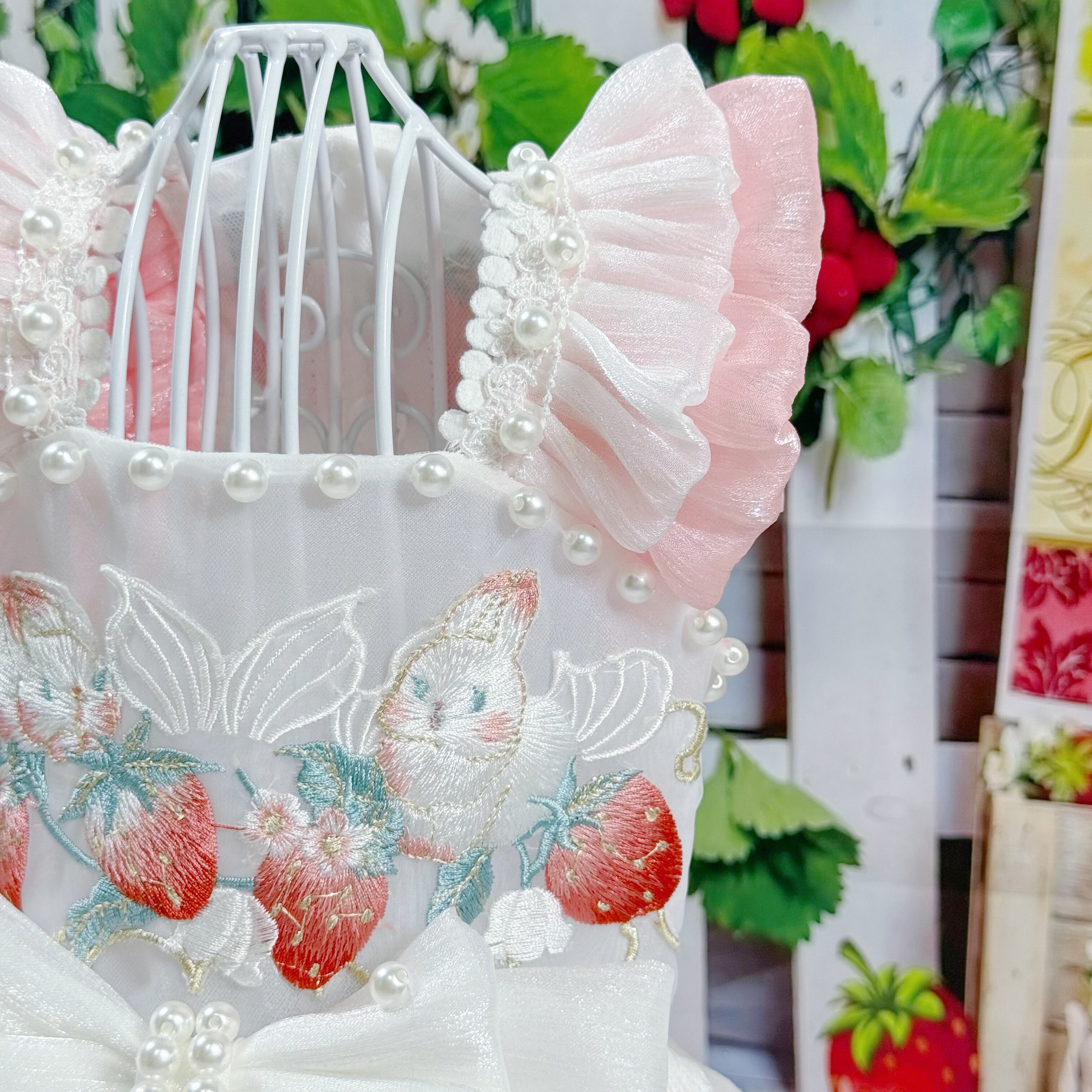 さらに、ウサギちゃんの丸いお顔や、いちごのぷっくりした形が、丁寧な刺繍でドレスに描かれています♡
