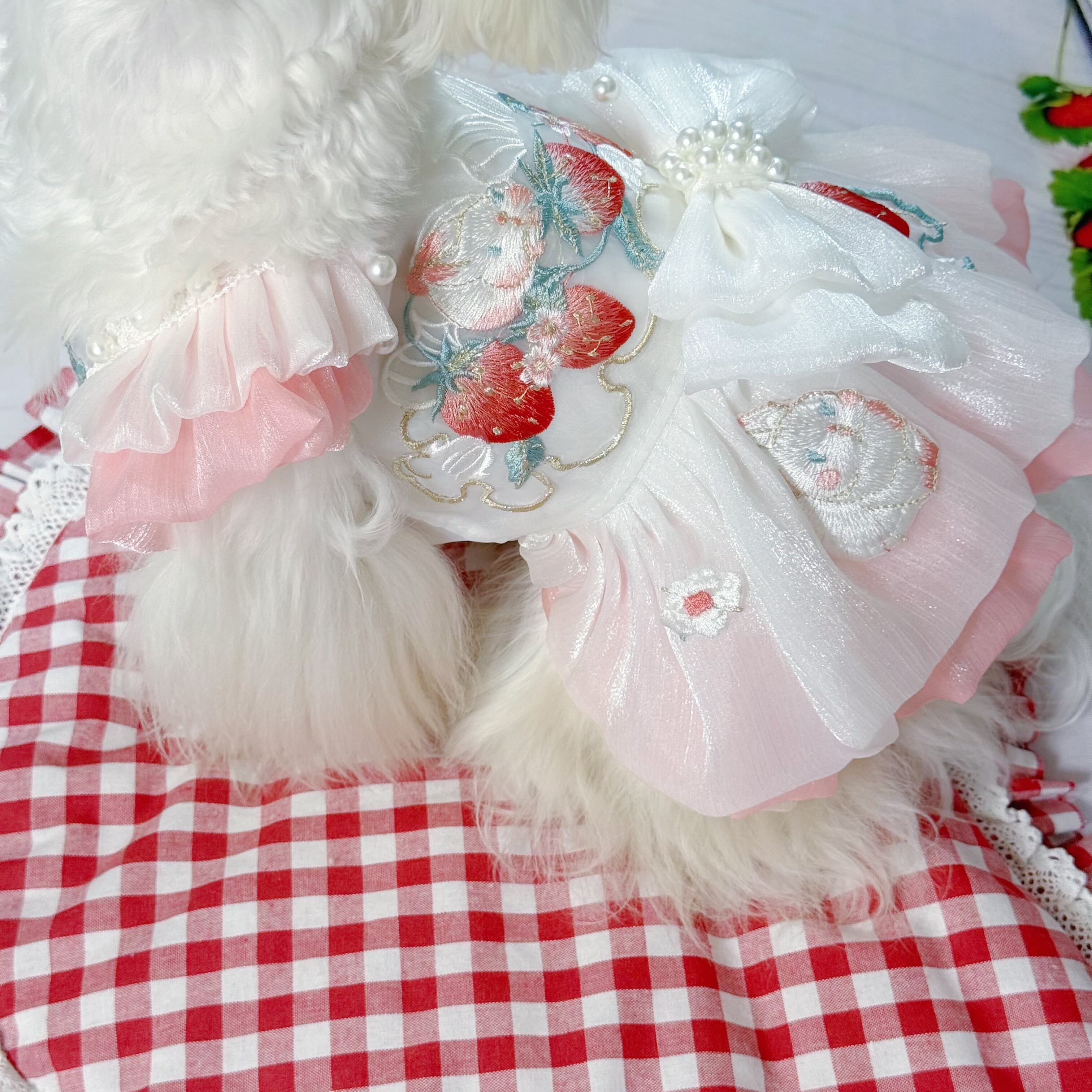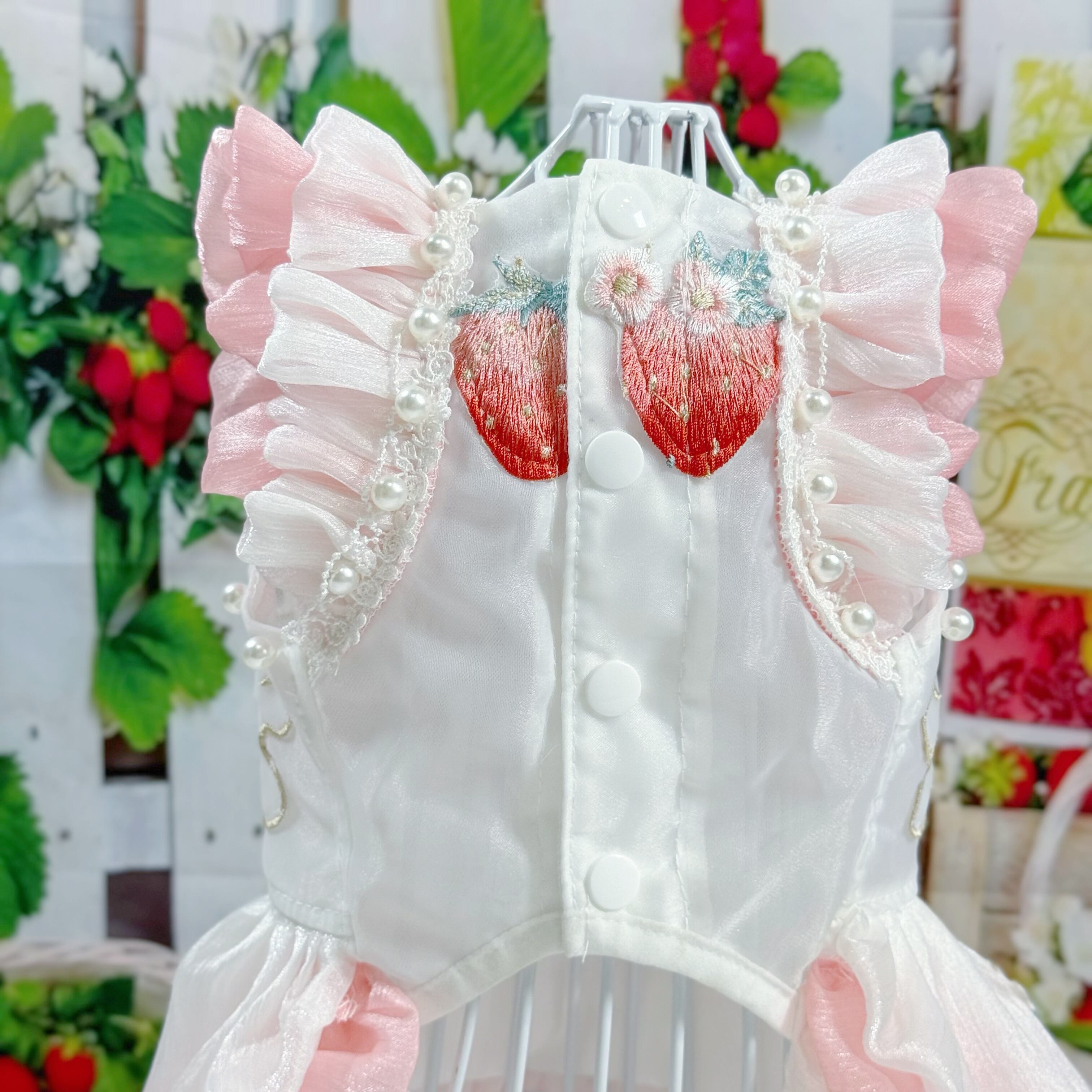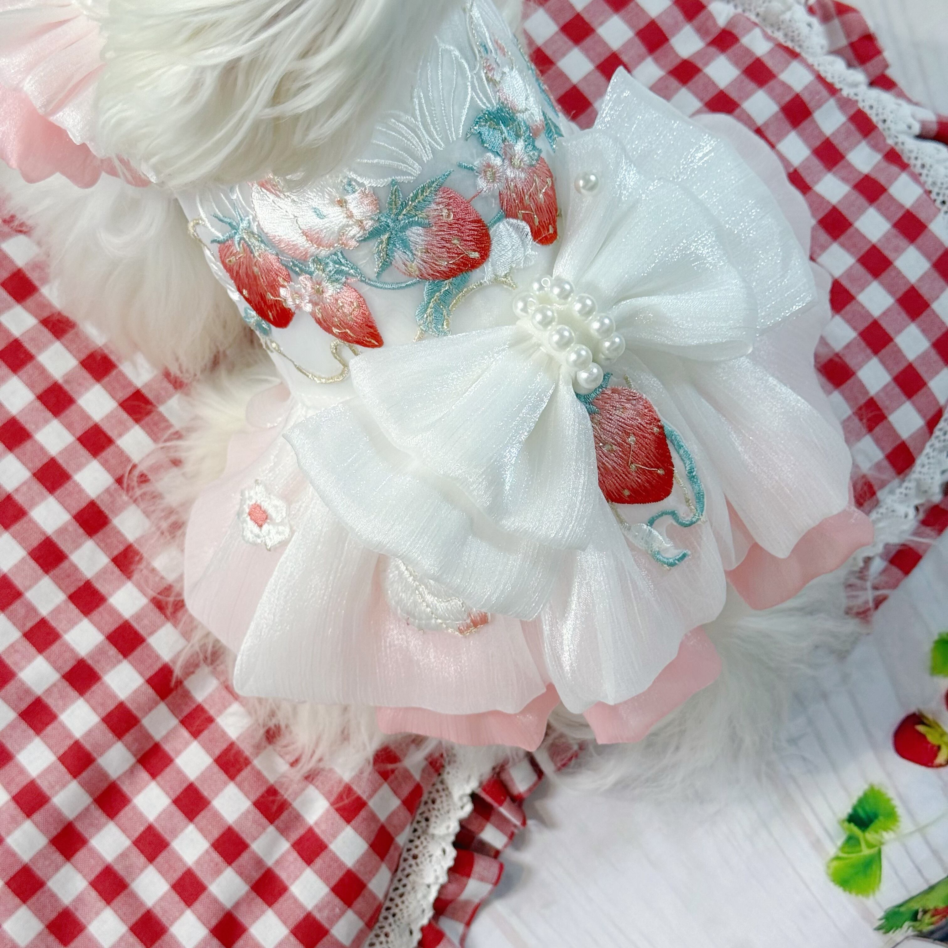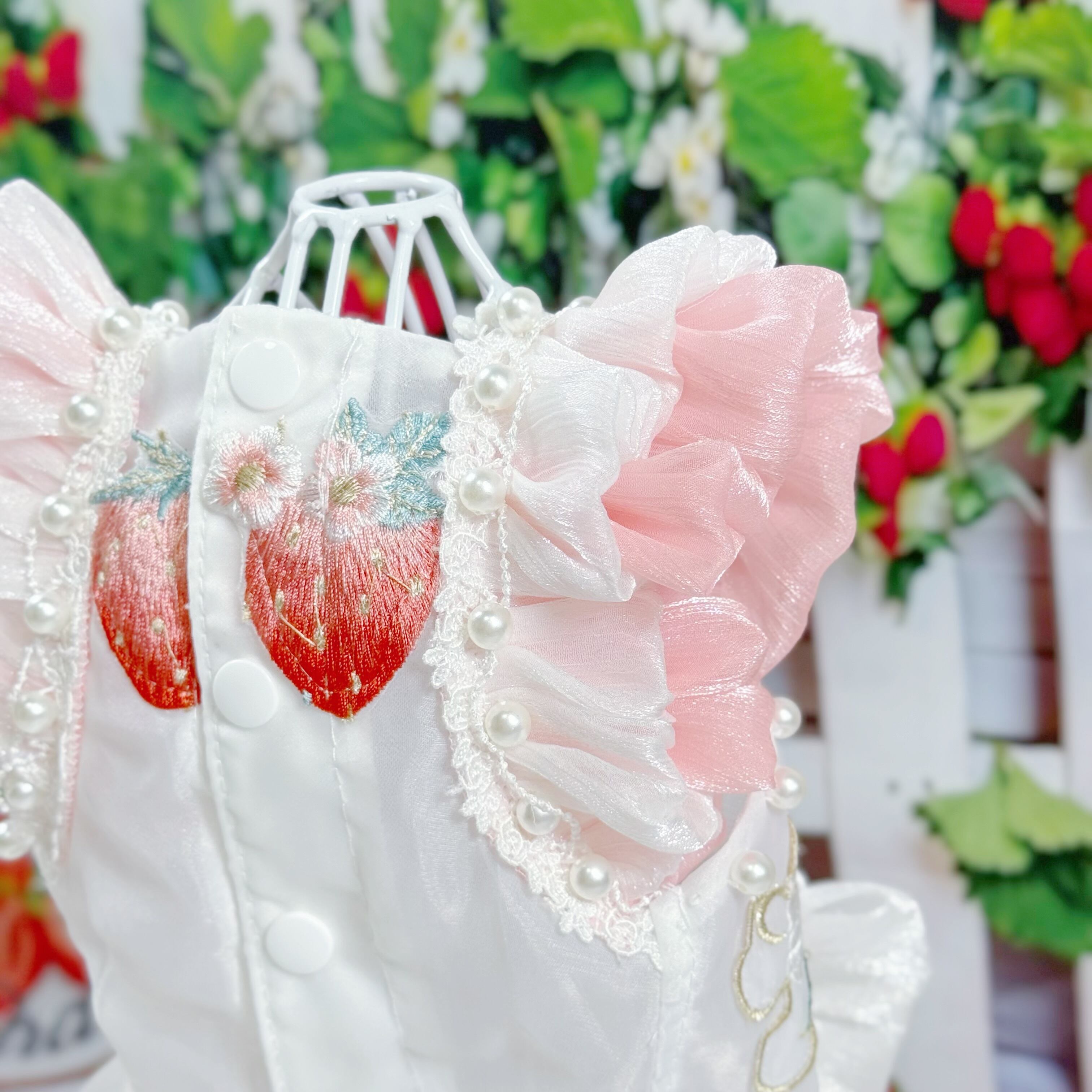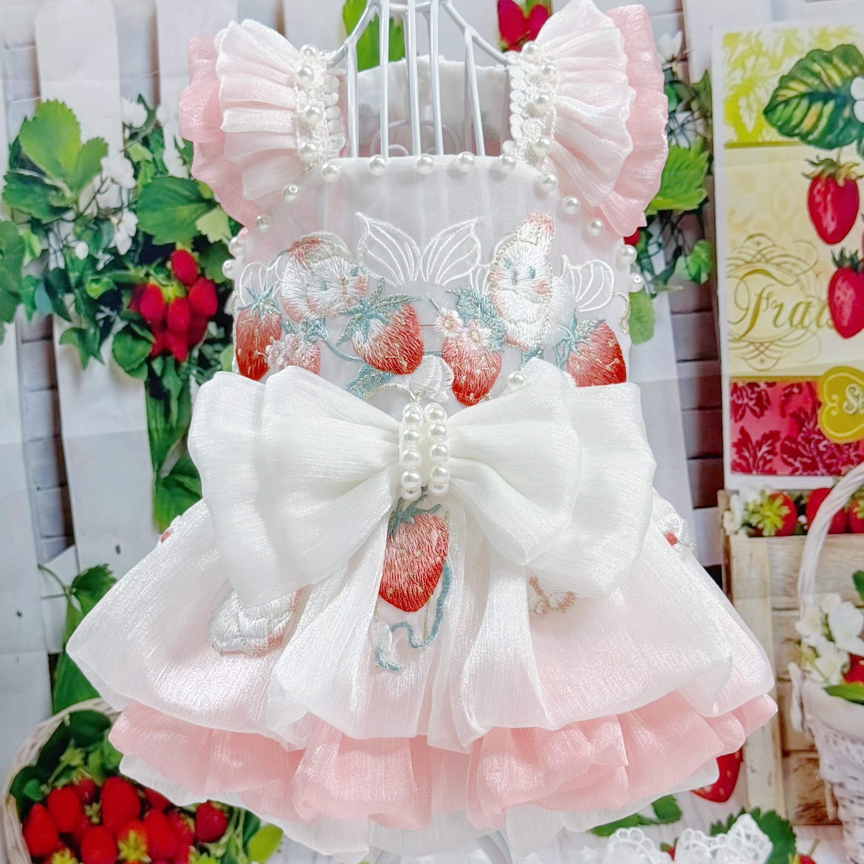 さらに、ウサギちゃんの丸いお顔や、いちごのぷっくりした形が、丁寧な刺繍でドレスに描かれています♡