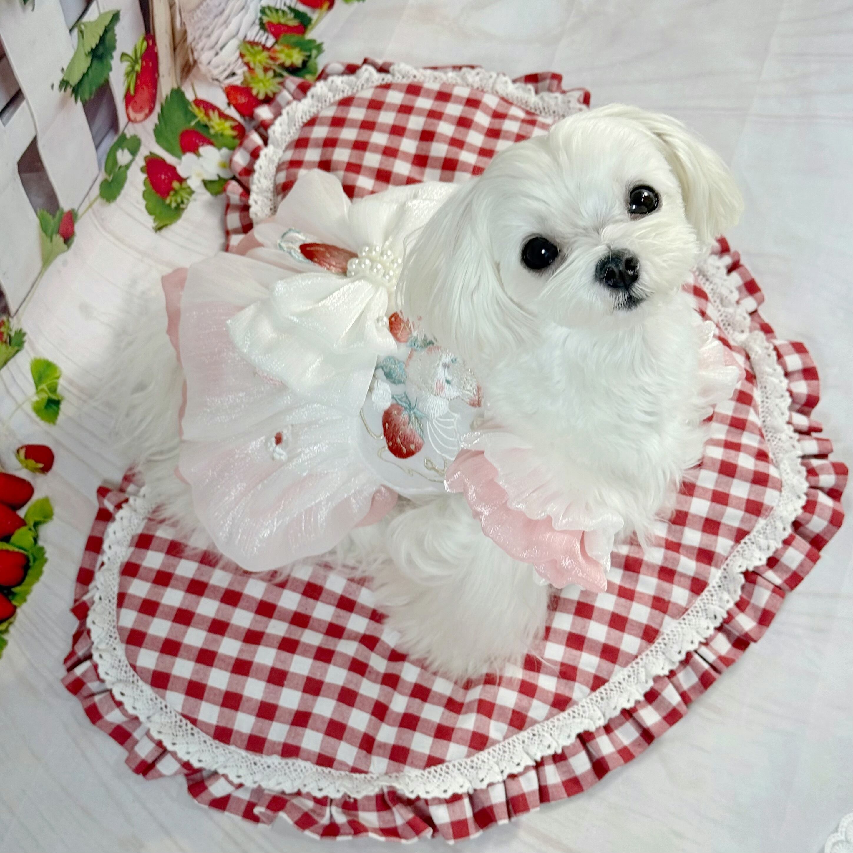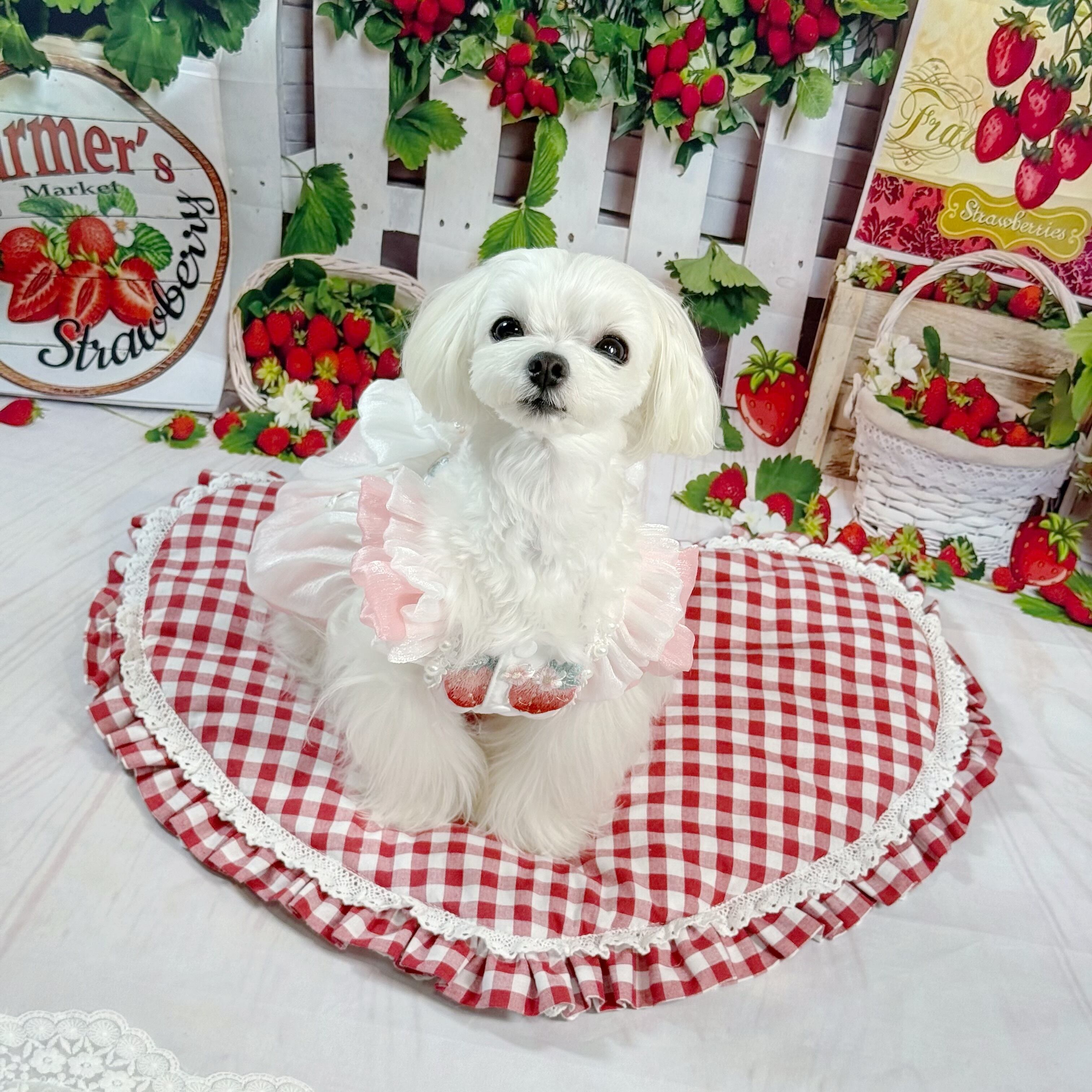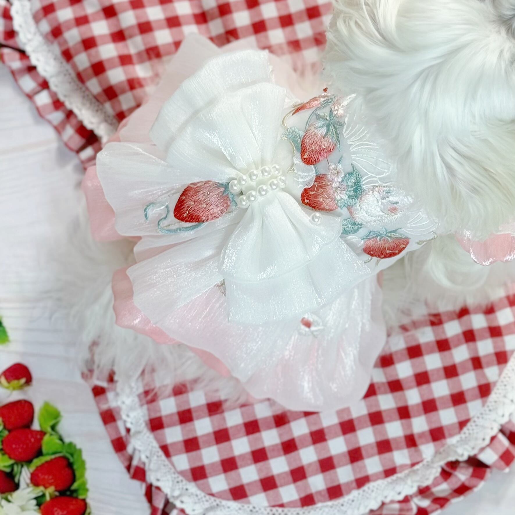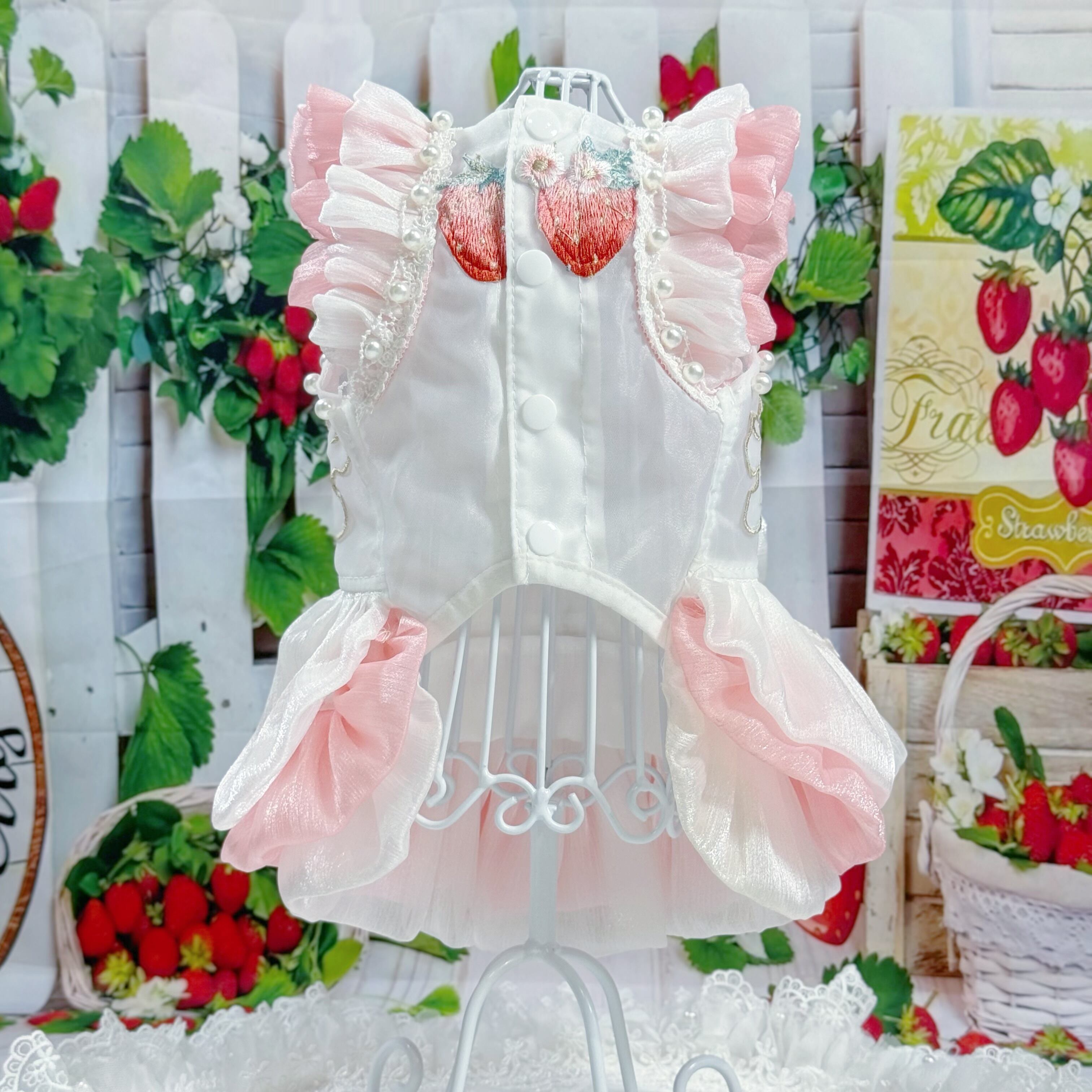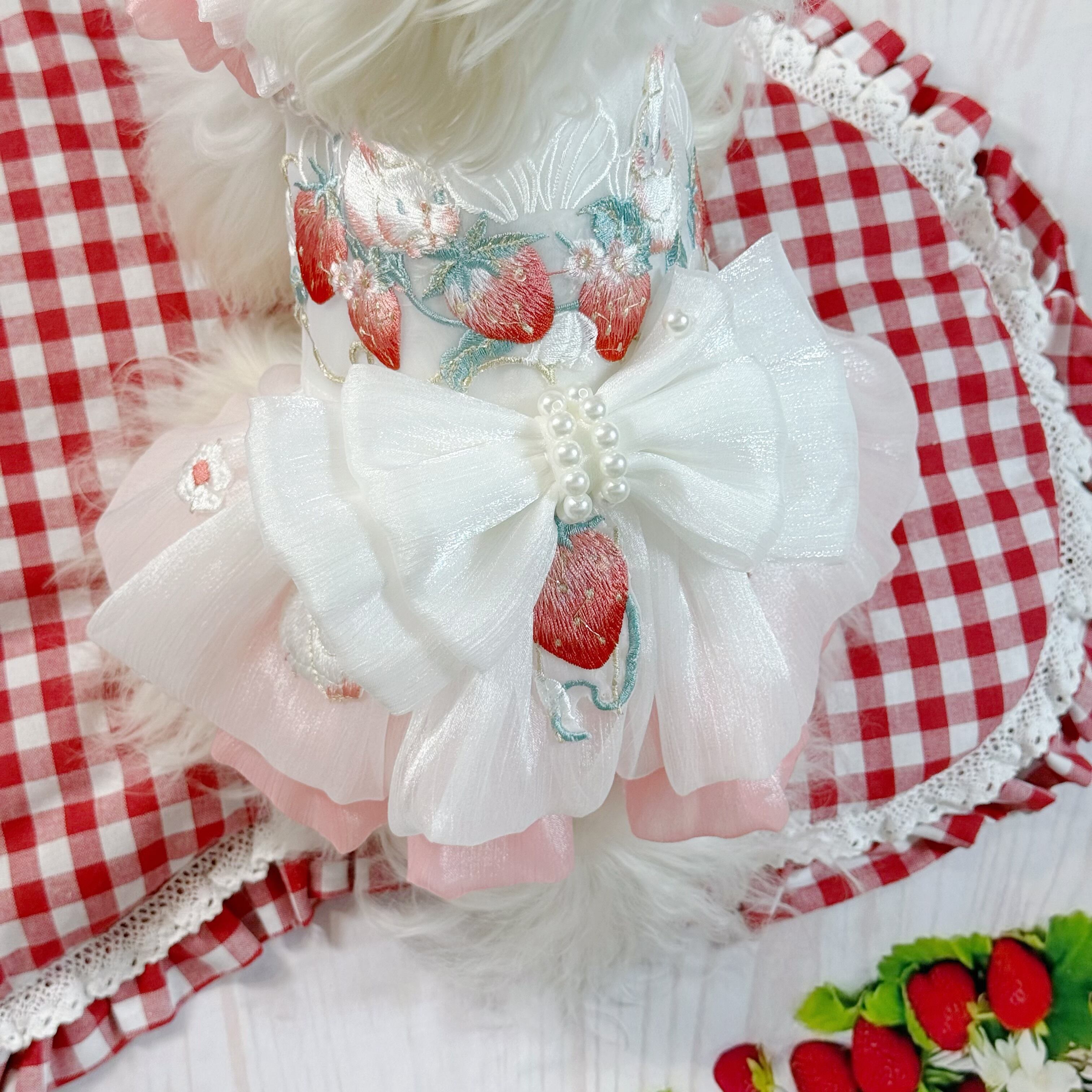 さらに、ウサギちゃんの丸いお顔や、いちごのぷっくりした形が、丁寧な刺繍でドレスに描かれています♡