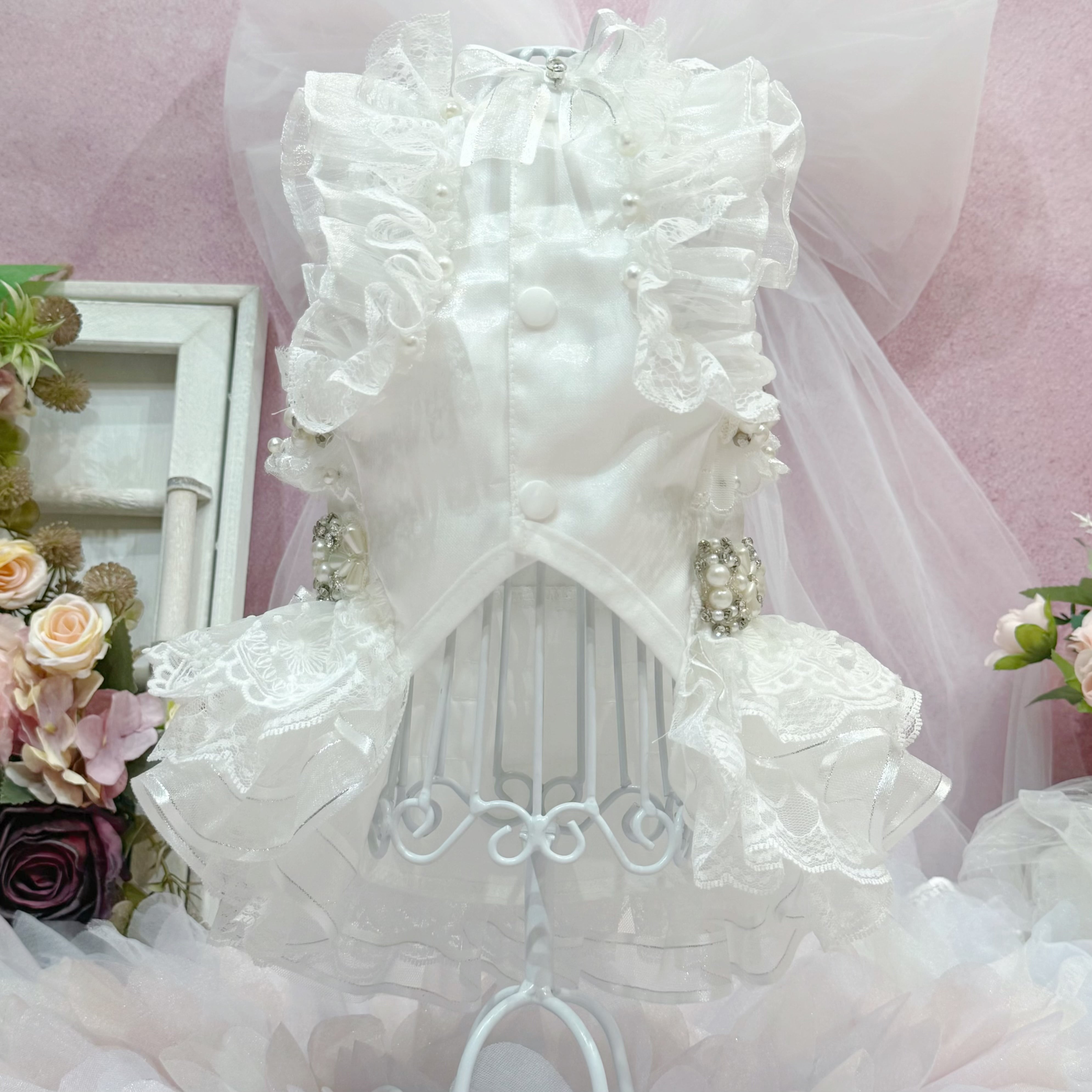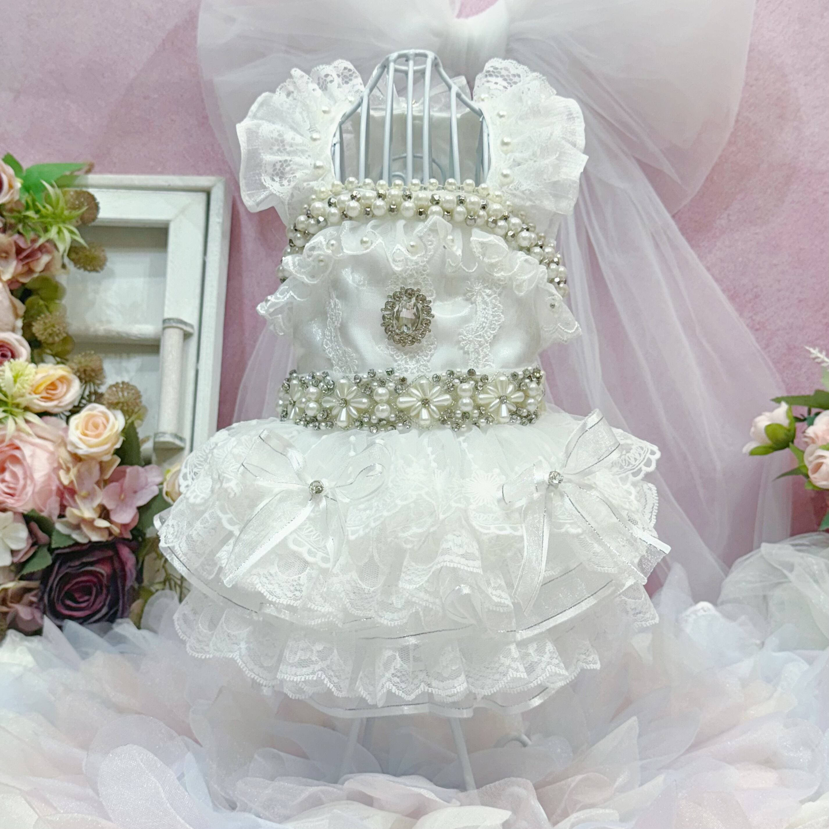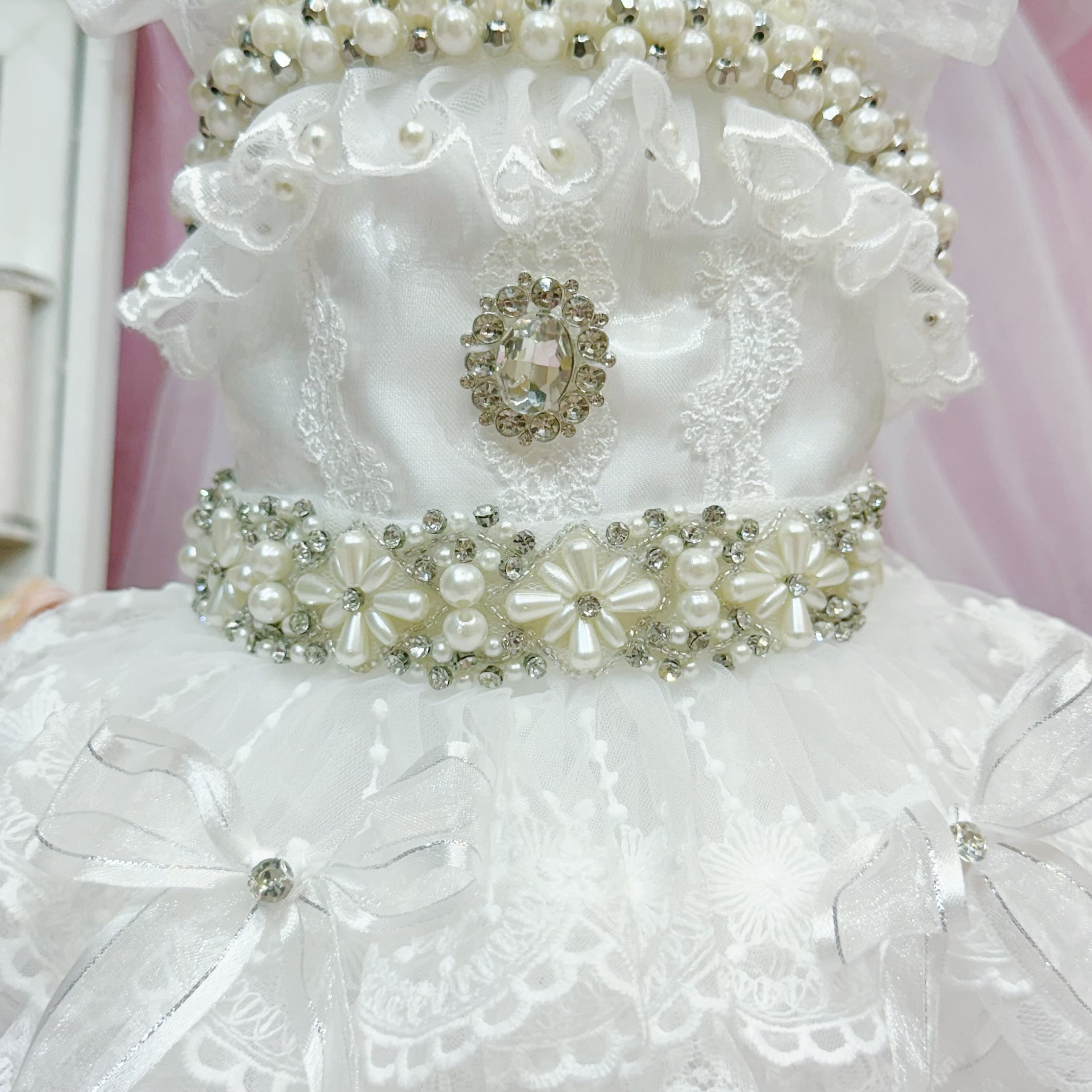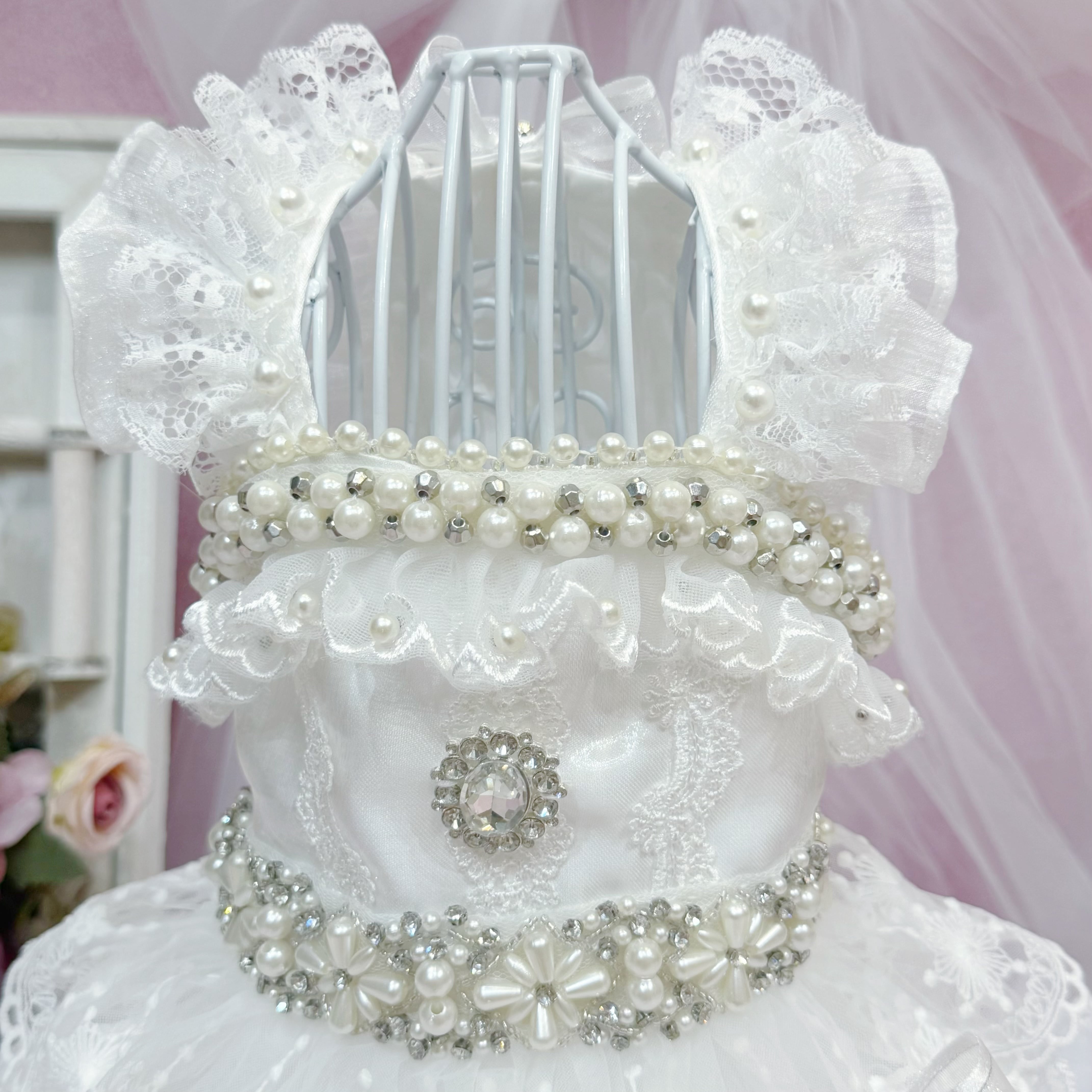 その他のアクセントも豪華度全開✨首周りとウエストには、大きなパールを組み合わせたパールの花と、キラキラと輝くストーンを飾り付け。袖もチュールとレースを重ねたフリルデザインで、可愛らしさがダブルアップ♡ 背中にはさらに大きなストーンがひときわ光り、全体の華やかさを引き立てています✨