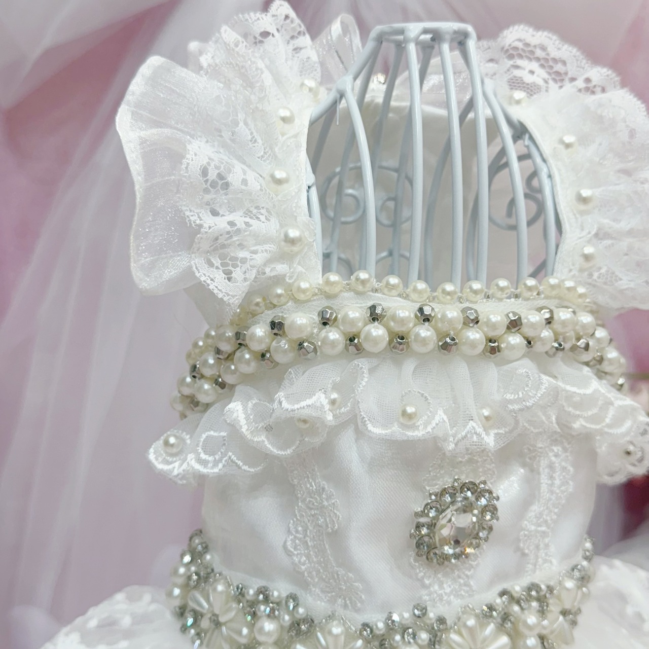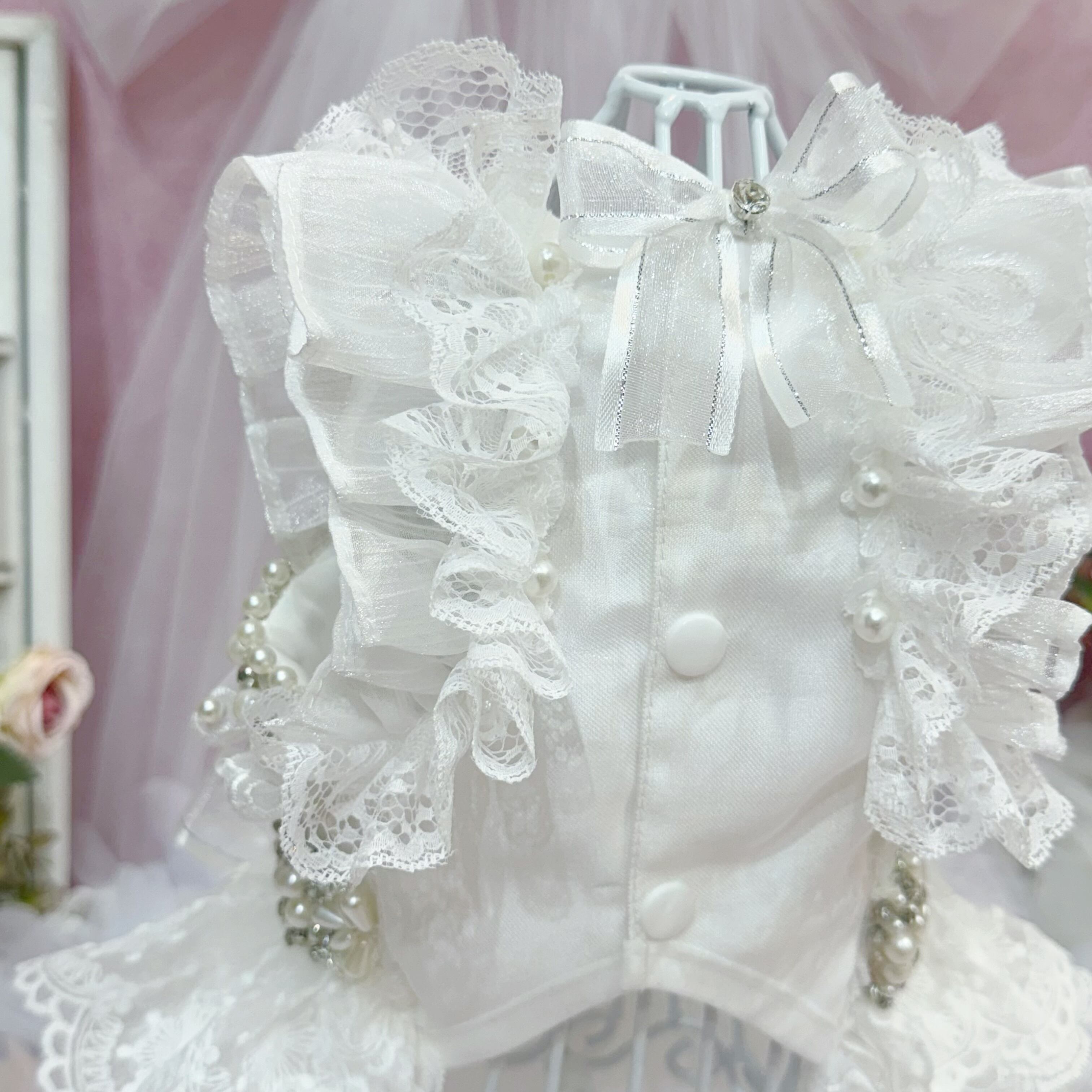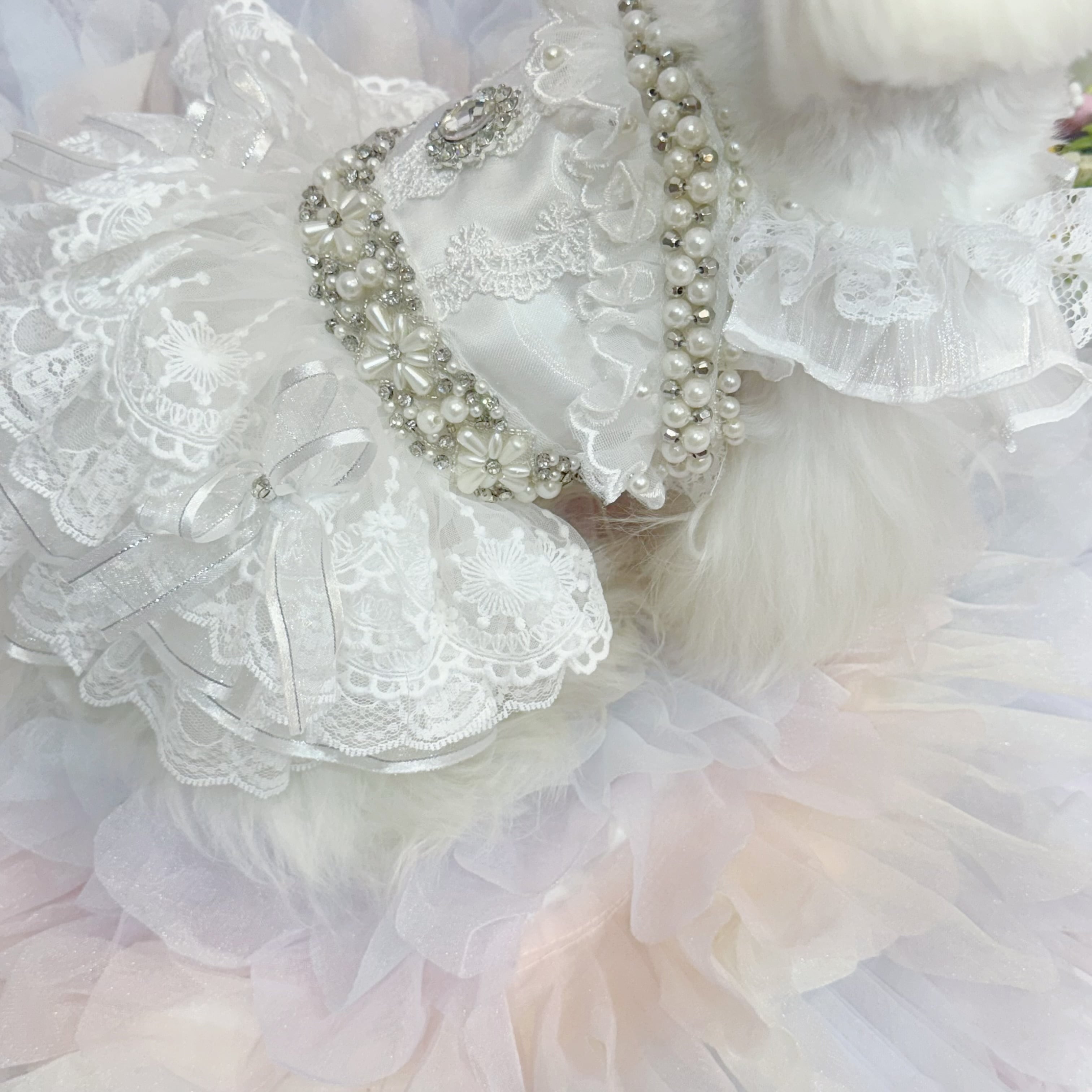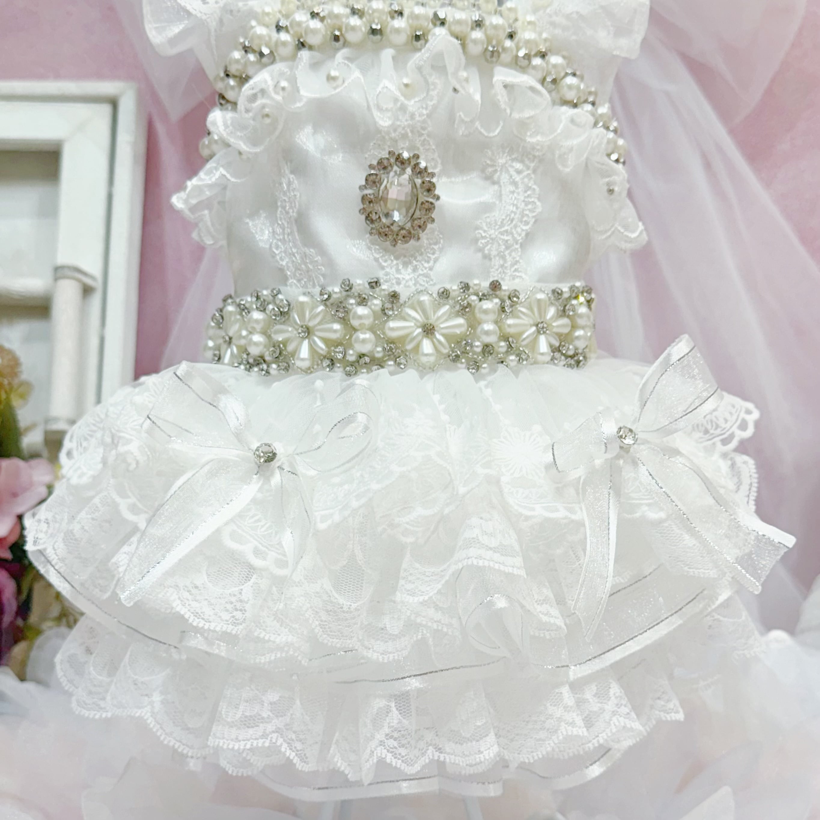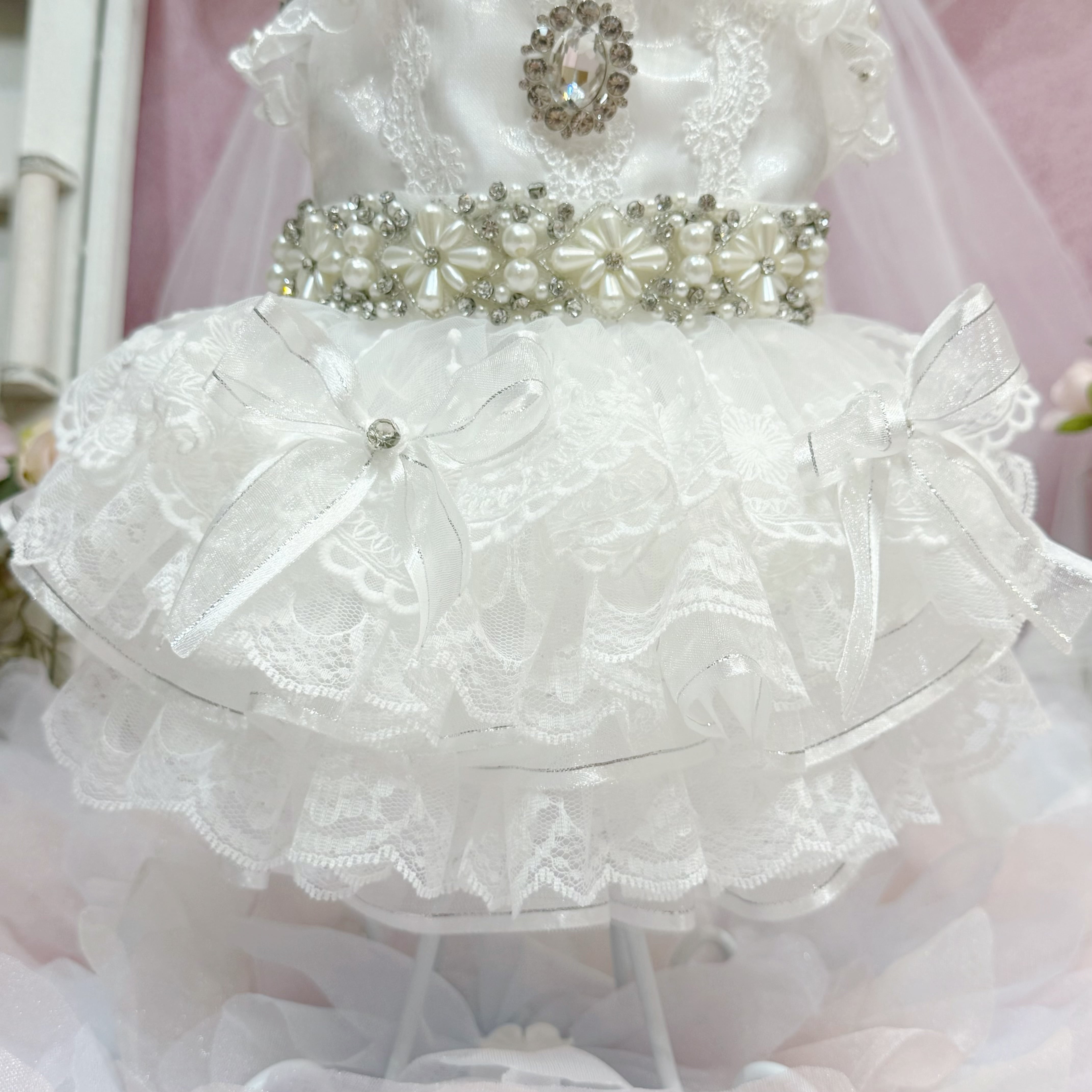 その他のアクセントも豪華度全開✨首周りとウエストには、大きなパールを組み合わせたパールの花と、キラキラと輝くストーンを飾り付け。袖もチュールとレースを重ねたフリルデザインで、可愛らしさがダブルアップ♡ 背中にはさらに大きなストーンがひときわ光り、全体の華やかさを引き立てています✨