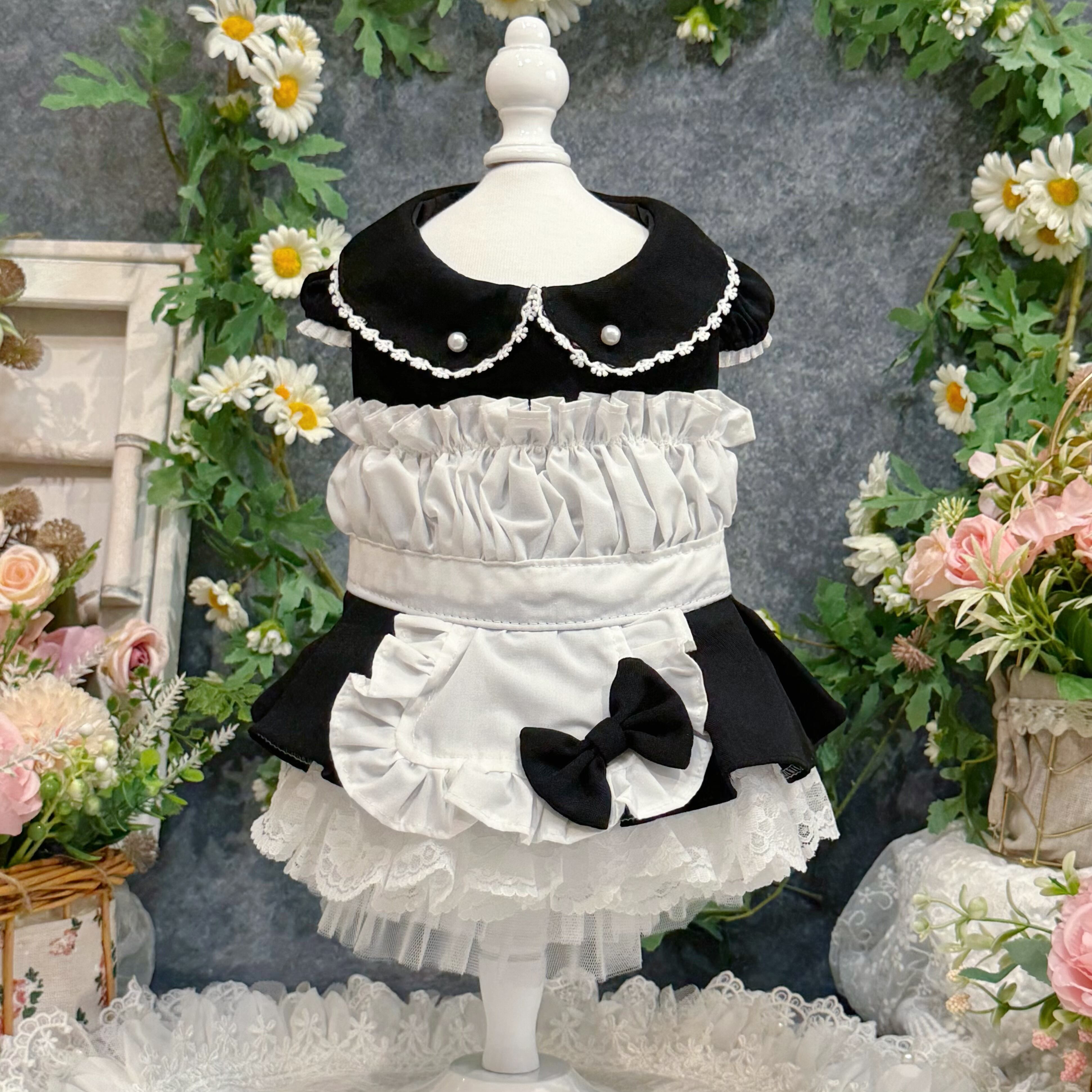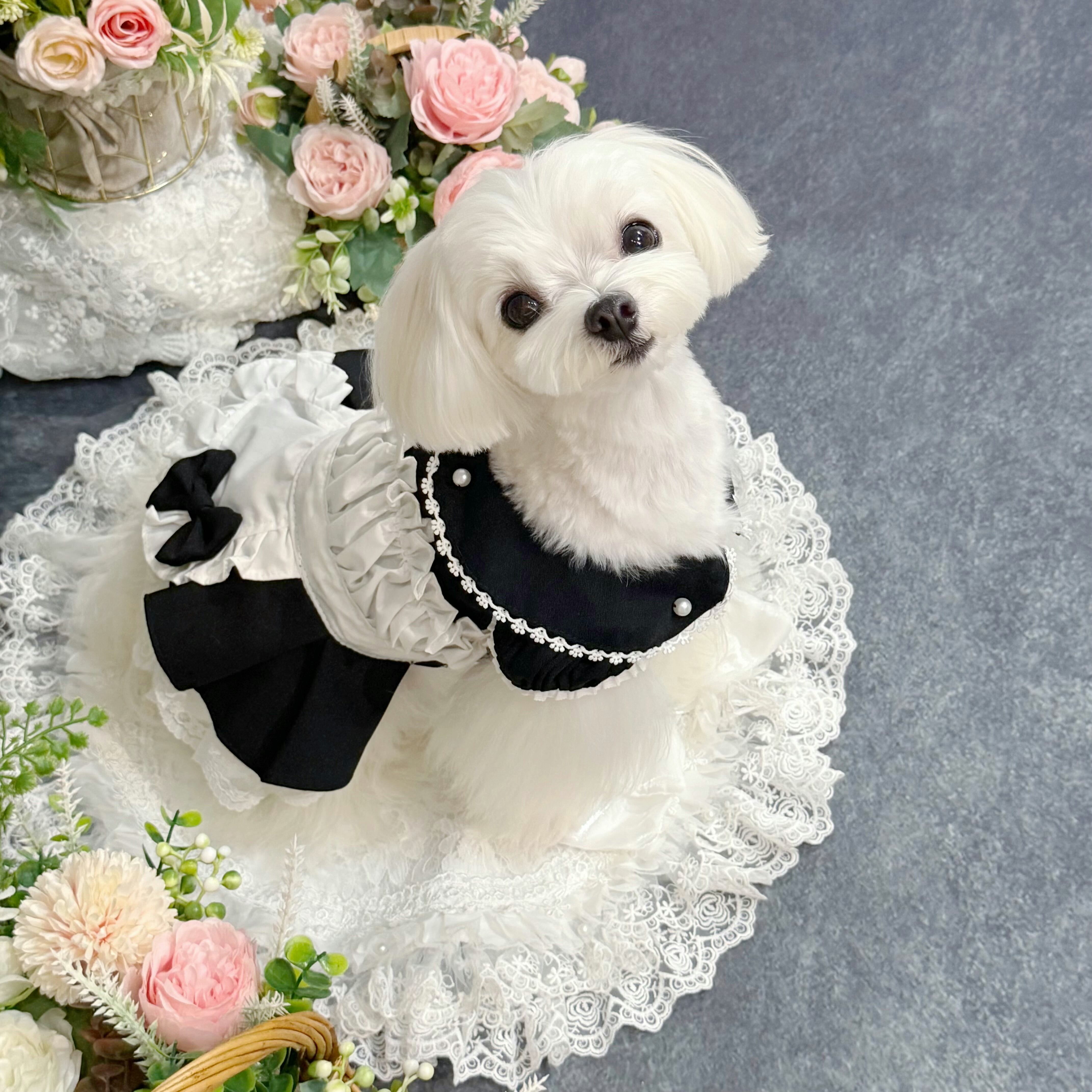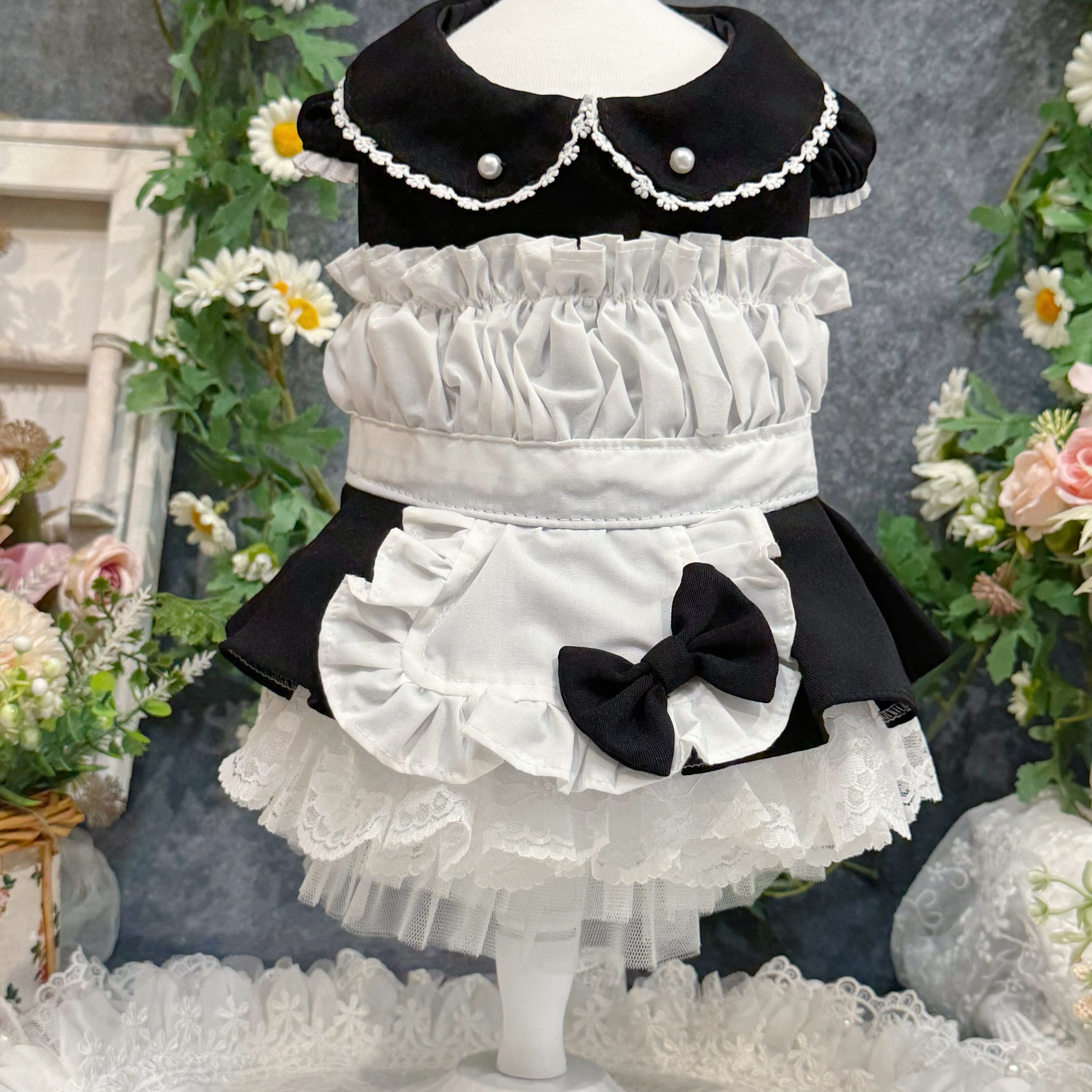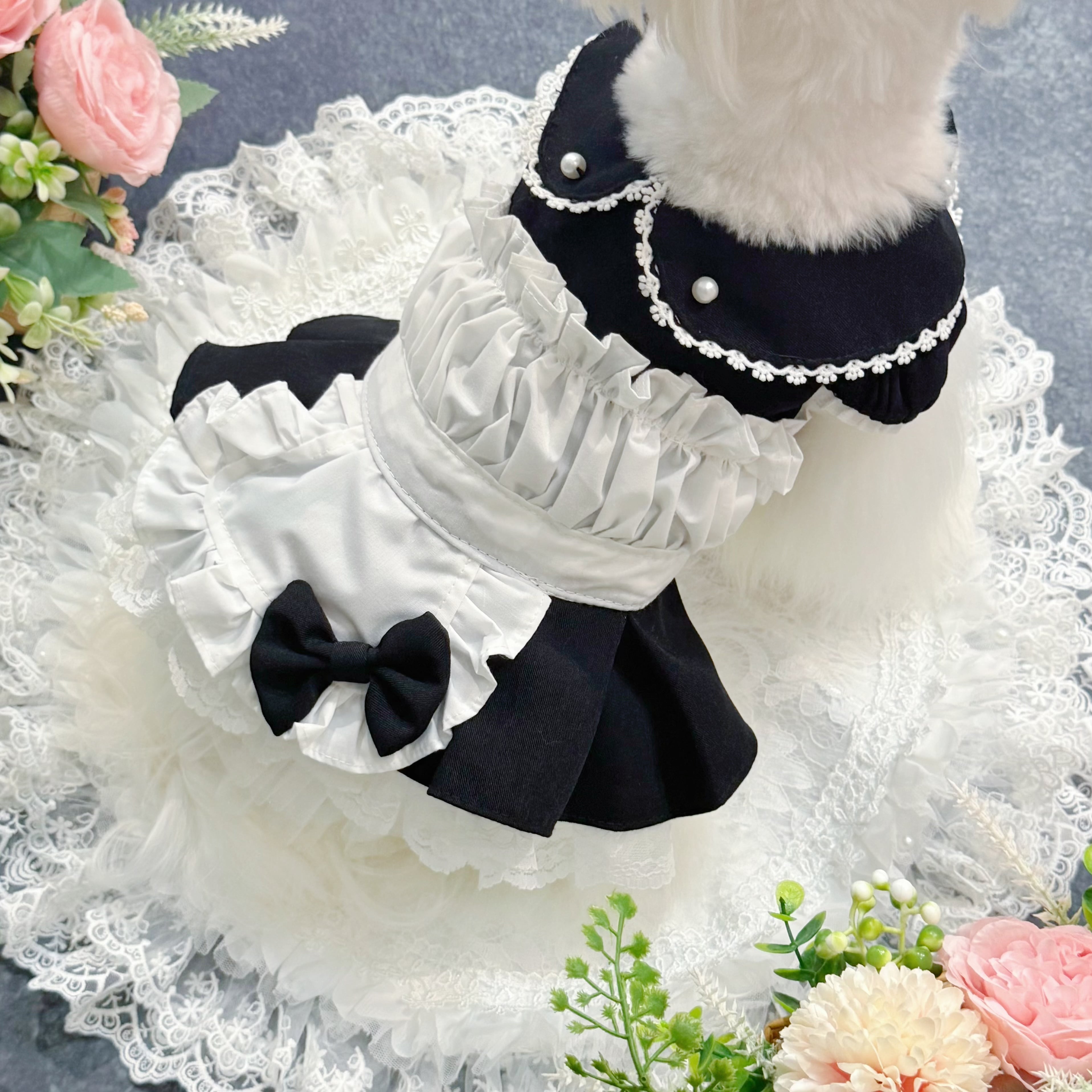 19世紀イギリスの正統派メイド服を愛でつつ、アレンジしたこのドレス、まさにヴィクトリア朝時代のロマンティックな世界観を最大限に引き出しています✨ 配色は白と黒の王道コンビ!どんな犬ちゃんに着せても絶対に映える仕上がりです♡