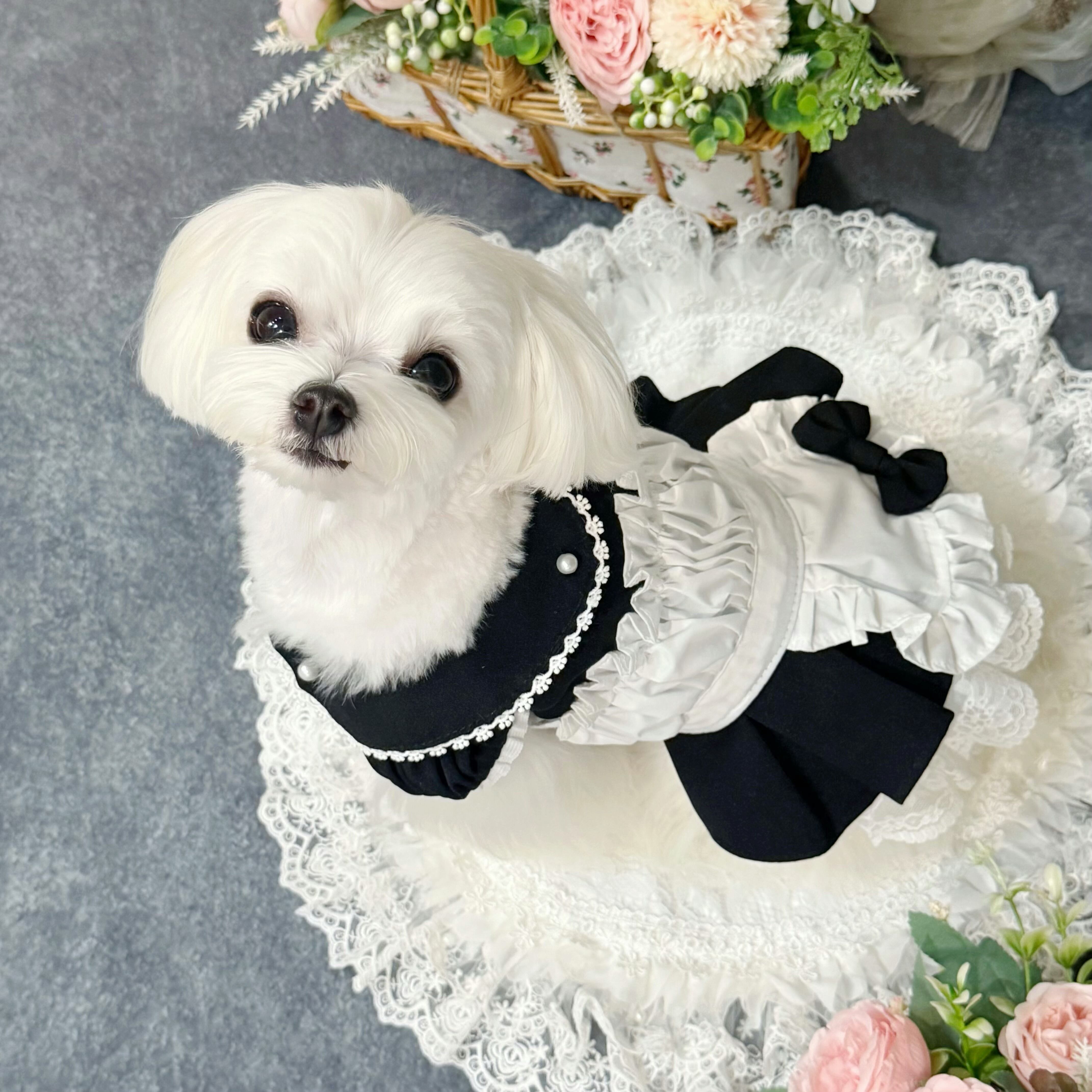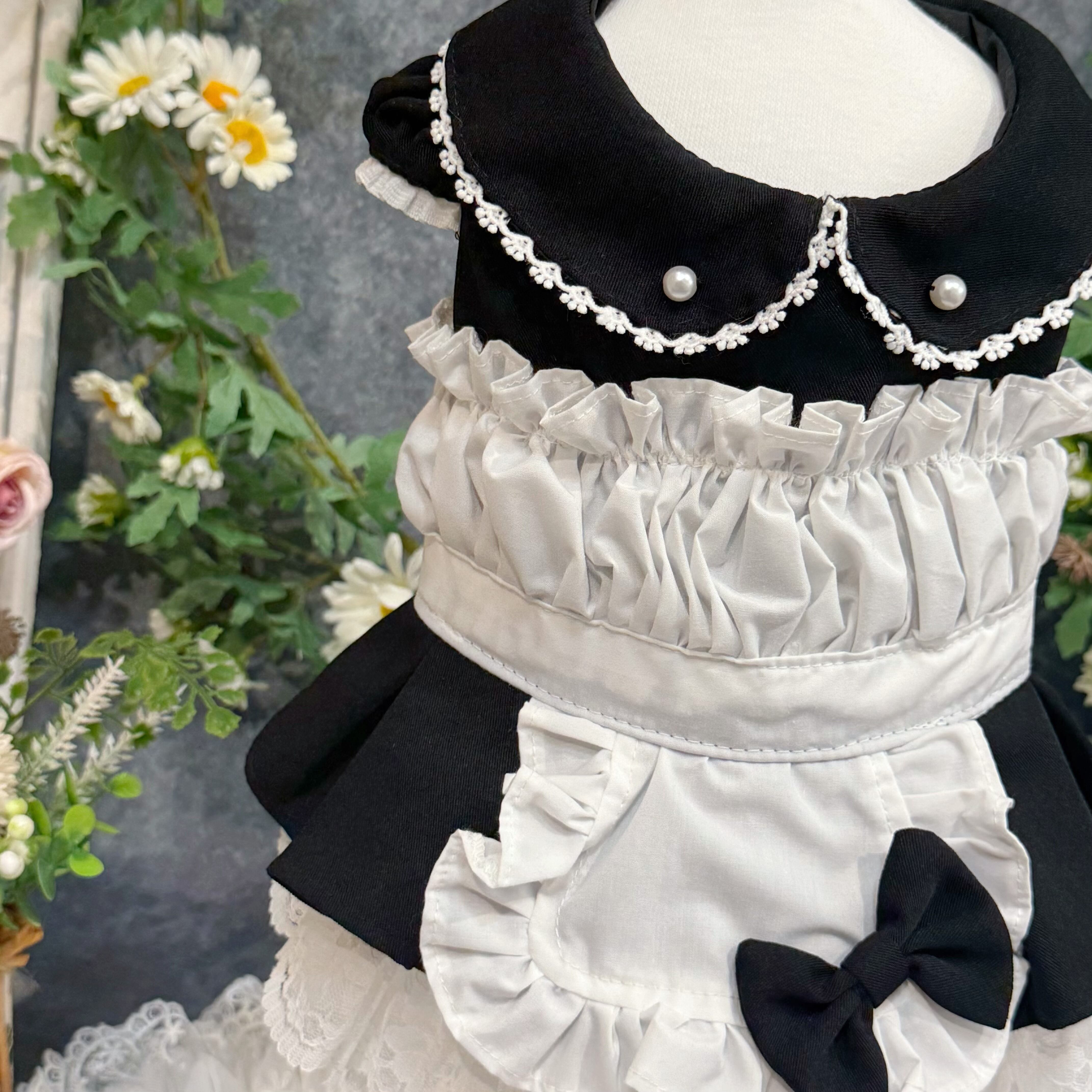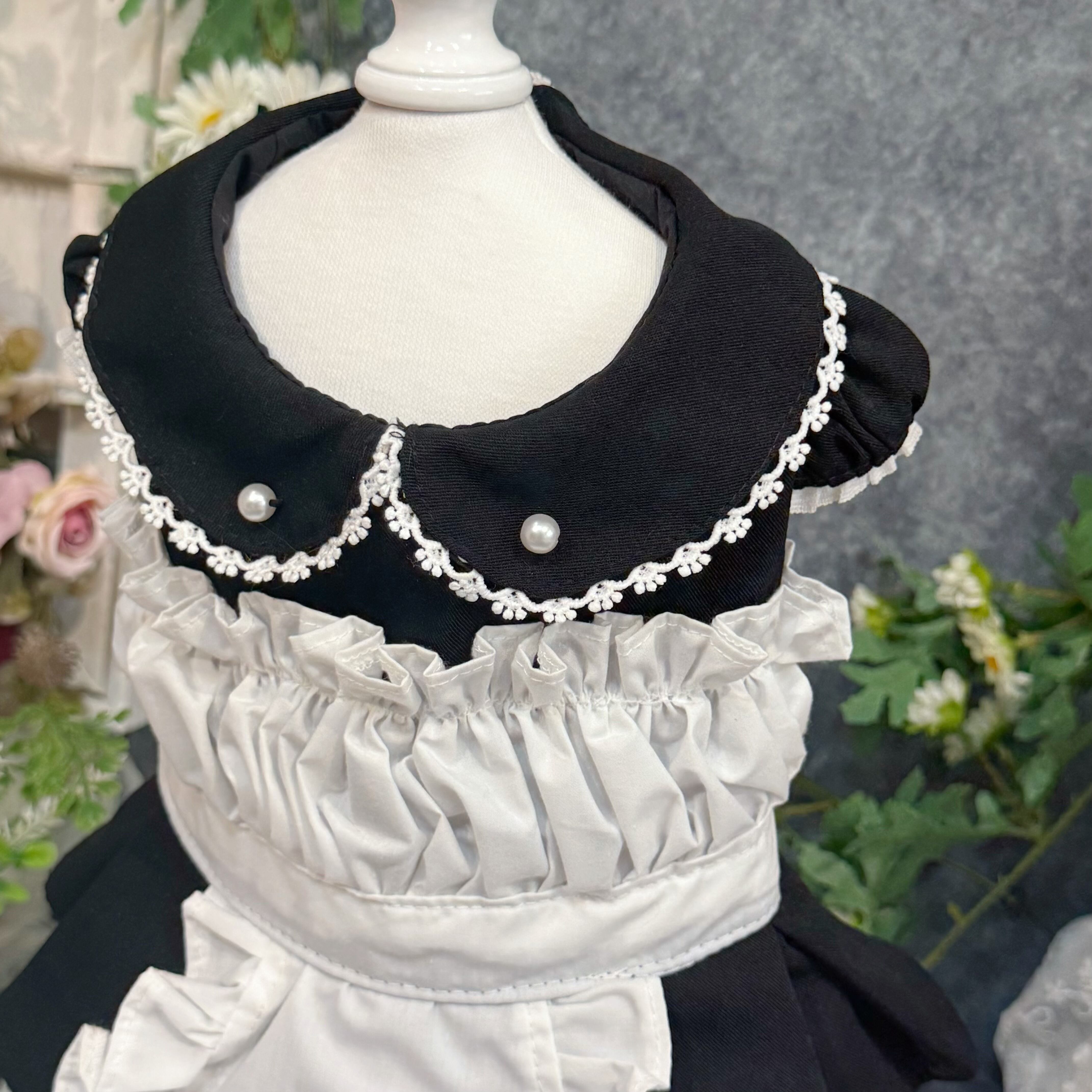 19世紀イギリスの正統派メイド服を愛でつつ、アレンジしたこのドレス、まさにヴィクトリア朝時代のロマンティックな世界観を最大限に引き出しています✨ 配色は白と黒の王道コンビ!どんな犬ちゃんに着せても絶対に映える仕上がりです♡