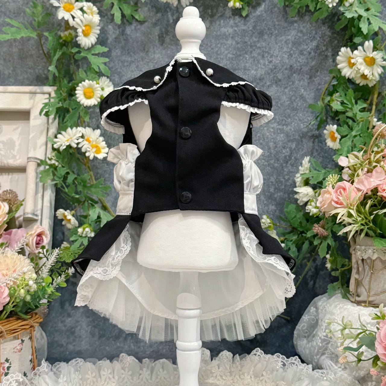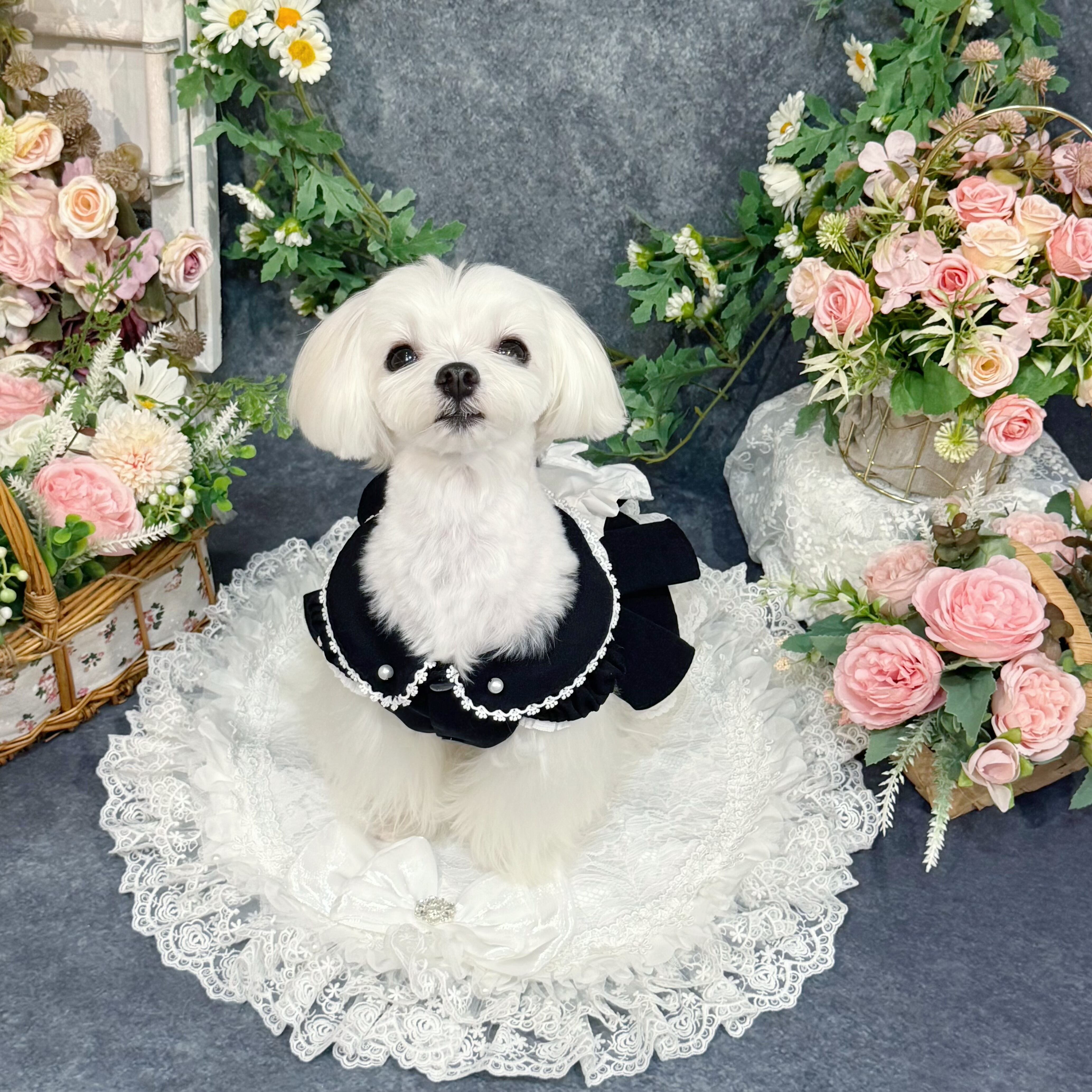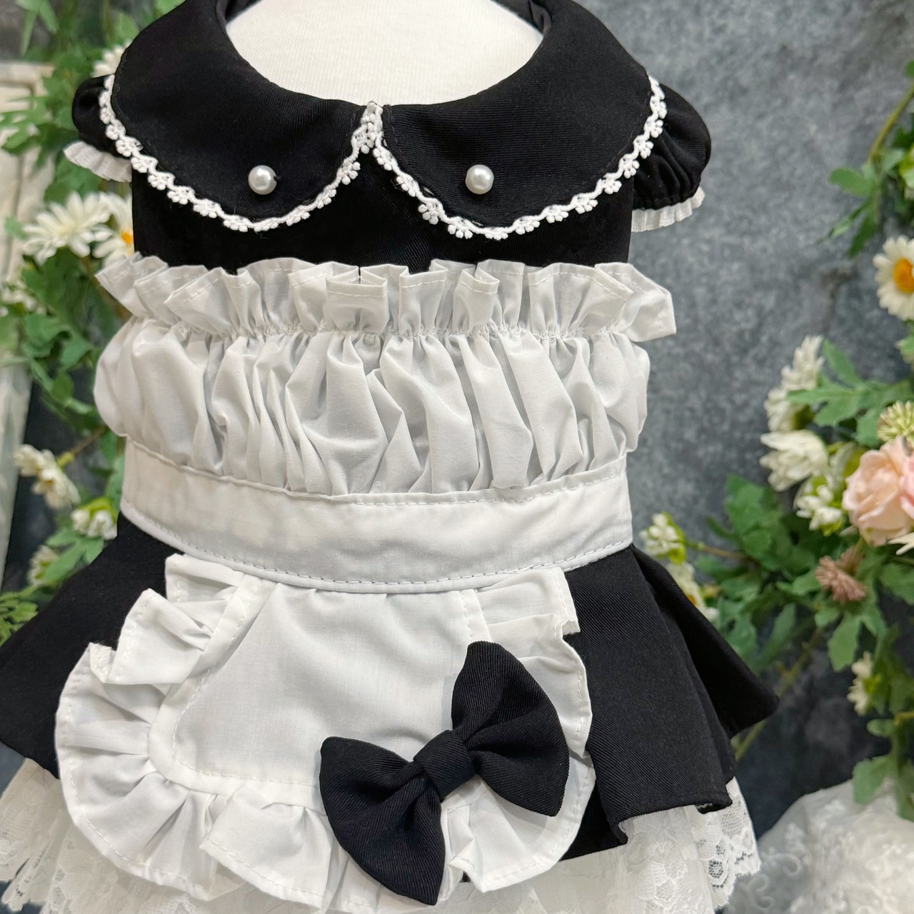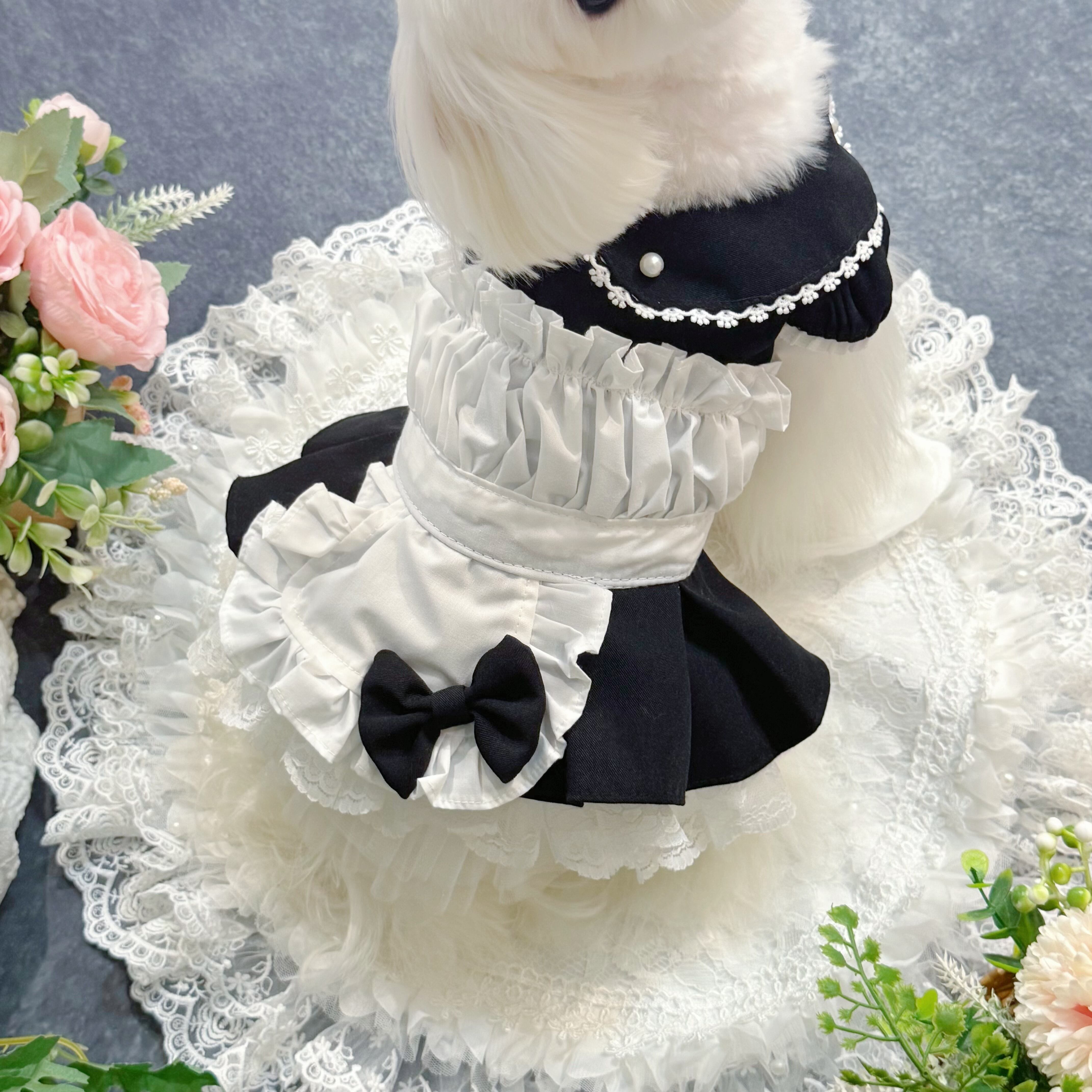 19世紀イギリスの正統派メイド服を愛でつつ、アレンジしたこのドレス、まさにヴィクトリア朝時代のロマンティックな世界観を最大限に引き出しています✨ 配色は白と黒の王道コンビ!どんな犬ちゃんに着せても絶対に映える仕上がりです♡