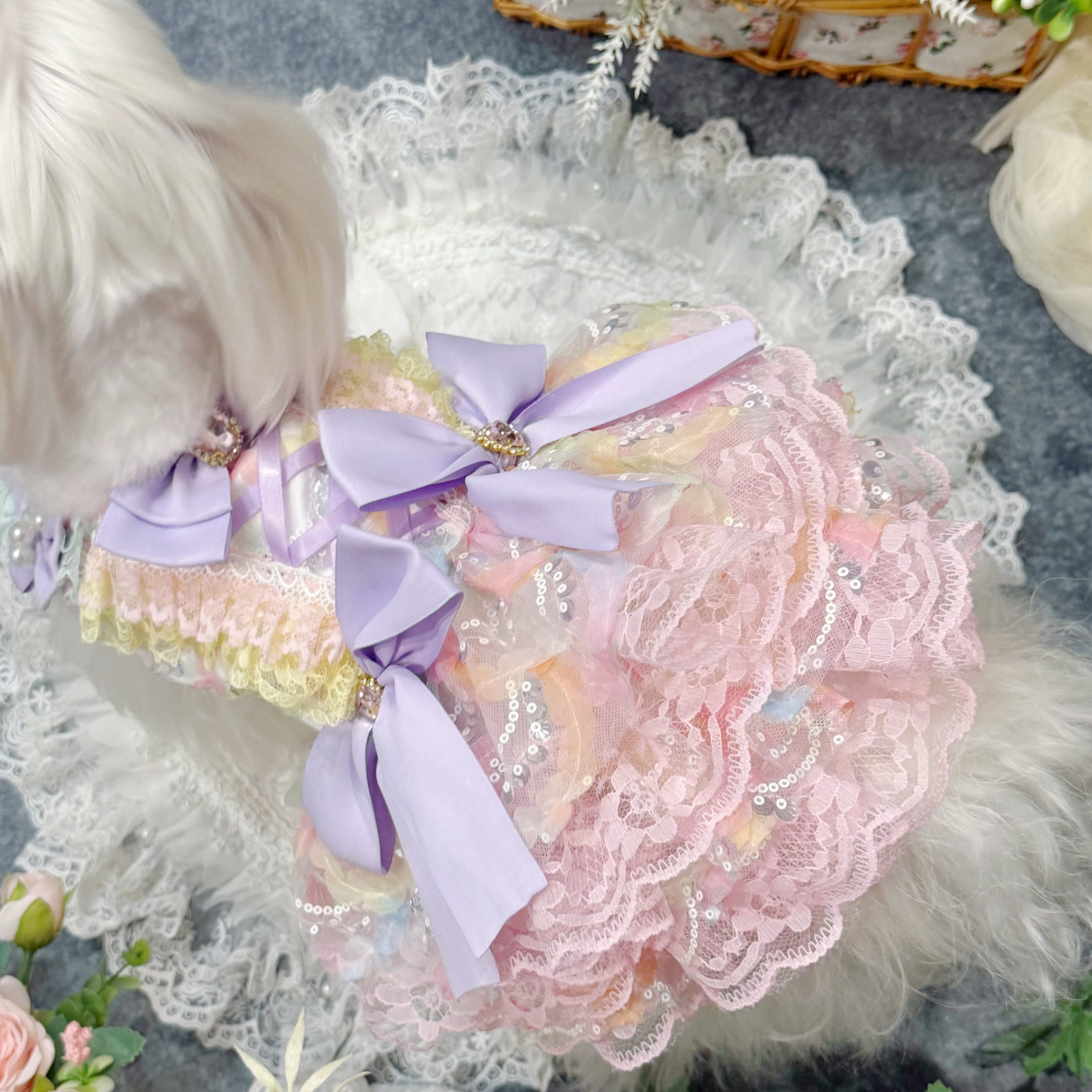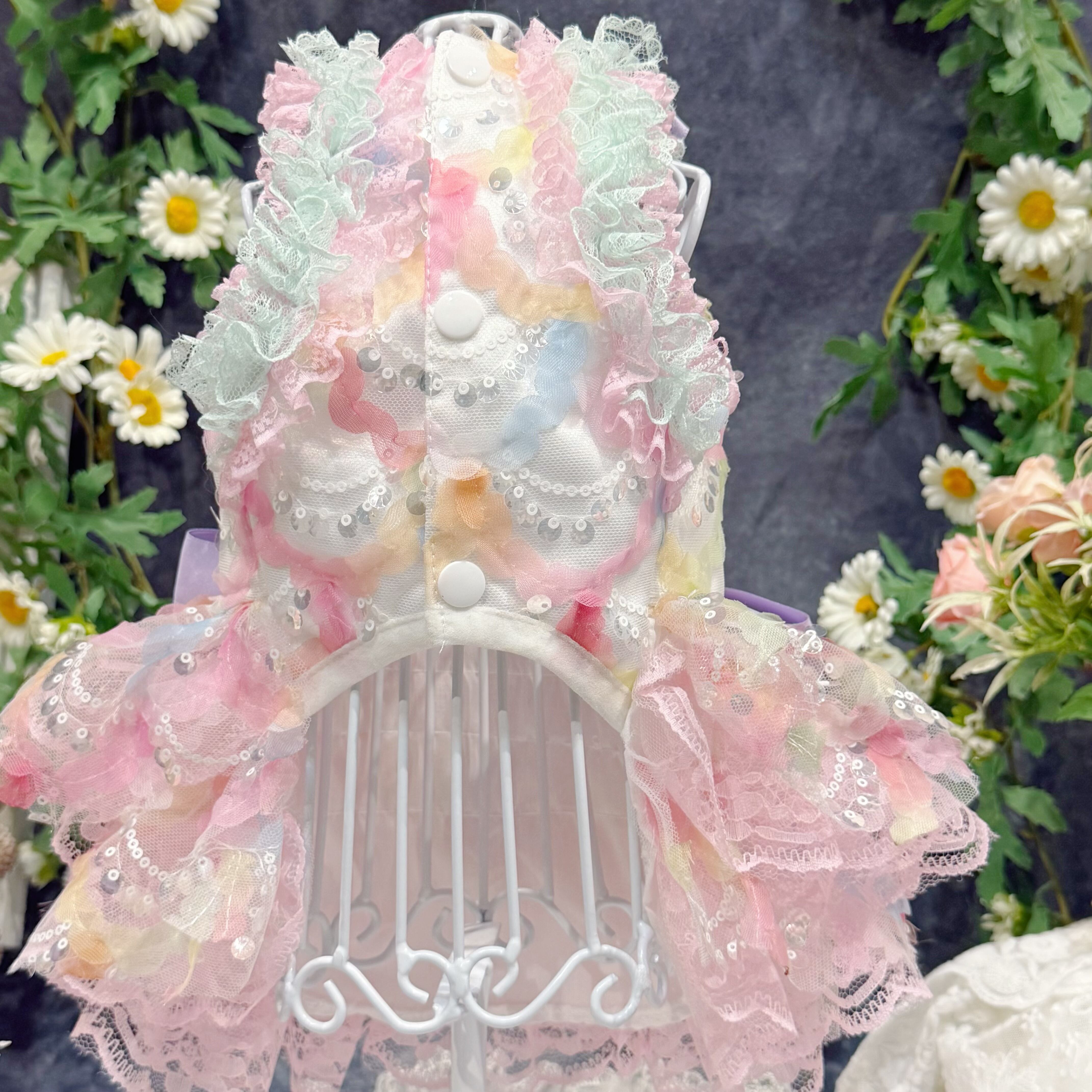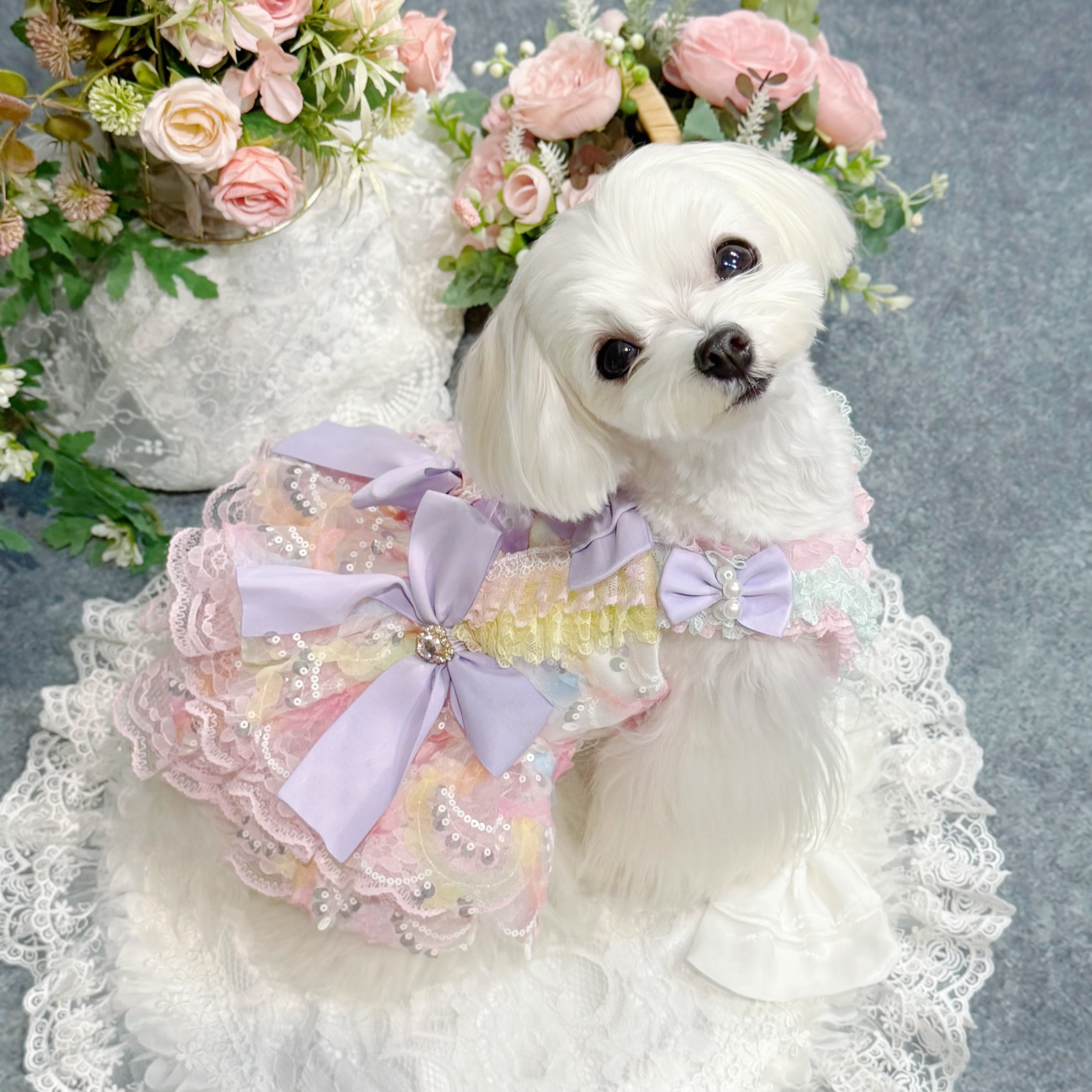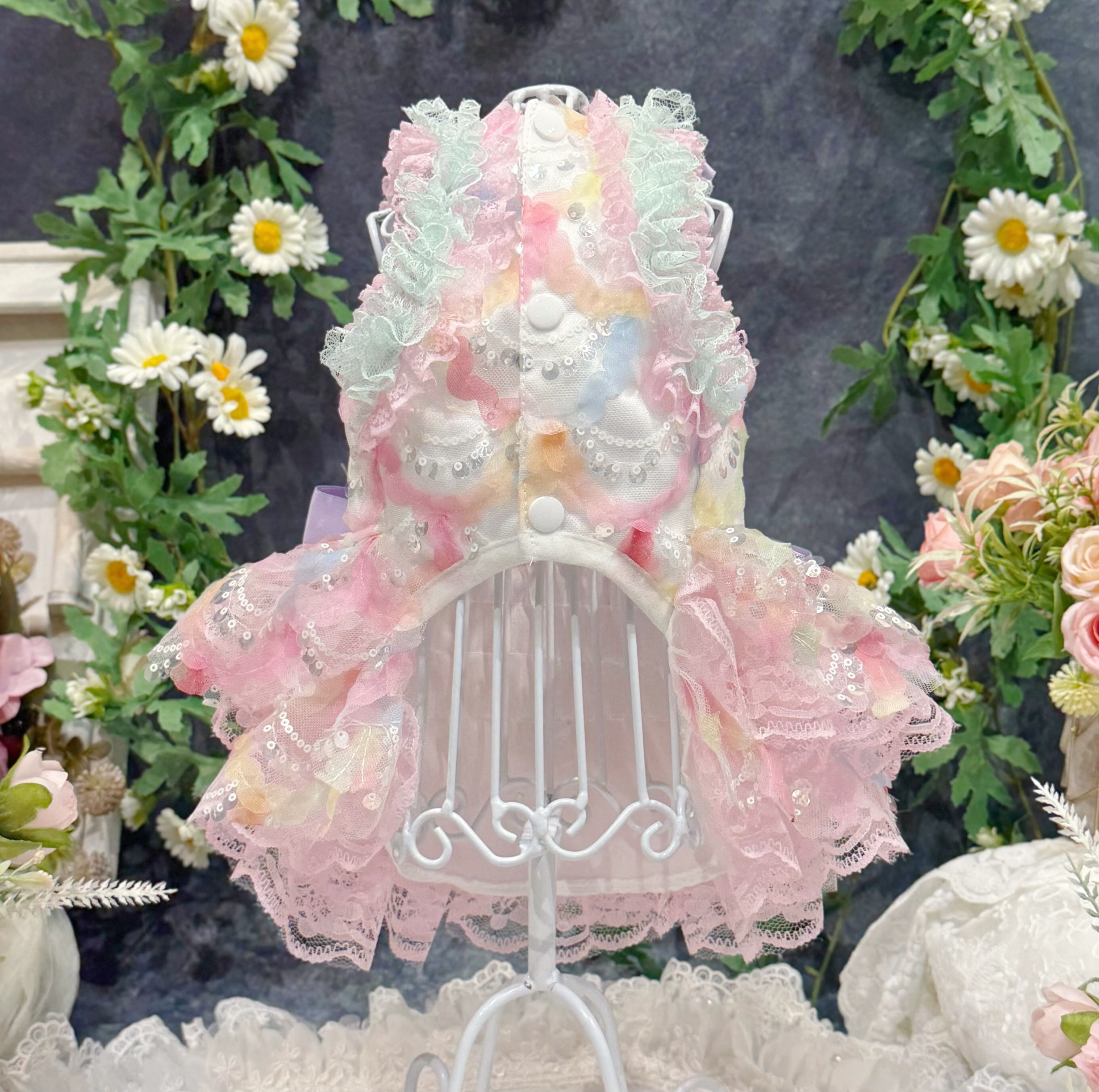 まるで手のひらに乗ったマカロンを連想させるこのドレス、配色は淡くて艶やかなカラフルカラーがぴったり!ピンク、ブルー、イエロー…どれも甘くてかわいい色合いで、ワンちゃんの毛並みと相性抜群✨
