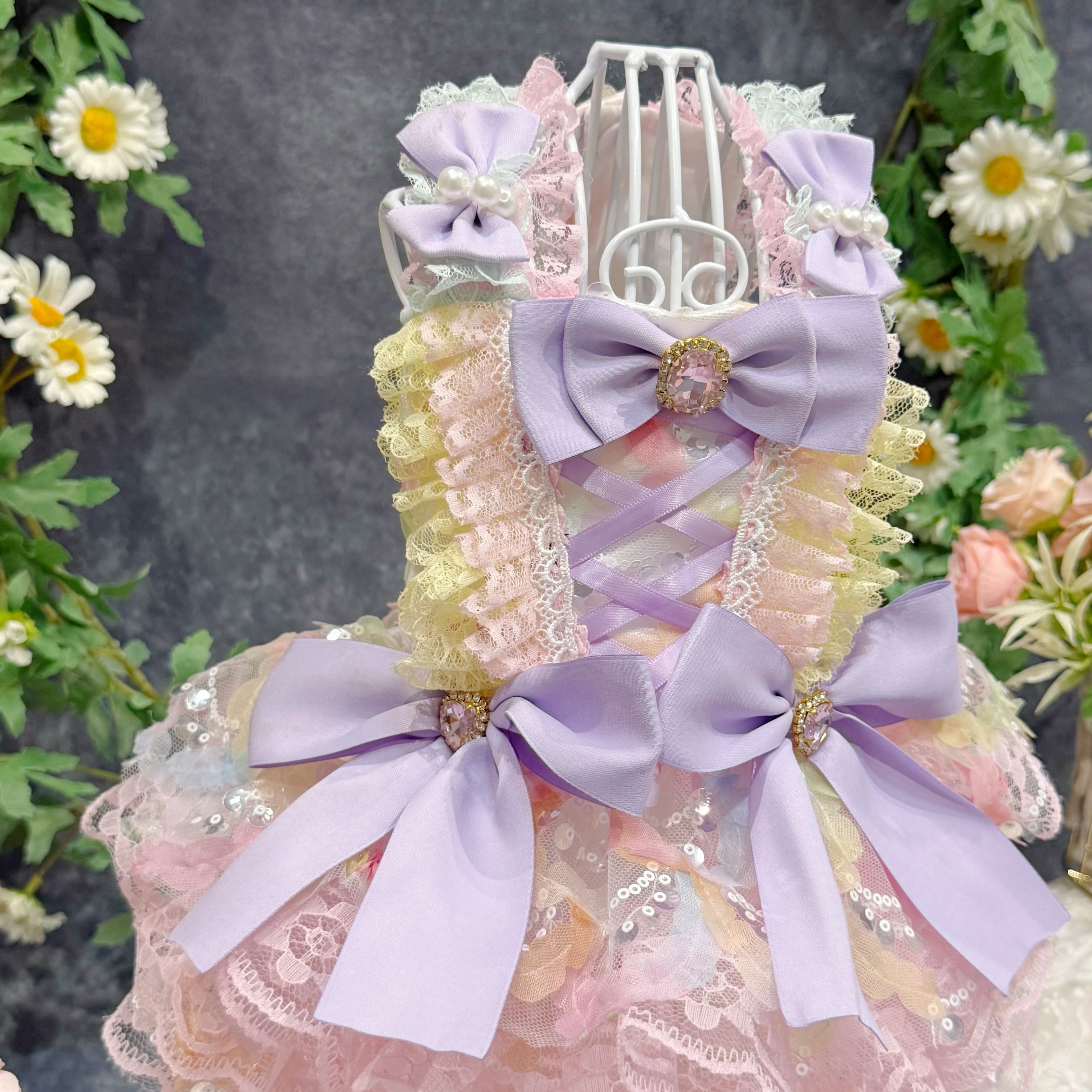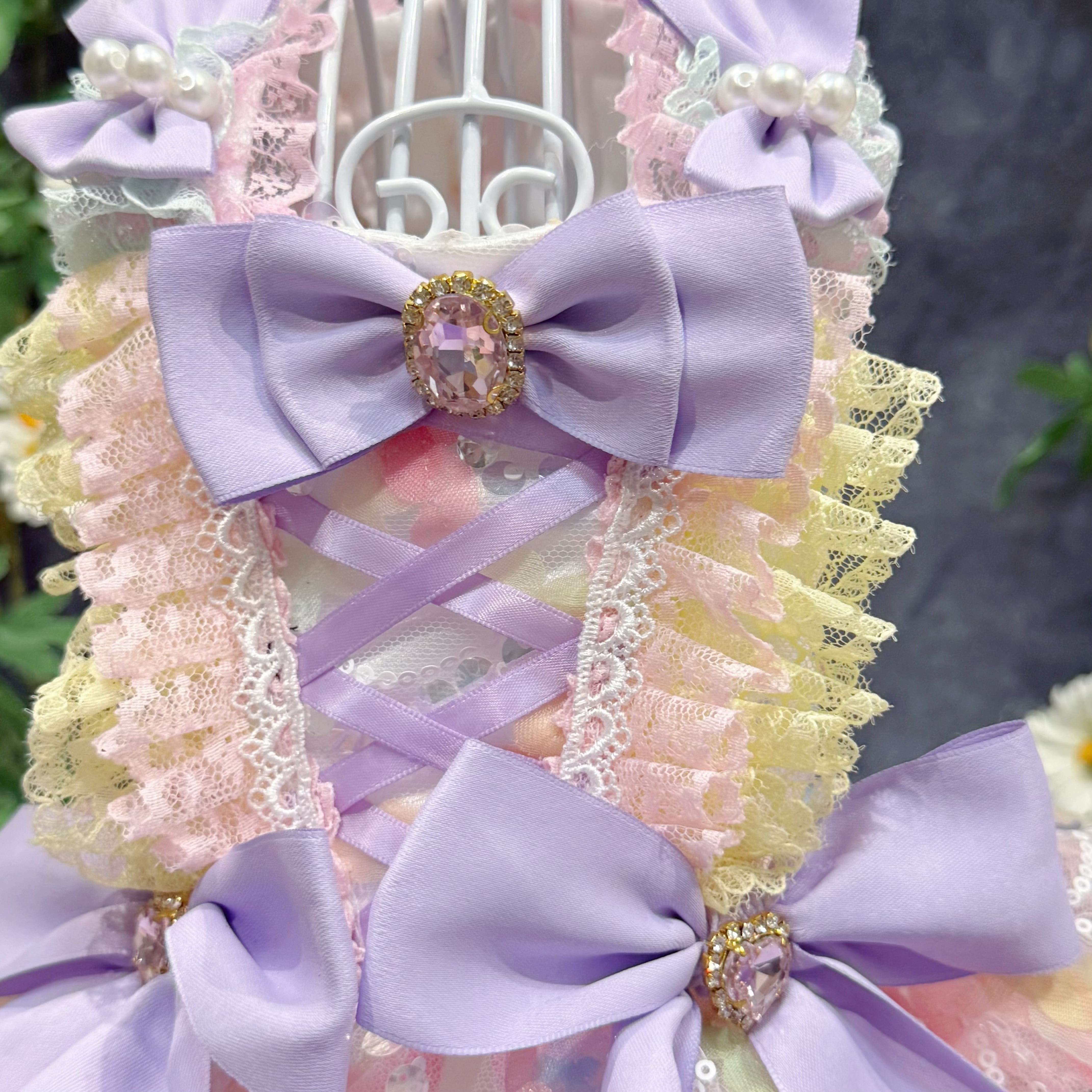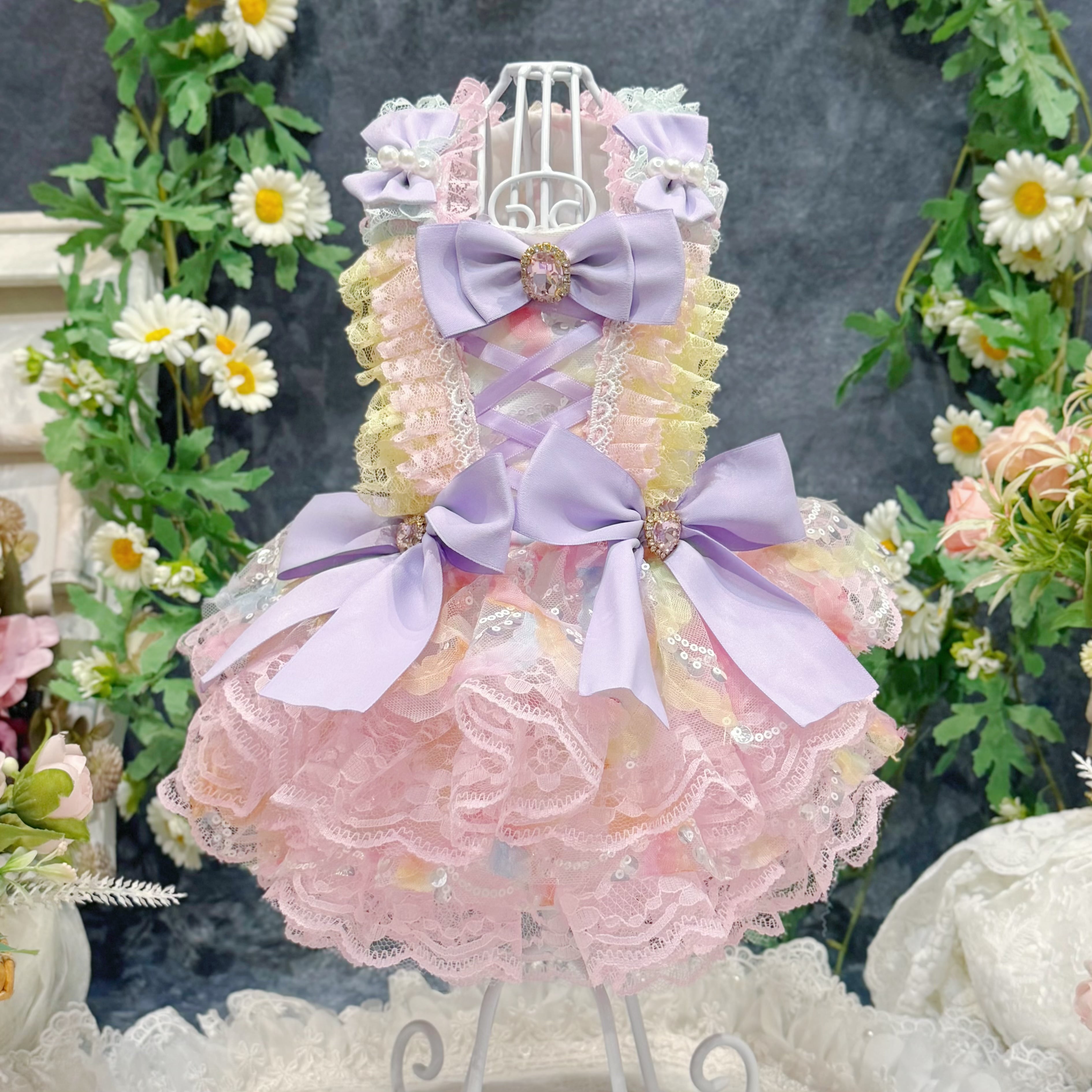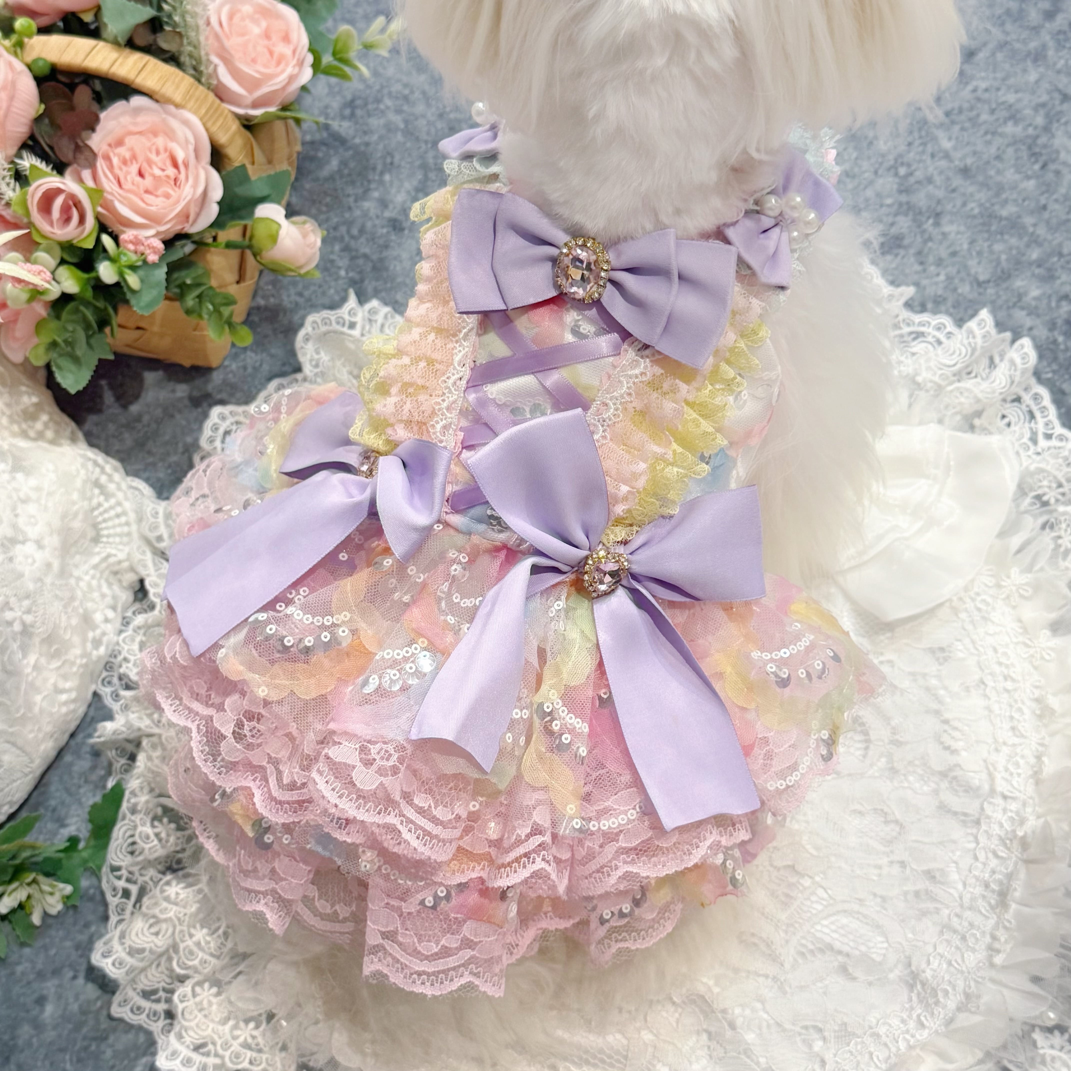 まるで手のひらに乗ったマカロンを連想させるこのドレス、配色は淡くて艶やかなカラフルカラーがぴったり!ピンク、ブルー、イエロー…どれも甘くてかわいい色合いで、ワンちゃんの毛並みと相性抜群✨