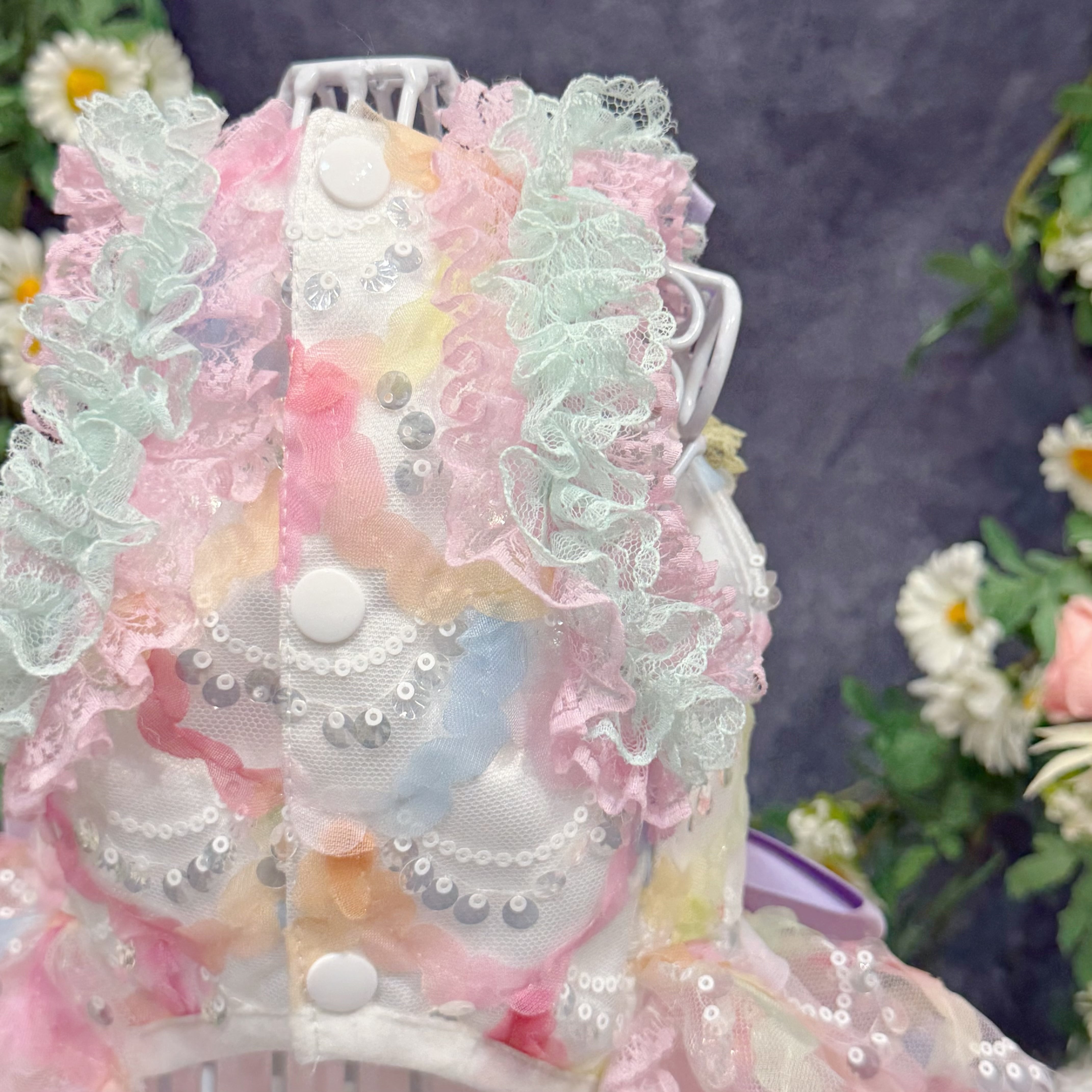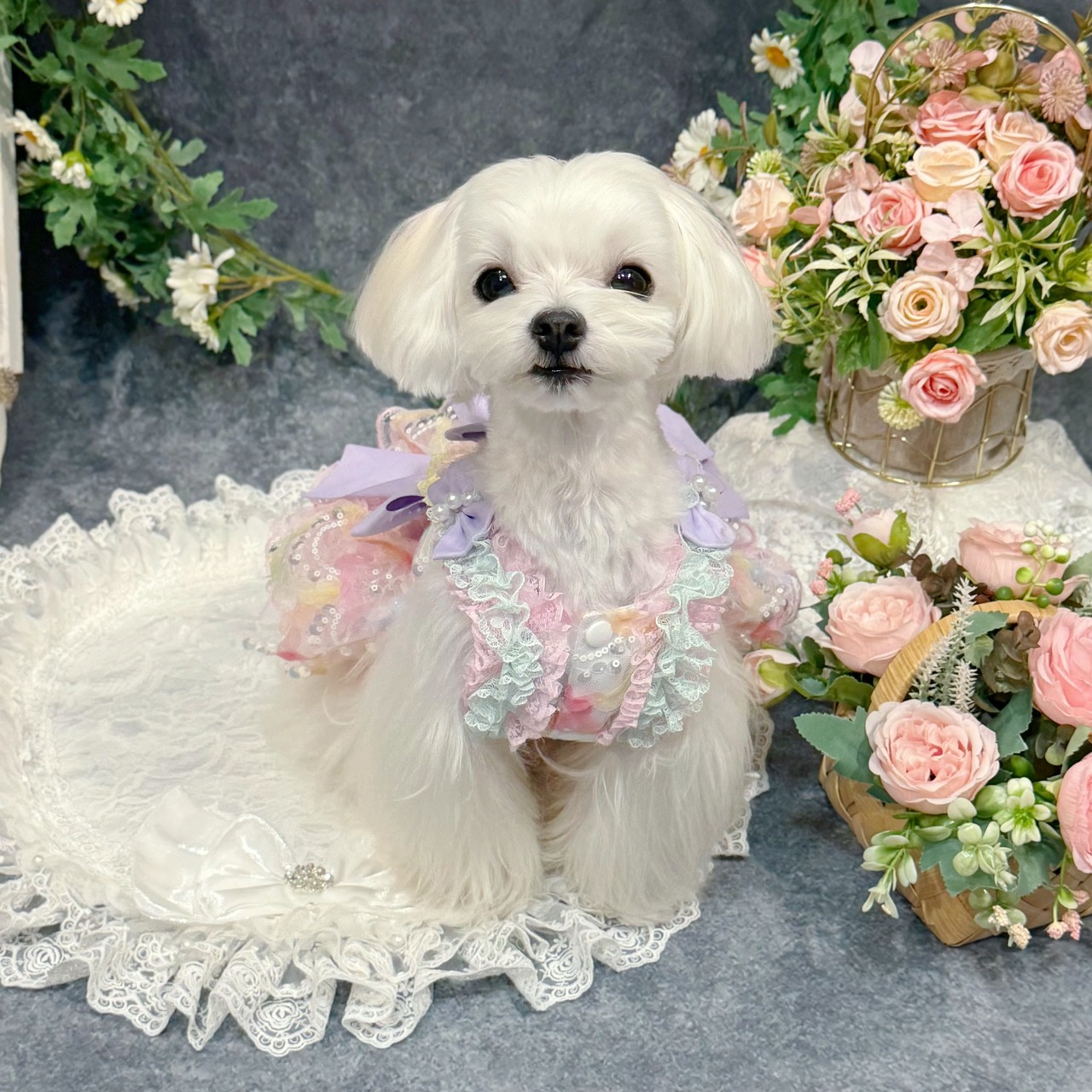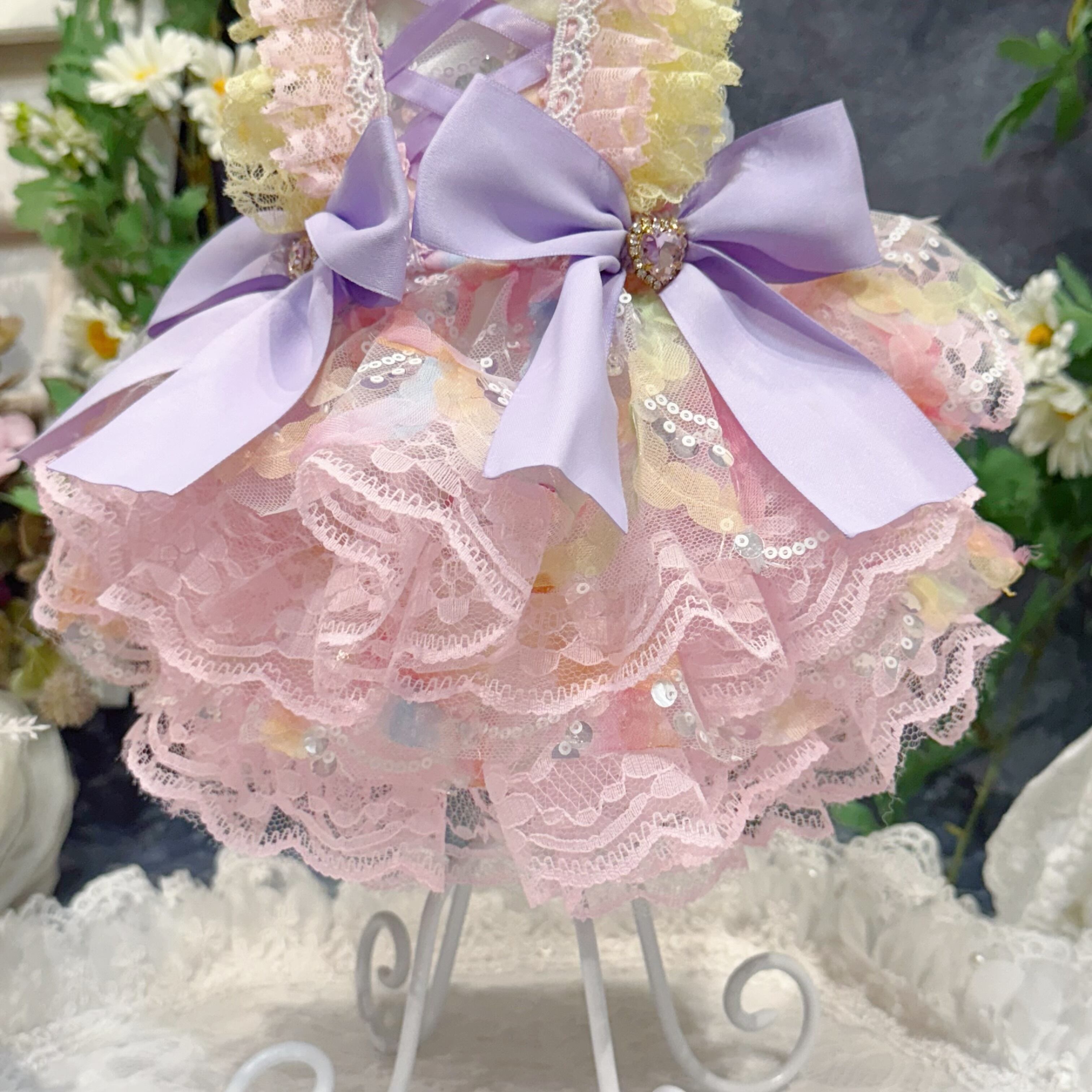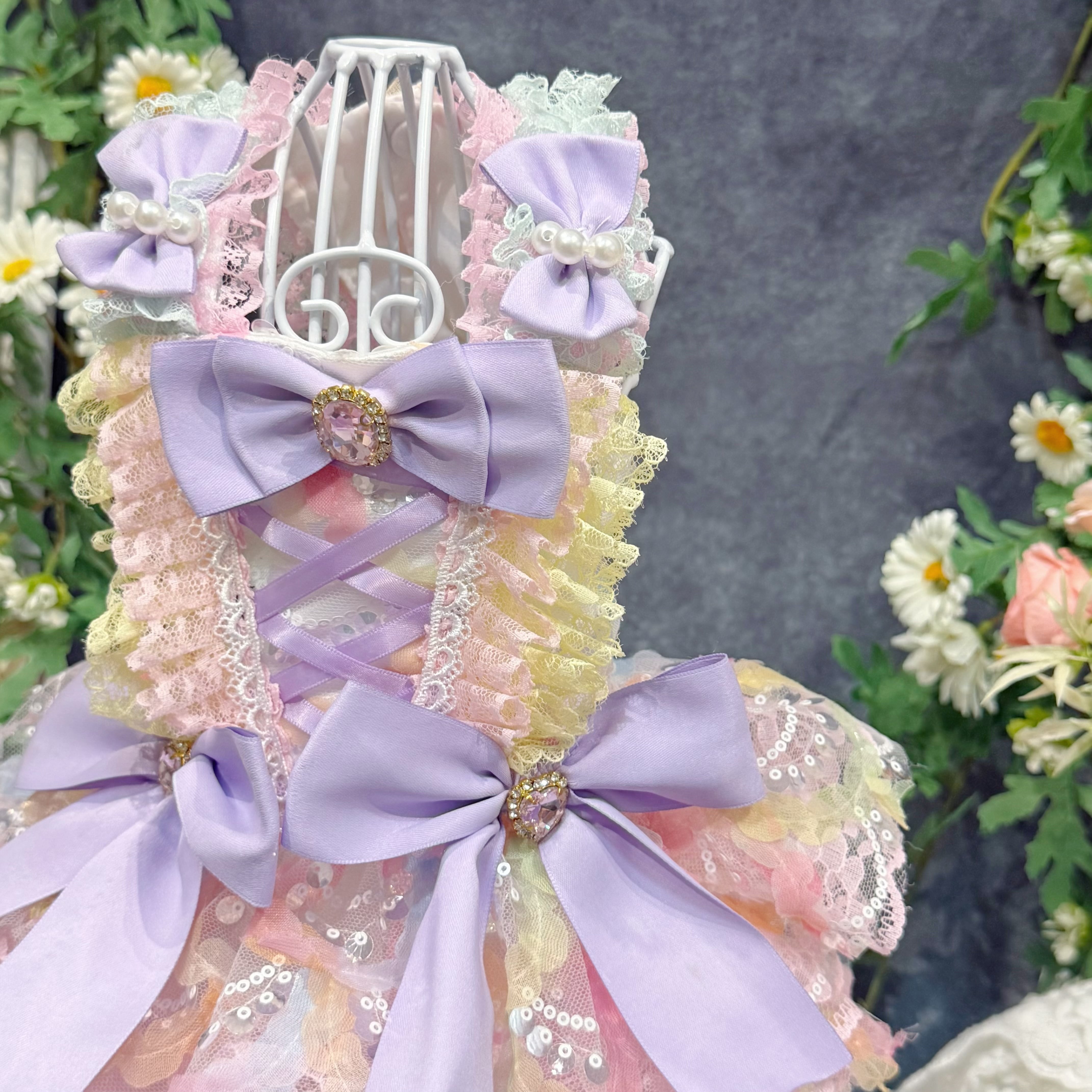 まるで手のひらに乗ったマカロンを連想させるこのドレス、配色は淡くて艶やかなカラフルカラーがぴったり!ピンク、ブルー、イエロー…どれも甘くてかわいい色合いで、ワンちゃんの毛並みと相性抜群✨