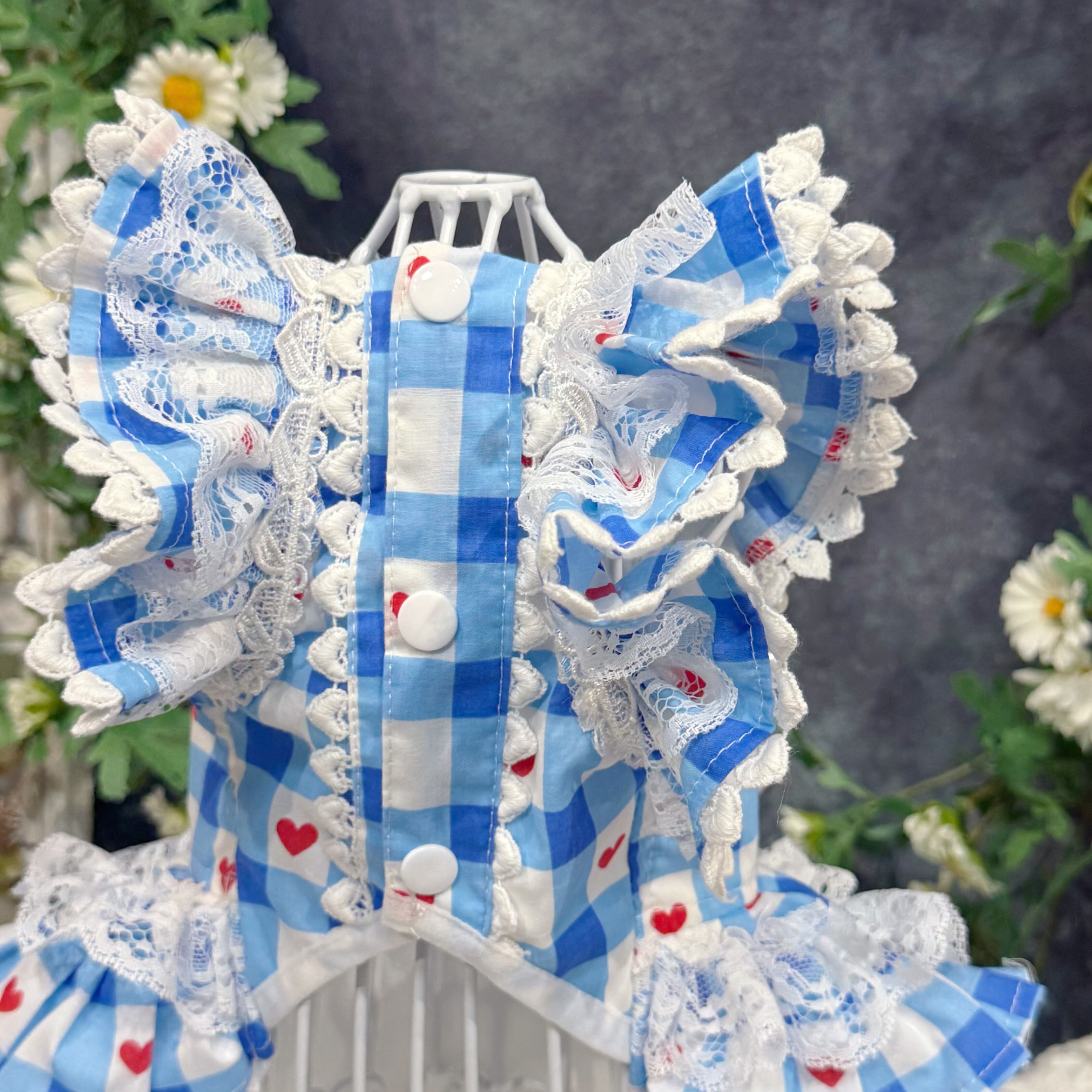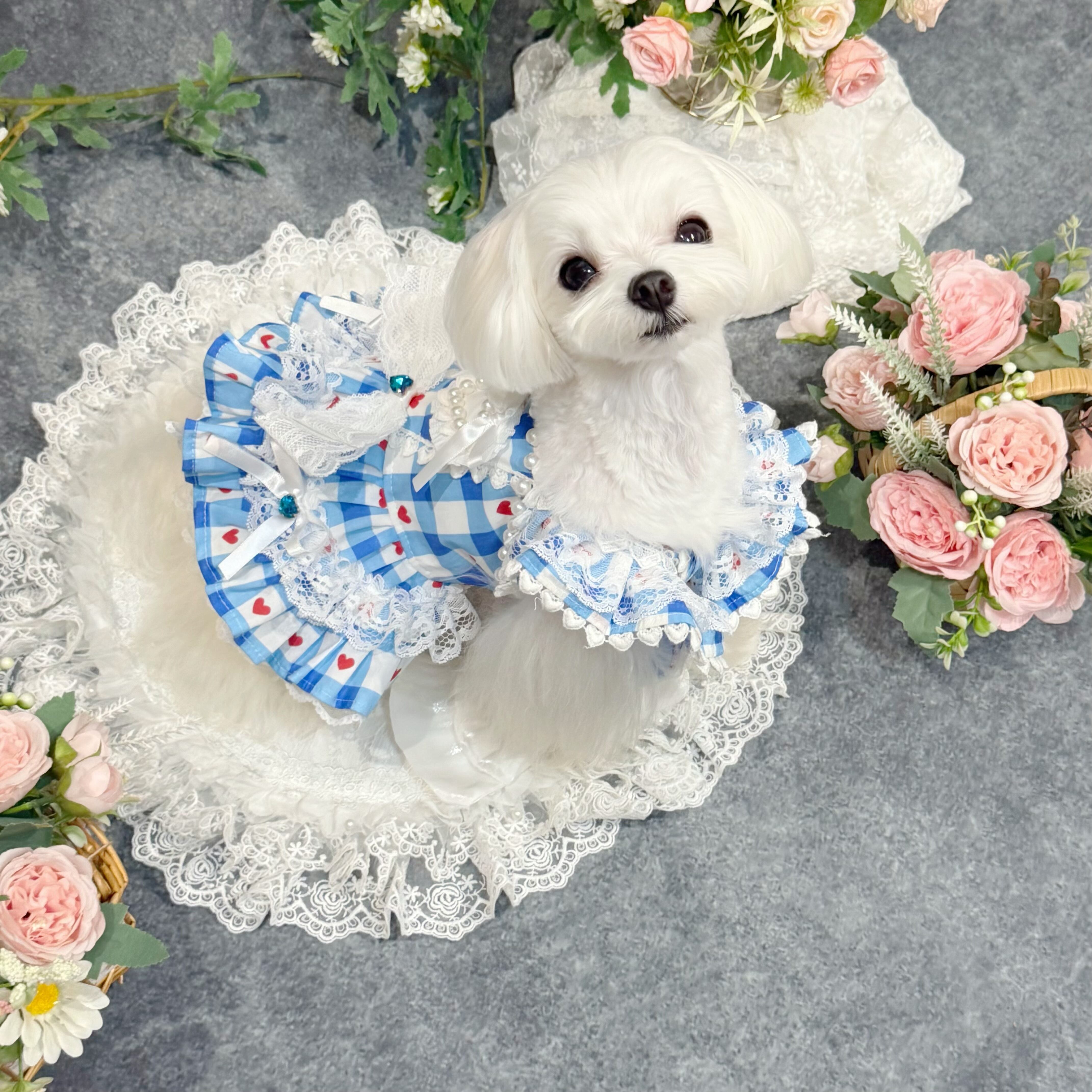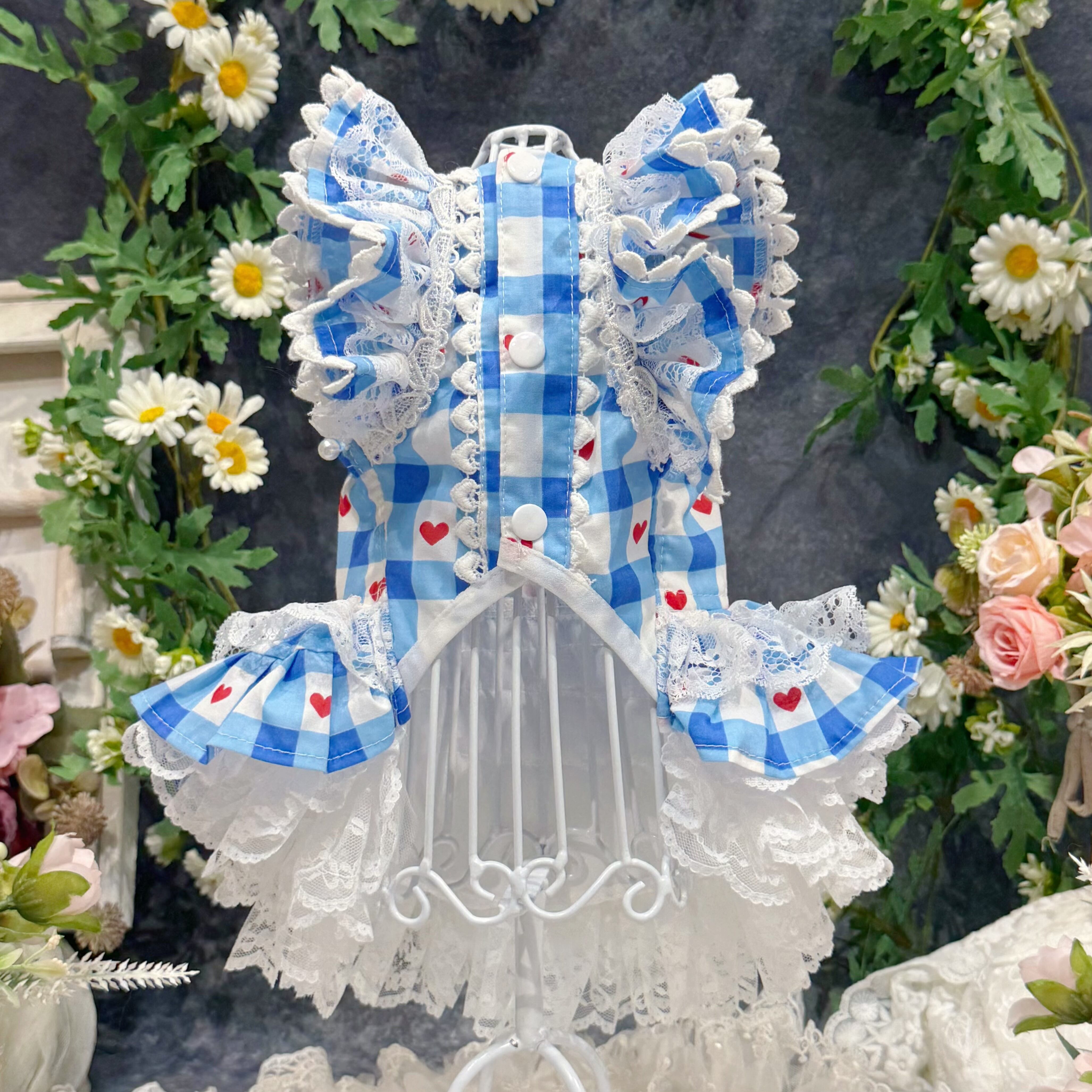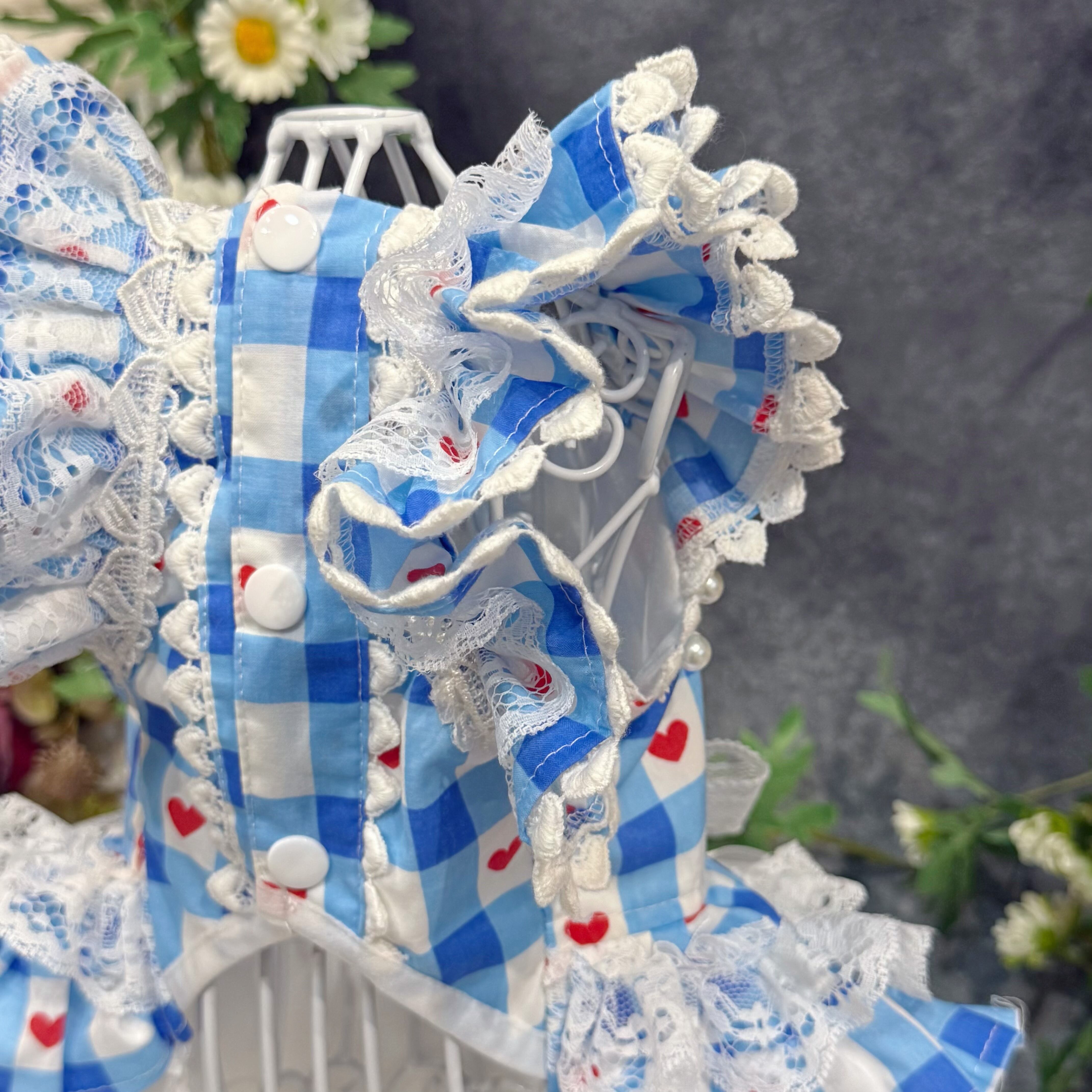 素材はコットン100%のブルーチェックで、肌触りがすごく柔らかいので、愛犬が長時間着ても苦しがらないのが嬉しいポイント♪ しかもこのチェック柄、ちゃんと小さなレッドハートが散りばめられているのが超キュート!一瞬で視線を奪われる秘密のデザインです❤︎