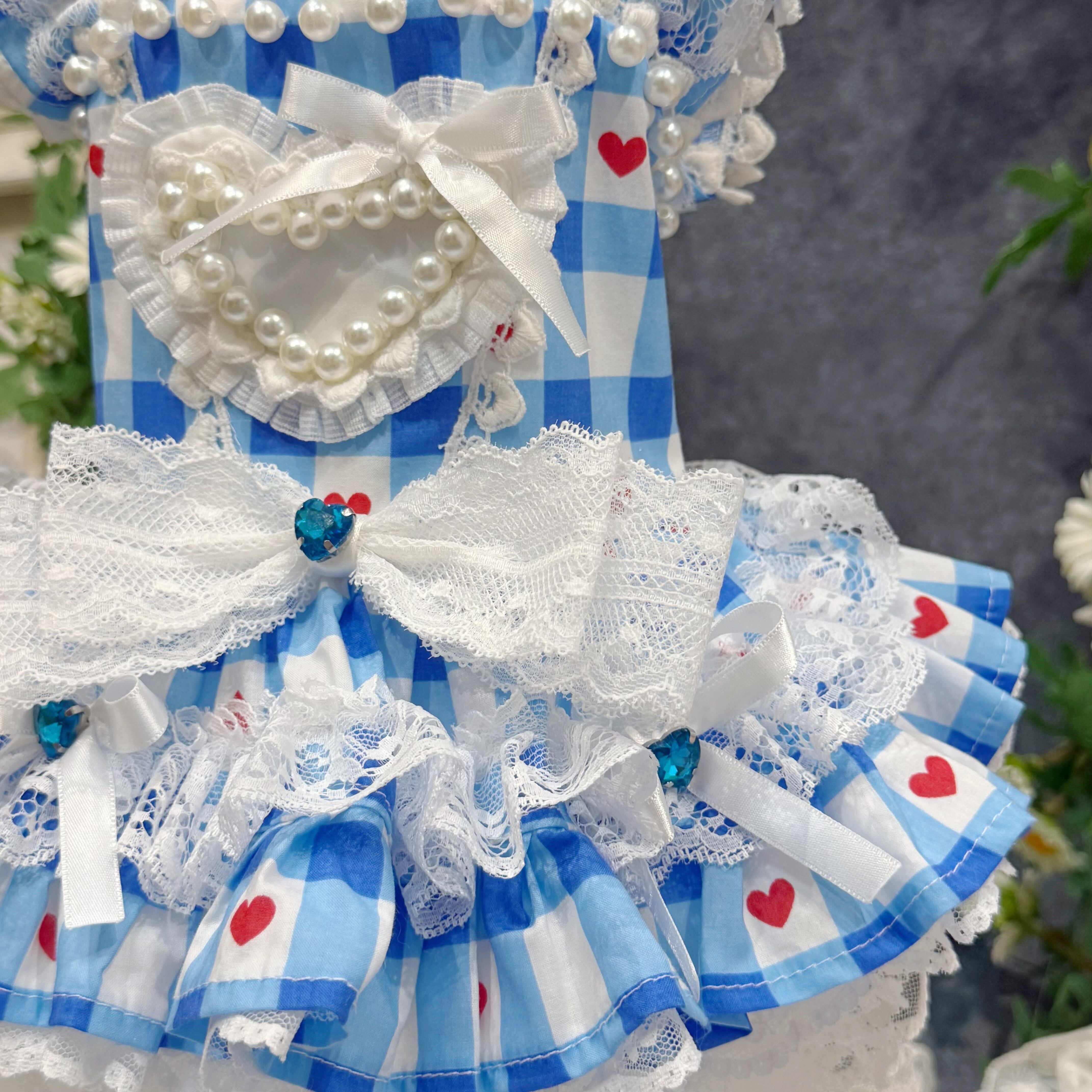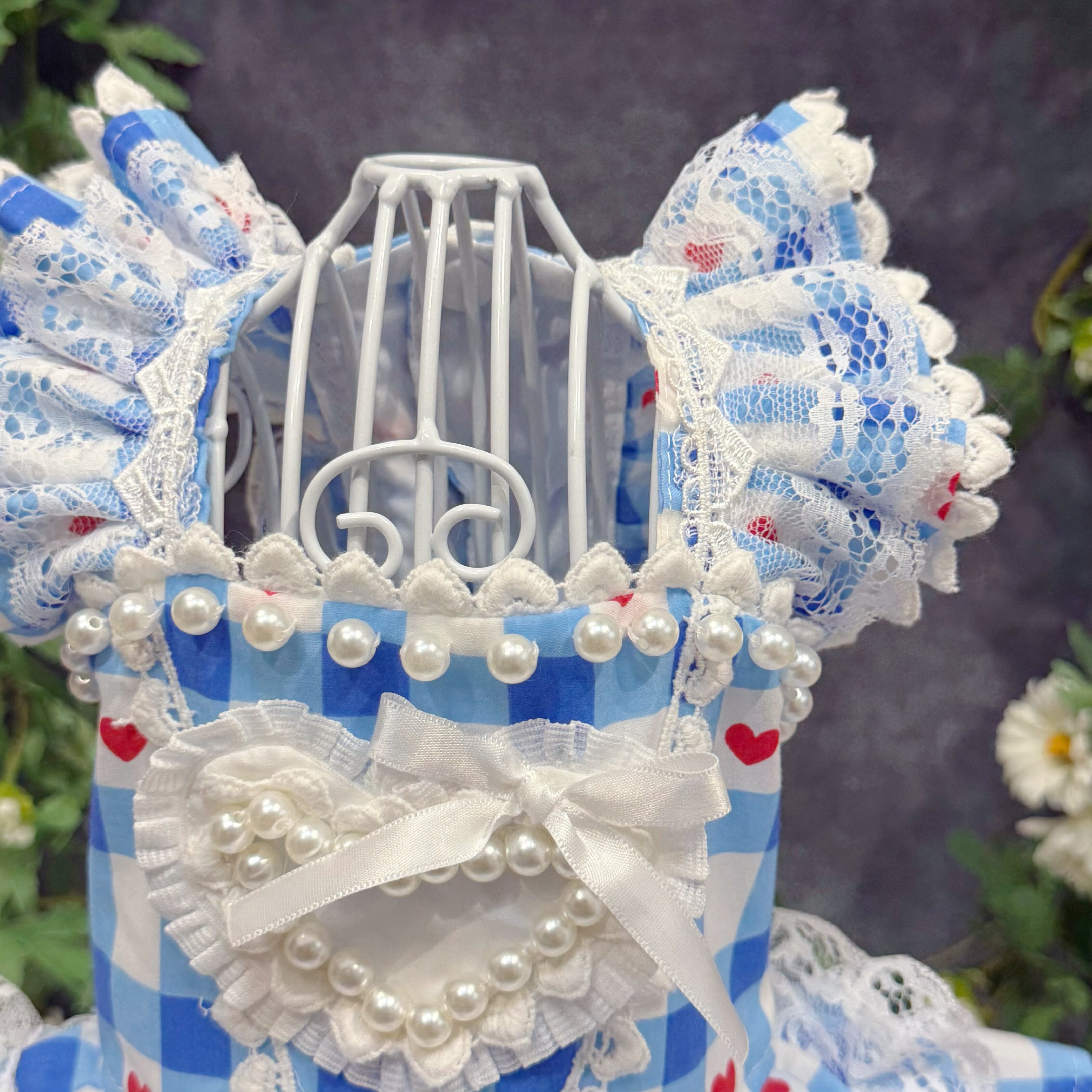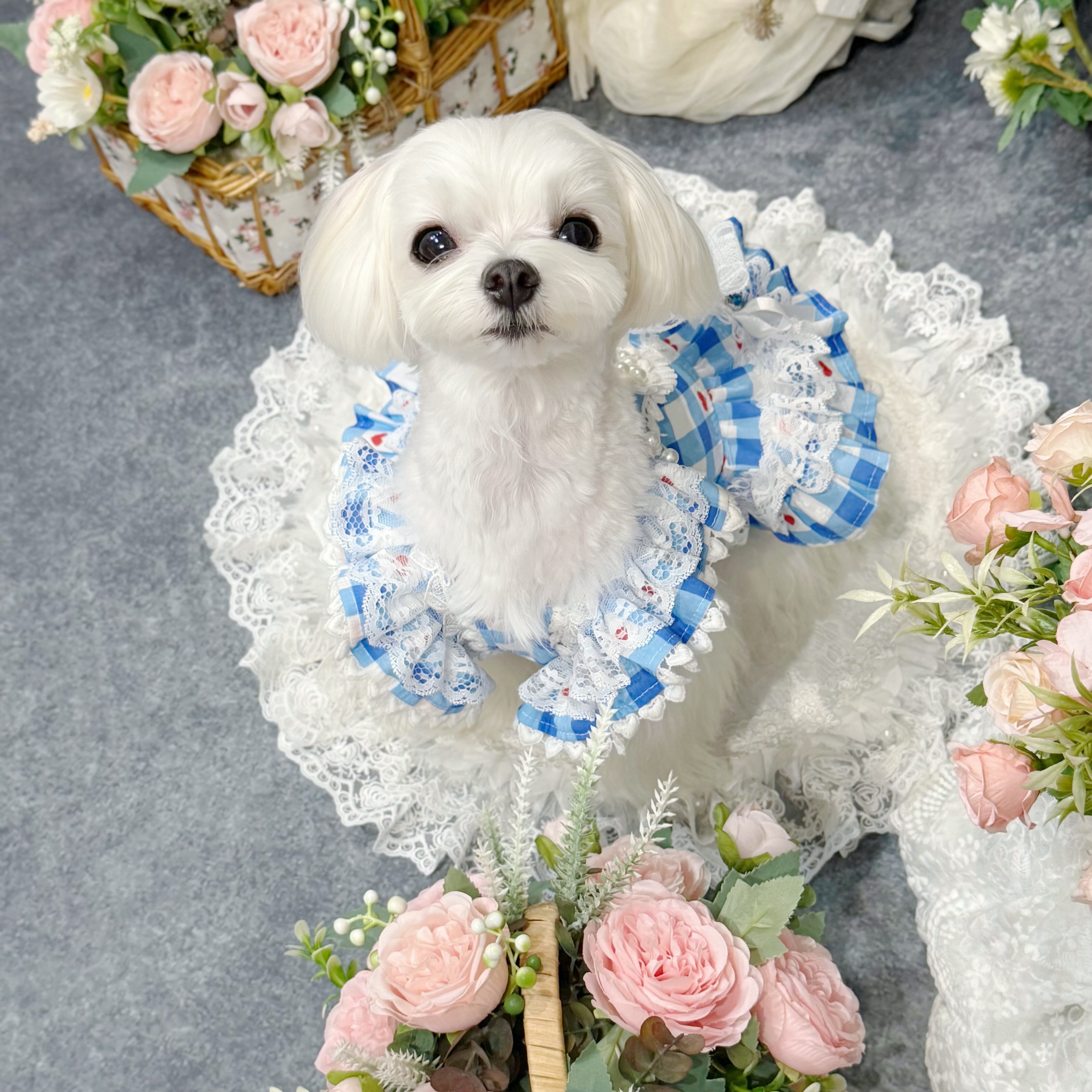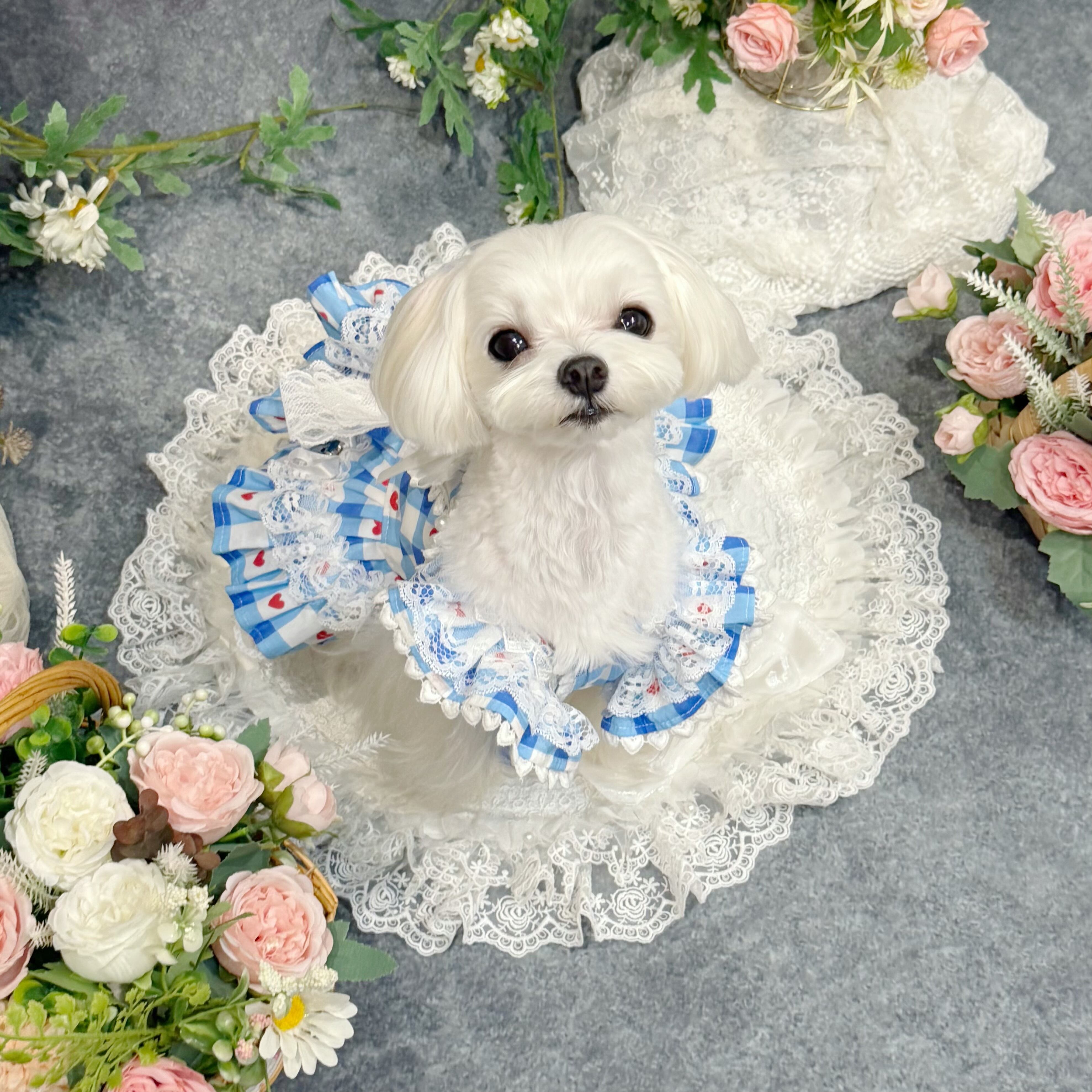 素材はコットン100%のブルーチェックで、肌触りがすごく柔らかいので、愛犬が長時間着ても苦しがらないのが嬉しいポイント♪ しかもこのチェック柄、ちゃんと小さなレッドハートが散りばめられているのが超キュート!一瞬で視線を奪われる秘密のデザインです❤︎