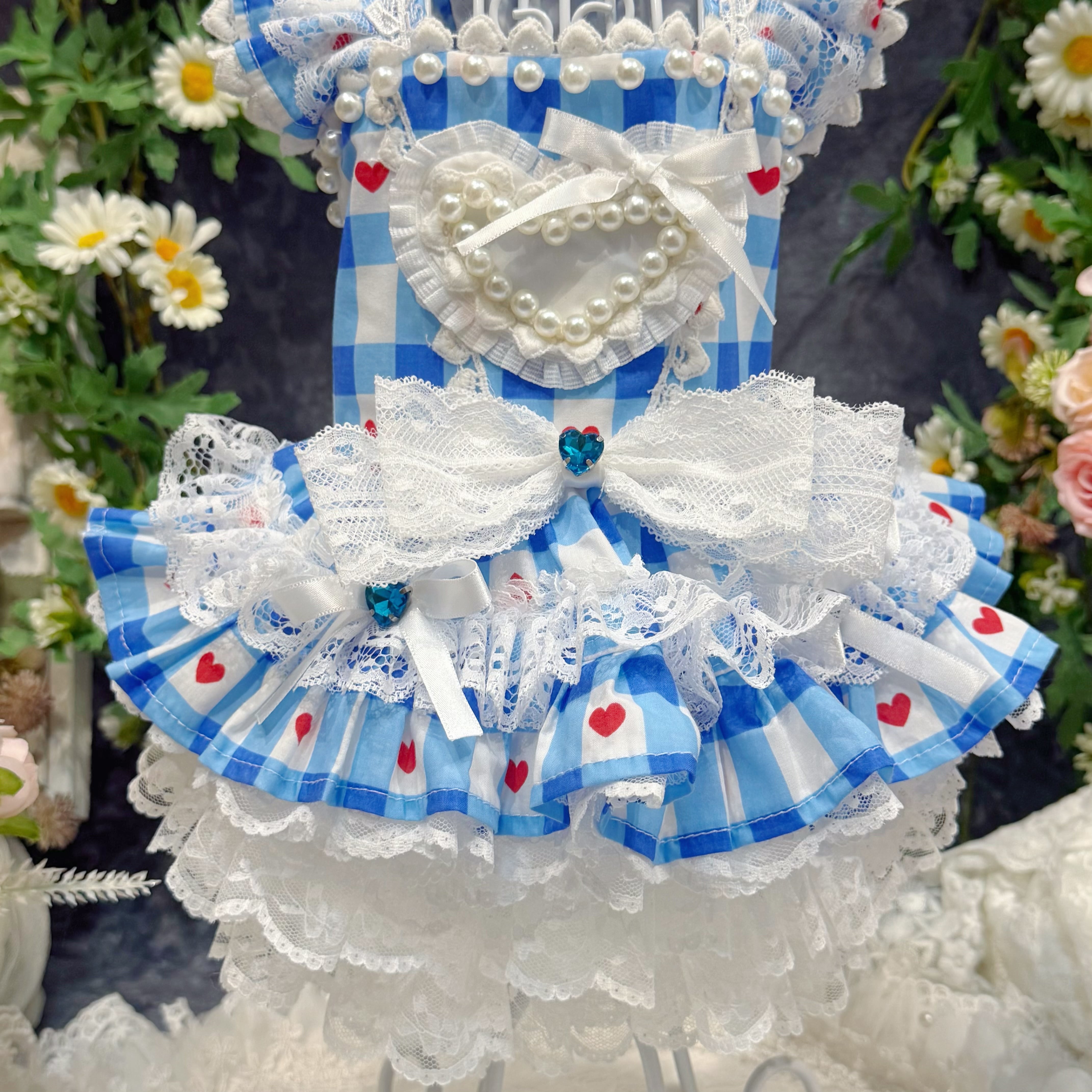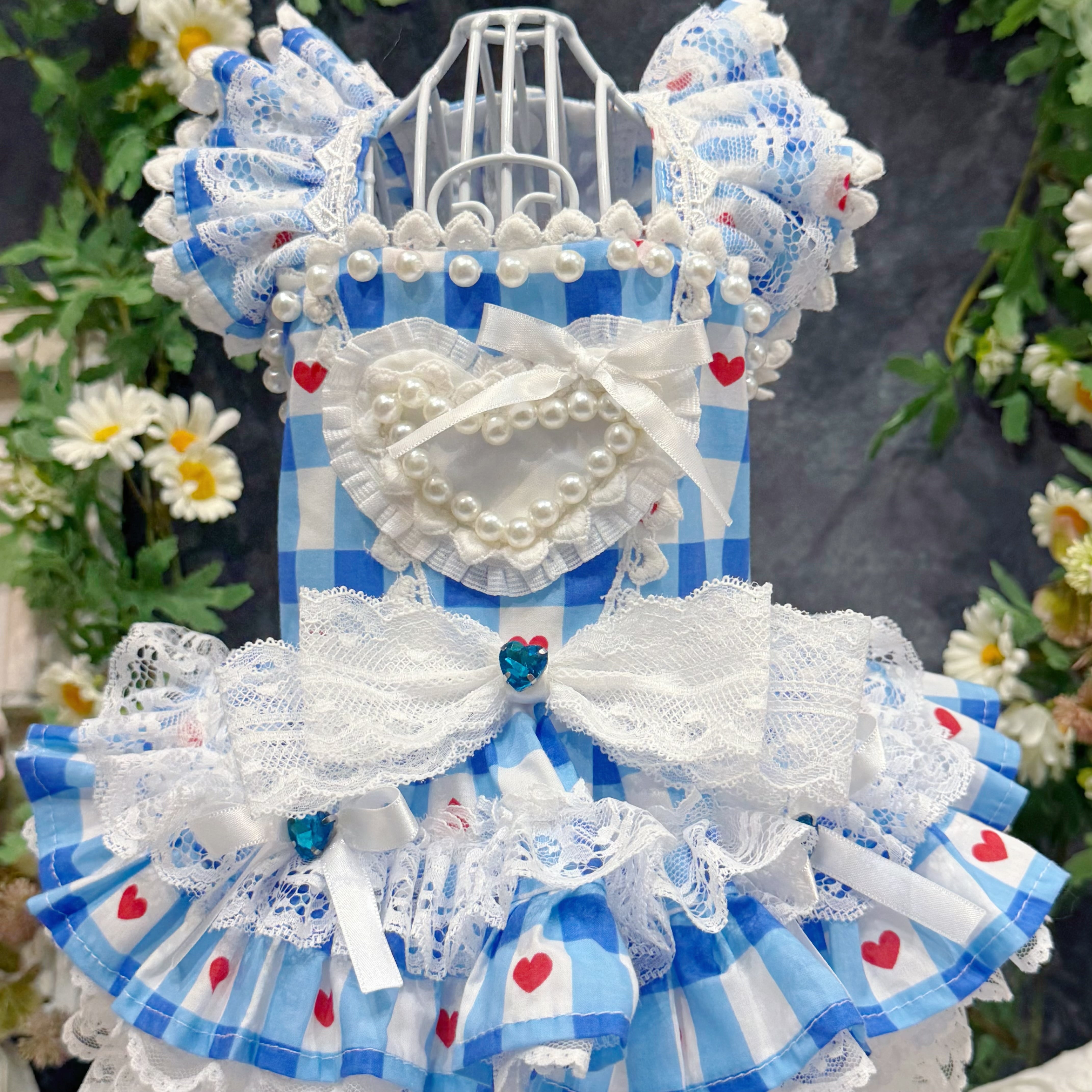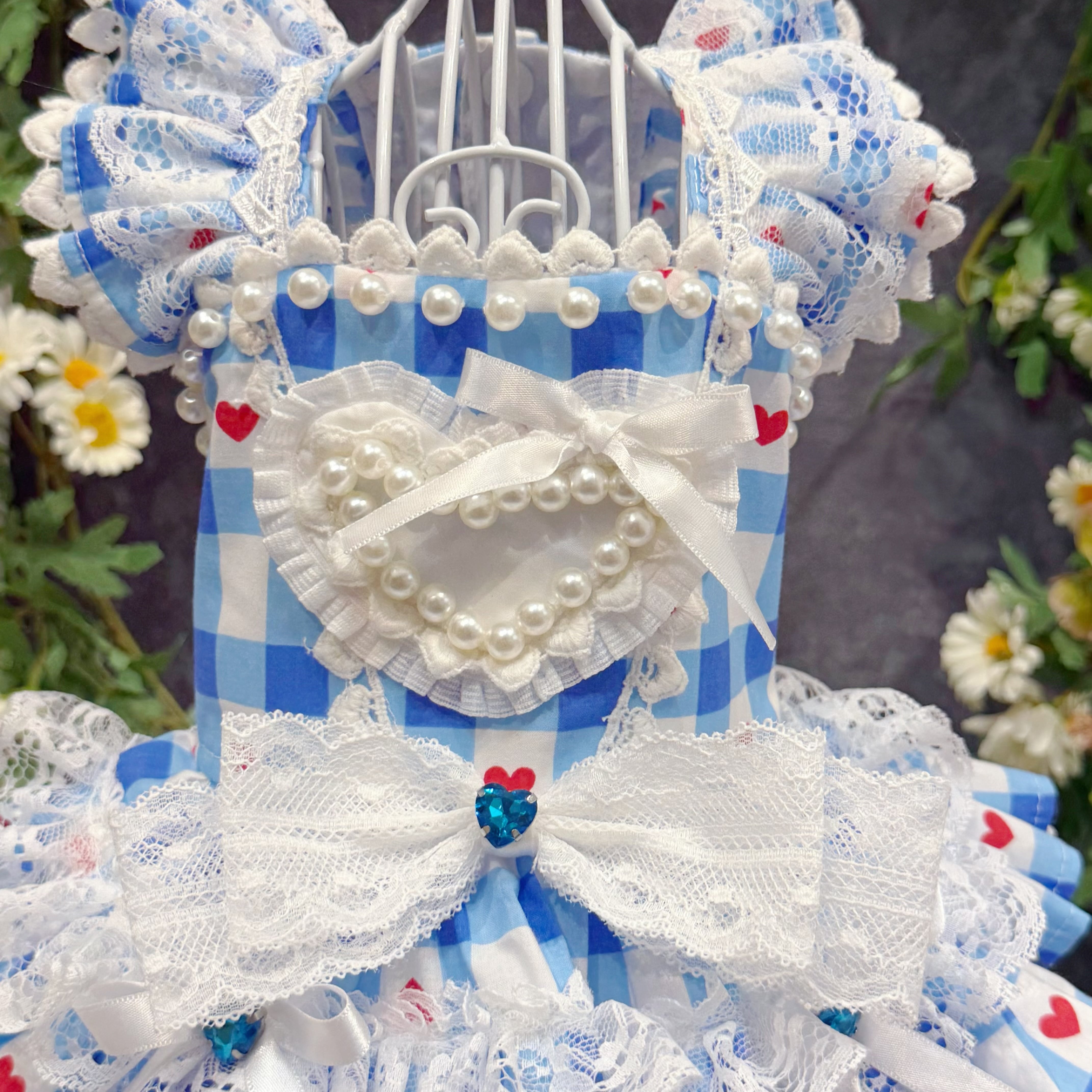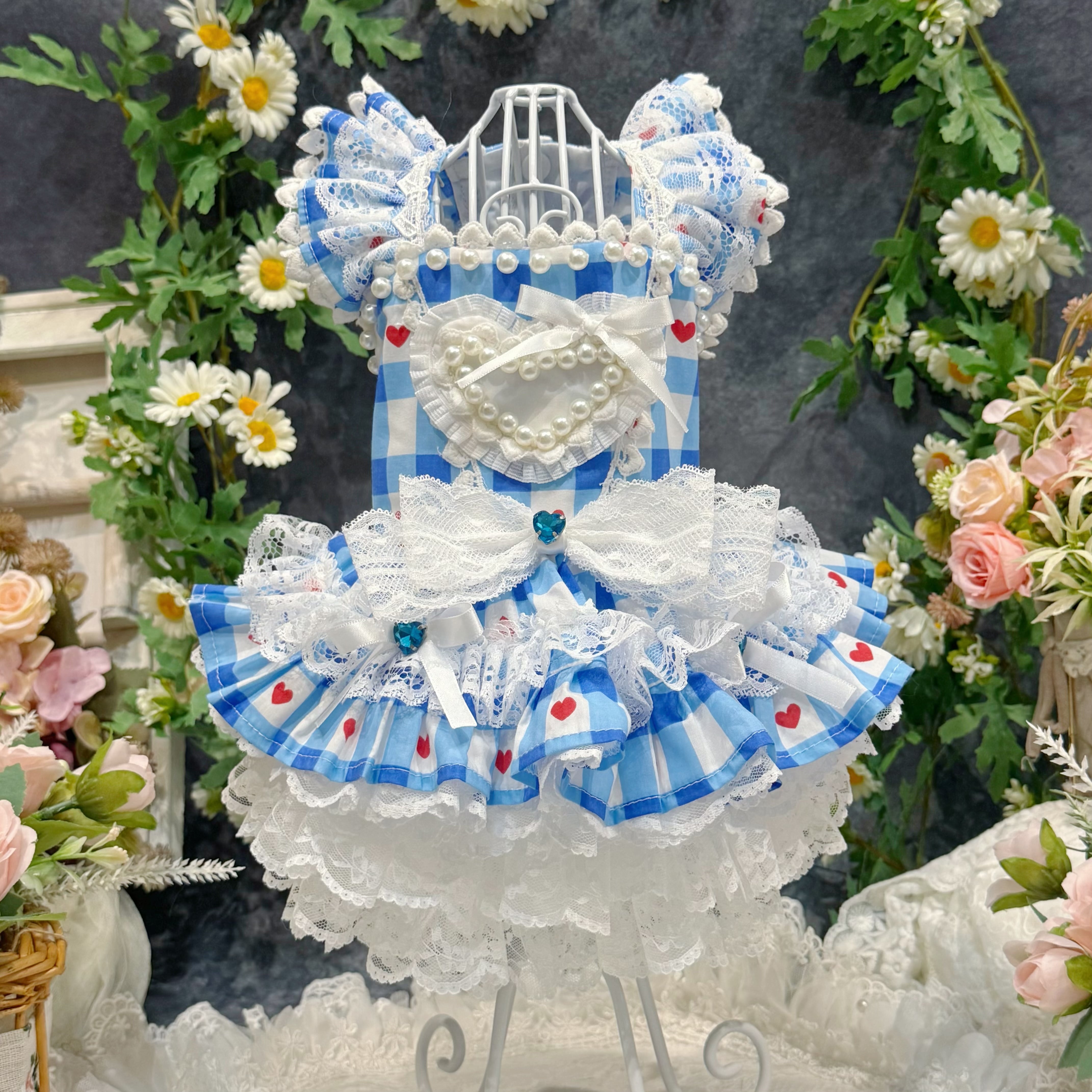 素材はコットン100%のブルーチェックで、肌触りがすごく柔らかいので、愛犬が長時間着ても苦しがらないのが嬉しいポイント♪ しかもこのチェック柄、ちゃんと小さなレッドハートが散りばめられているのが超キュート!一瞬で視線を奪われる秘密のデザインです❤︎