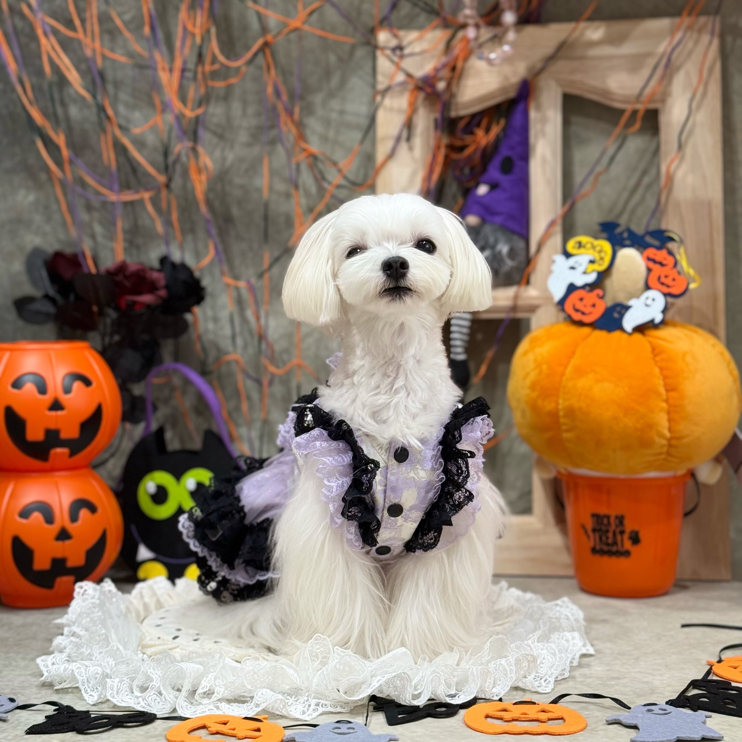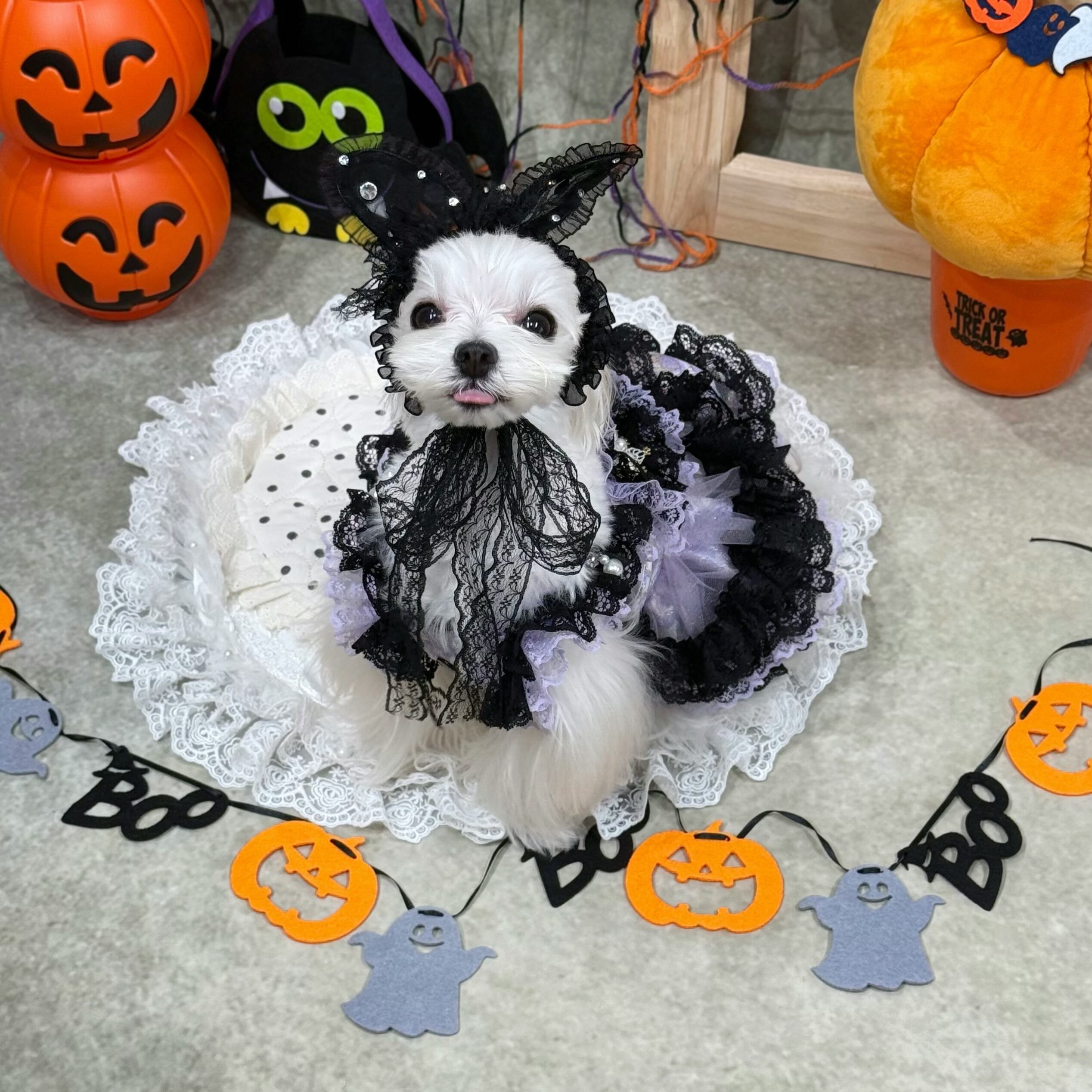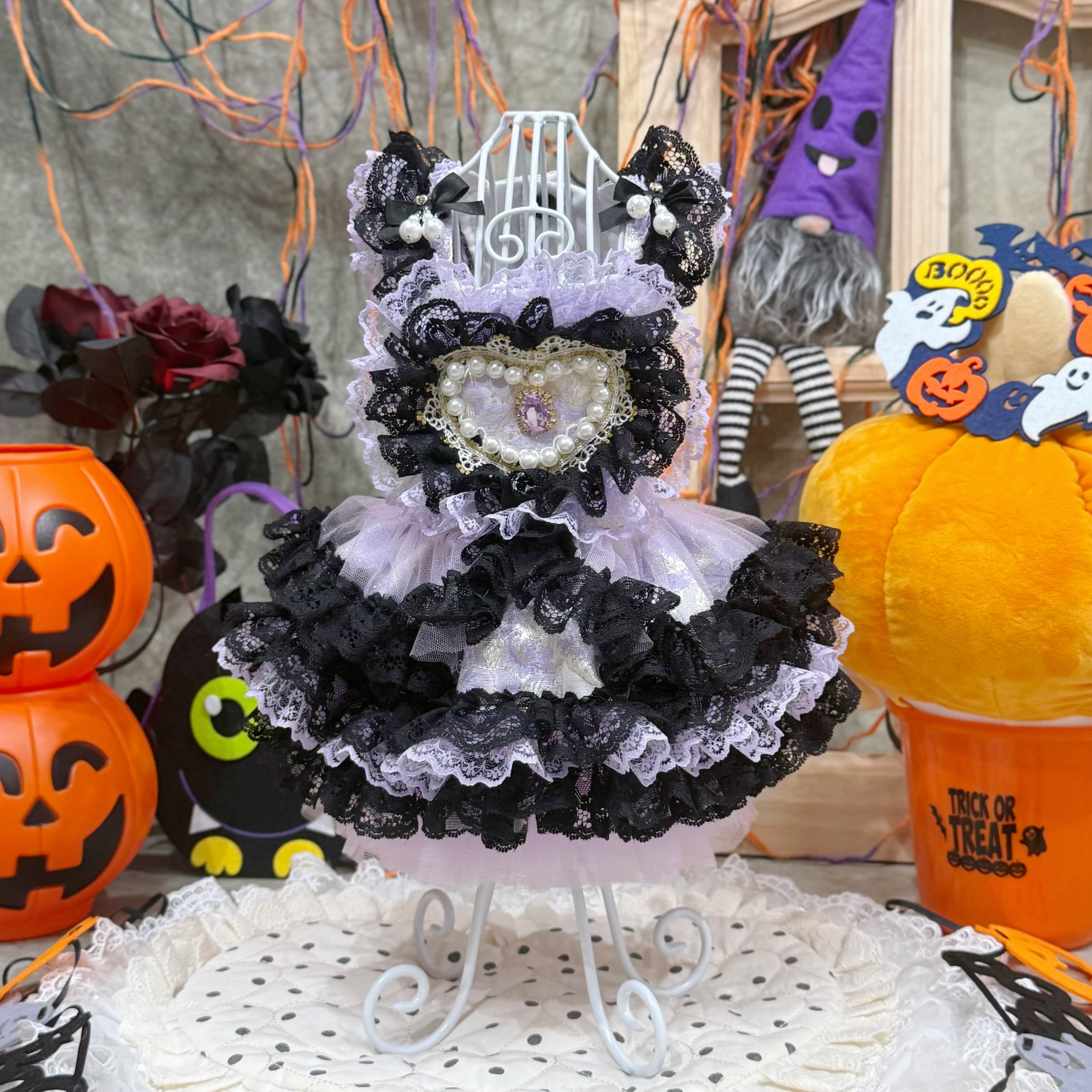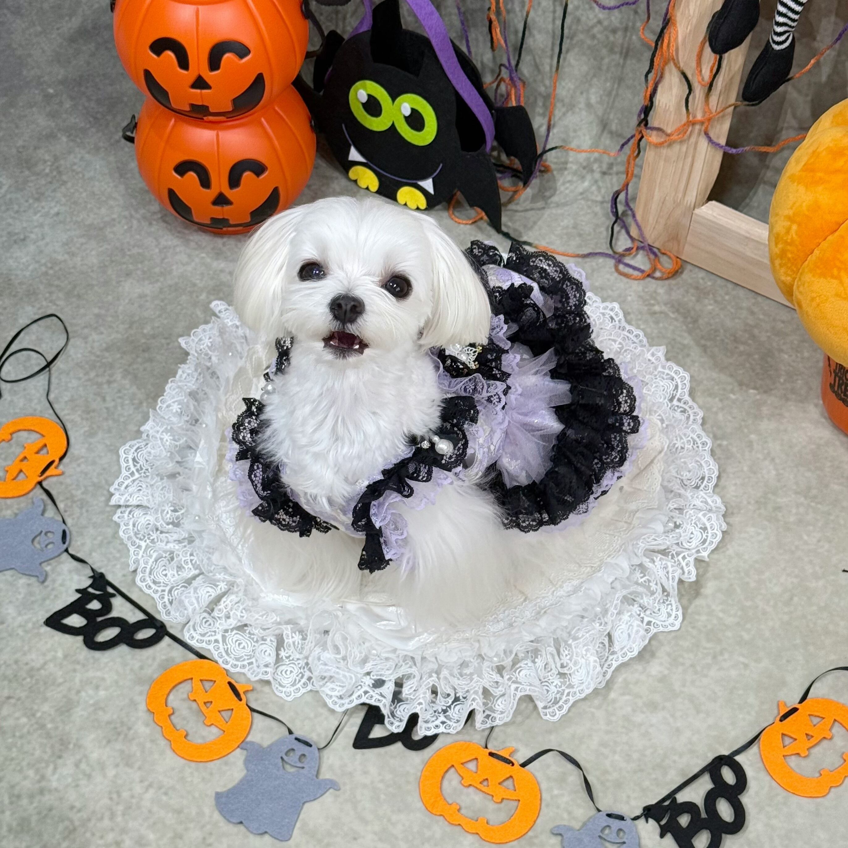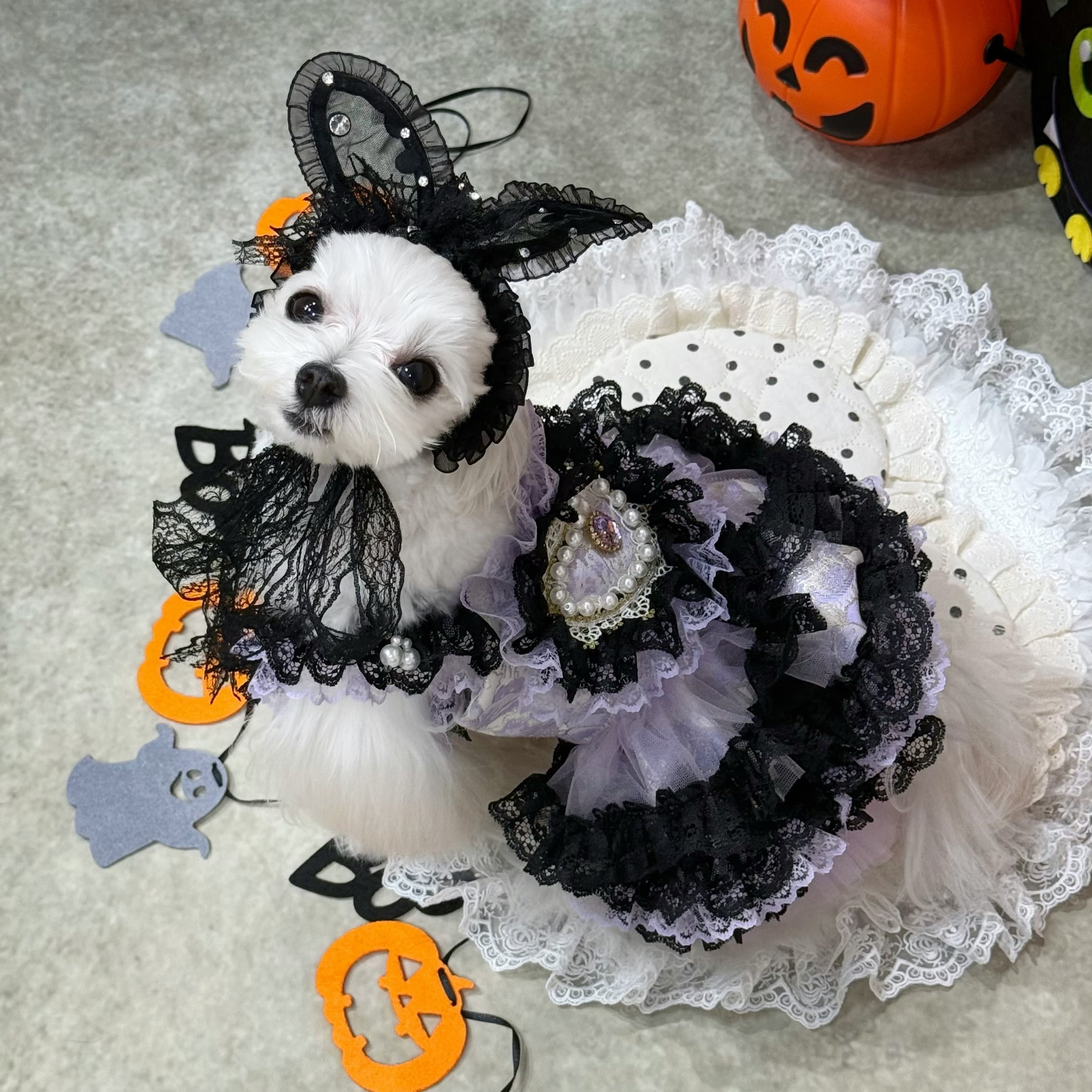 黒と紫のコンビネーションがとても雰囲気を出していて、着せるだけですぐにハロウィンムードが高まります!