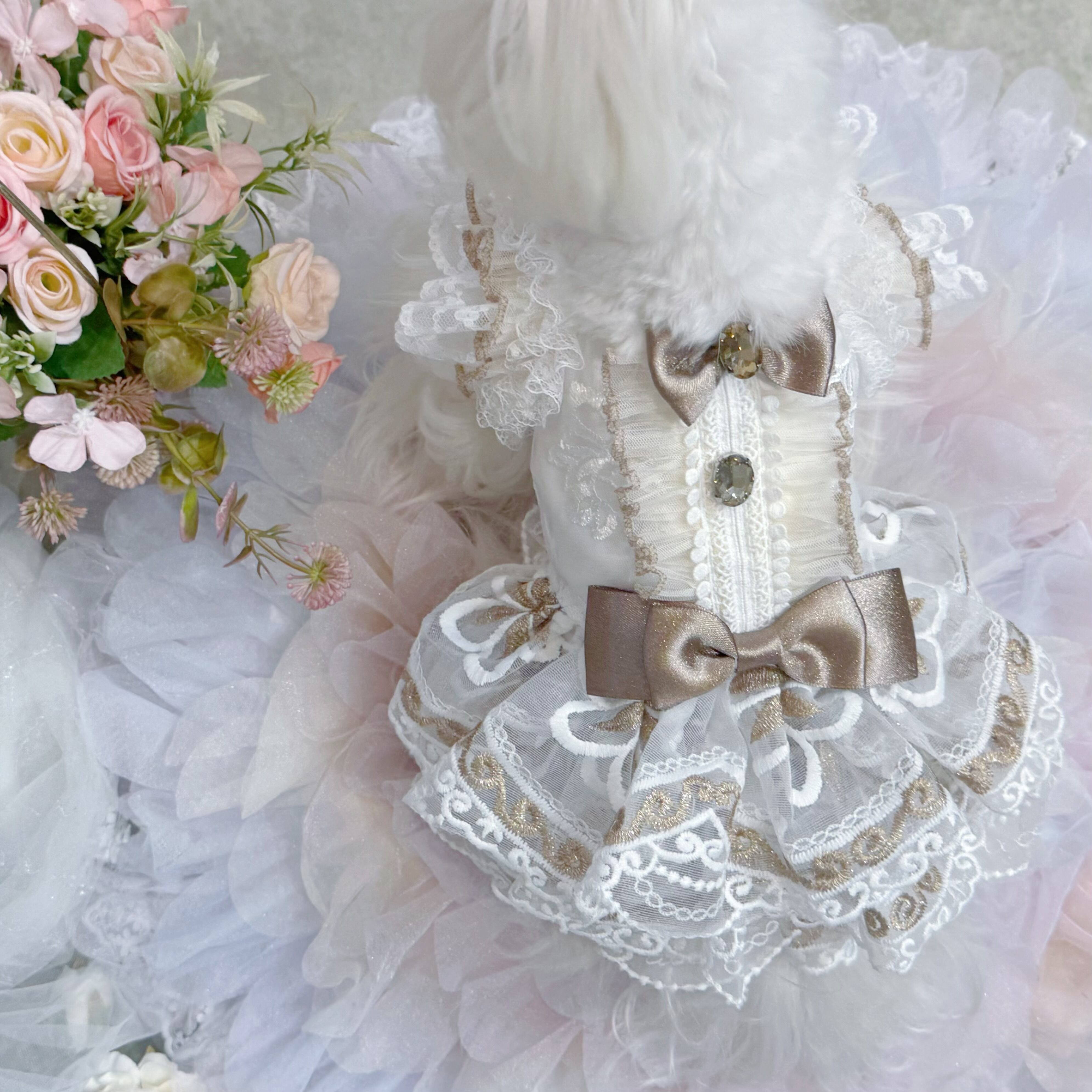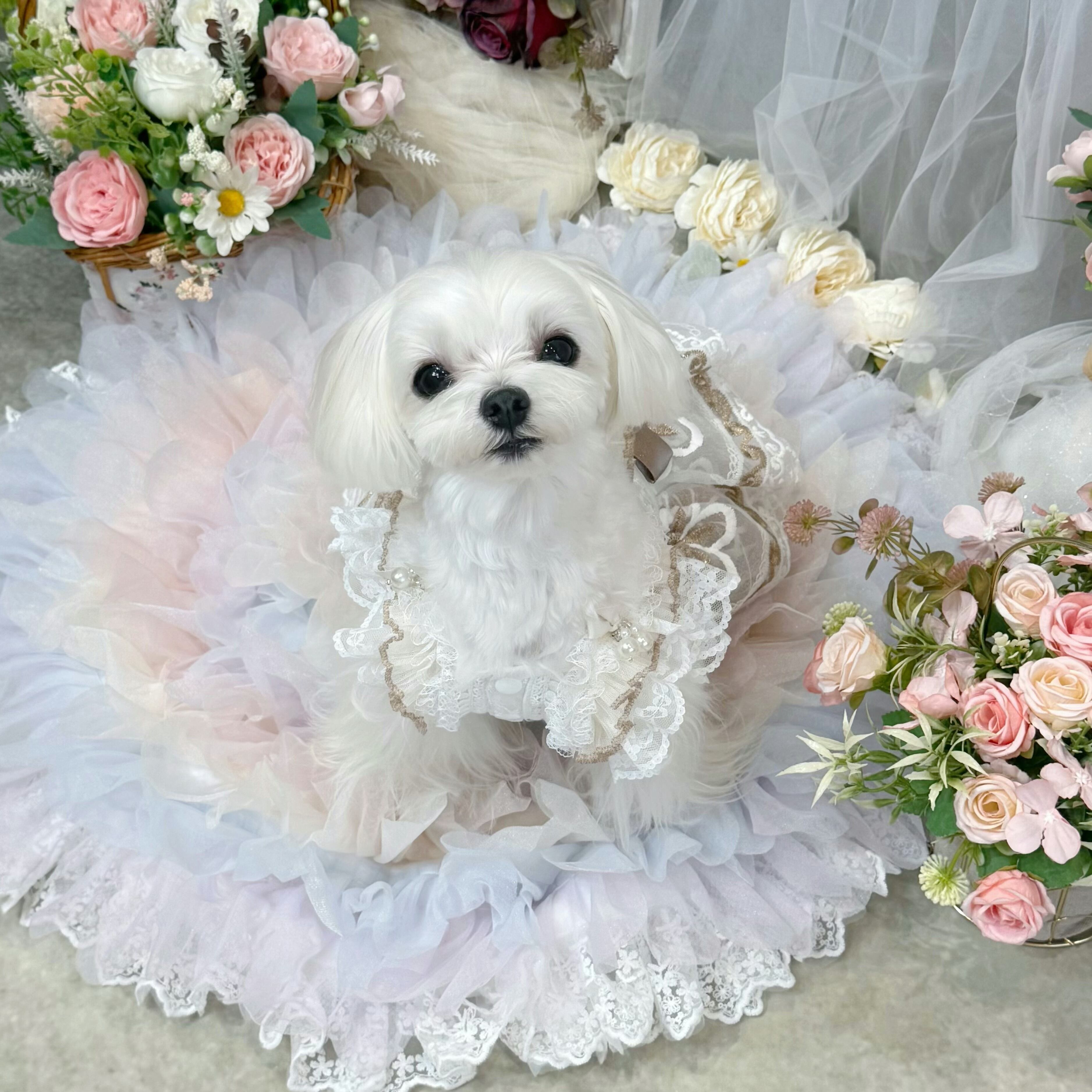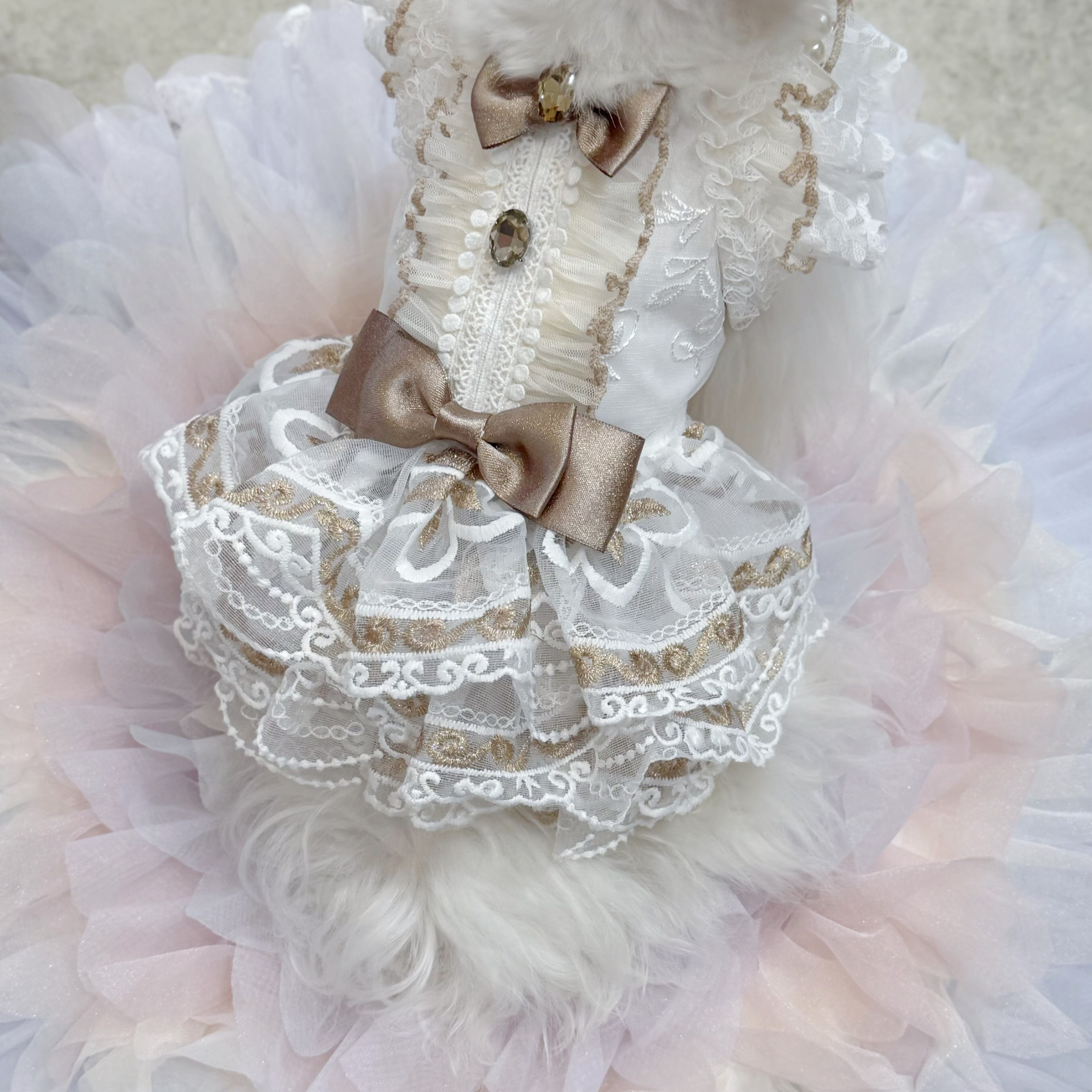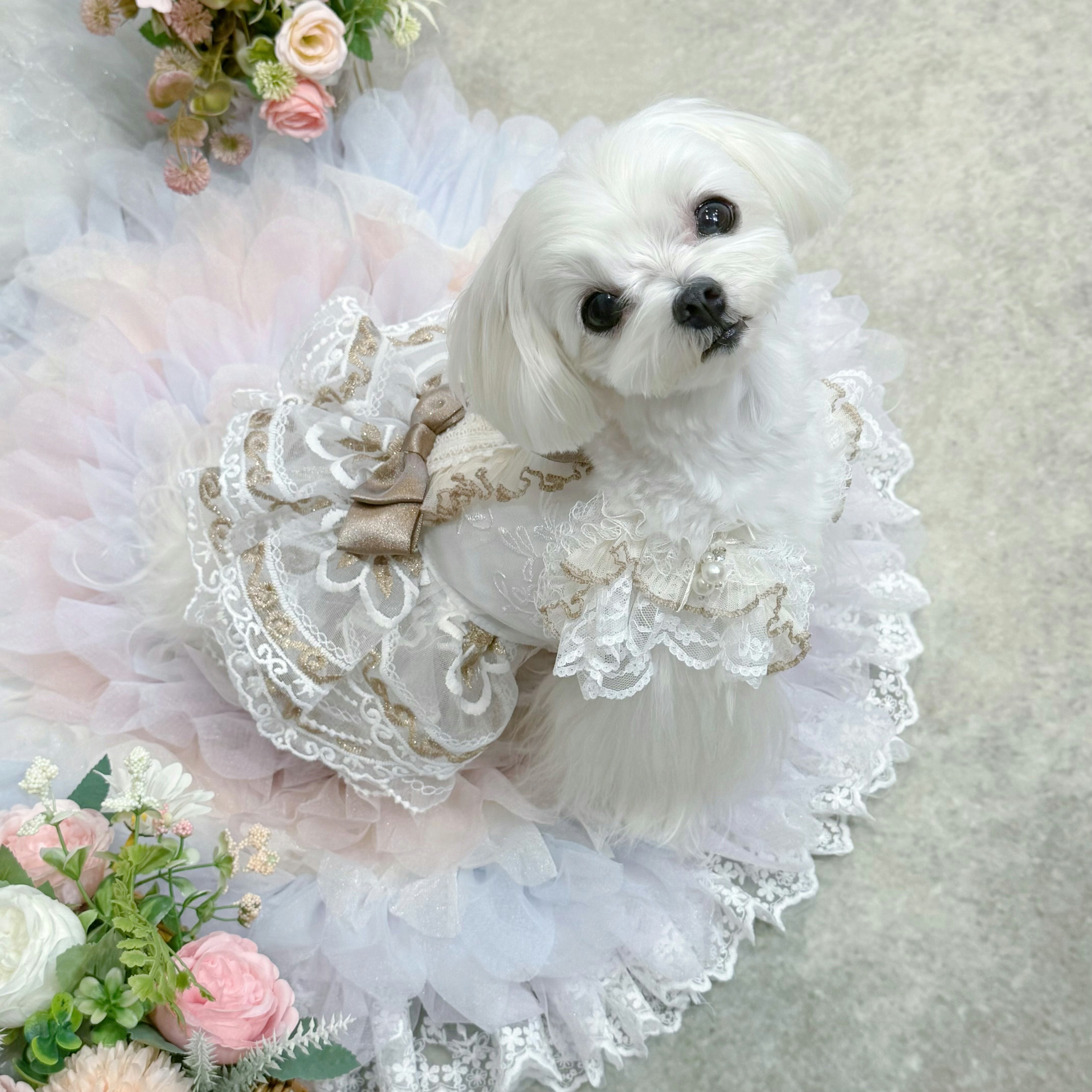 スカート部分には厚手のレースを何枚も重ねて作られているので、きちんとしたボリューム感がありながらも、愛犬が走り回っても重たく感じさせず、動きやすさを損なわない設計になっています〜