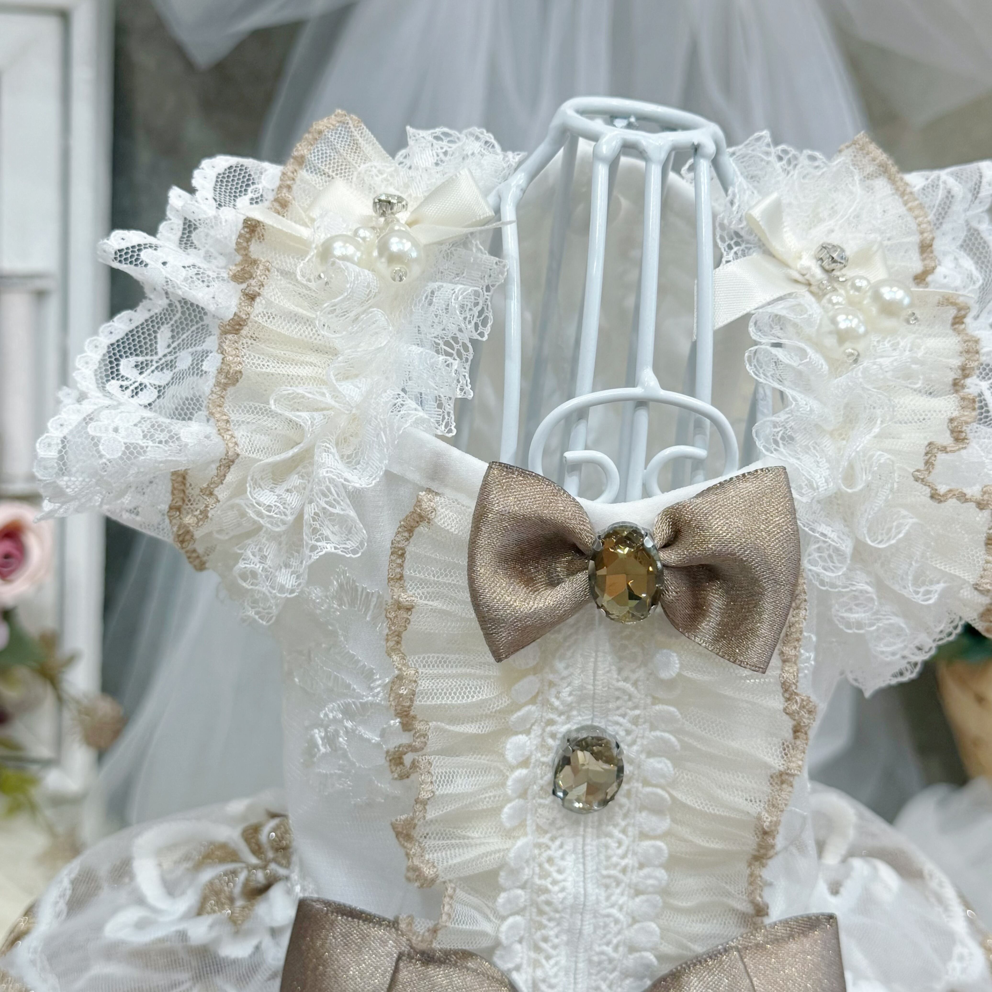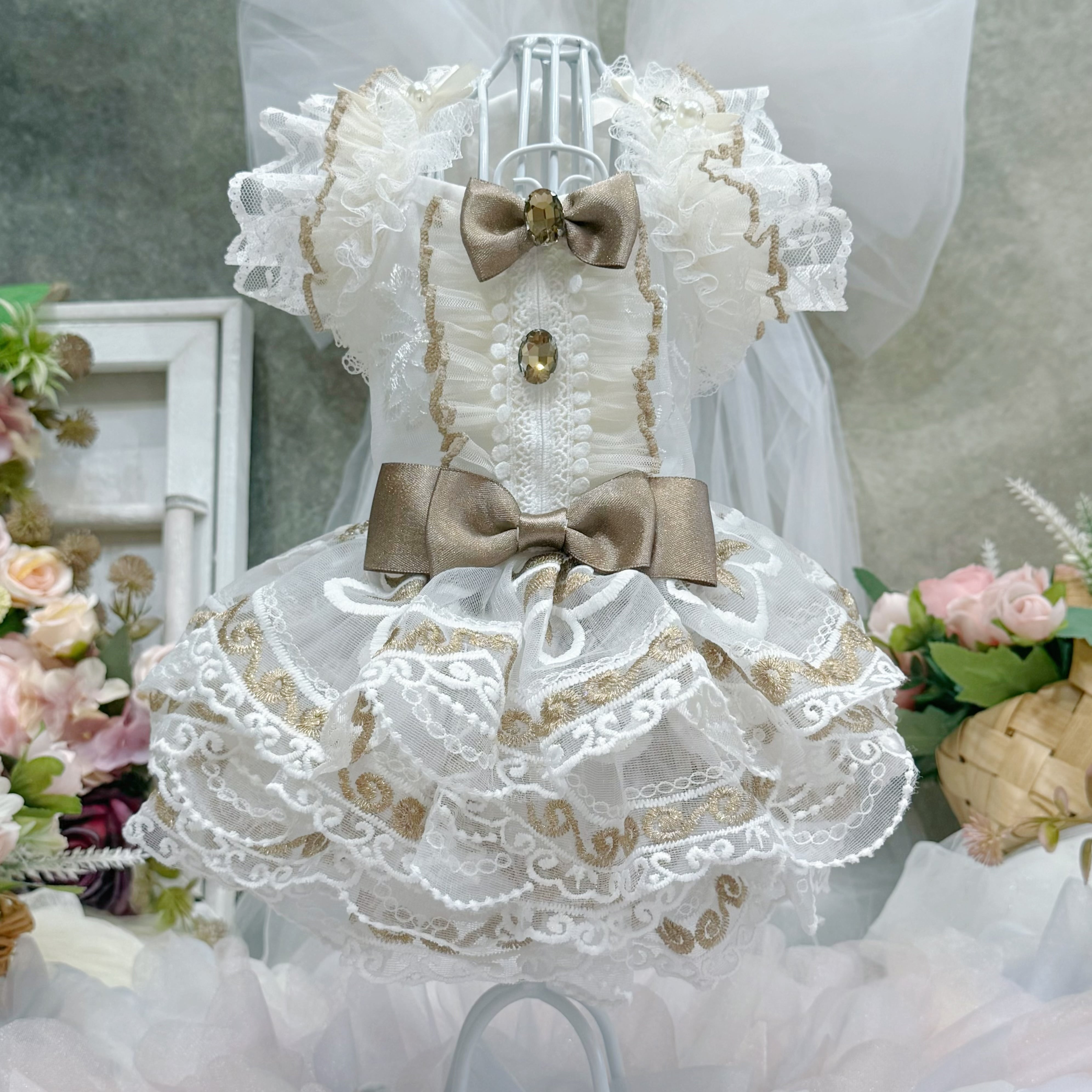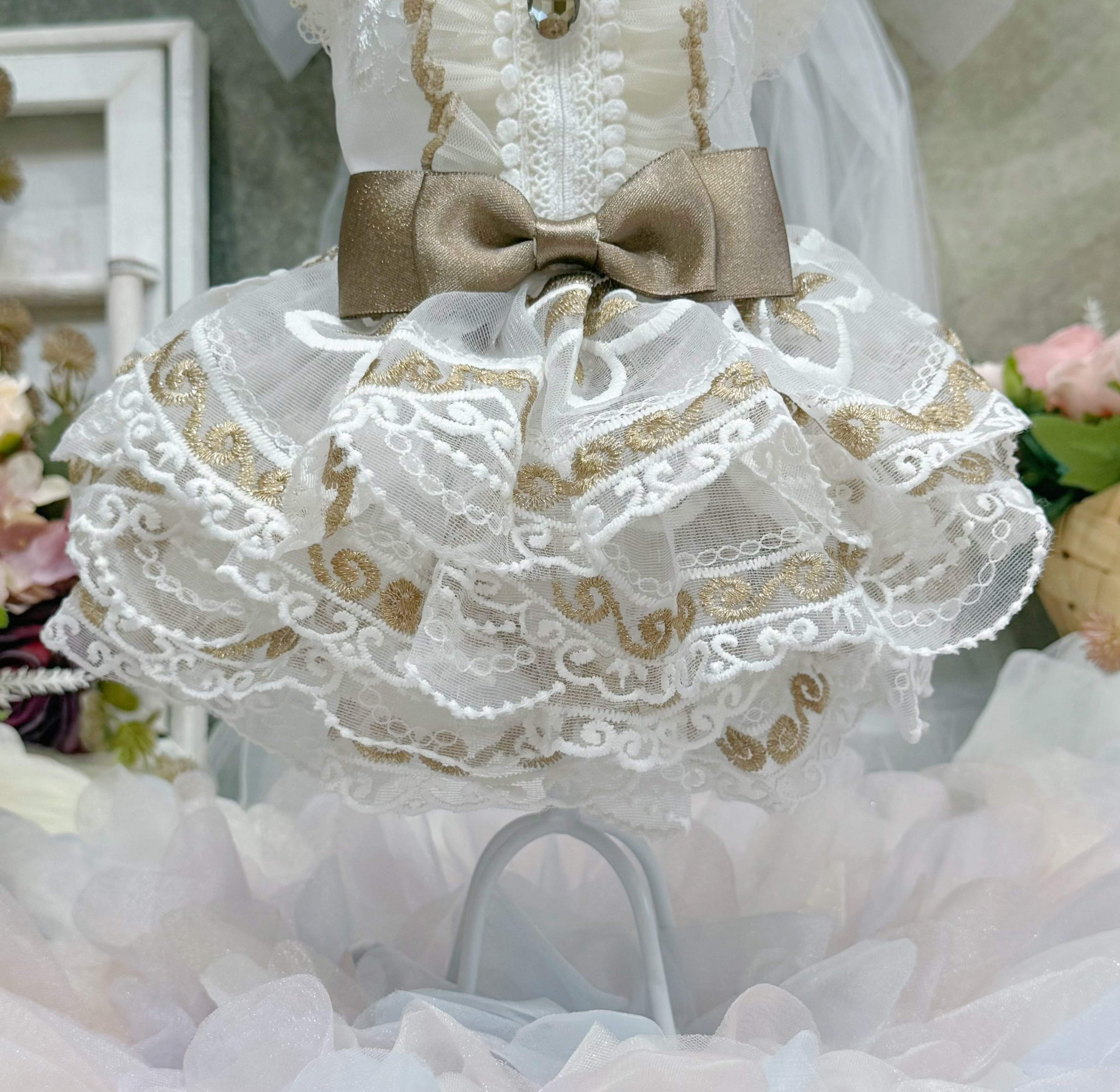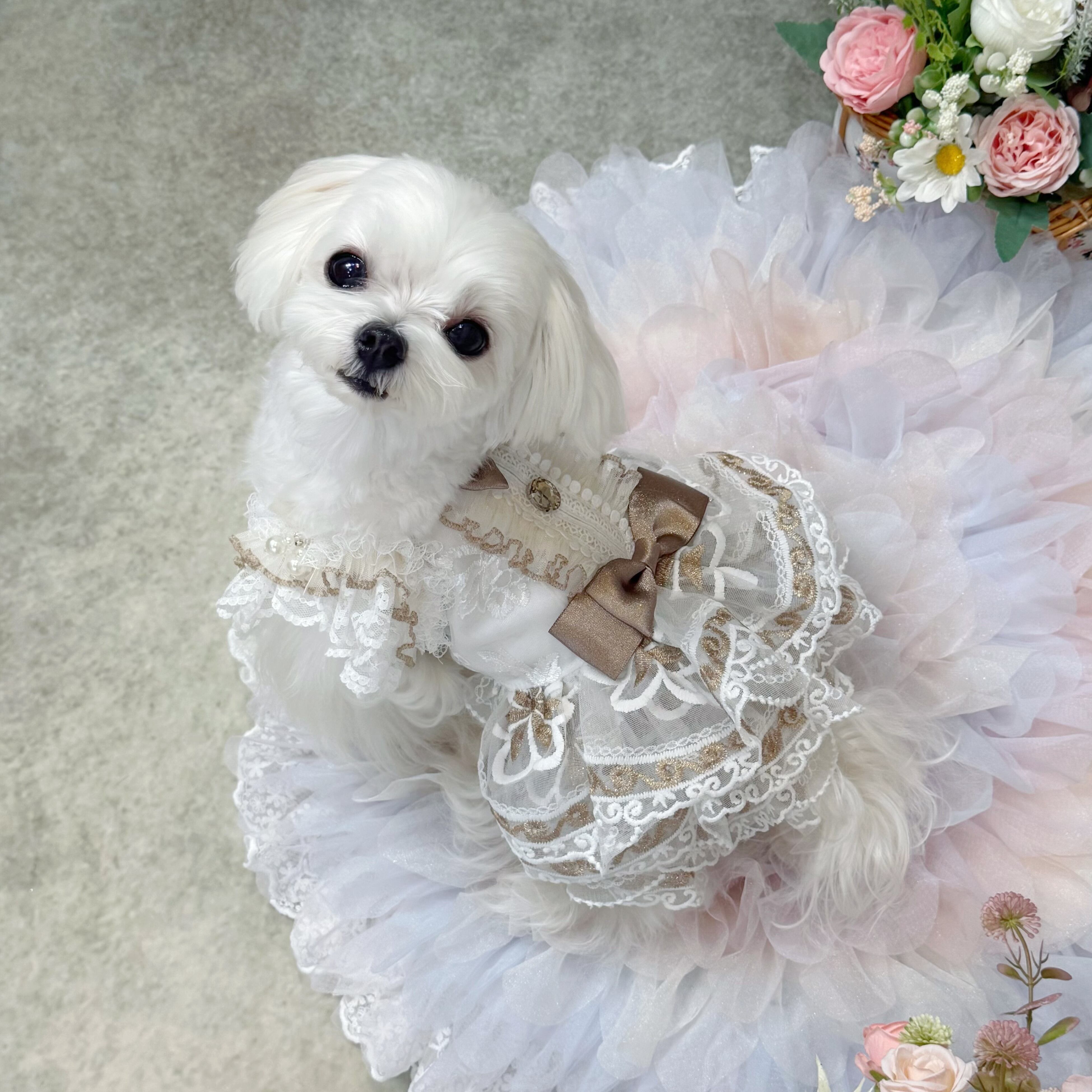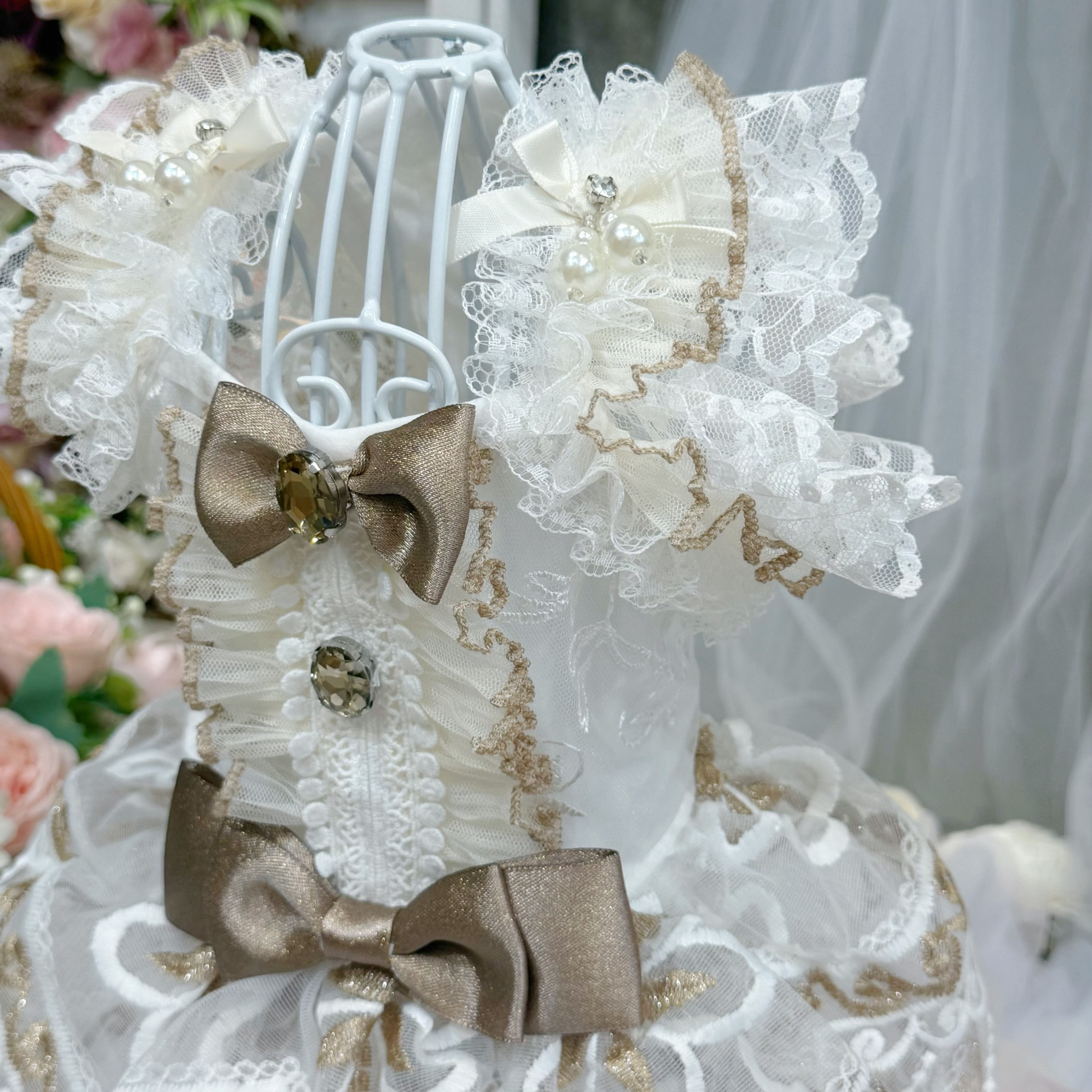 スカート部分には厚手のレースを何枚も重ねて作られているので、きちんとしたボリューム感がありながらも、愛犬が走り回っても重たく感じさせず、動きやすさを損なわない設計になっています〜