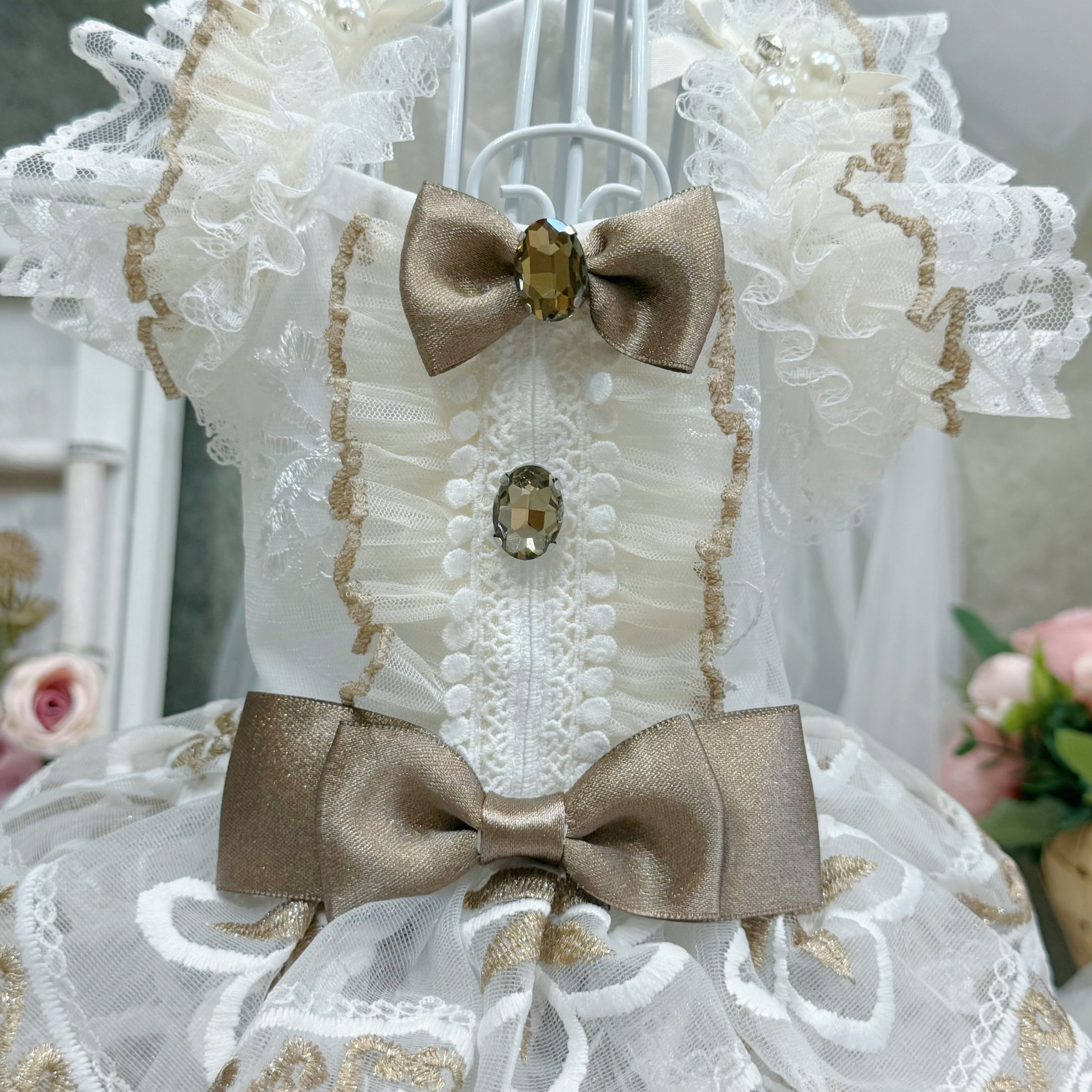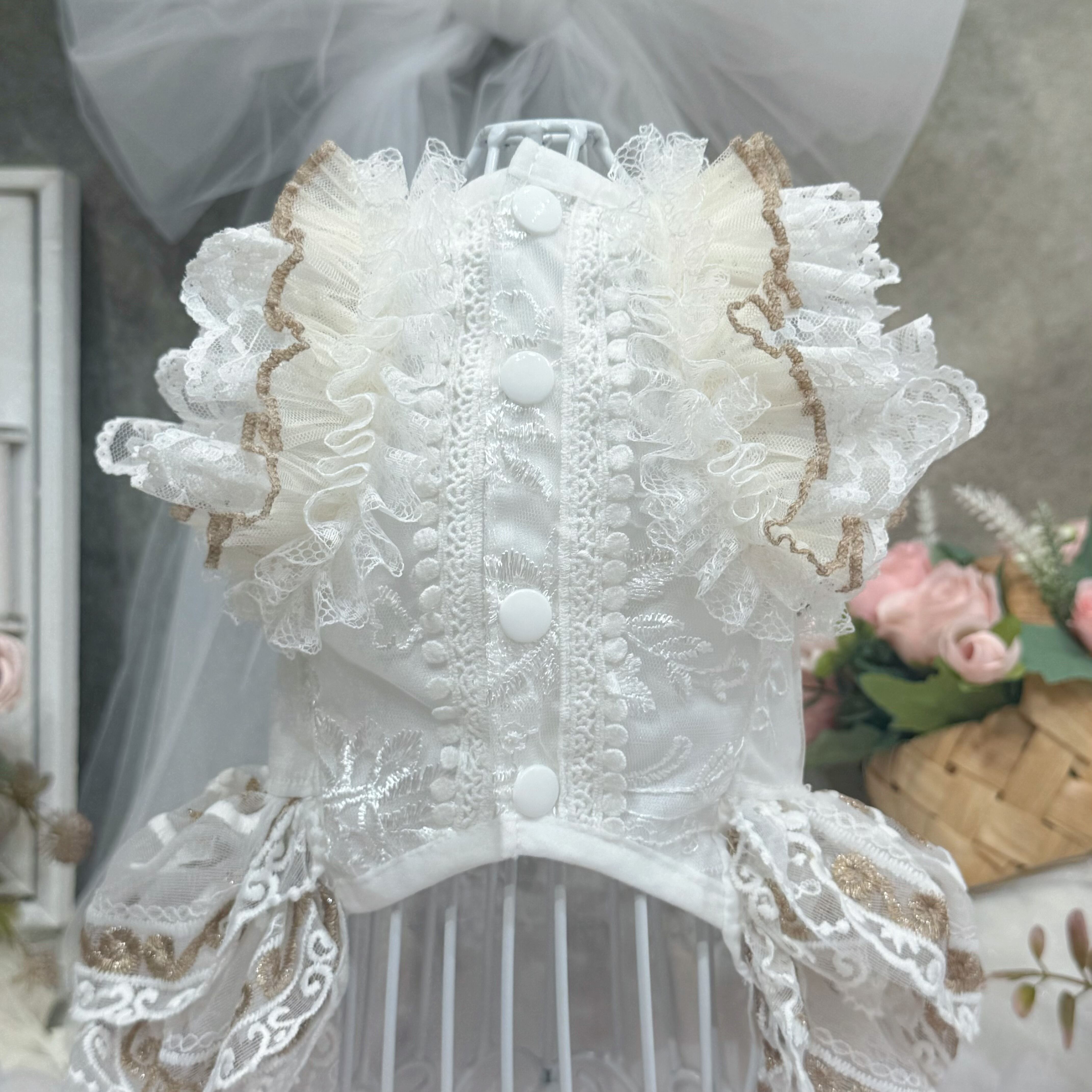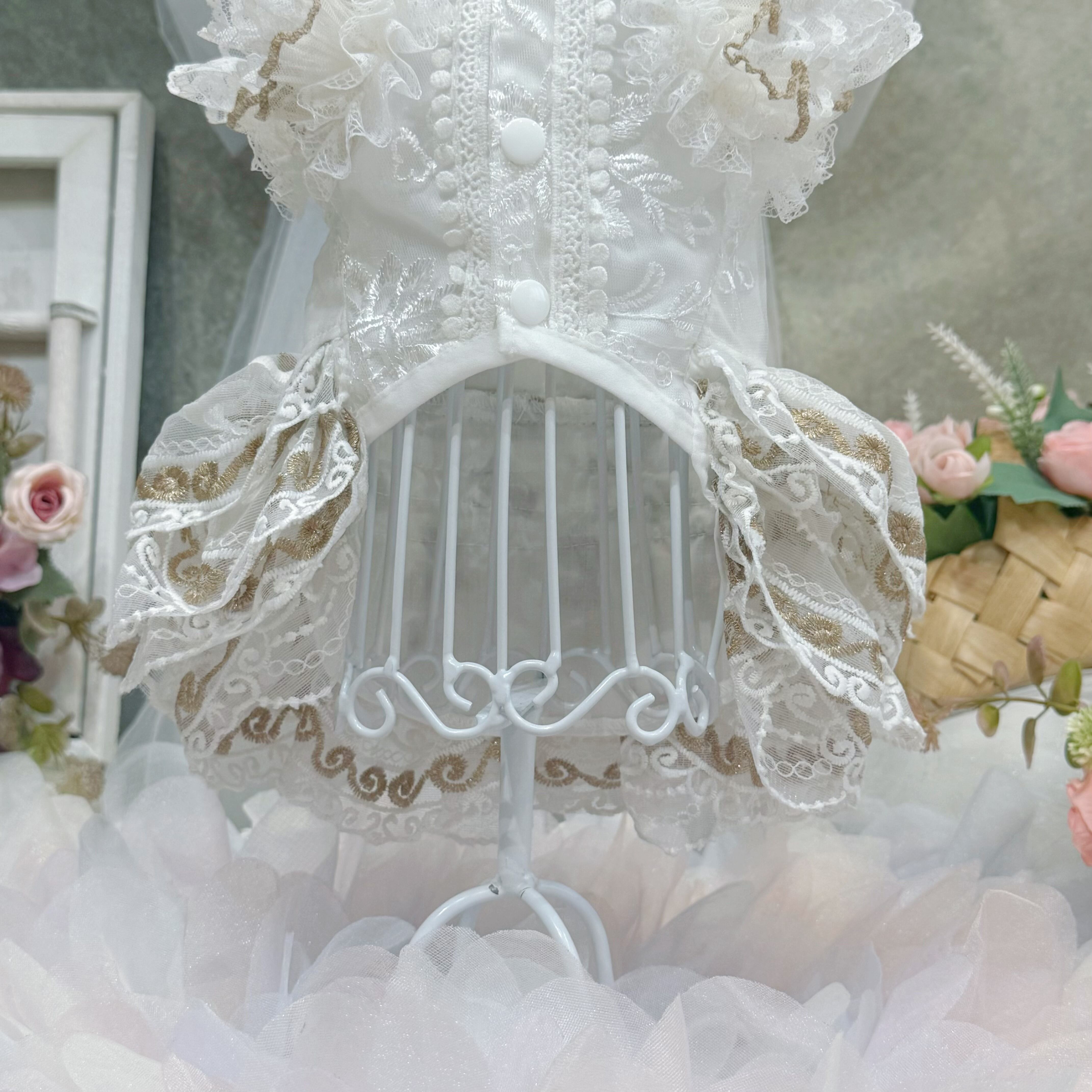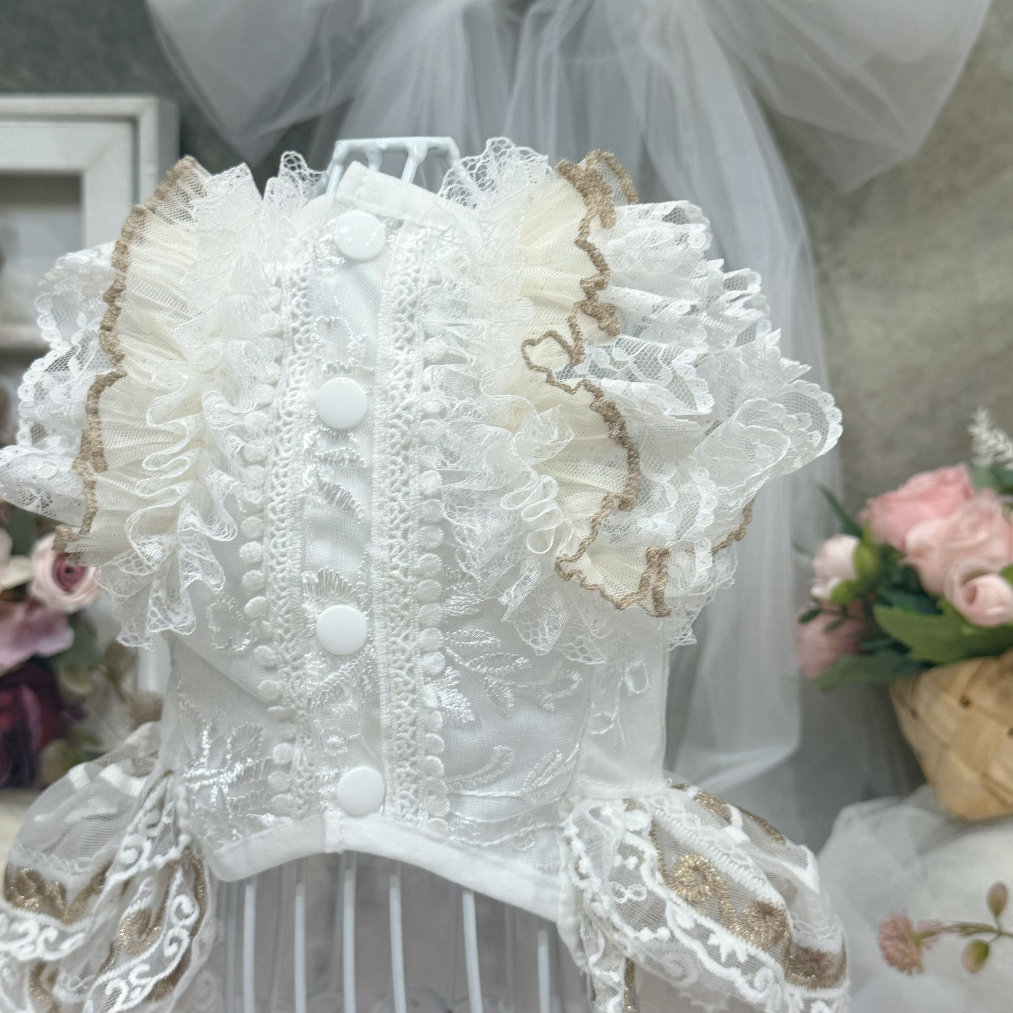 スカート部分には厚手のレースを何枚も重ねて作られているので、きちんとしたボリューム感がありながらも、愛犬が走り回っても重たく感じさせず、動きやすさを損なわない設計になっています〜
