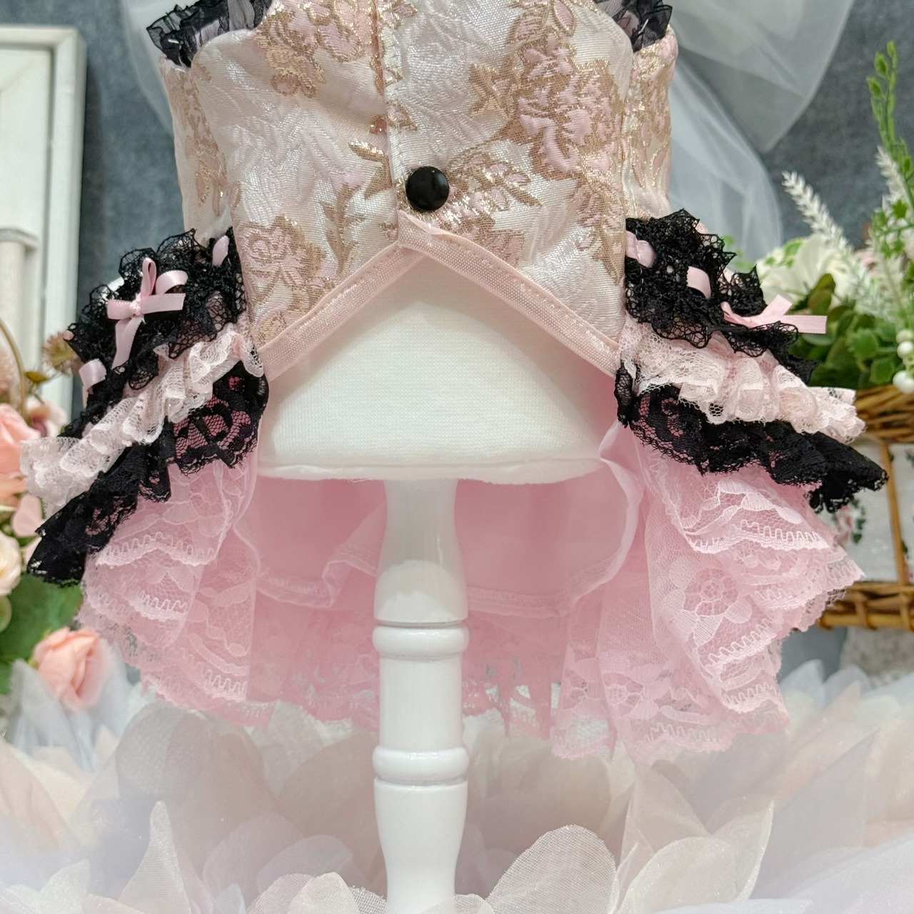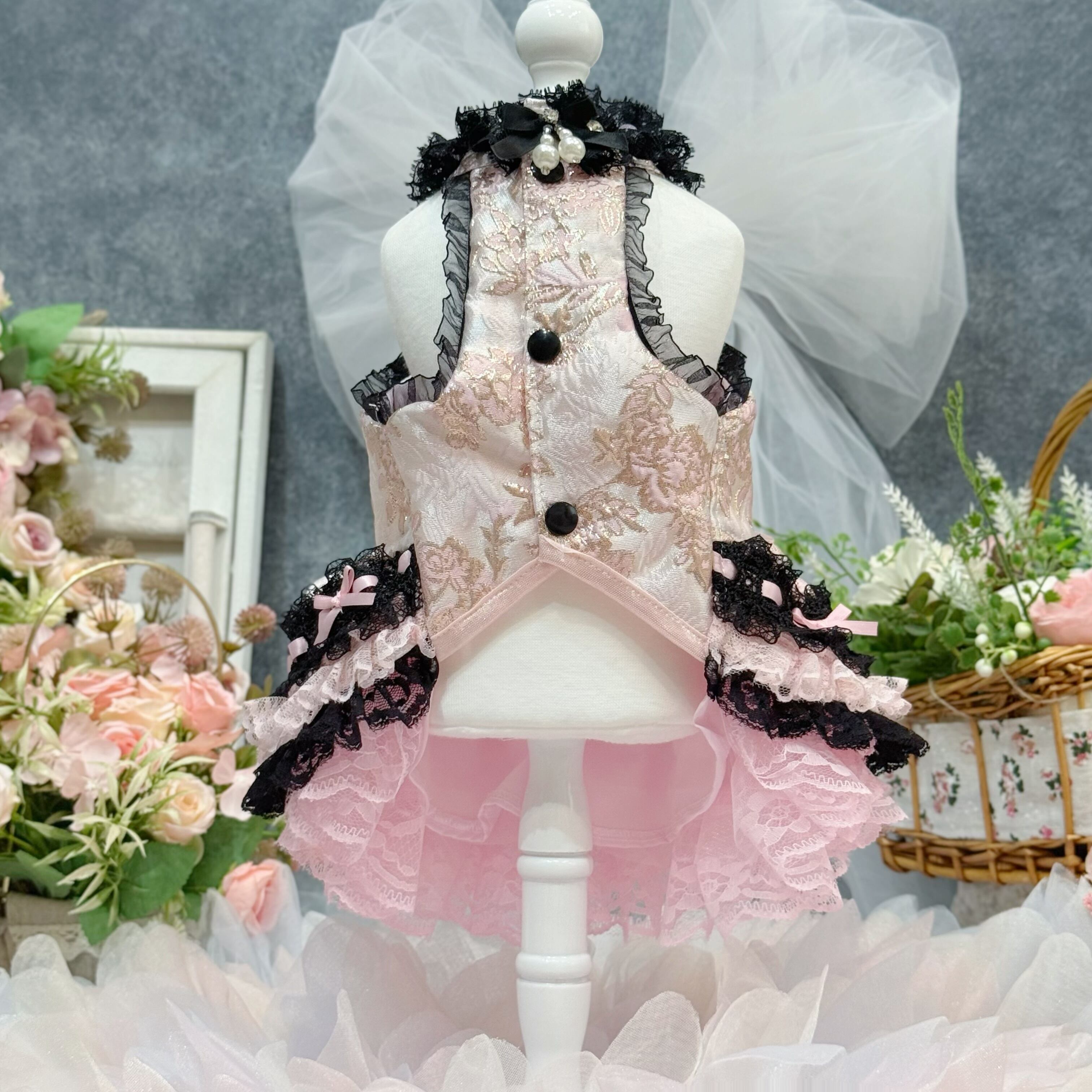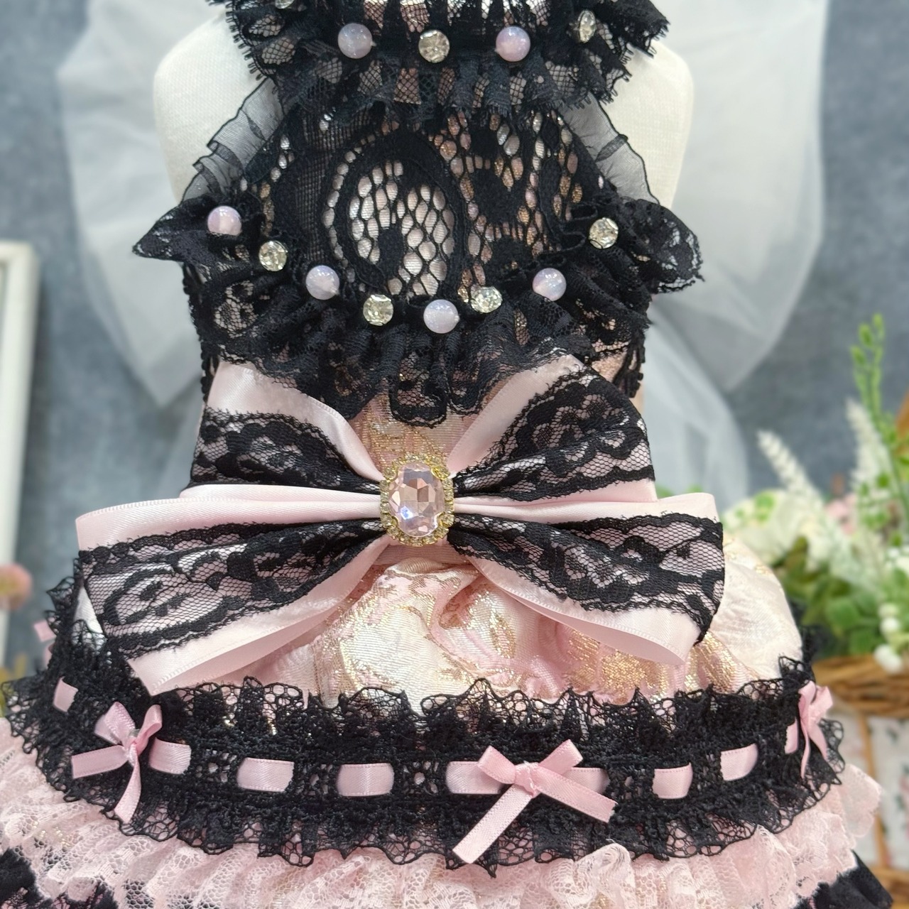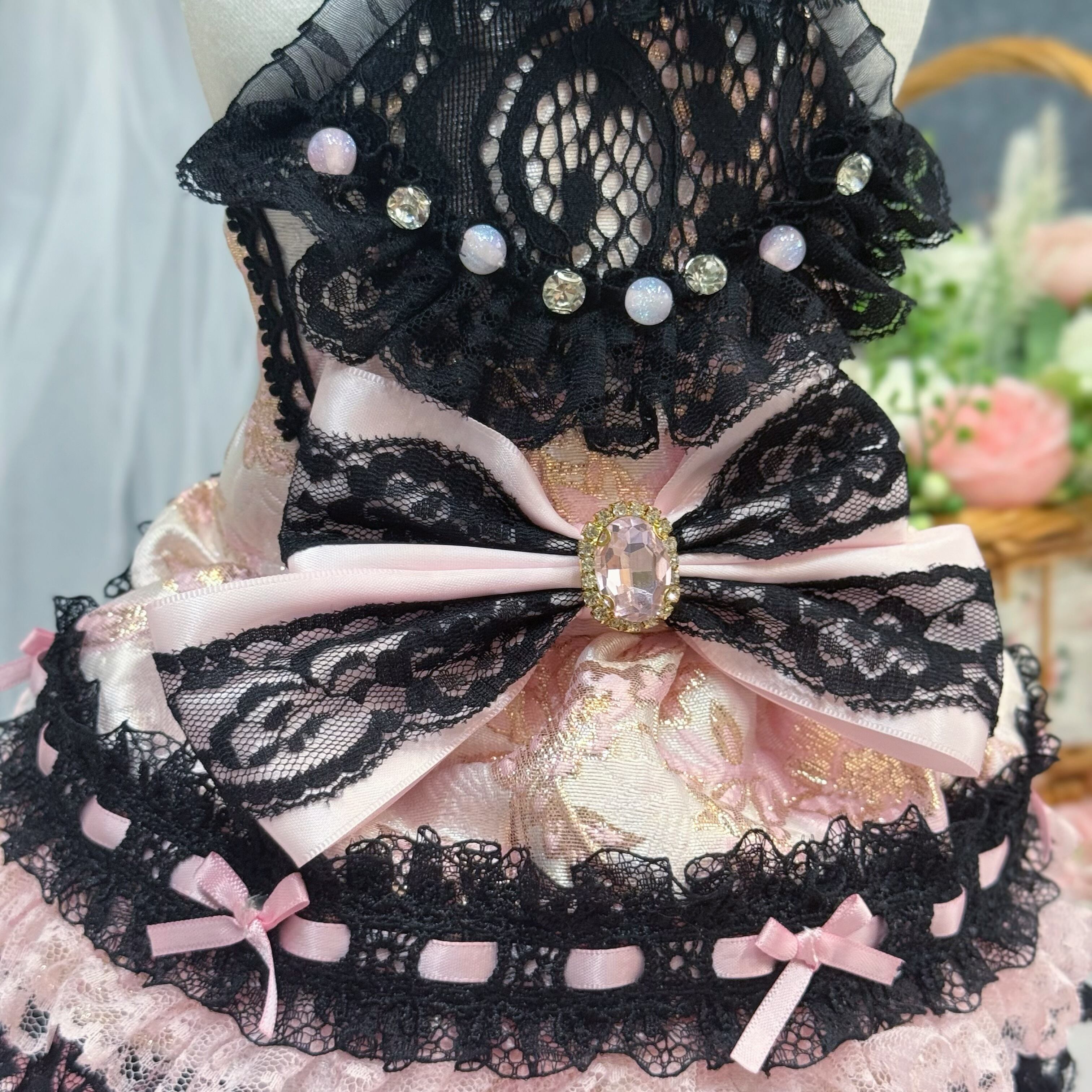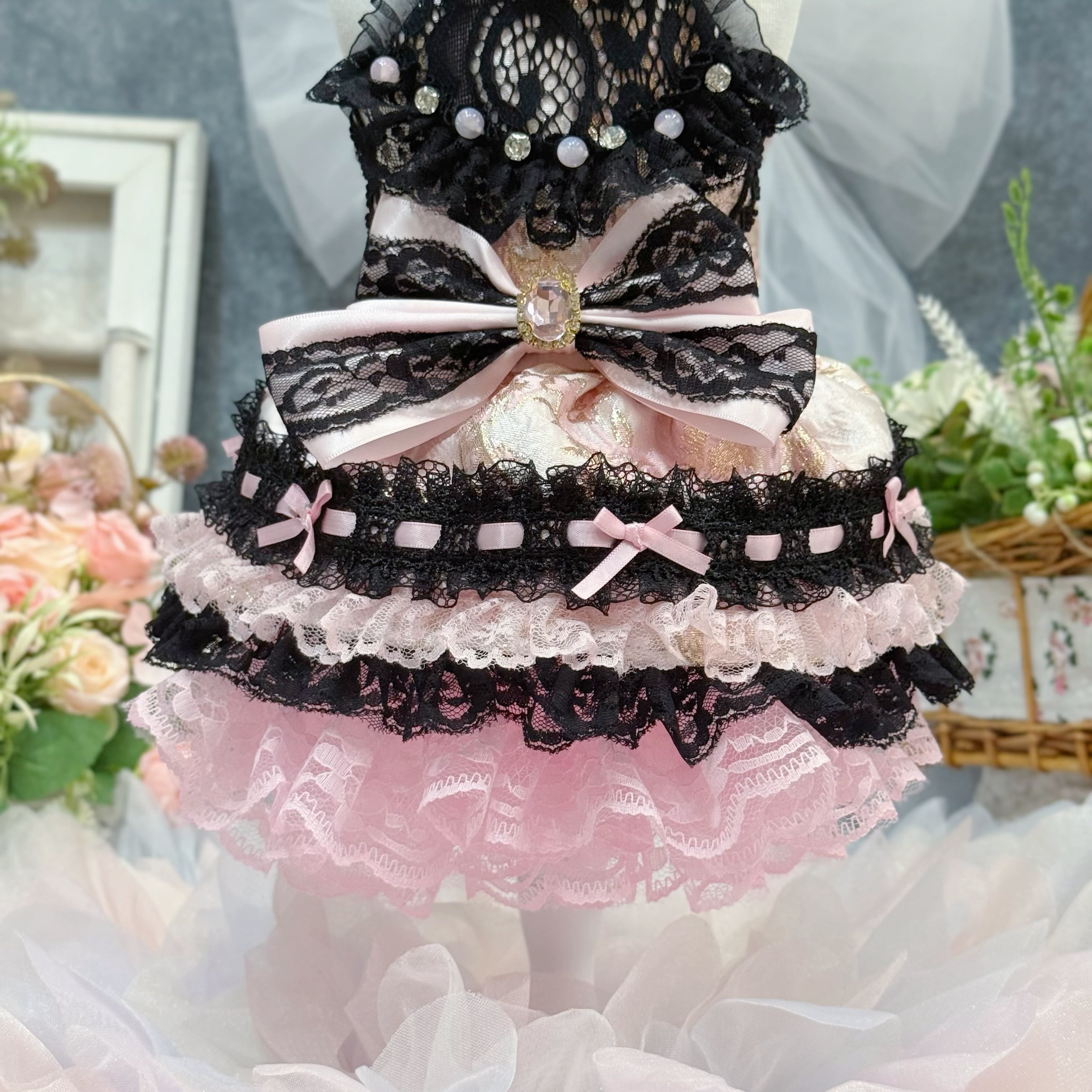 スカート部分もこだわり満載!ブラックのレースとピンクのレースをひとつひとつ重ねて制作し、ちゃんとしたボリューム感を出しました✨
