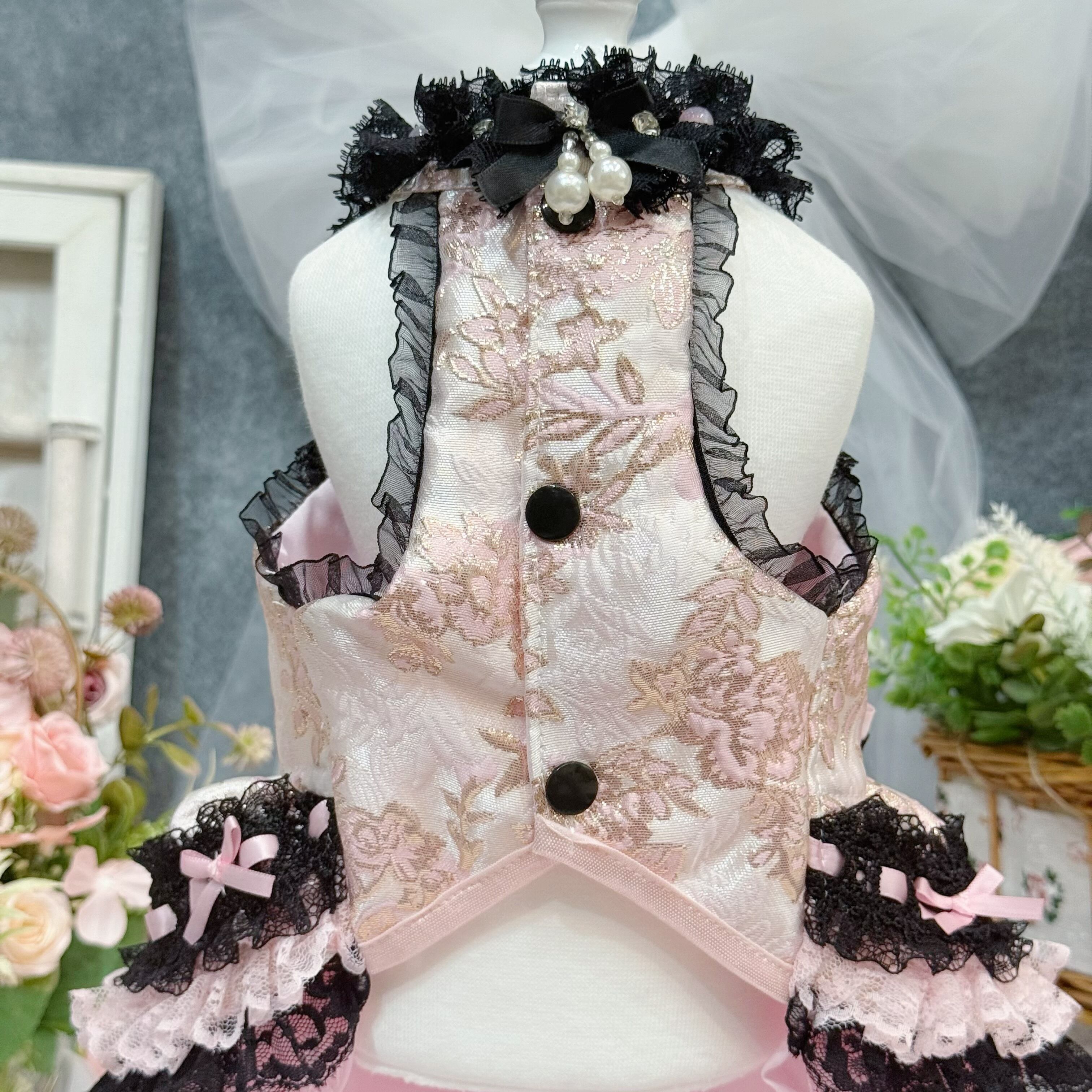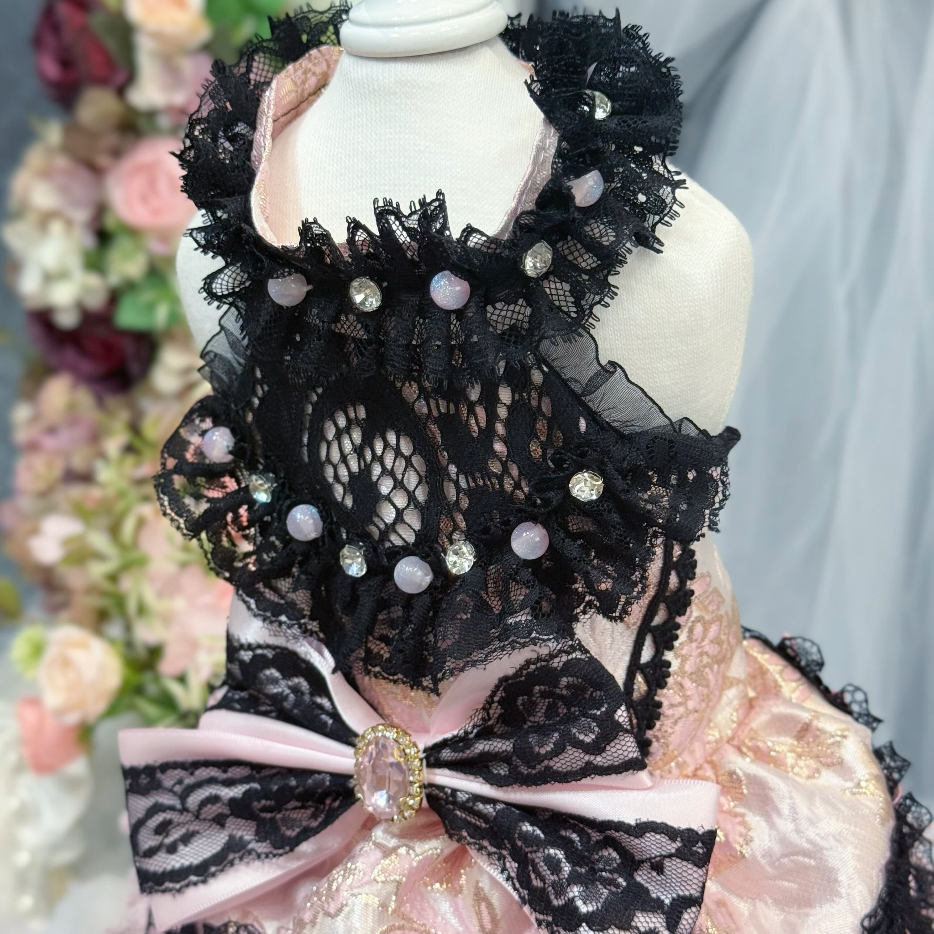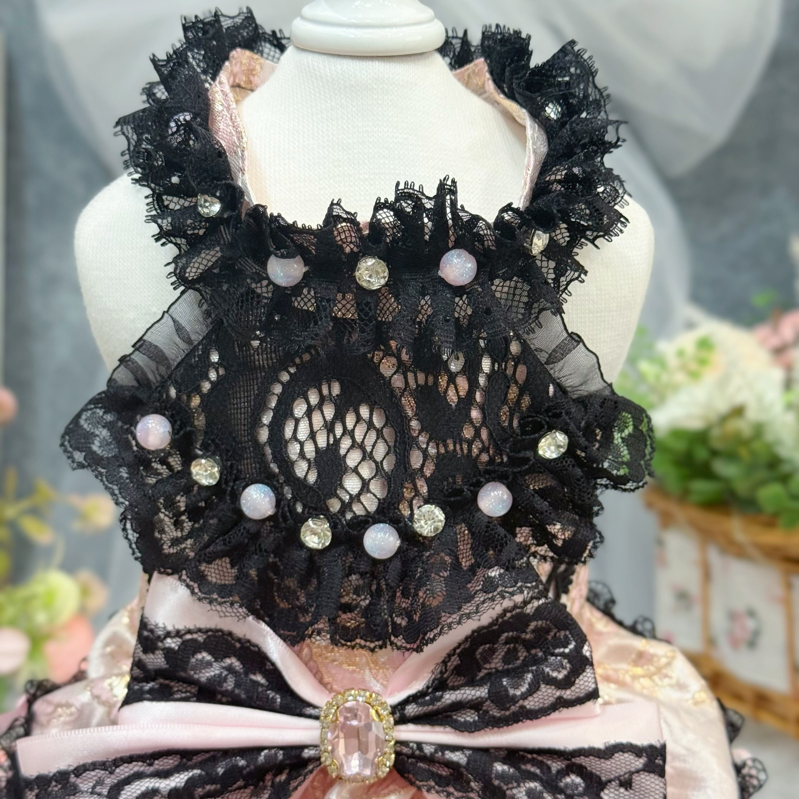 首元と背中にはキラキラしたストーンとピンクのビースを散りばめて飾り、手作り感あふれる精緻さで高級感をさらにプラス✨