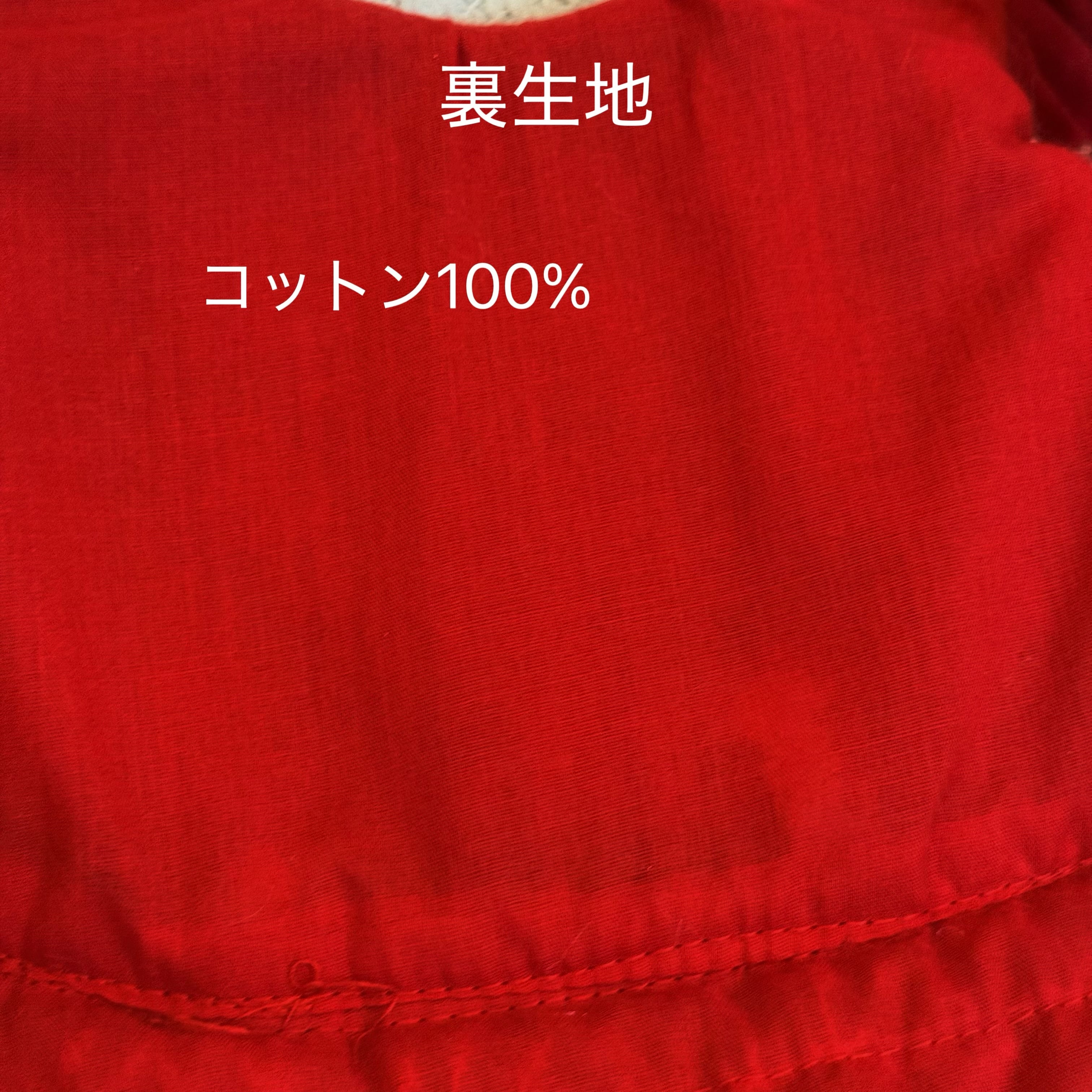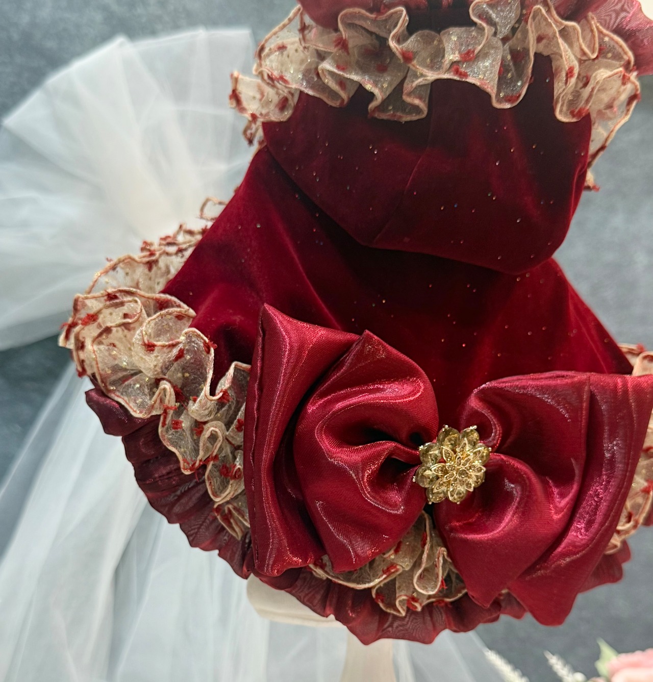 フリルのデザインにもこだわりが満載!2種類の生地を使い分けて、立体感と高級感を両立させました♡一つはワインレッドの光沢生地で、赤みが上品さを際立たせます。もう一つは金色のキラキラ生地に立体的なレッドドットがあるデザインで、光が当たるとキラキラと輝き、高級感もアップ!さらにフリルのサイズが大きくてドラマチック♪