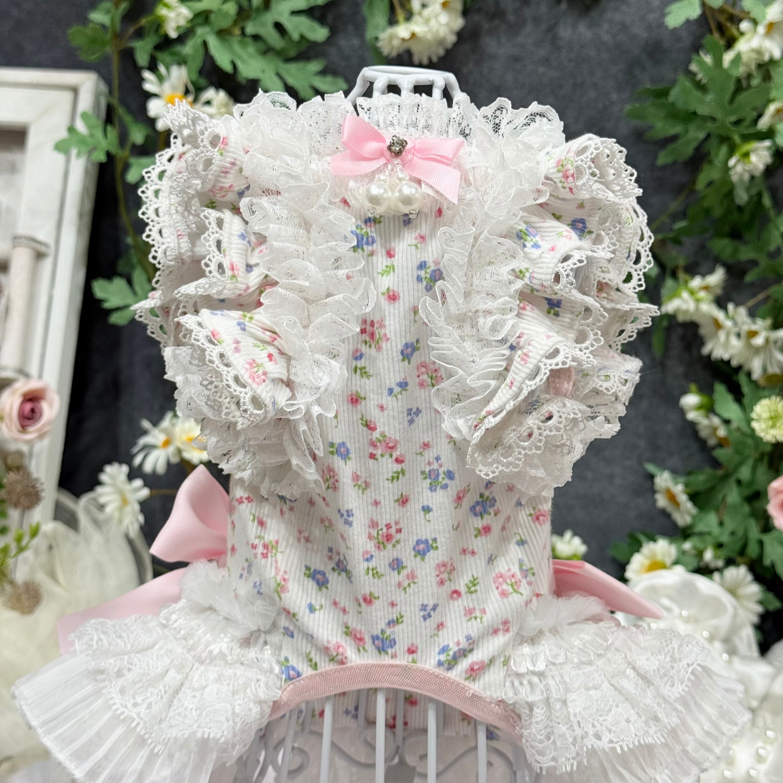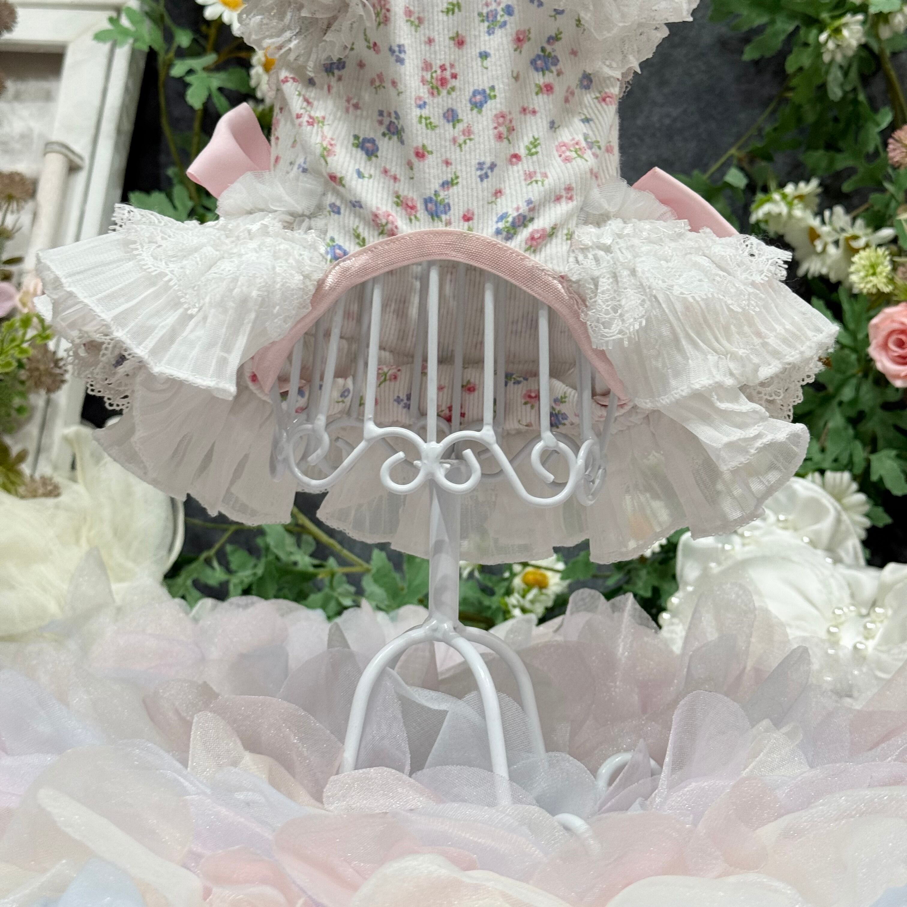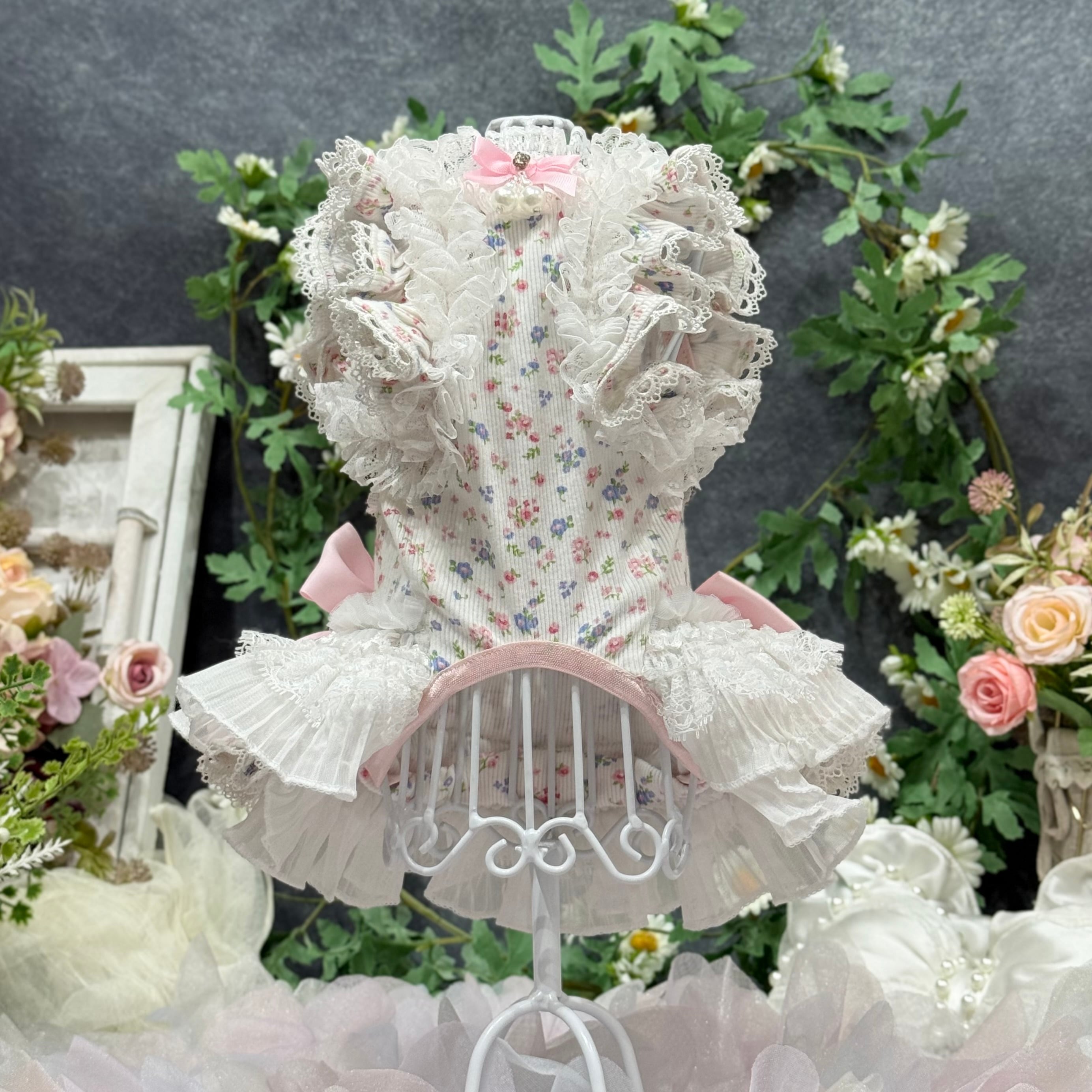 生地には小さなパステルカラーの花柄が散りばめられ、繊細な雰囲気を演出〜
