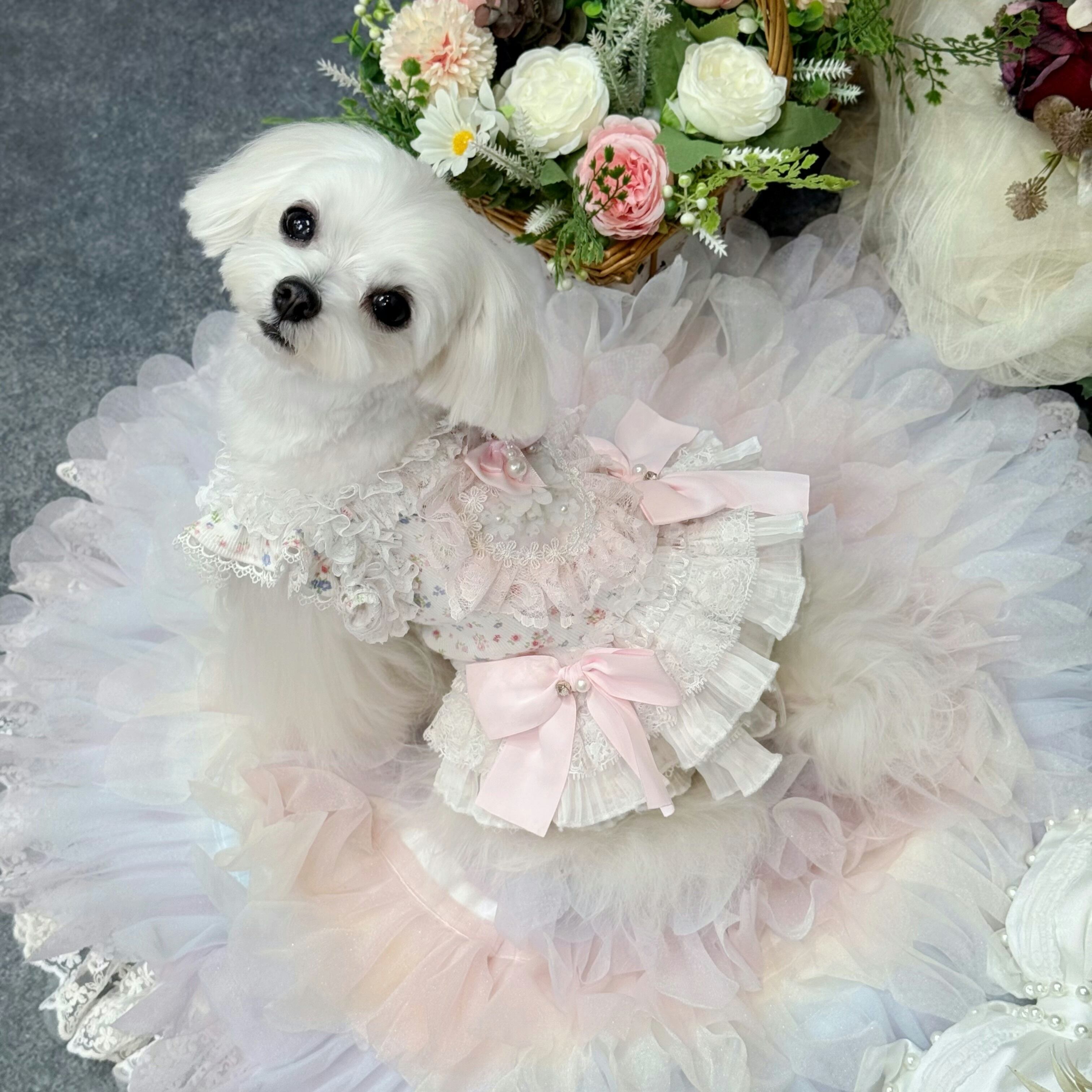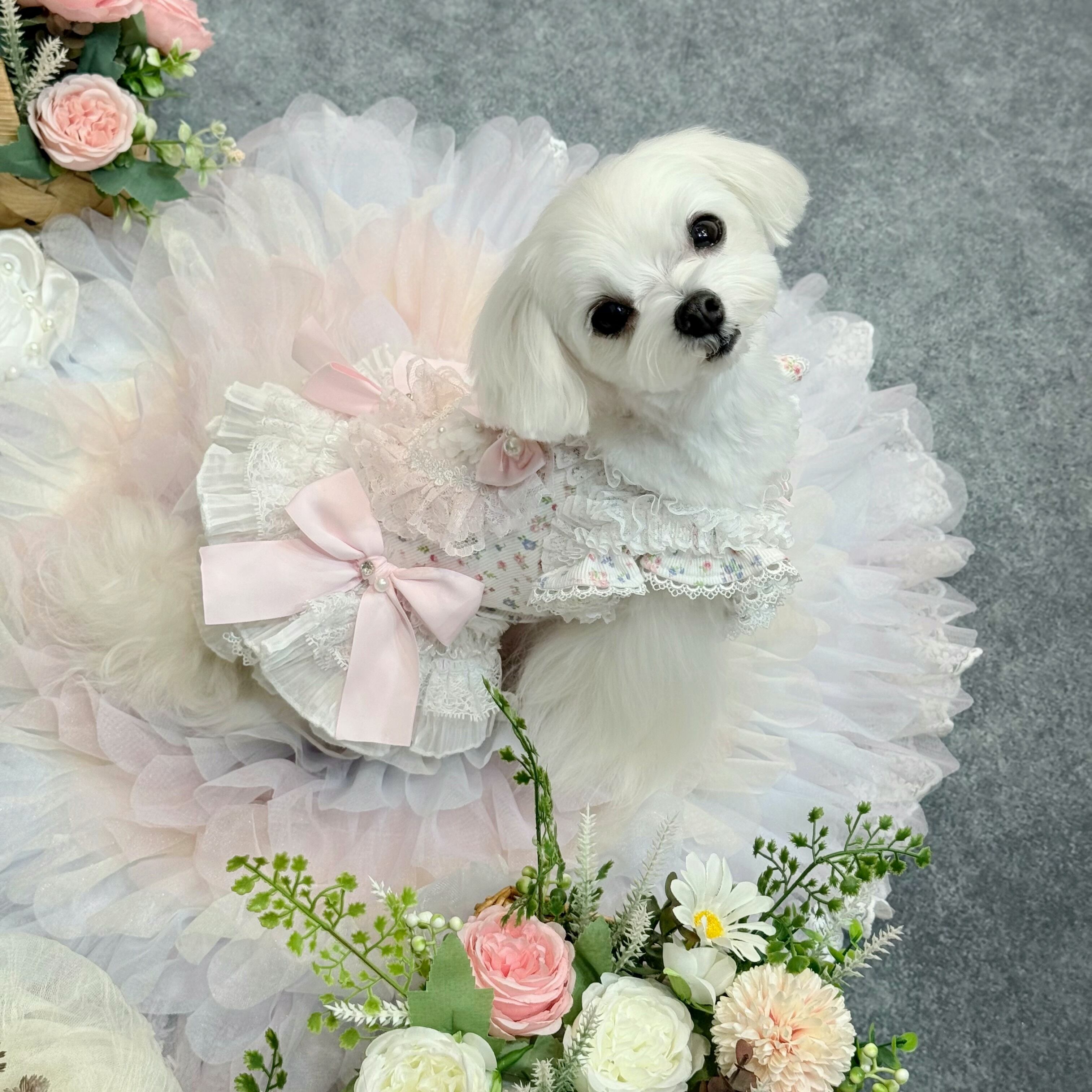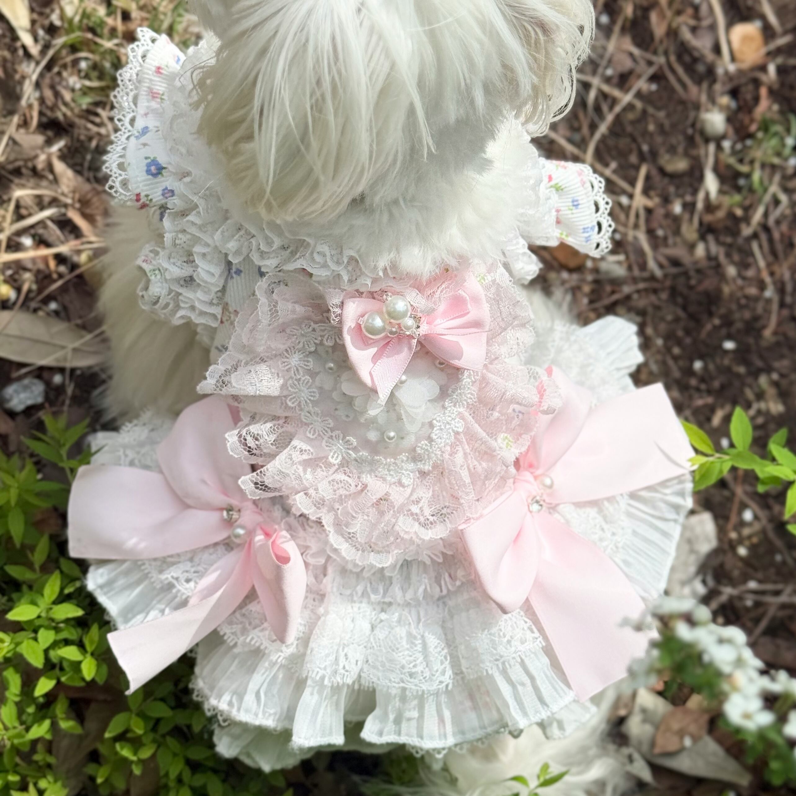 全体的に薄いピンクと白の配色で、優しく柔らかな印象を与え、どんな毛色の愛犬にもよく似合います♡