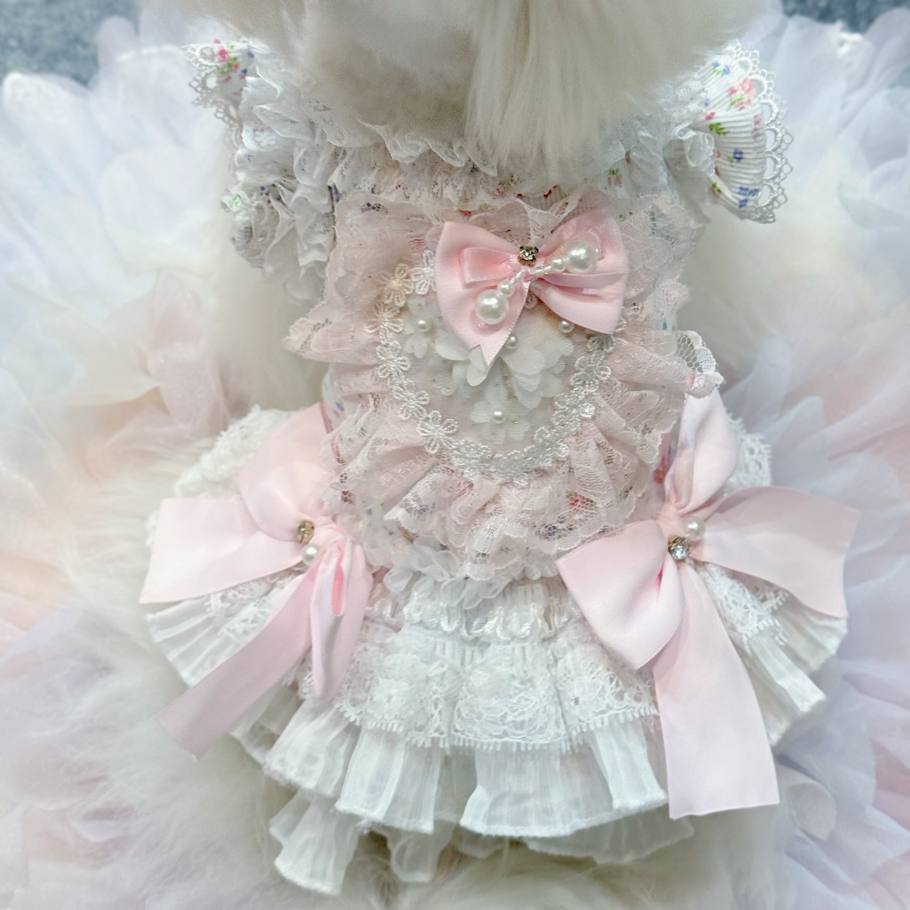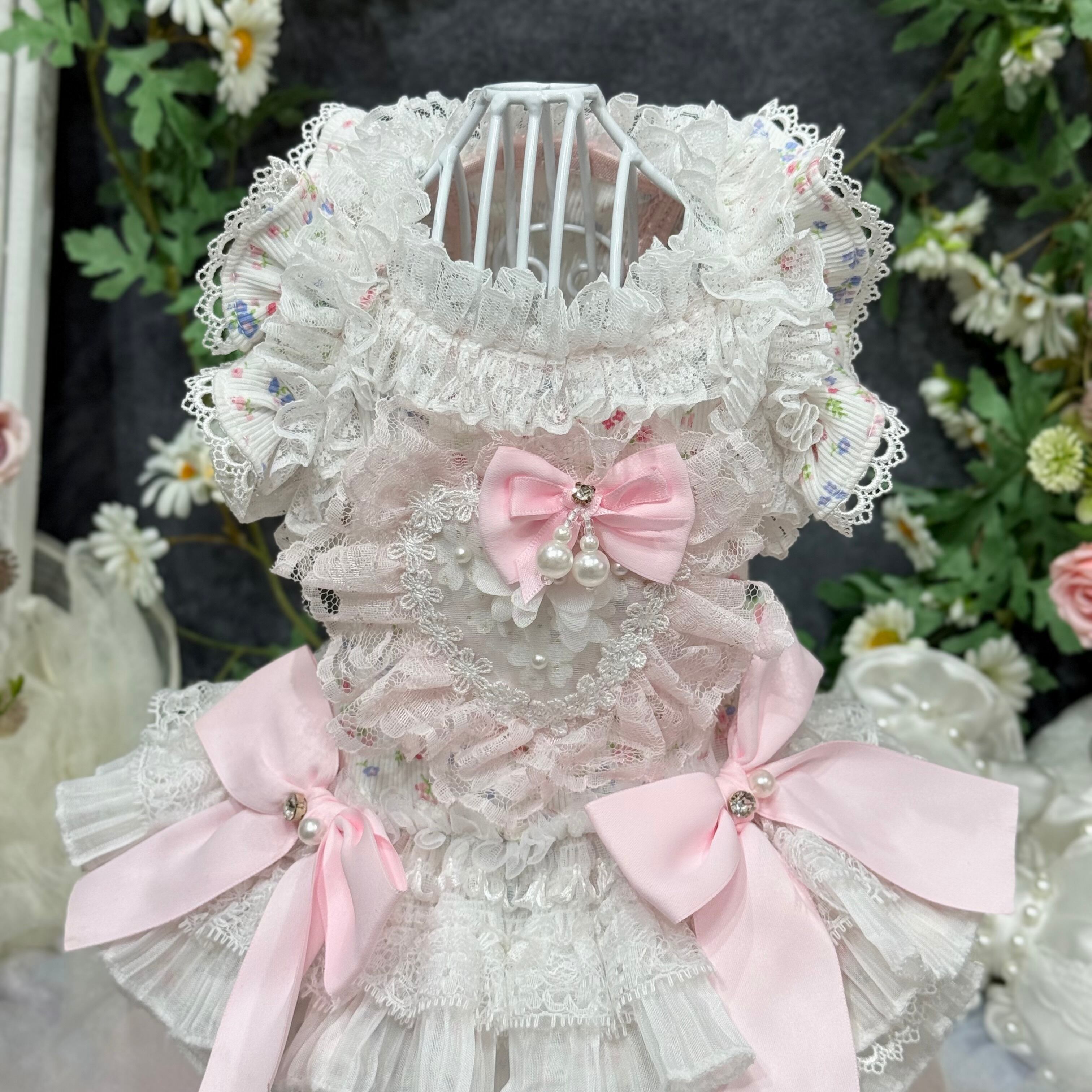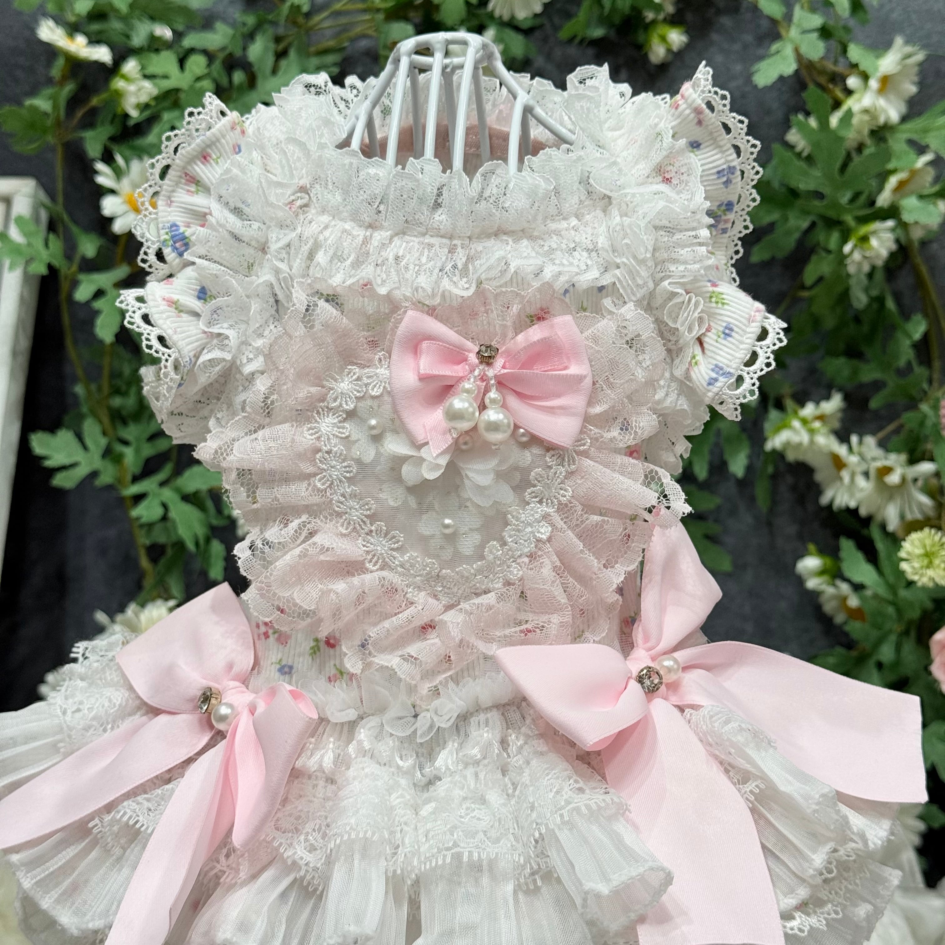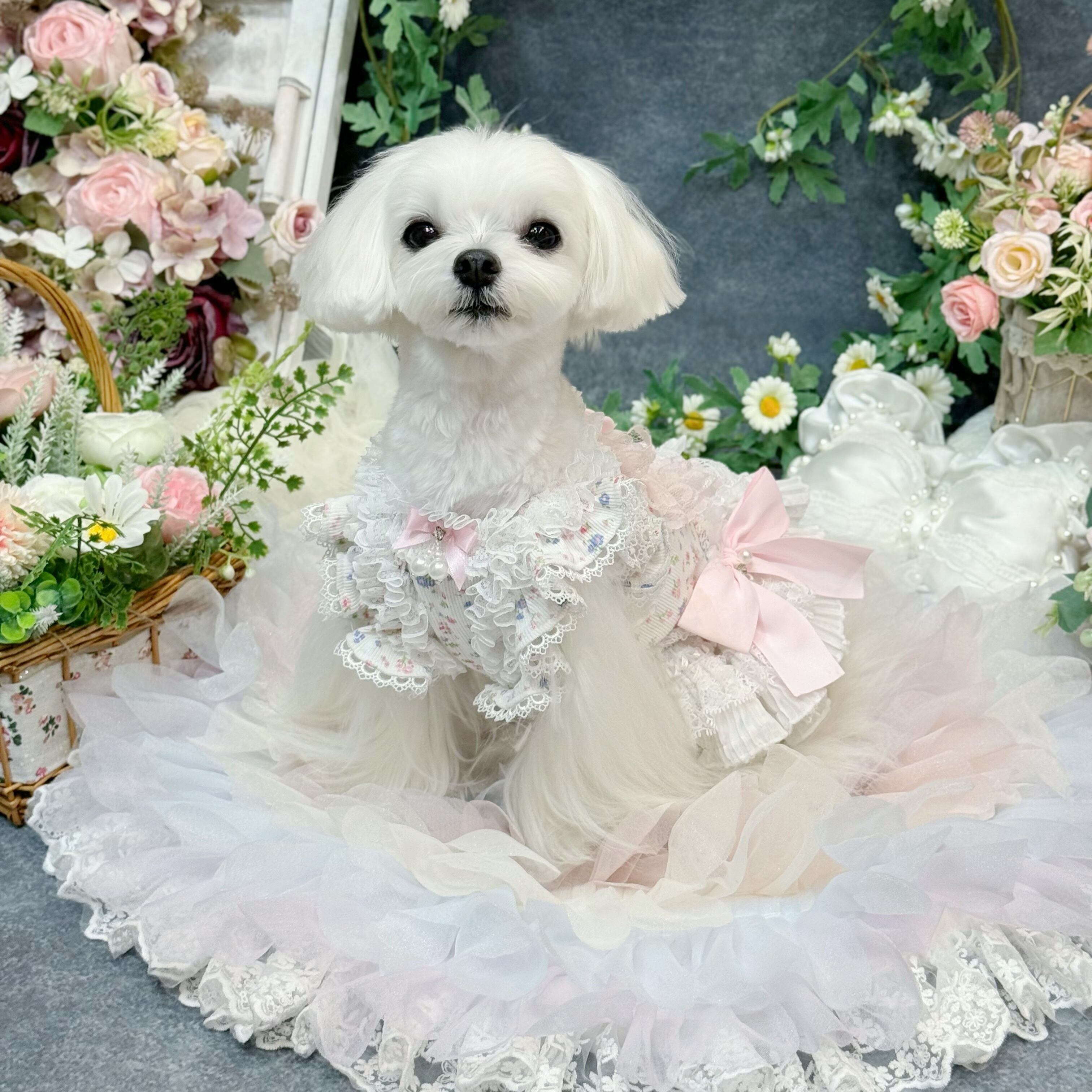 全体的に薄いピンクと白の配色で、優しく柔らかな印象を与え、どんな毛色の愛犬にもよく似合います♡