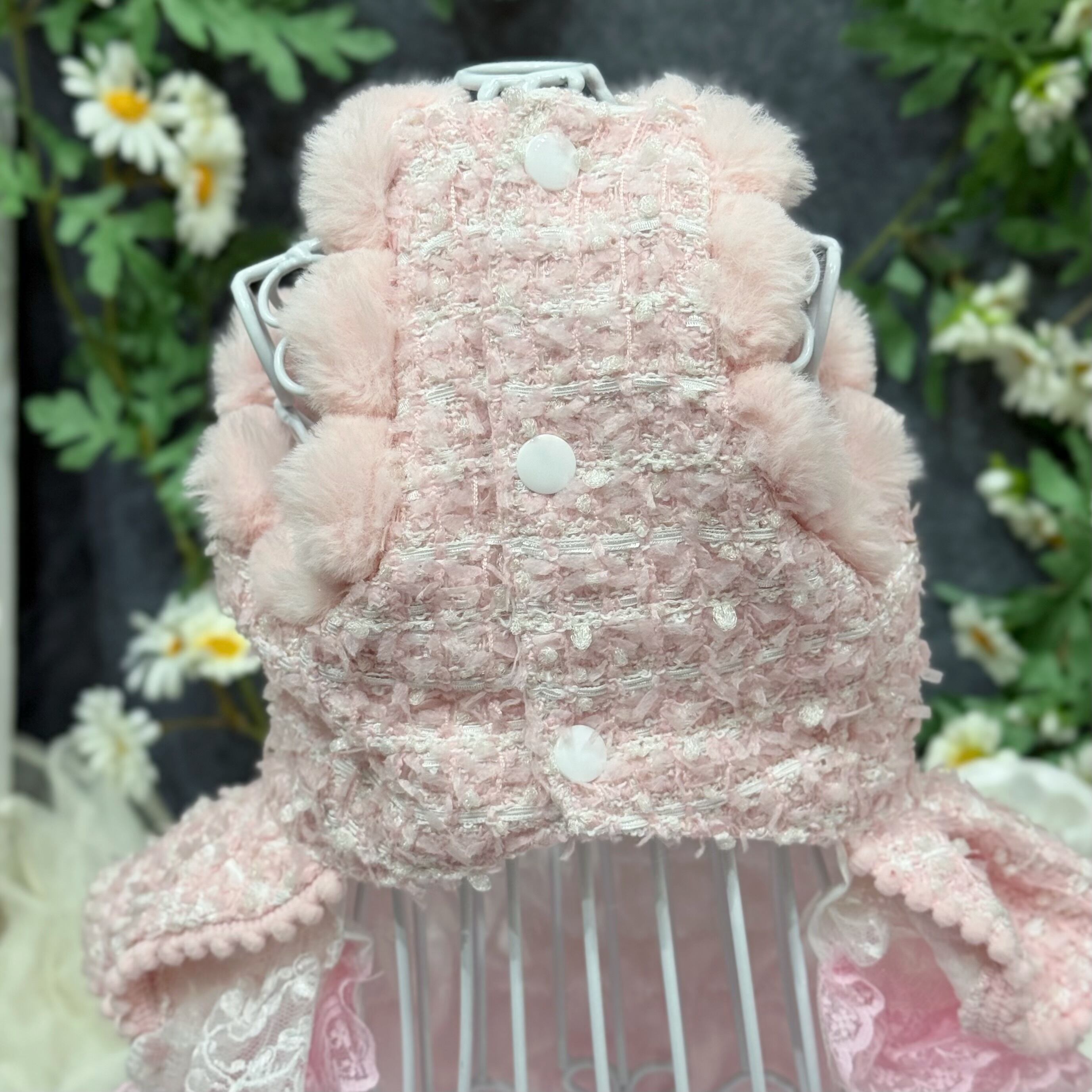 7割以上のウールを使用した厚手ツイード生地なので、寒い季節でも愛犬をしっかり温かく守ってくれるうえ、ベビーピンクの色合いがキュートさと上品さを両立♡