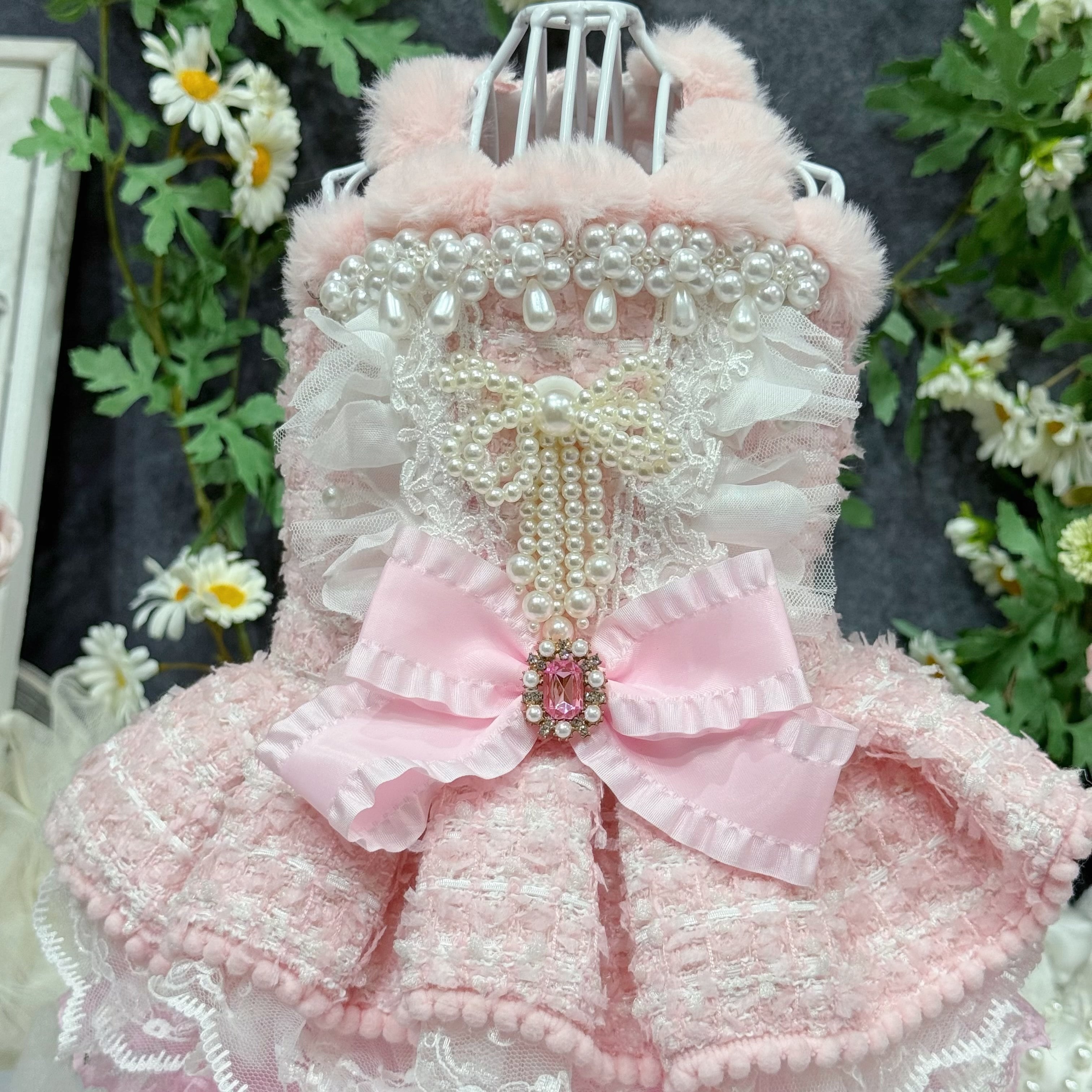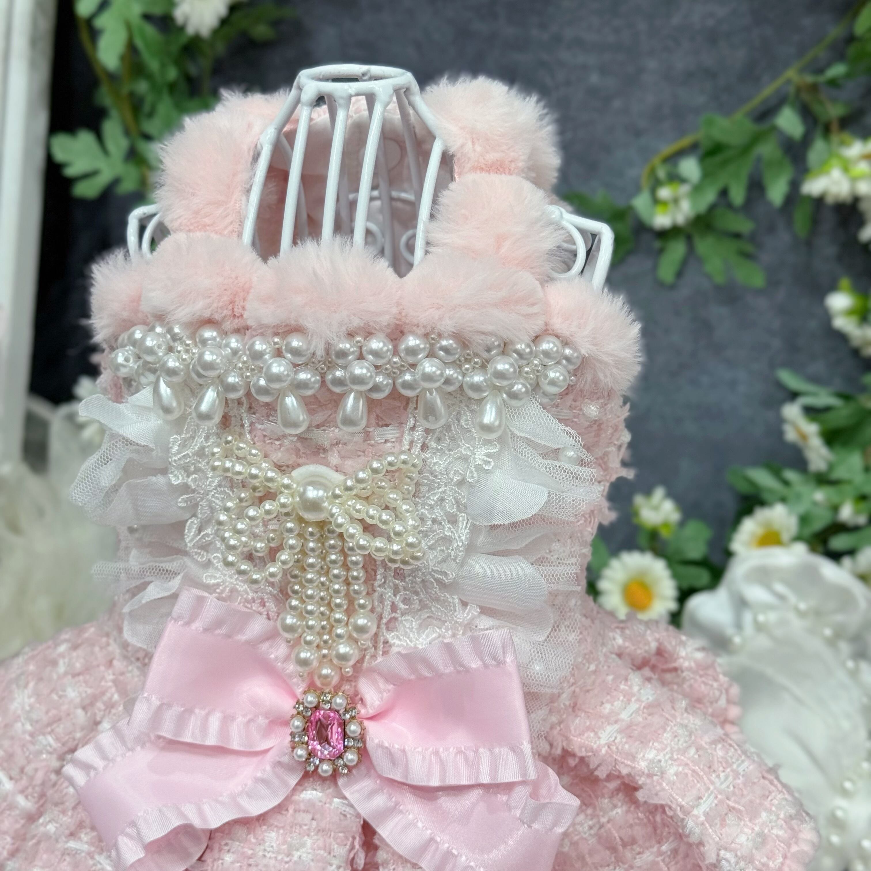 背中にはパールとフリルをふんだんにあしらって華やかさ満点✨光が当たるとパールがキラキラと輝き、お出かけや記念写真の際には必ず注目の的になること間違いなし!