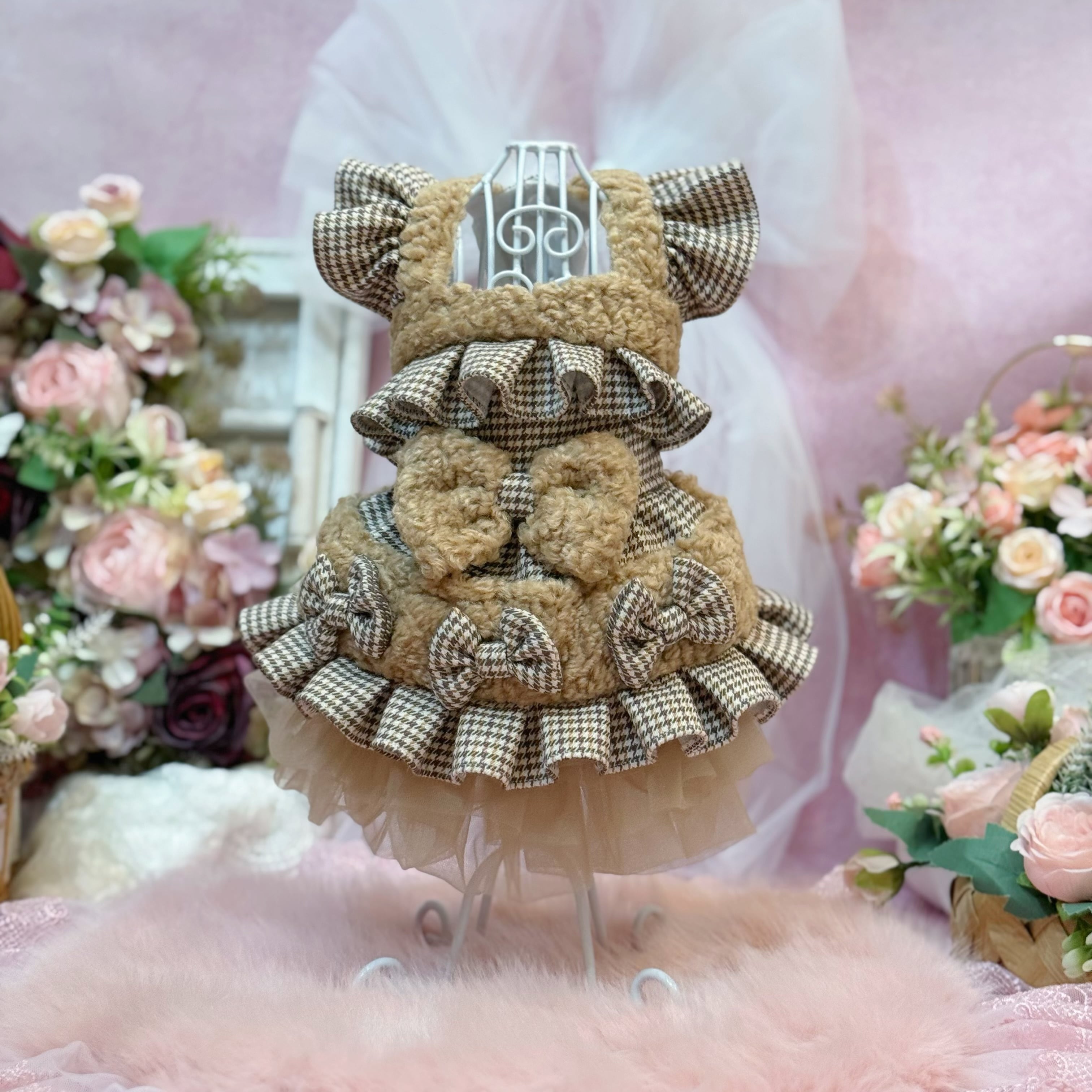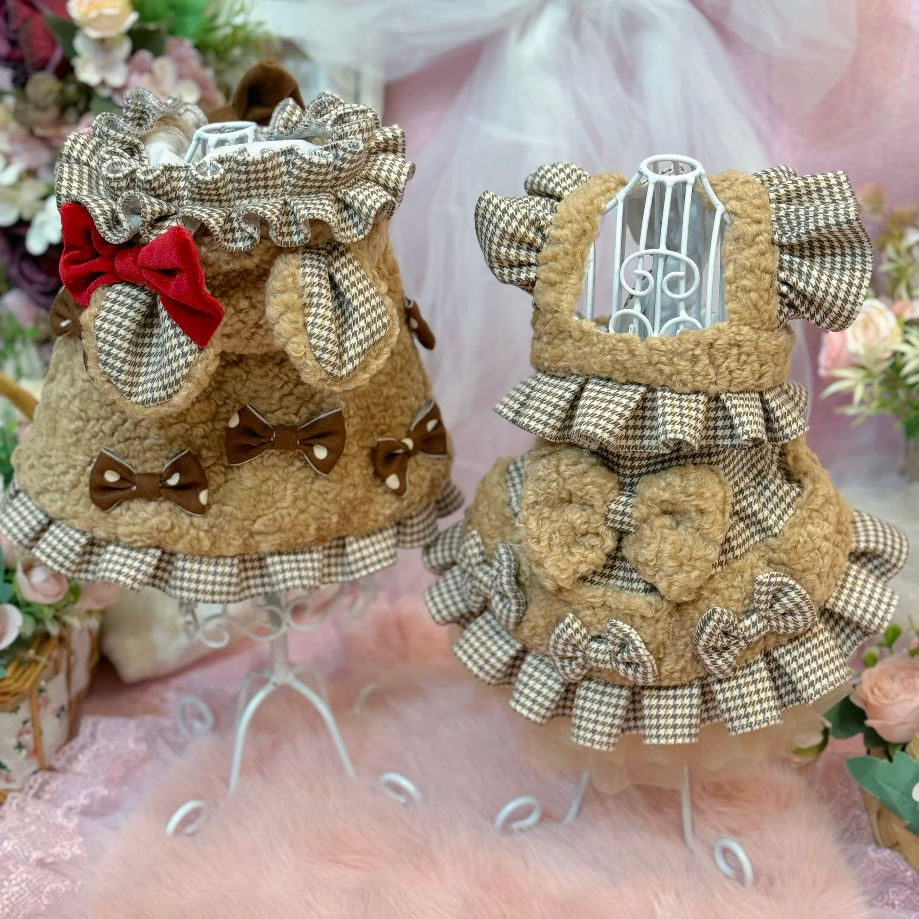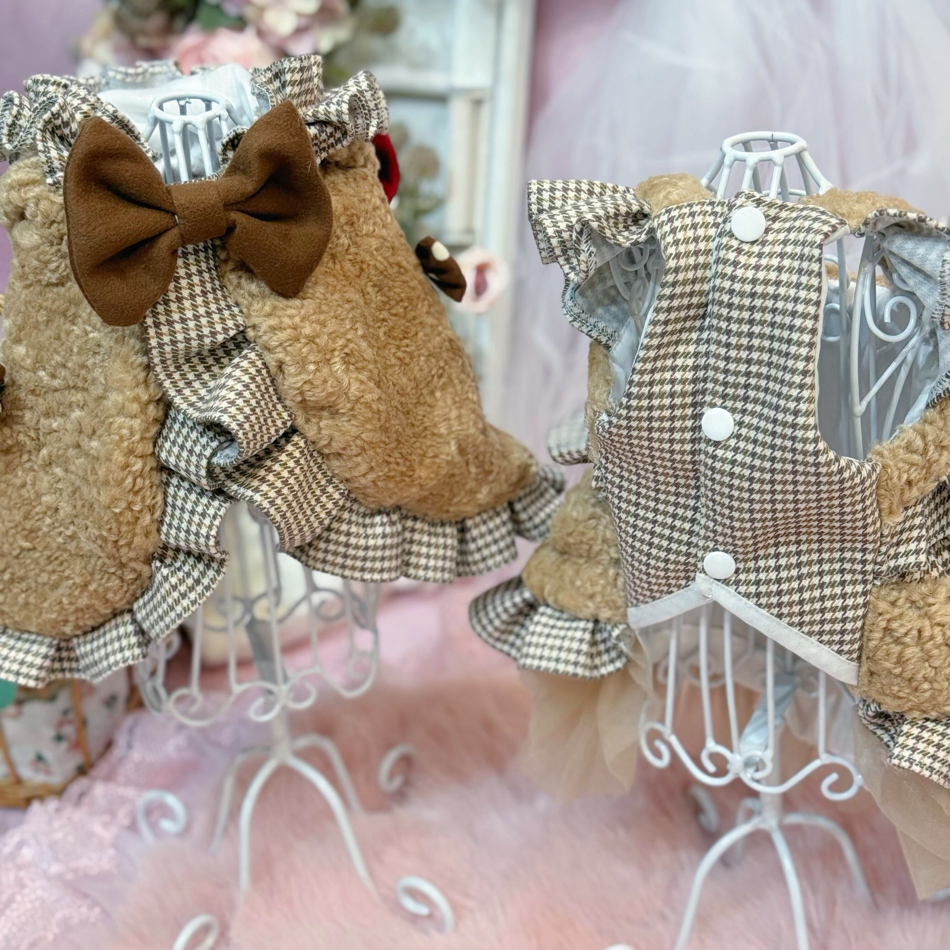 生地にはこだわりました! 金色の糸が光るイギリス風チェック生地と、熊のふわふわ感を再現した上質フェイクファーの2種類を組み合わせ♡