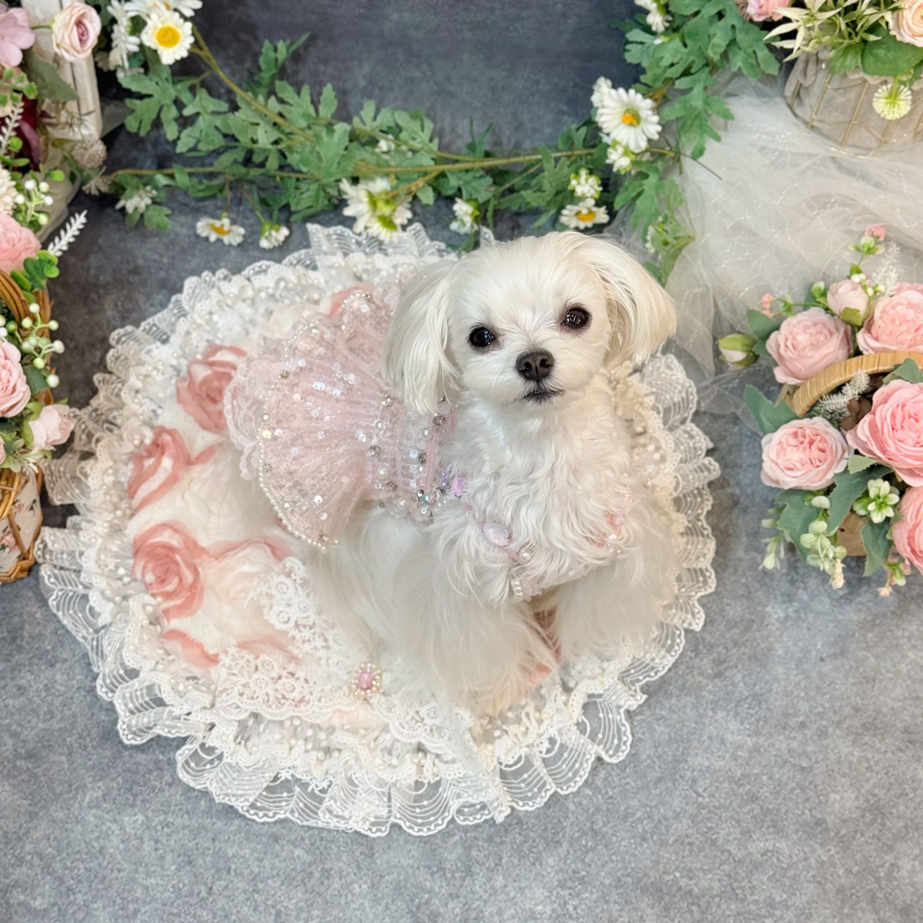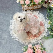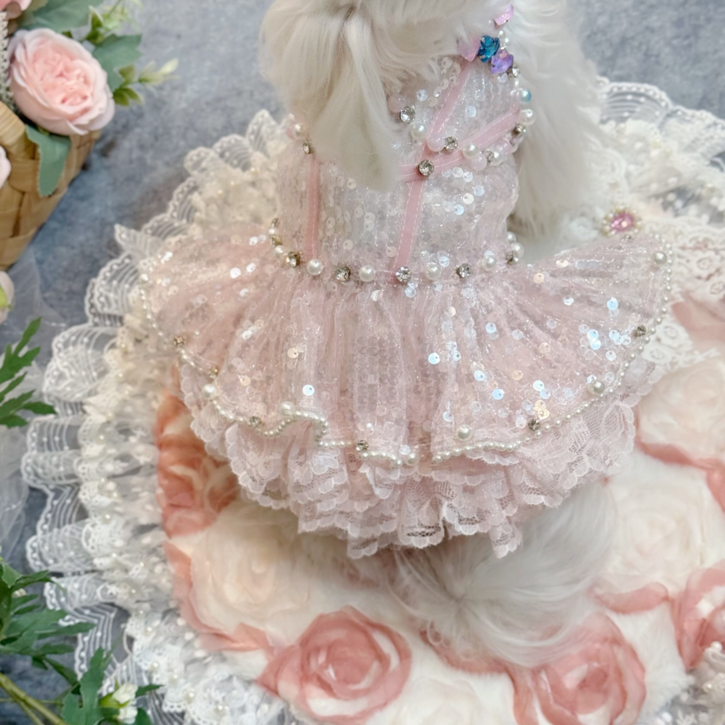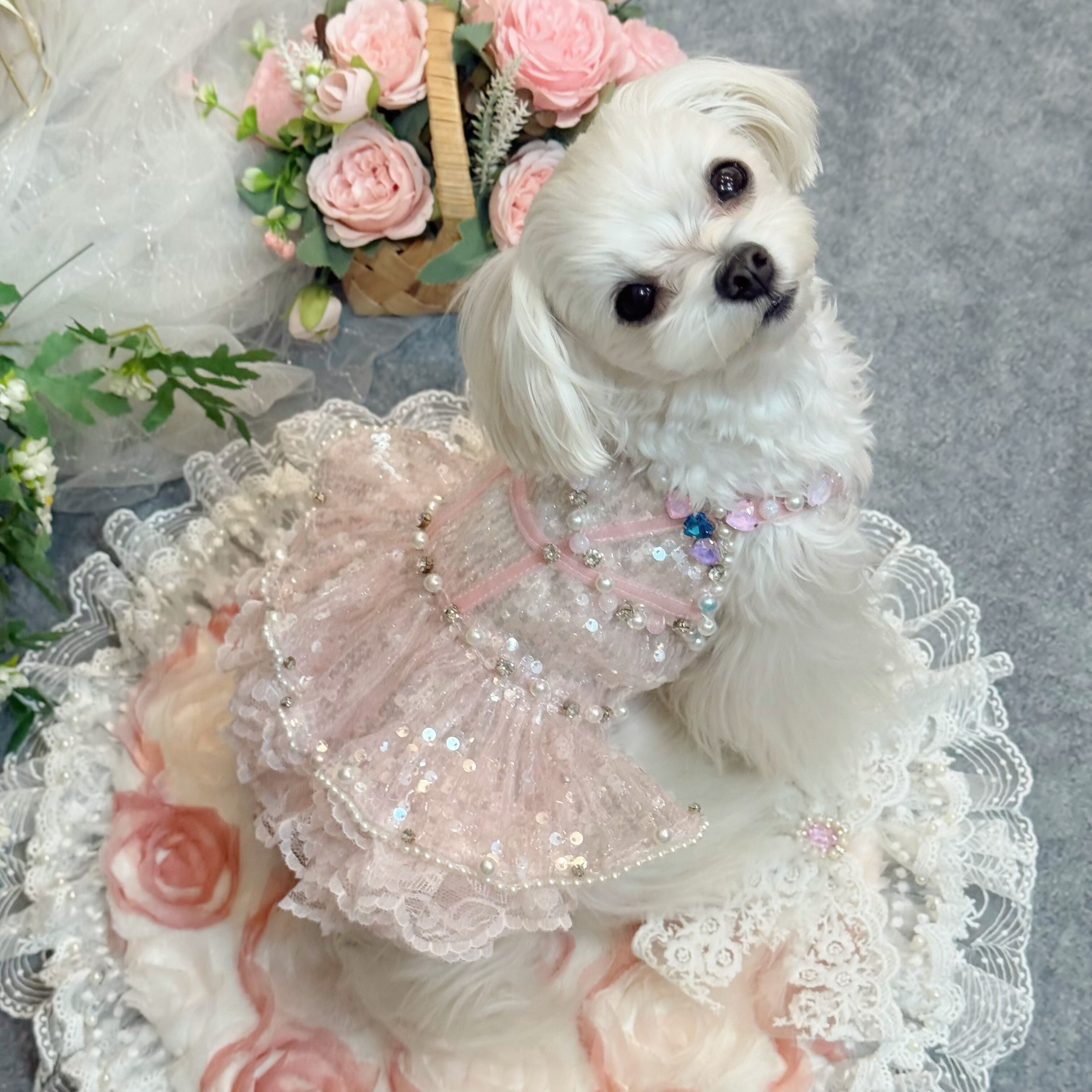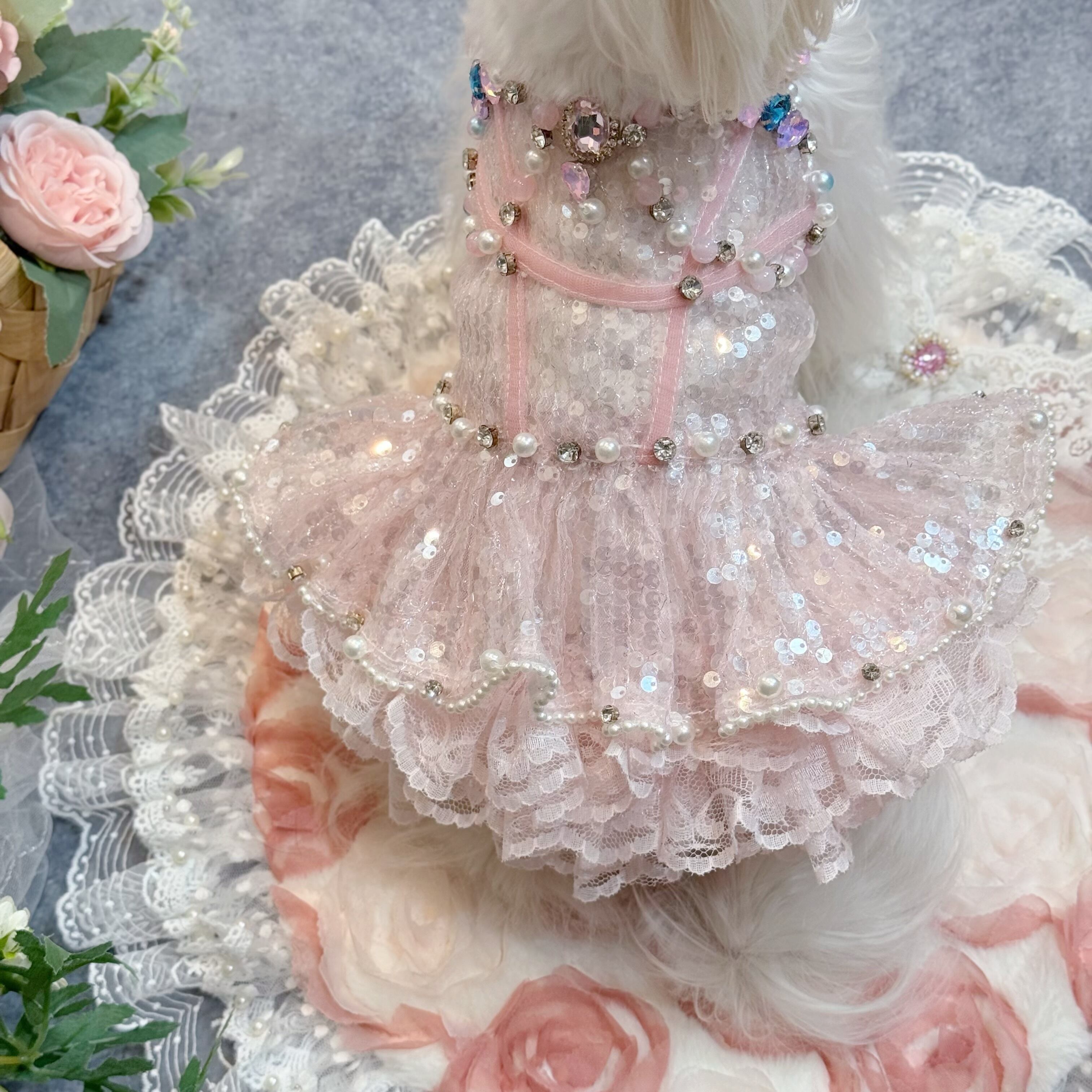 ふんわりと広がるスカートは、愛犬が動くたびに優雅に揺れ、レースとスパンコールが重なり合ってキラキラと光る姿が、たまらなく可愛い一着です♡