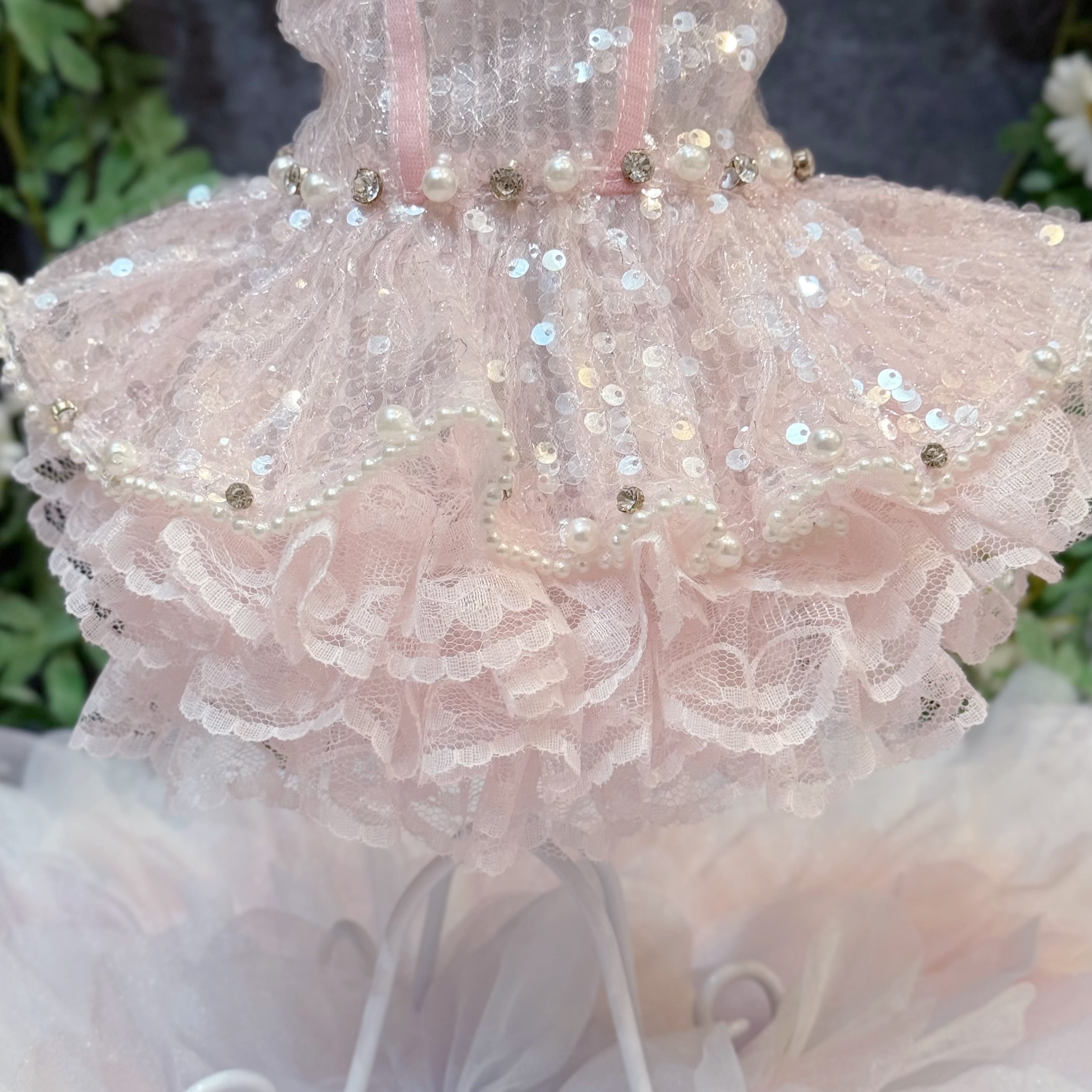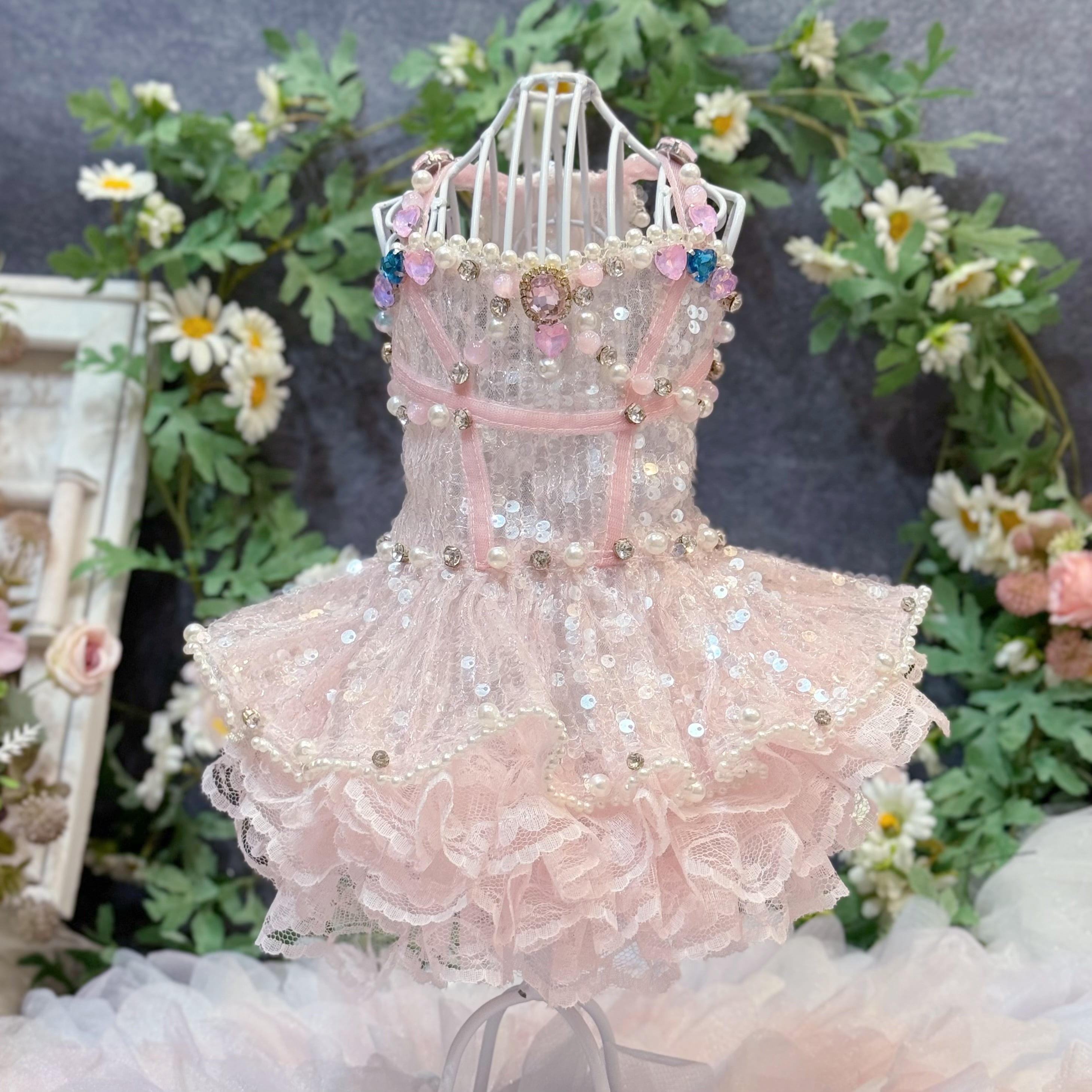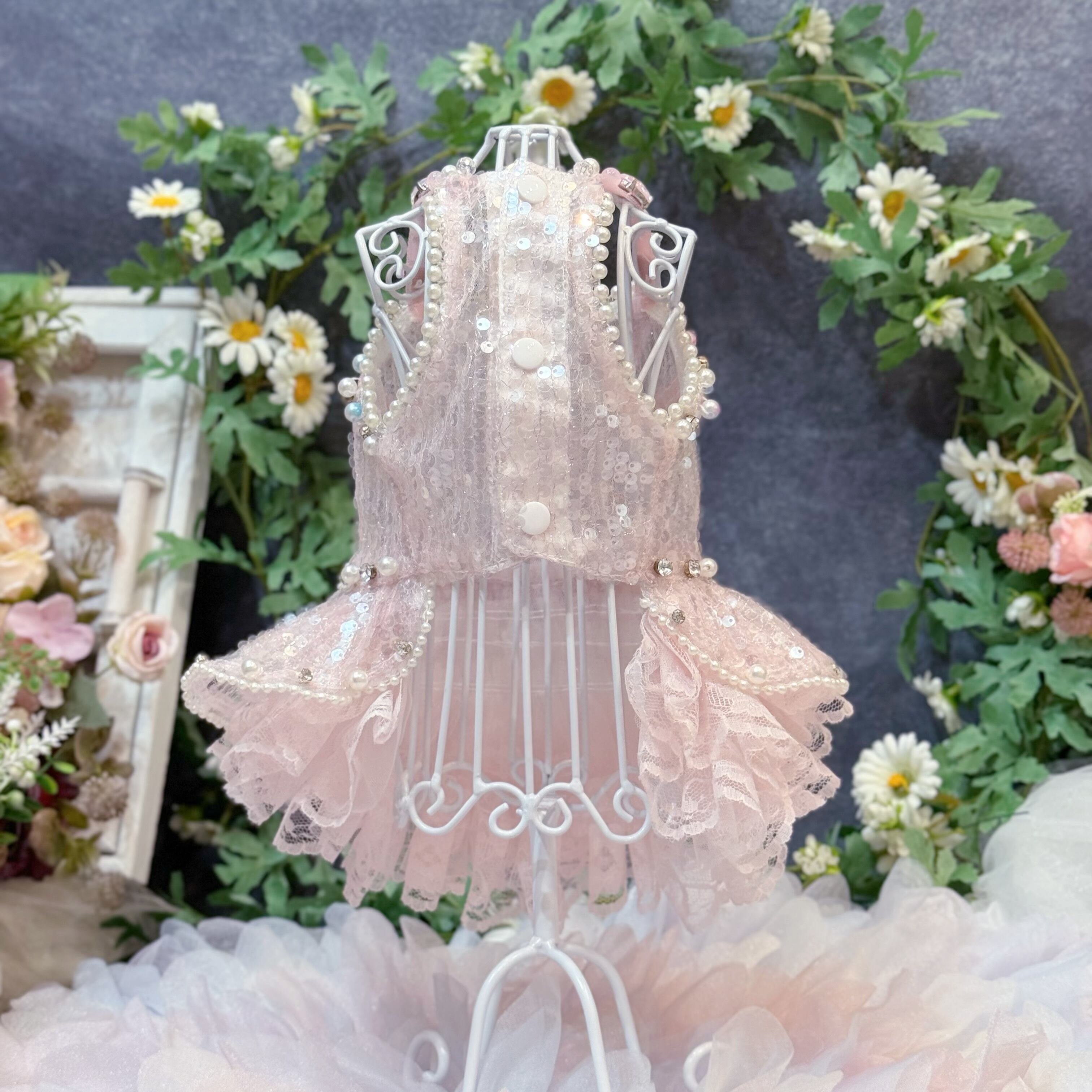 ふんわりと広がるスカートは、愛犬が動くたびに優雅に揺れ、レースとスパンコールが重なり合ってキラキラと光る姿が、たまらなく可愛い一着です♡