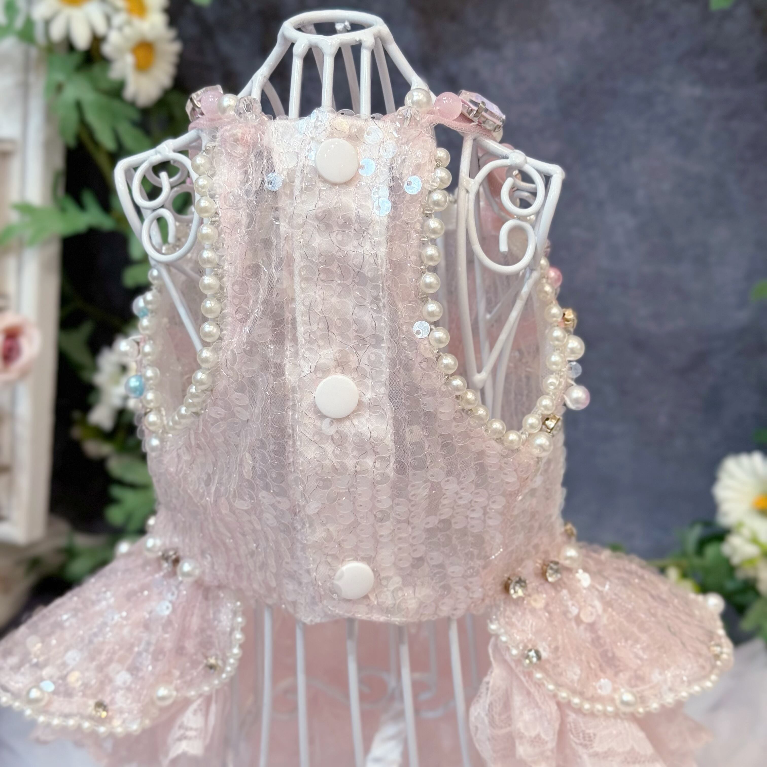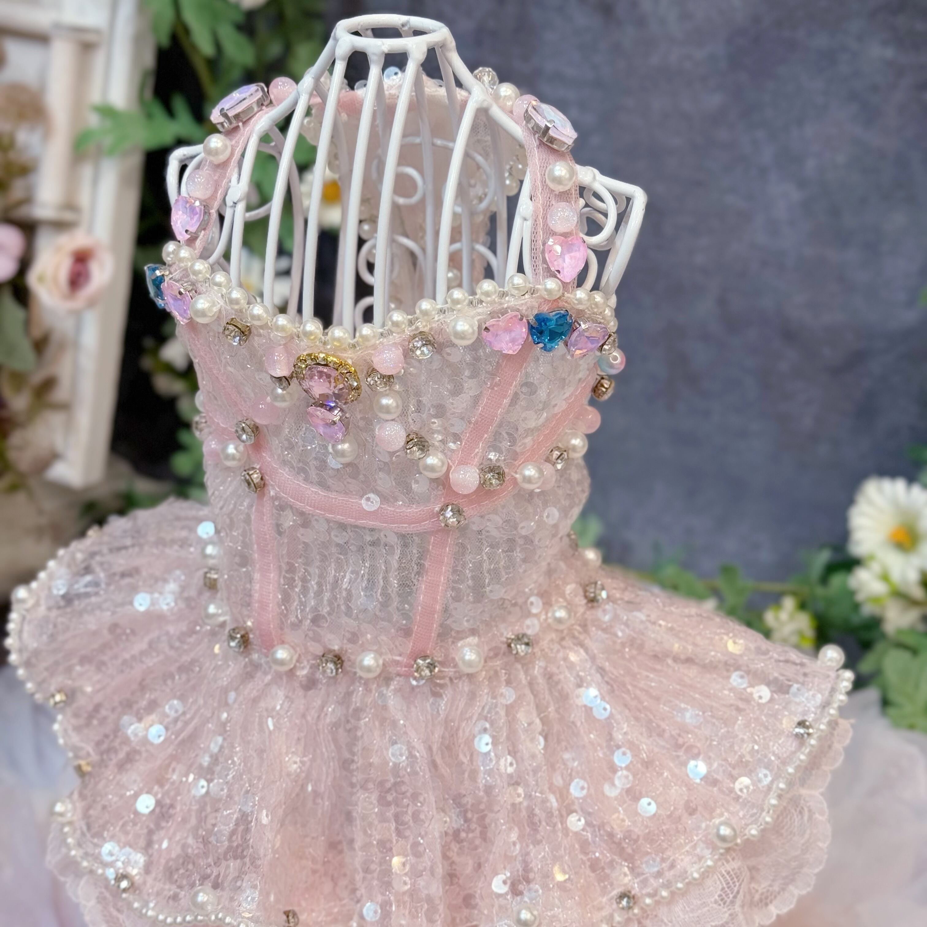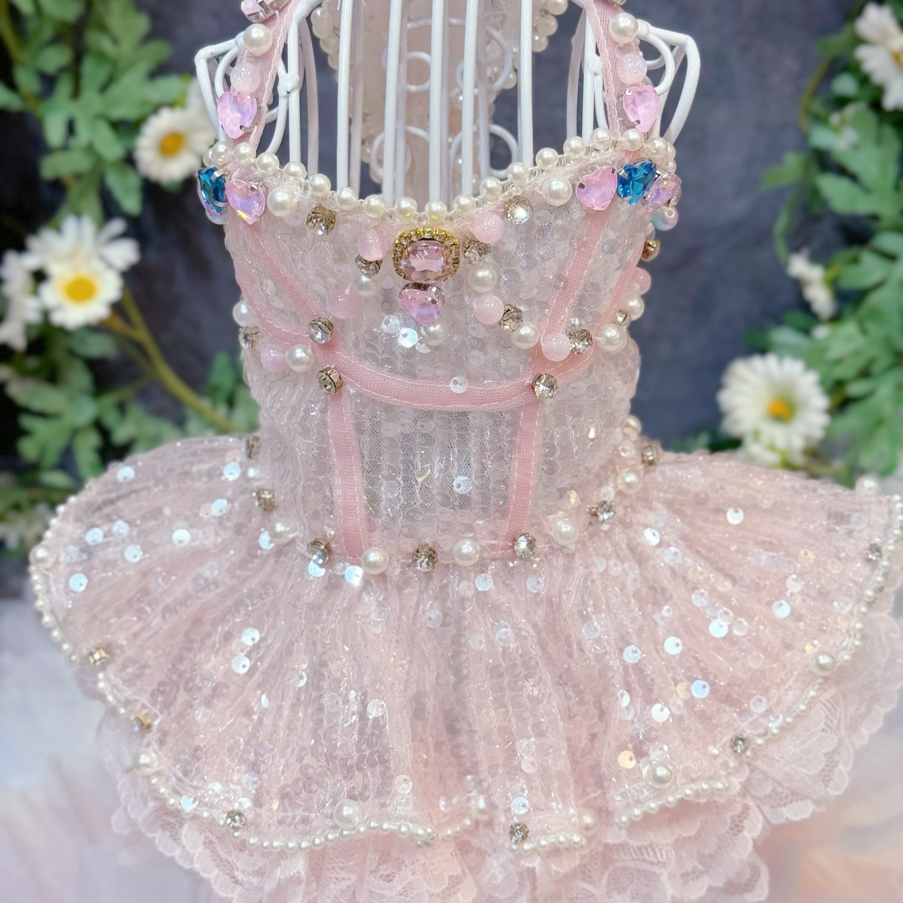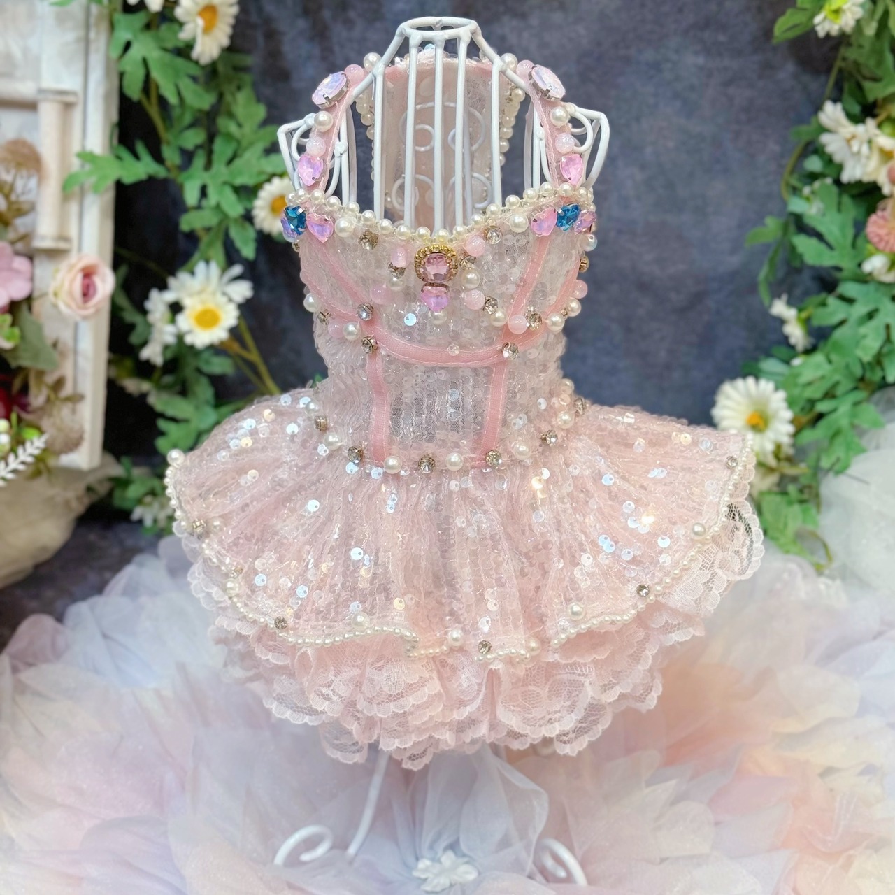 ふんわりと広がるスカートは、愛犬が動くたびに優雅に揺れ、レースとスパンコールが重なり合ってキラキラと光る姿が、たまらなく可愛い一着です♡