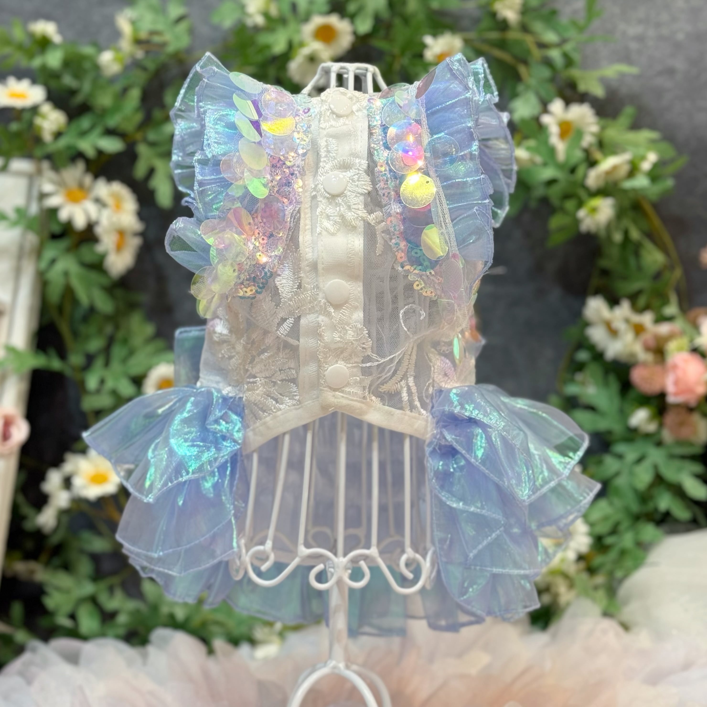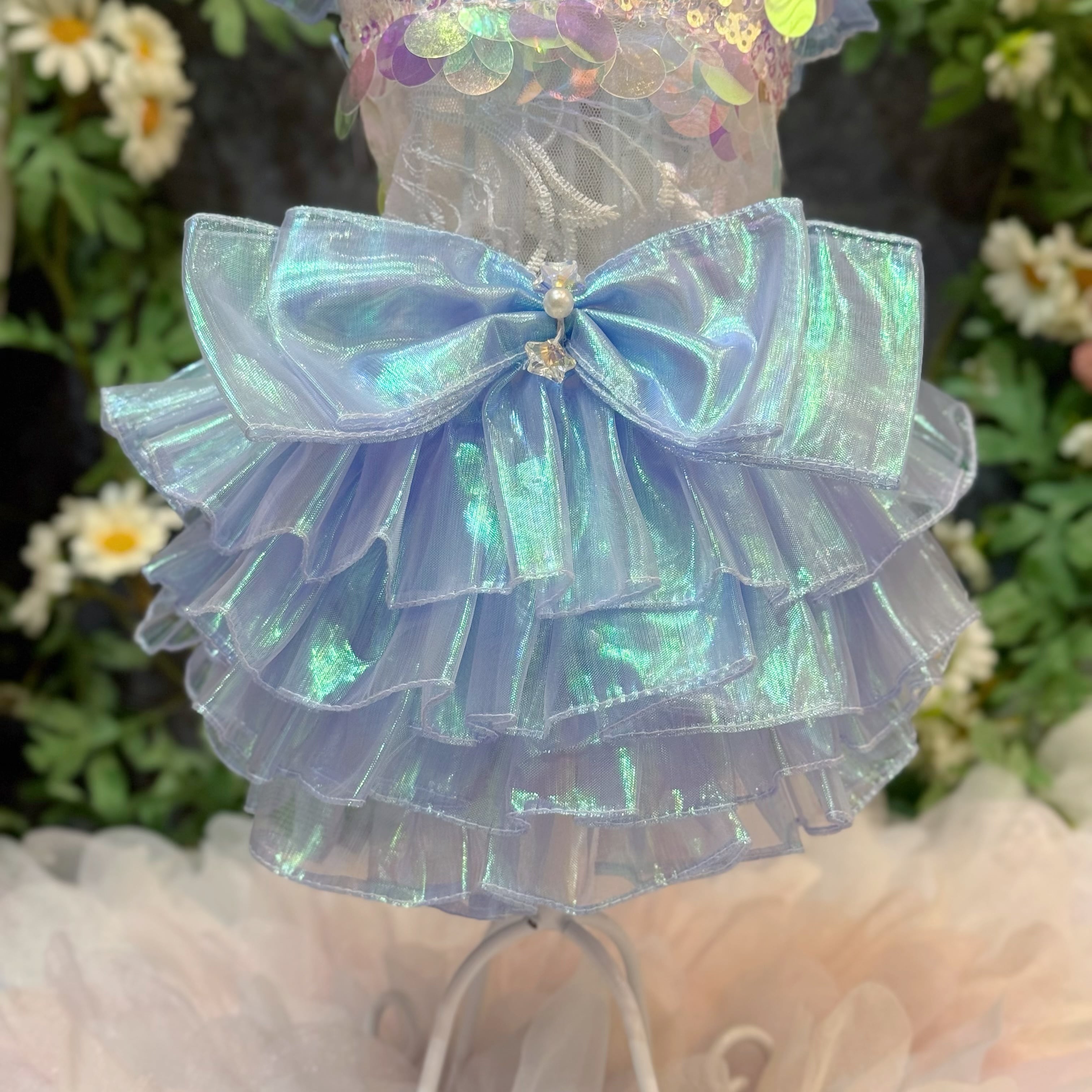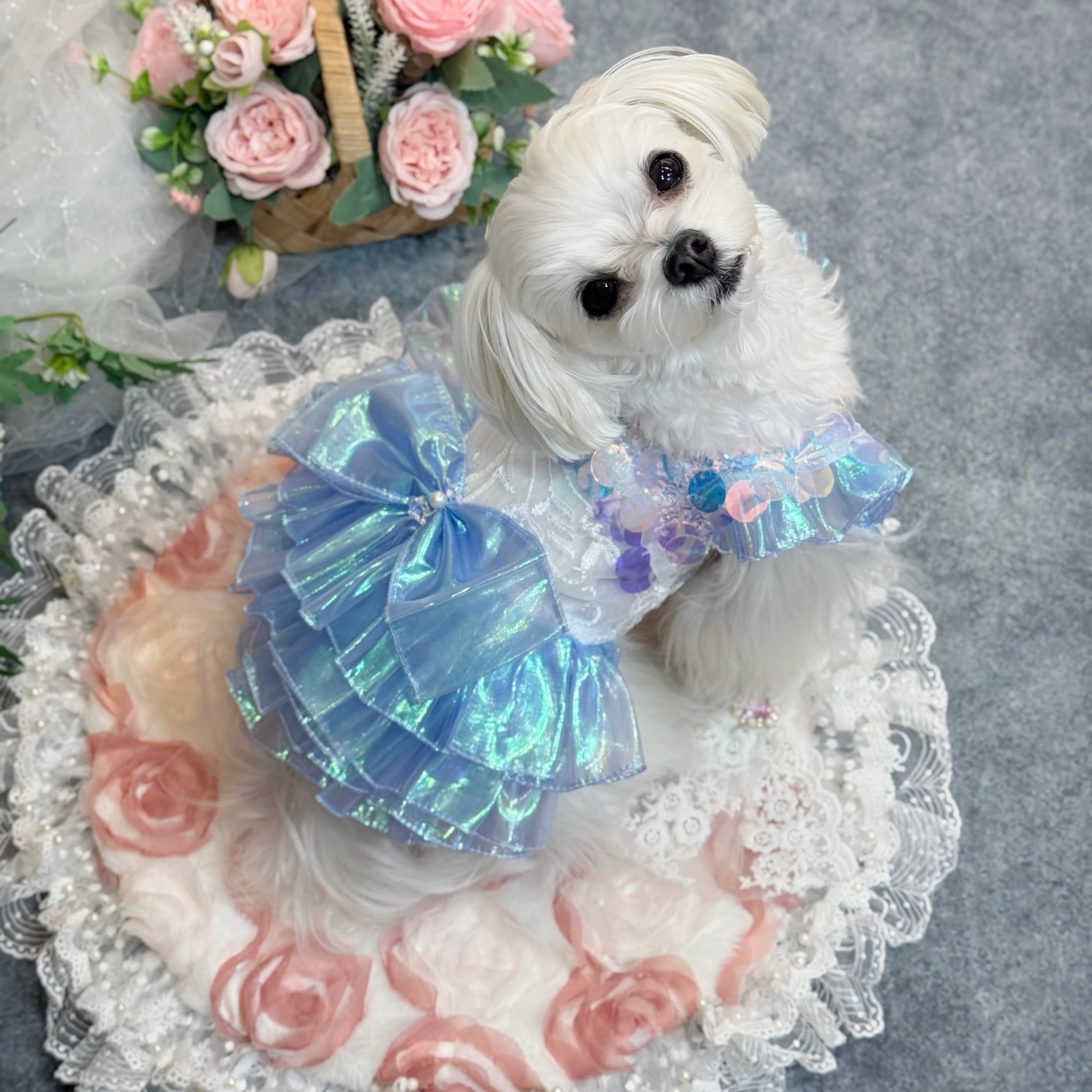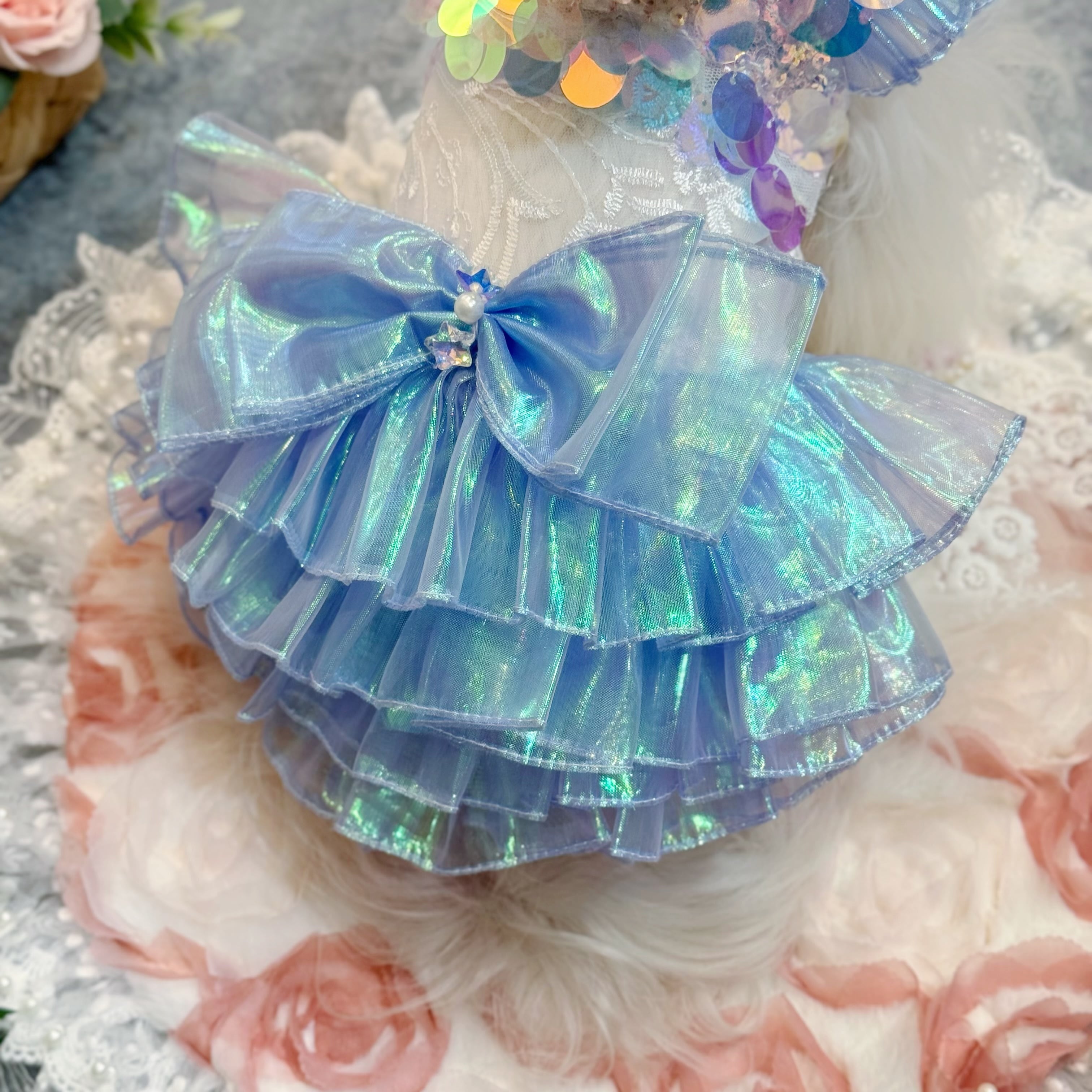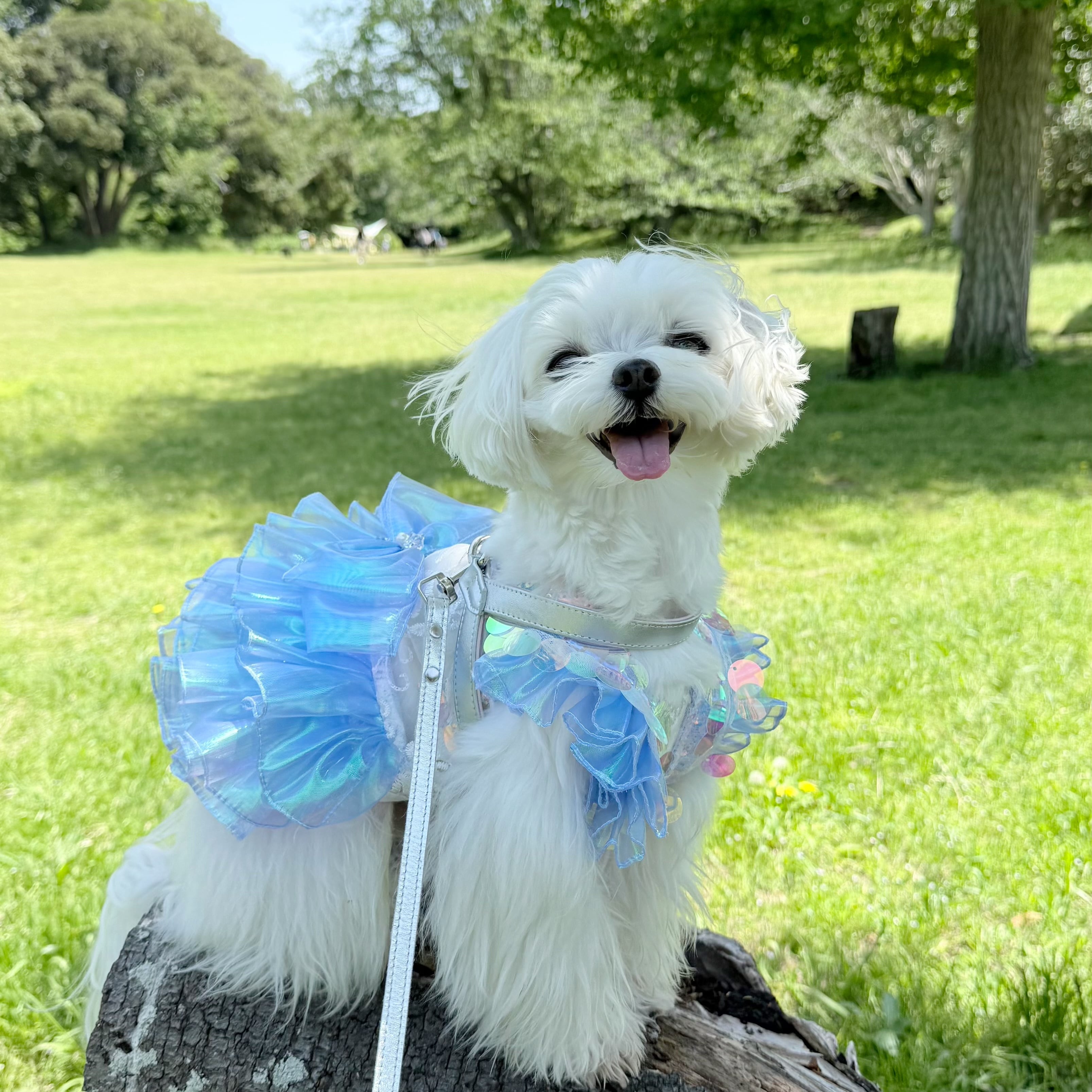 スカートはオーロラルチュールを何層にも重ねたティアードデザイン。ふんわりと広がるフリルが、愛犬の動きに合わせて優雅に揺れ、オーロラのような色の変化が見られます。