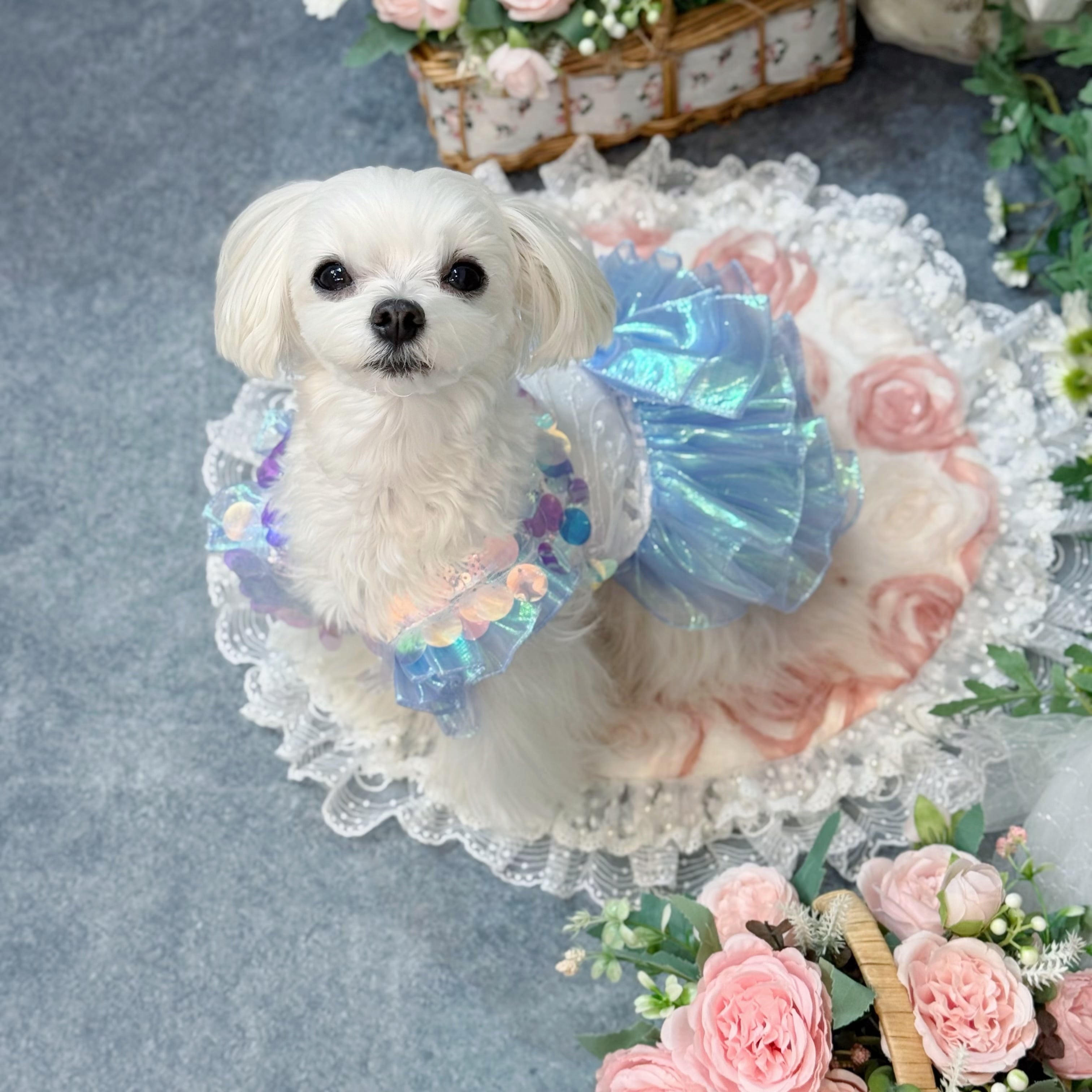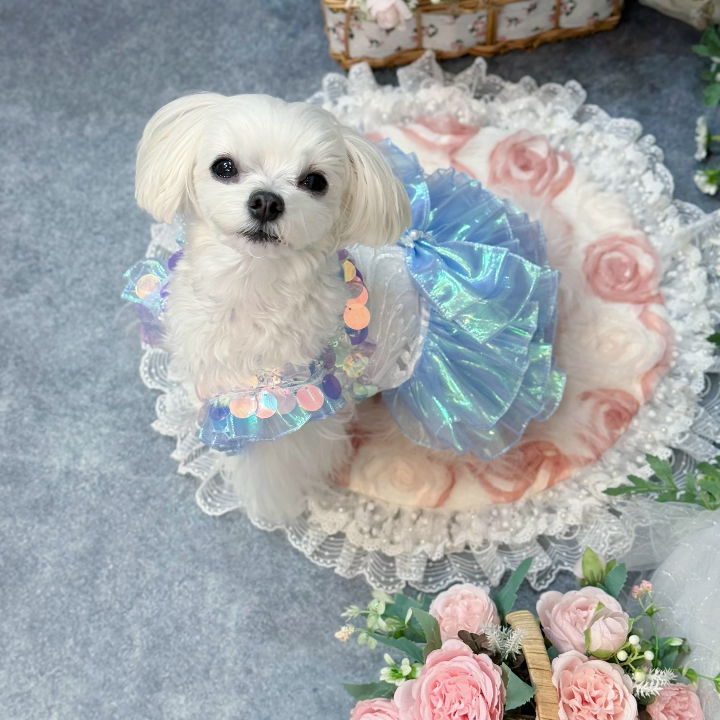 薄くて軽いのにボリューム感があり、愛犬が動くたびに衣装全体がキラキラと色を変える様子は、まさに水中を泳ぐ人魚姫のような雰囲気を演出します♪