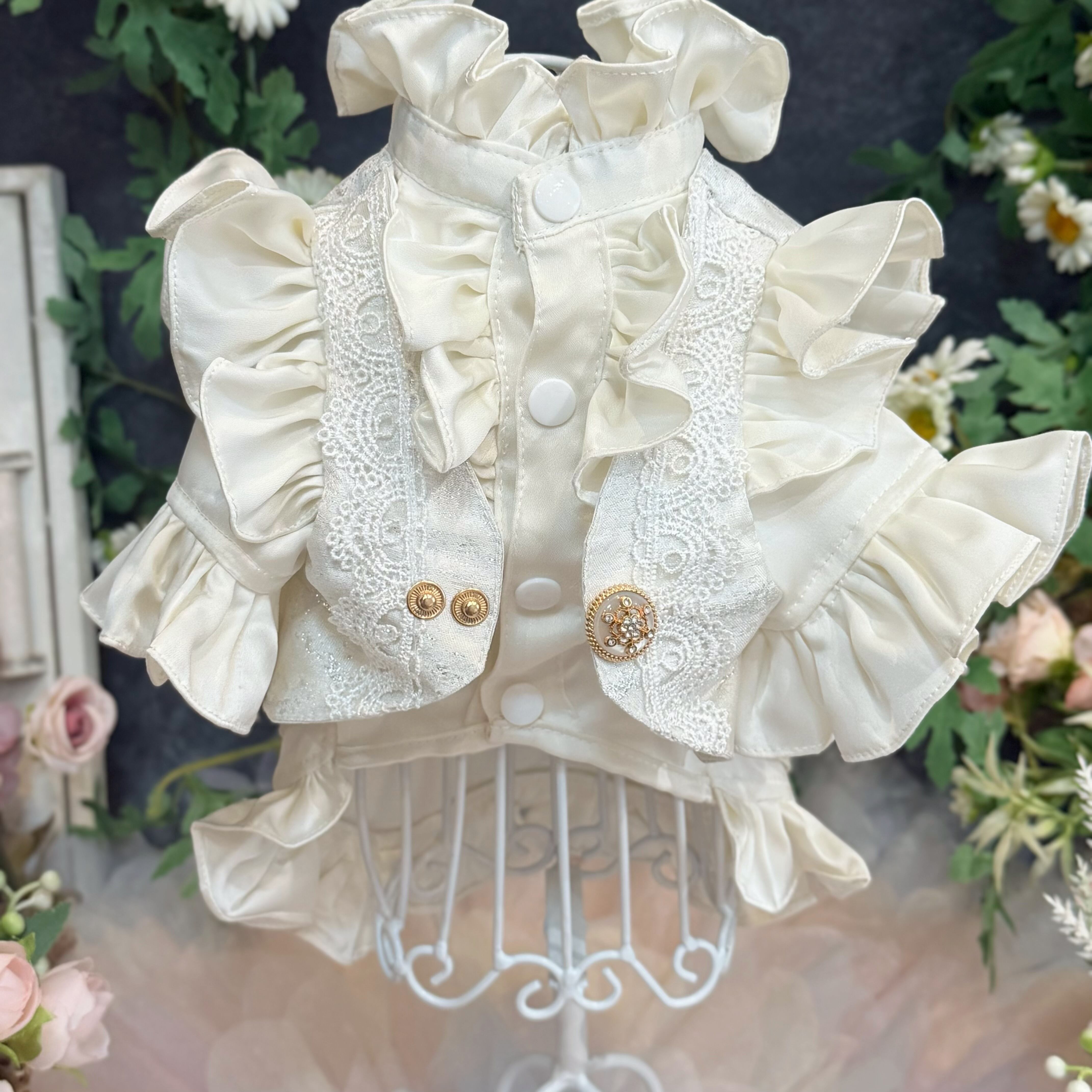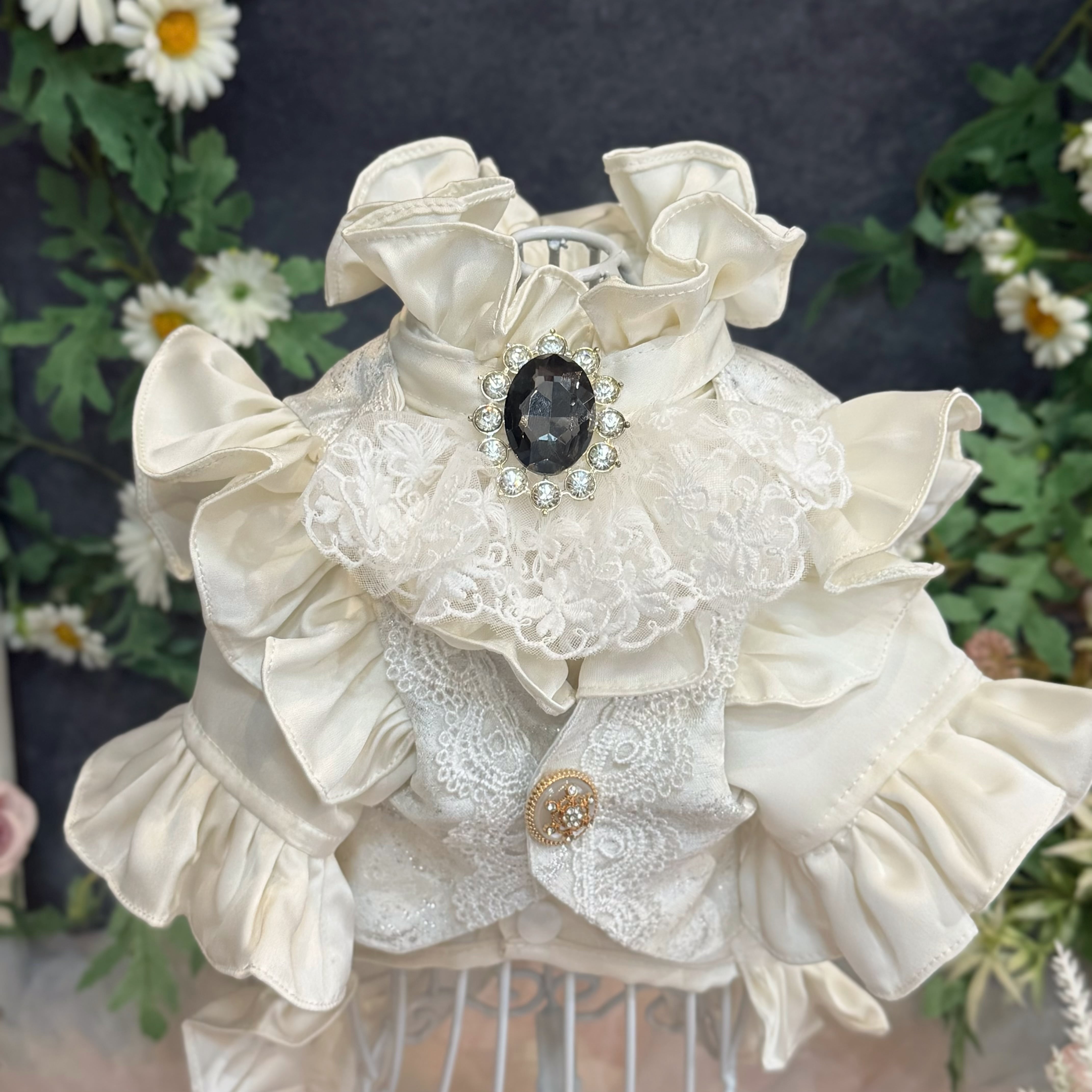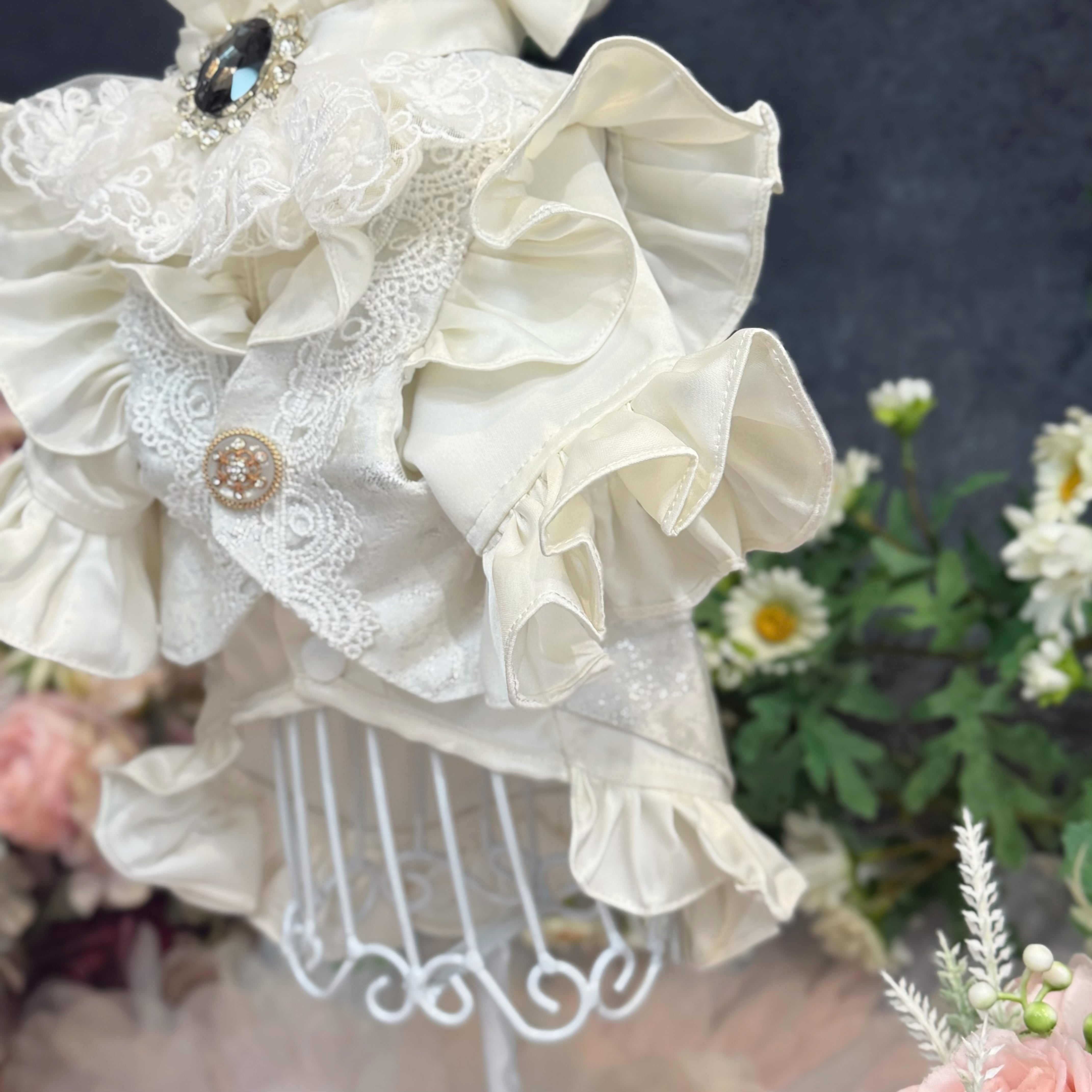 ジレ部分には、実際のヒューマン用ウェディングスーツにも用いられる、立体感のある最高級生地を贅沢に使用しています。上品な輝きを放つシルバーカラーをベースに、繊細な模様のレースを丁寧に重ね合わせることで、圧倒的な高級感と奥深い美しさを表現しました。フロントにあしらわれたアンティーク調のビジューボタンが、クラシカルなアクセントになっています♪