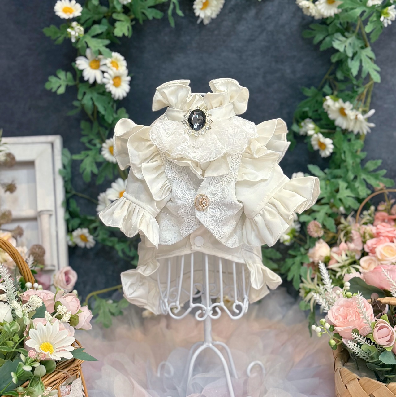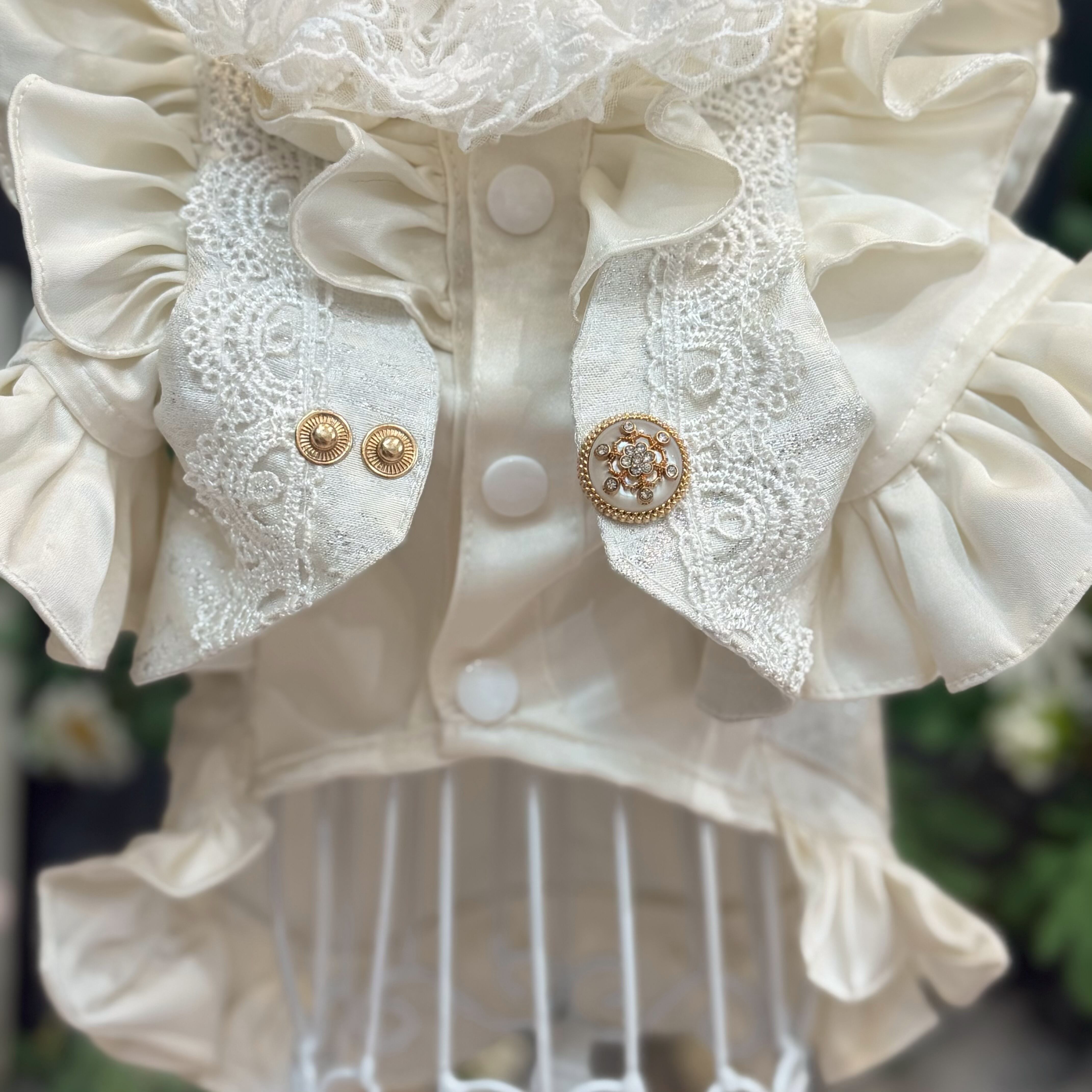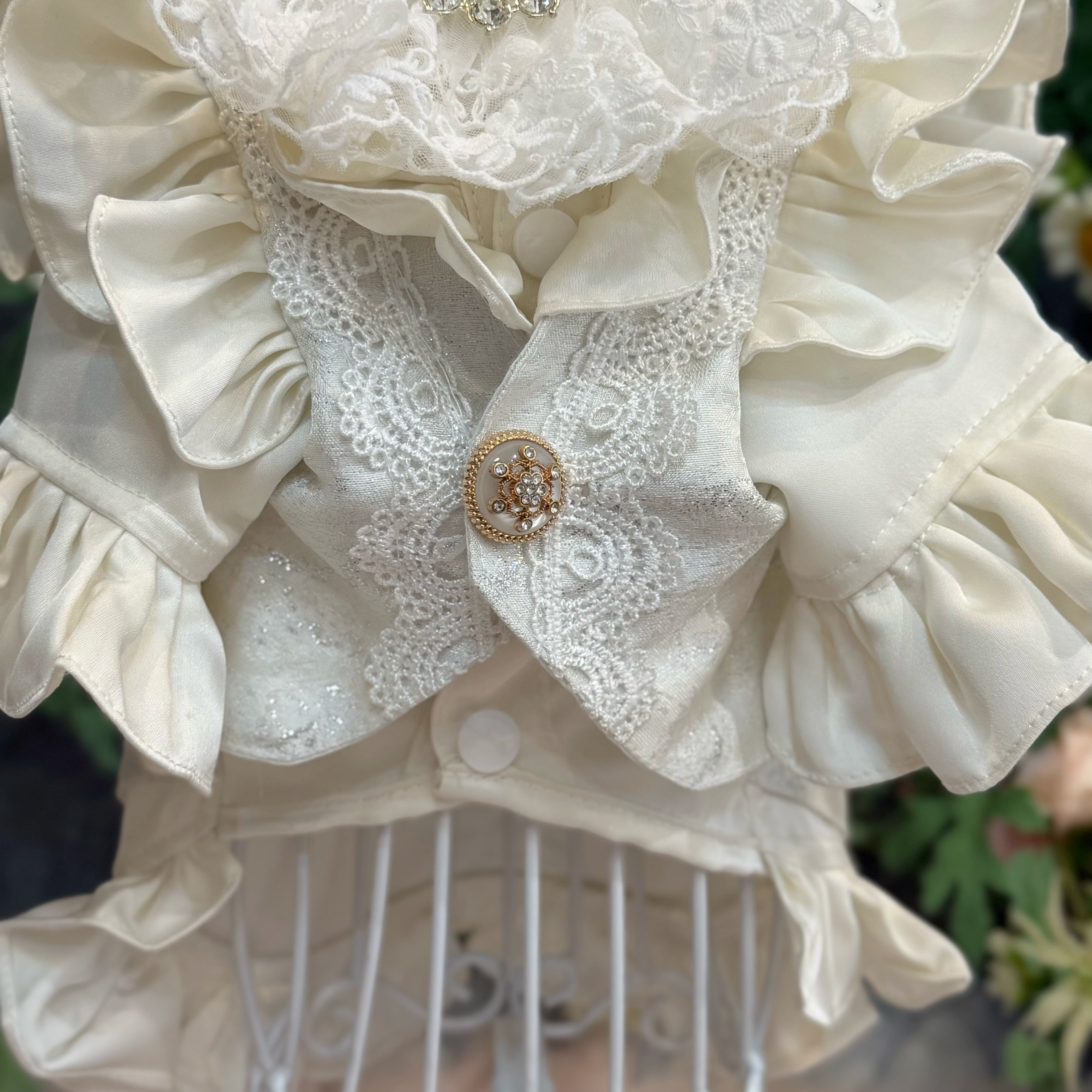 ジレ部分には、実際のヒューマン用ウェディングスーツにも用いられる、立体感のある最高級生地を贅沢に使用しています。上品な輝きを放つシルバーカラーをベースに、繊細な模様のレースを丁寧に重ね合わせることで、圧倒的な高級感と奥深い美しさを表現しました。フロントにあしらわれたアンティーク調のビジューボタンが、クラシカルなアクセントになっています♪