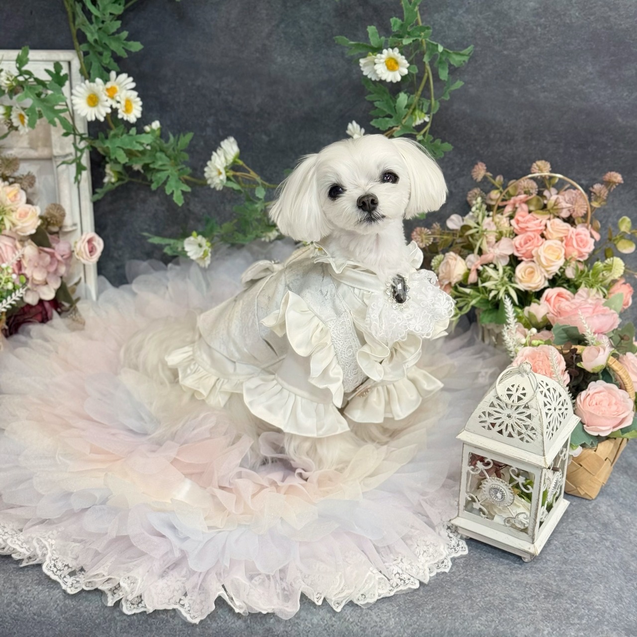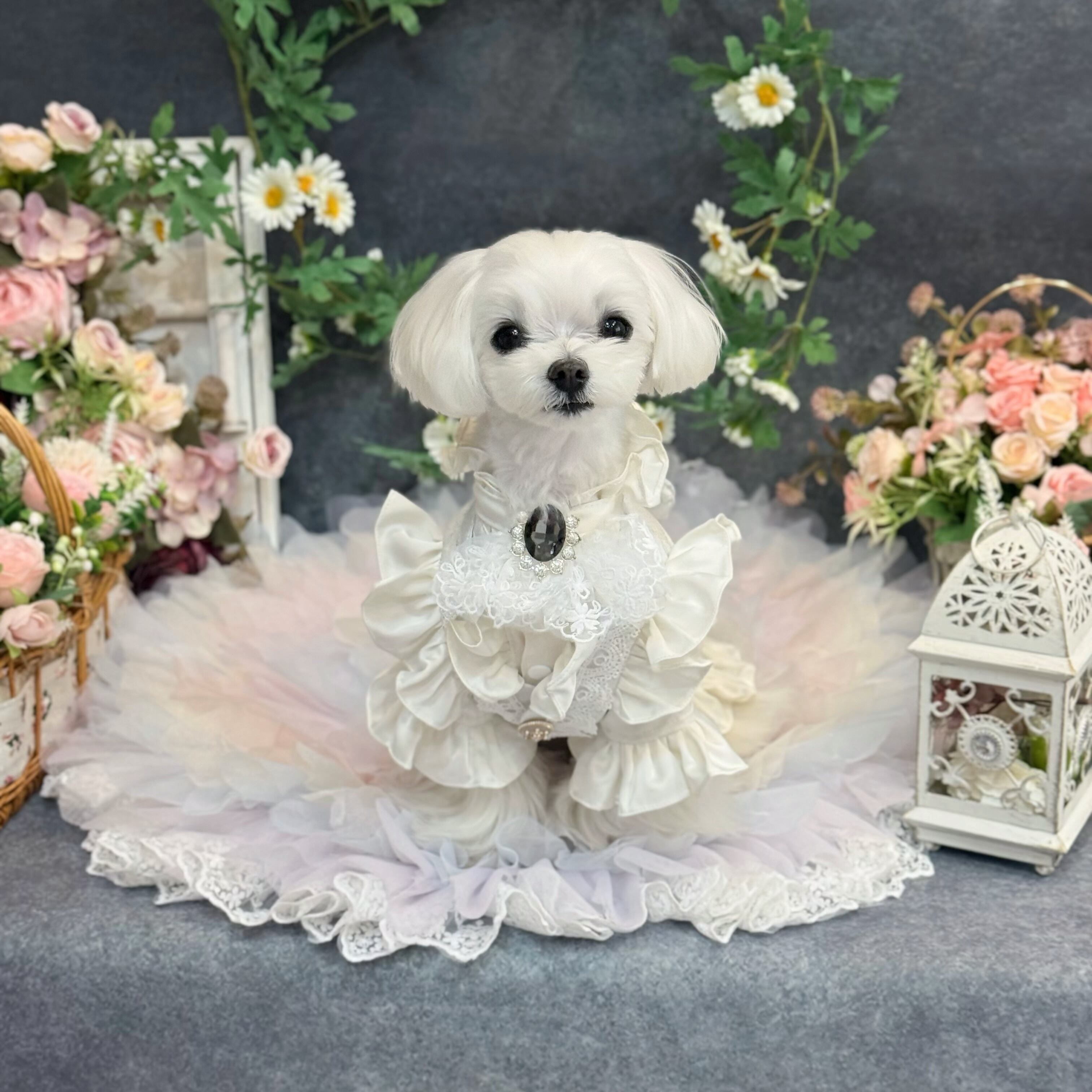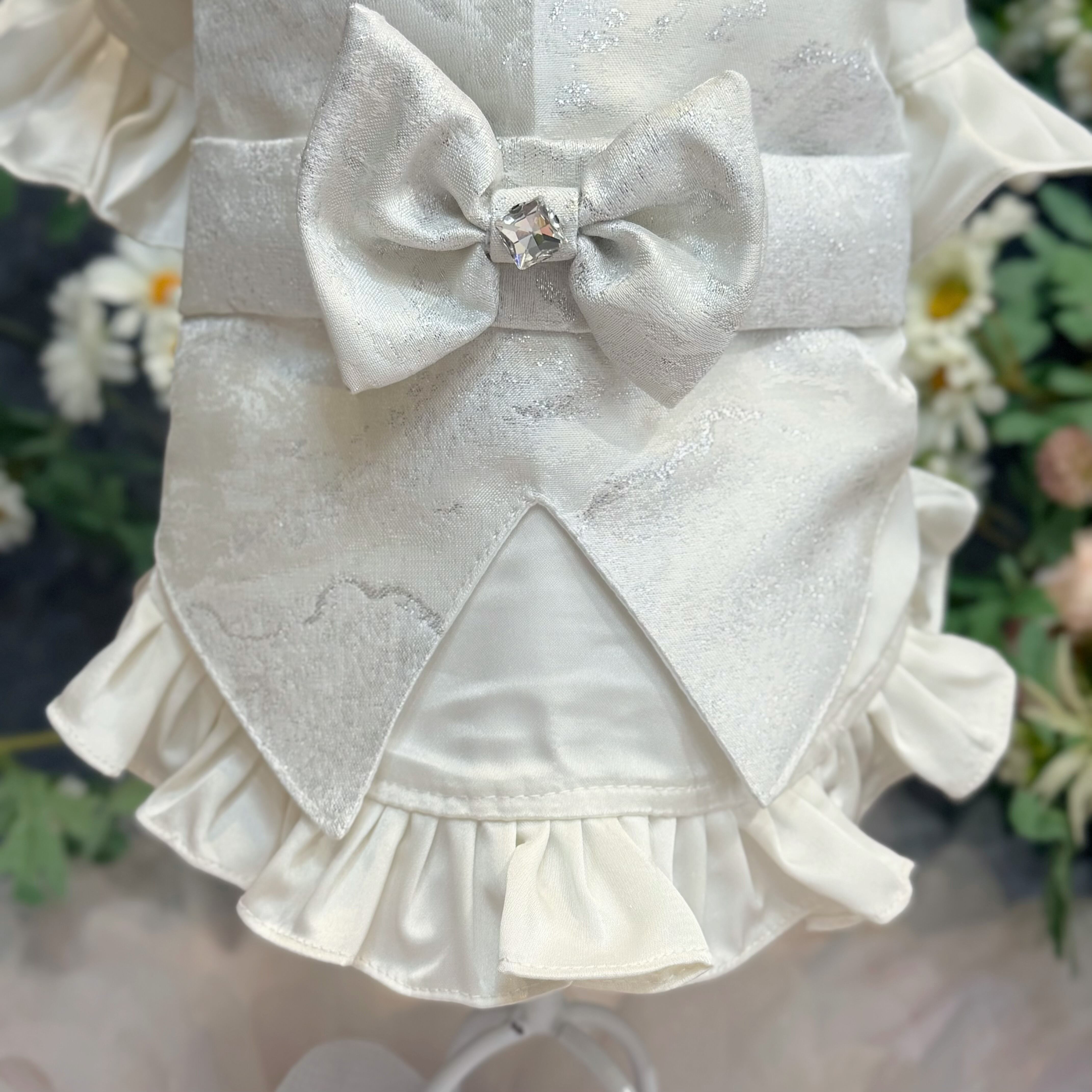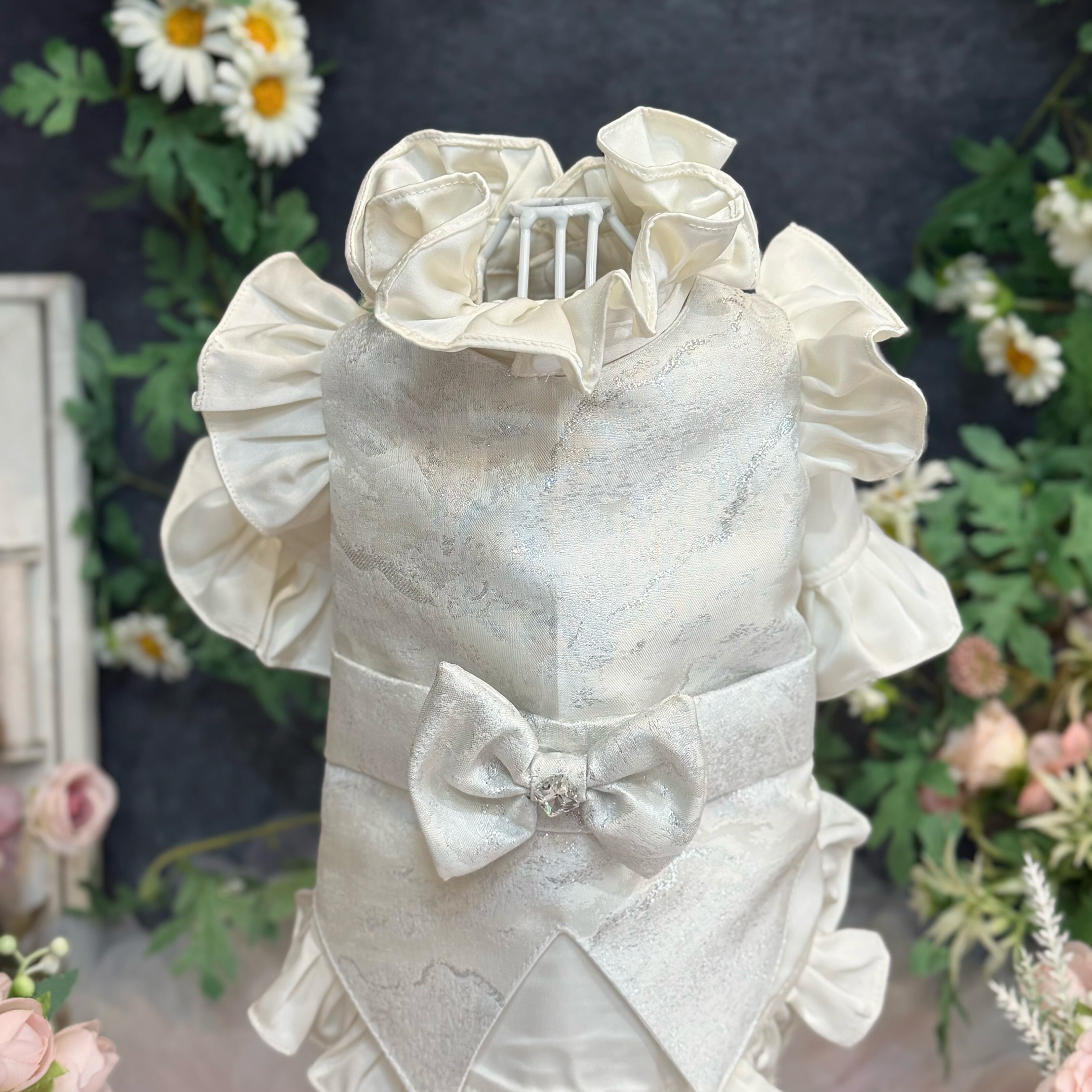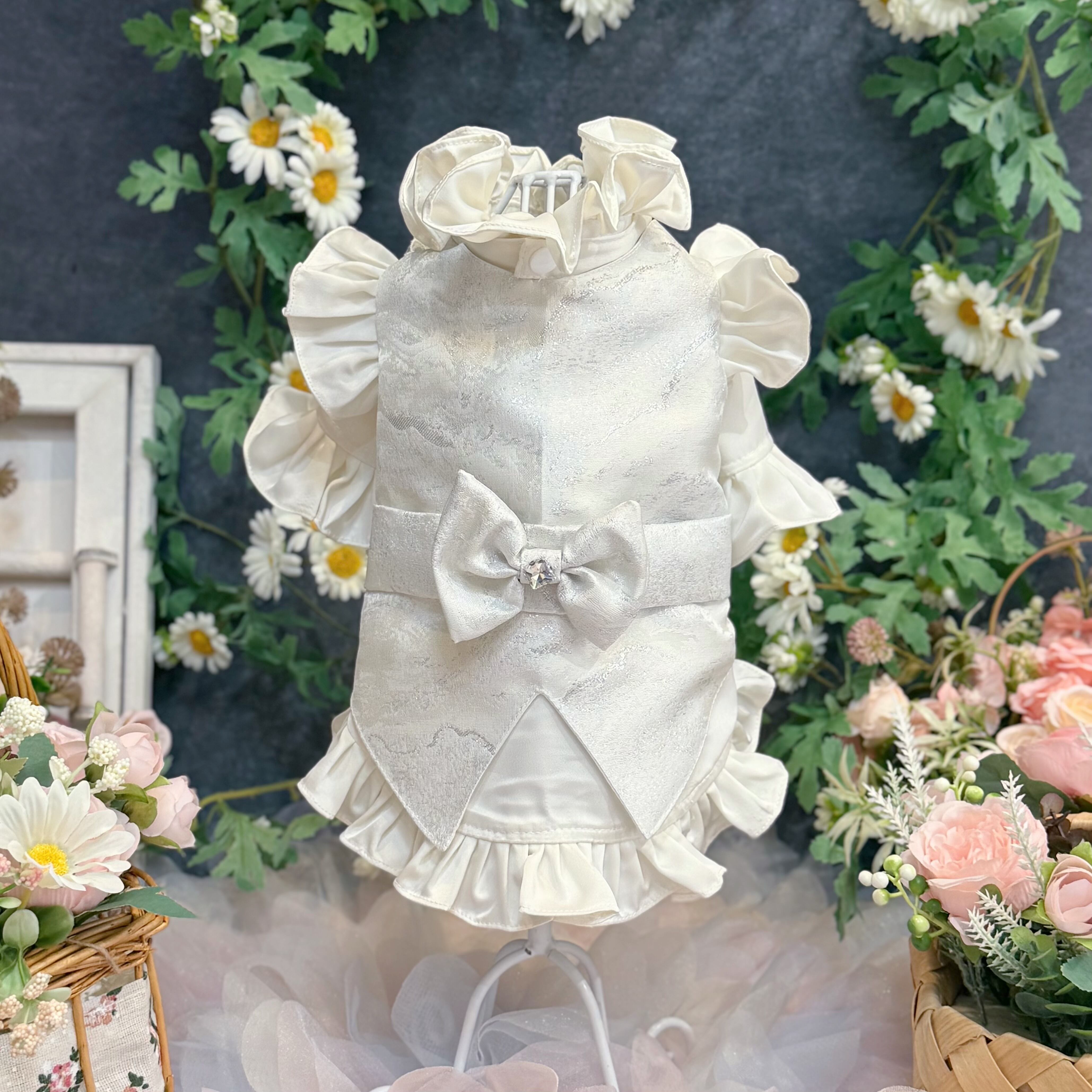 後ろ姿にも一切の妥協はありません。格式高い燕尾服(テールコート)を思わせる美しいカッティングデザインで、裾のフリルがエレガントなシルエットを作り出します。背中には、ジレと同じシルバー生地で作られた大ぶりのリボンを配置。タキシードの凛々しさの中に、愛犬らしいキュートな魅力をプラスしました➕