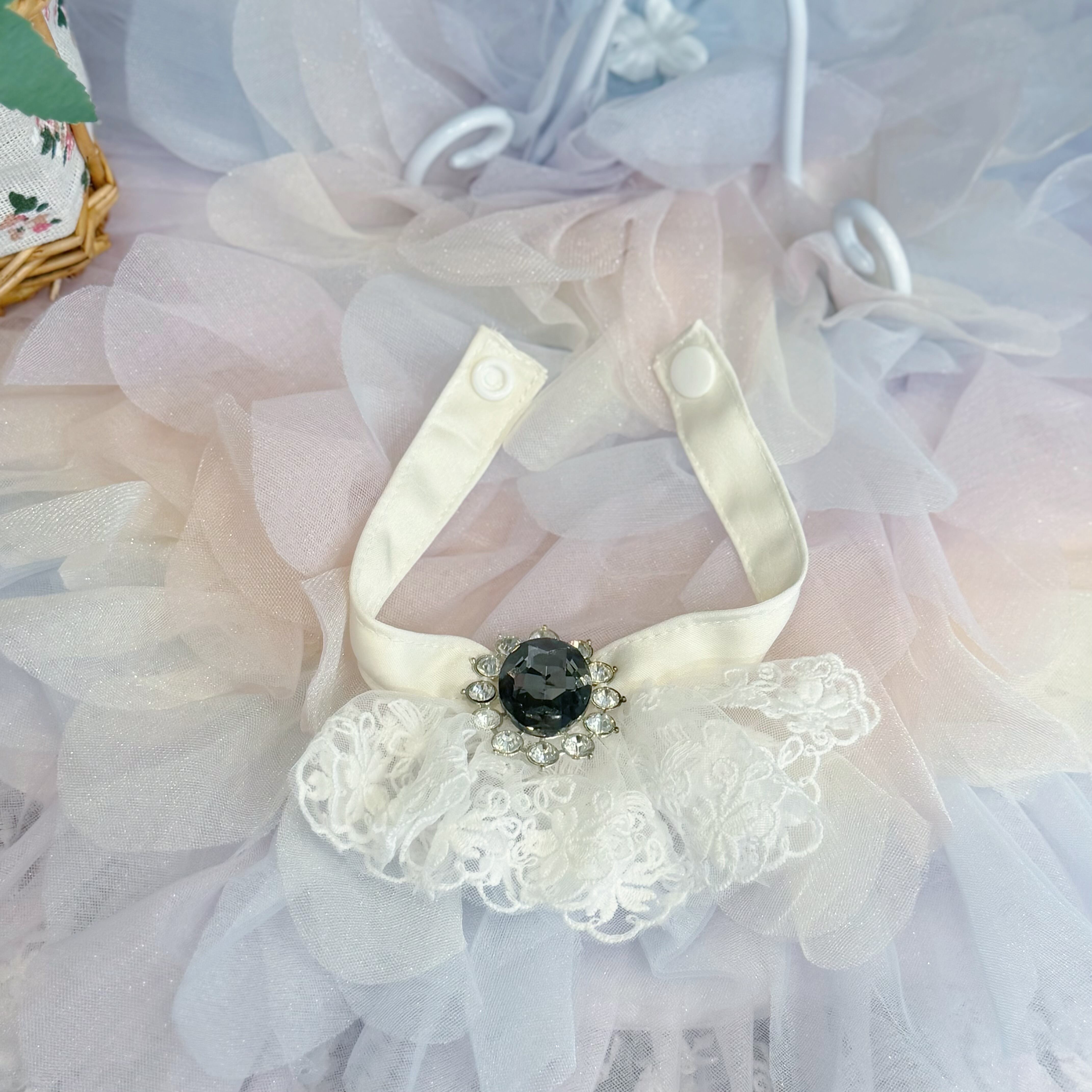 大きなアンティーク調ビジューが輝く首元のレース飾りは取り外し可能!ゴージャスに決めたい時と、すっきり着せたい時で使い分けができます。